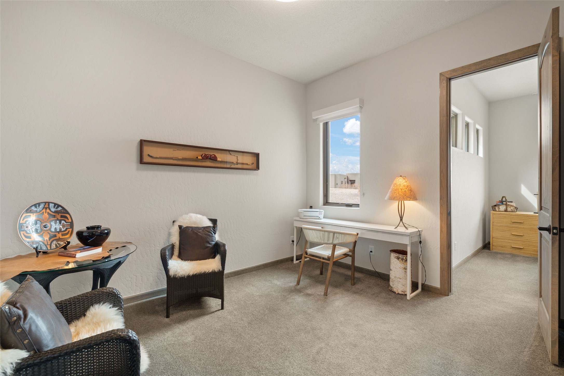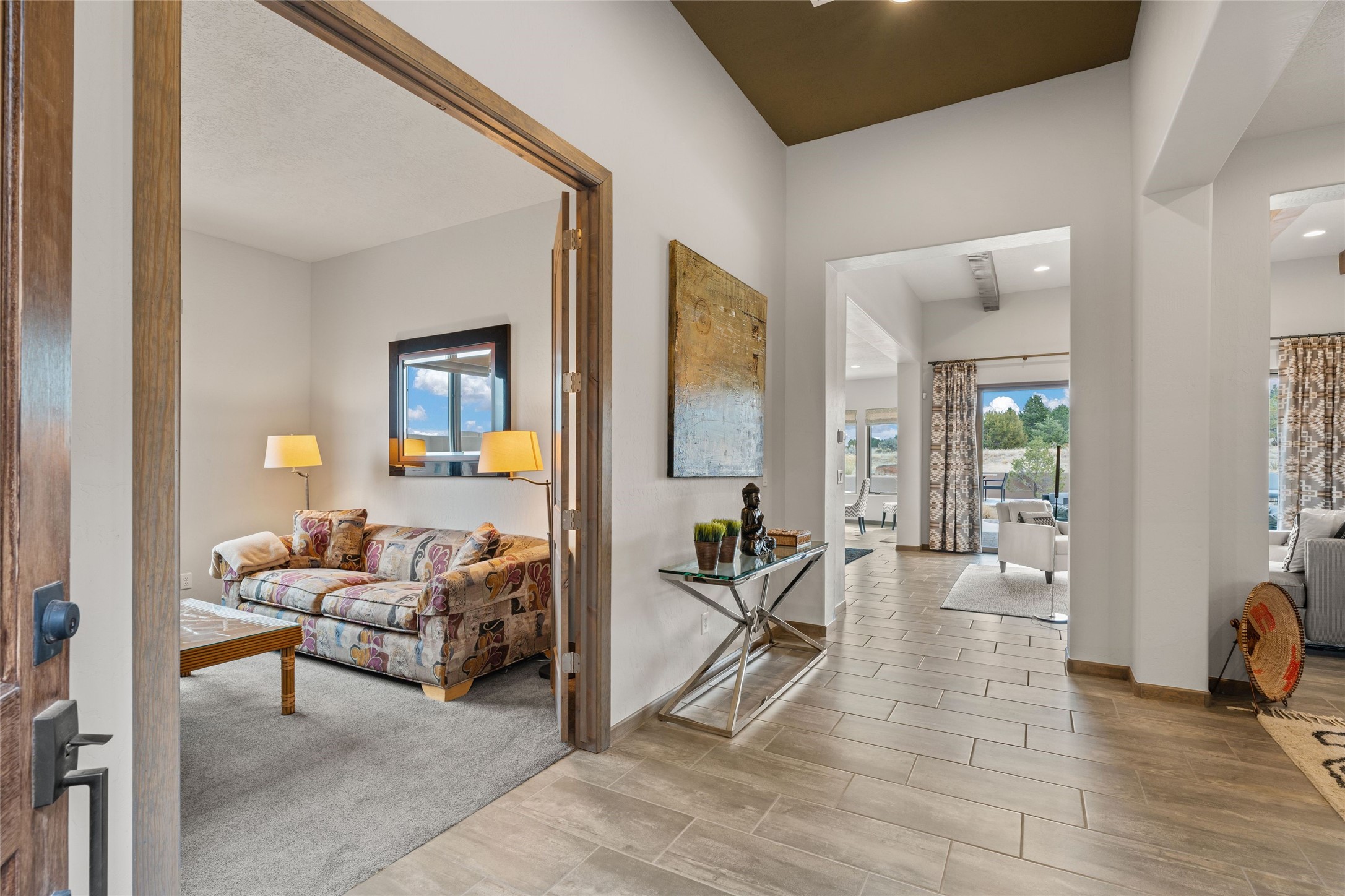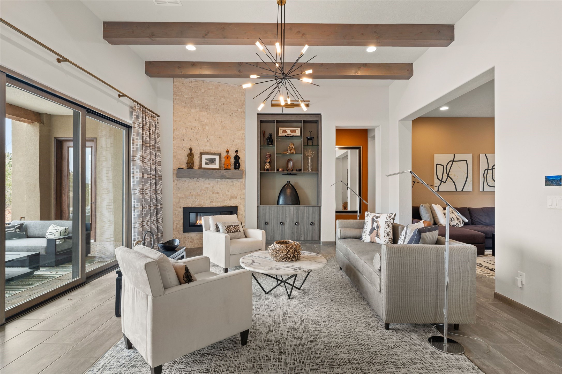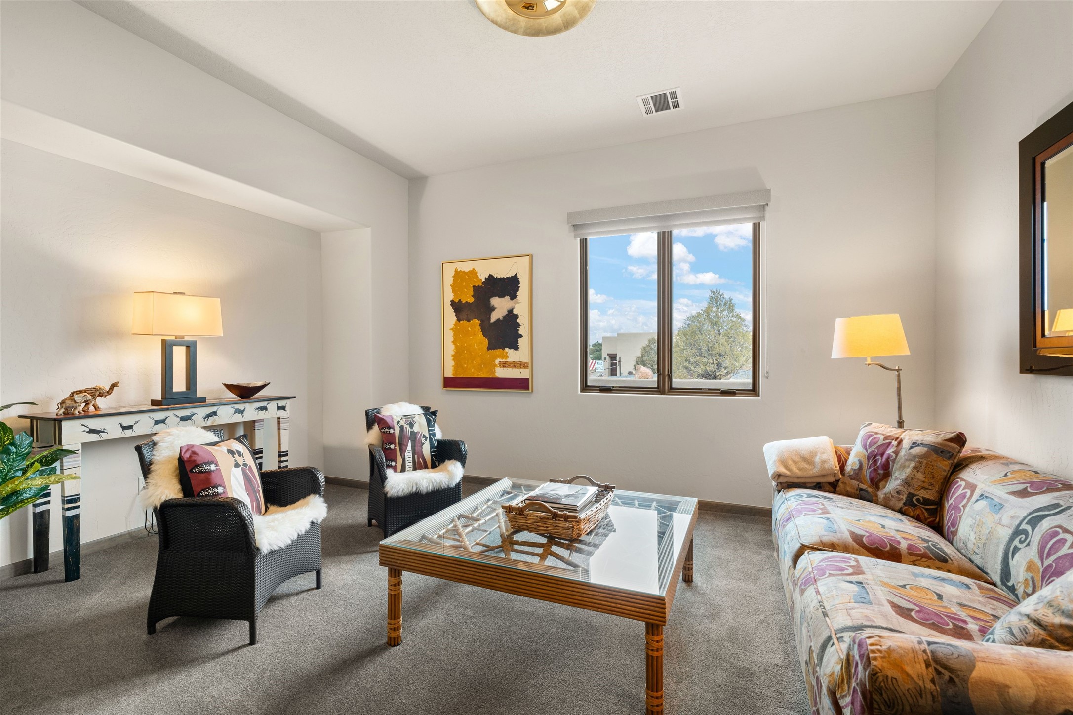 This immaculate home in Las Campanas offers a wonderful blend of privacy, space, and striking Sangre de Cristo Mountain views. Set on one of the most desirable lots in the neighborhood, the home's outdoor living spaces are a highlight. Thoughtfully designed, it balances traditional Santa Fe elements--vigas and beams--with a clean, contemporary finish. The open, light-filled interior features upgraded lighting, designer window treatments, and desirable finishes throughout. With three bedrooms and four bathrooms, including a guest suite with its own living area, the home offers both flexibility and function. A spacious additional room off the main living area provides options for a media room, library, office, or game room. The bright kitchen boasts white quartz countertops, light wood cabinetry, and a spacious pantry. The beautifully landscaped outdoor spaces with brick and stone lined dining and relaxation areas flow from the interior creating seamless indoor-outdoor living. Located just minutes from The Club at Las Campanas, the home offers convenient access to dining, golf, the Spa and Fitness Center, tennis, and pickleball, for the owner who chooses to join the Club. The current owner's Equity Golf membership is available for purchase by the new owner of the beautiful home.