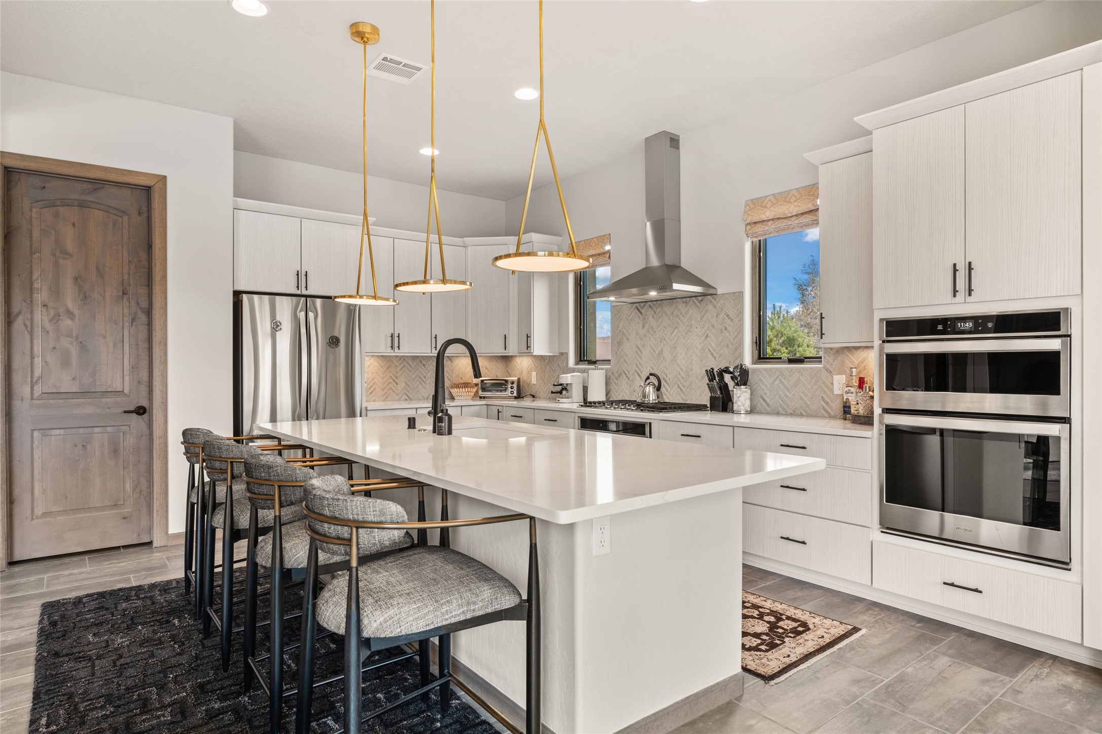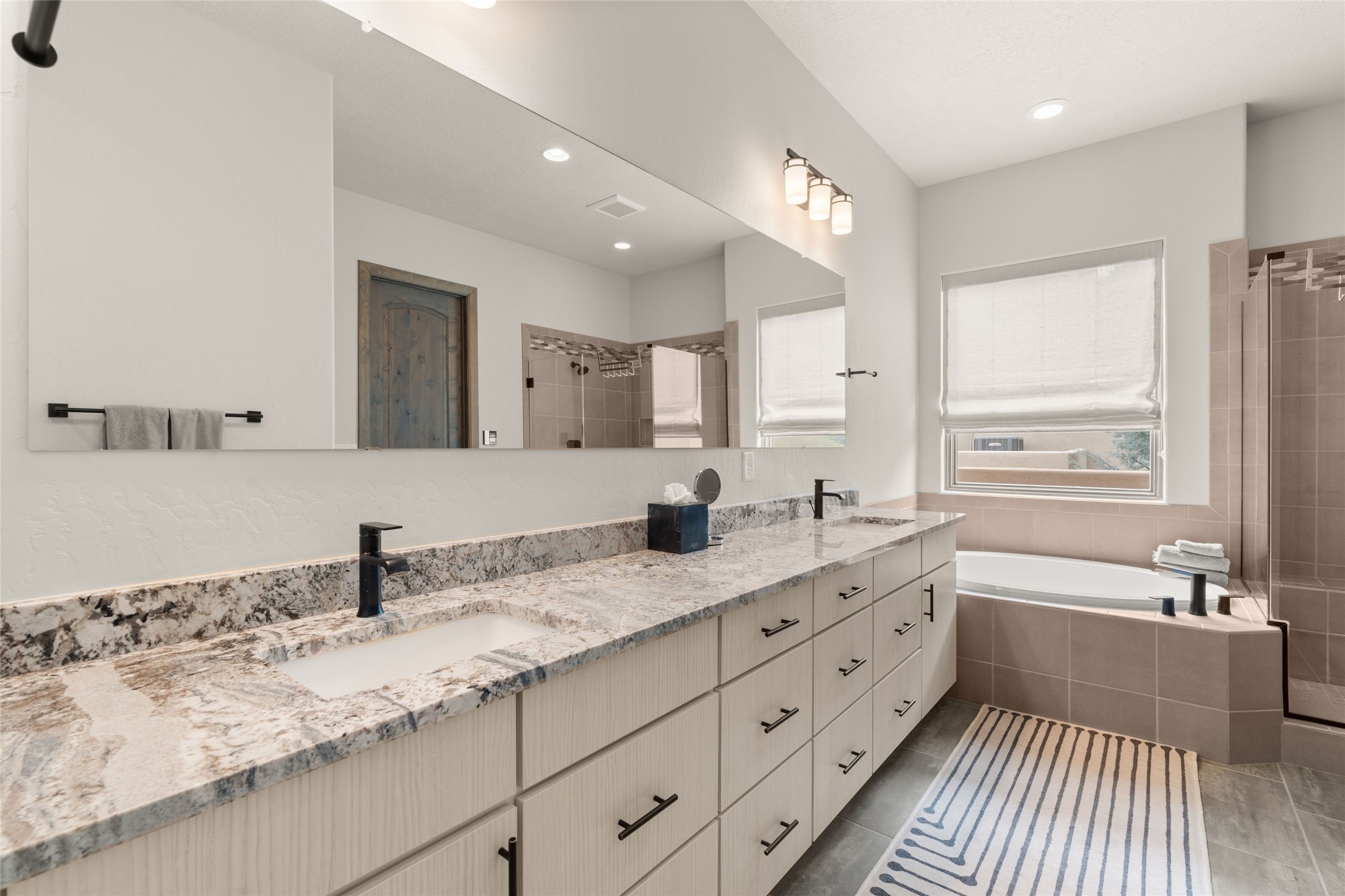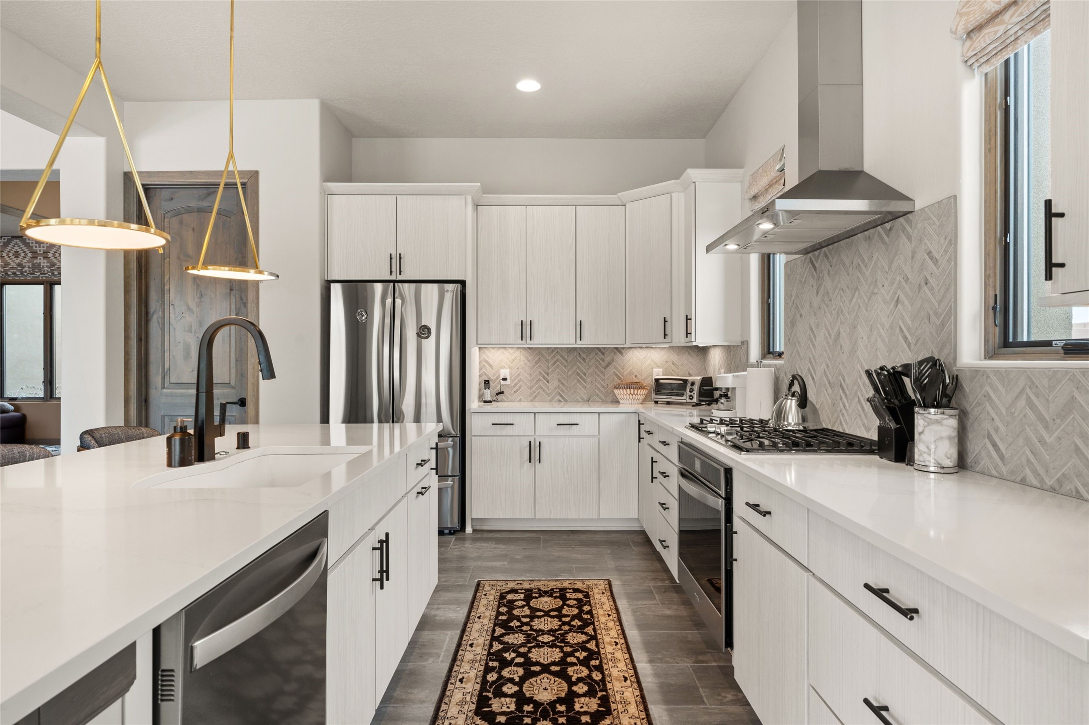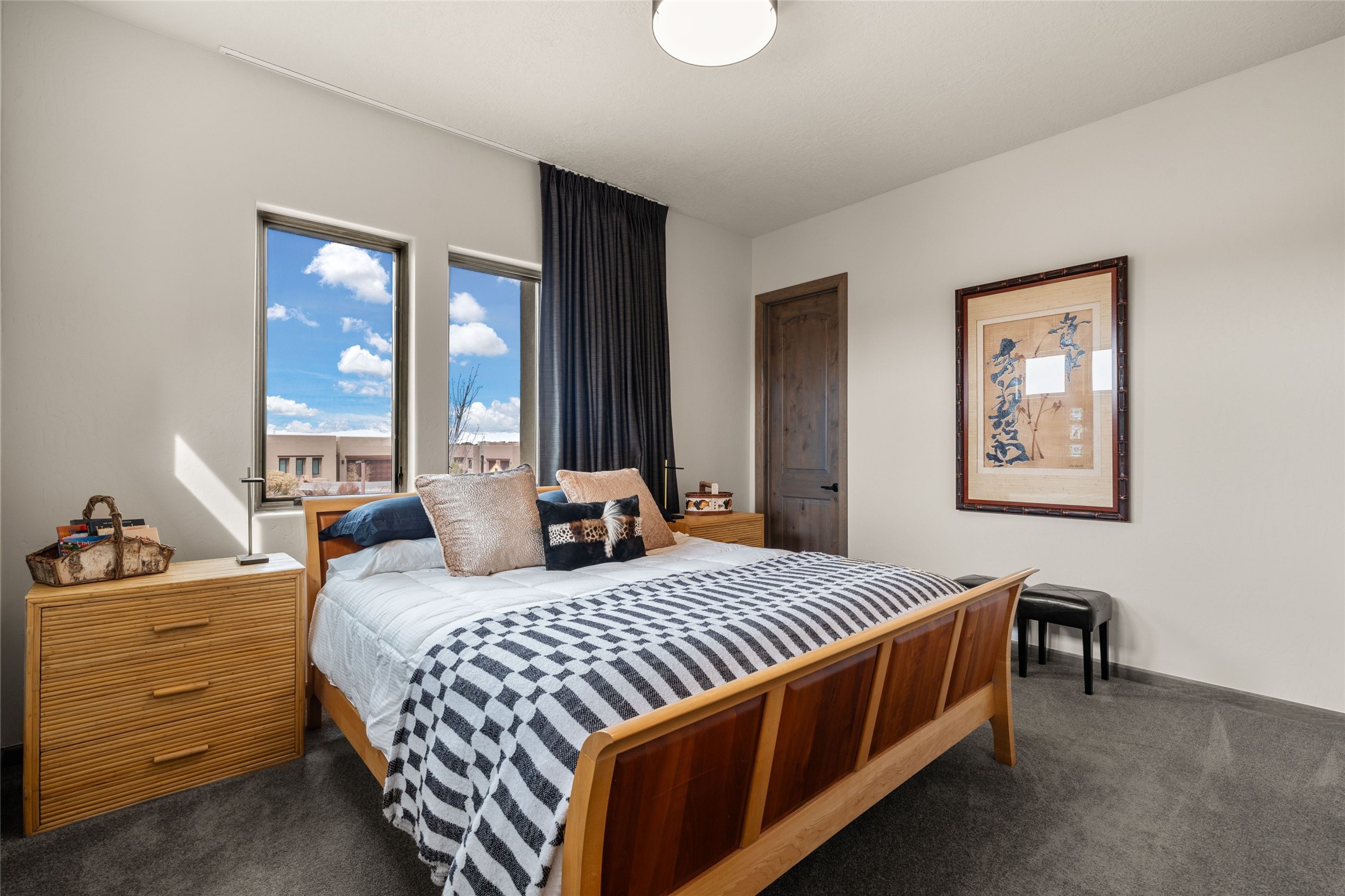This immaculate home in Las Campanas offers a wonderful blend of privacy, space, and striking Sangre de Cristo Mountain views. Set on one of the most desirable lots in the neighborhood, the home's outdoor living spaces are a highlight. Thoughtfully designed, it balances traditional Santa Fe elements--vigas and beams--with a clean, contemporary finish. The open, light-filled interior features upgraded lighting, designer window treatments, and desirable finishes throughout. With three bedrooms and four bathrooms, including a guest suite with its own living area, the home offers both flexibility and function. A spacious additional room off the main living area provides options for a media room, library, office, or game room. The bright kitchen boasts white quartz countertops, light wood cabinetry, and a spacious pantry. The beautifully landscaped outdoor spaces with brick and stone lined dining and relaxation areas flow from the interior creating seamless indoor-outdoor living. Located just minutes from The Club at Las Campanas, the home offers convenient access to dining, golf, the Spa and Fitness Center, tennis, and pickleball, for the owner who chooses to join the Club. The current owner's Equity Golf membership is available for purchase by the new owner of the beautiful home.