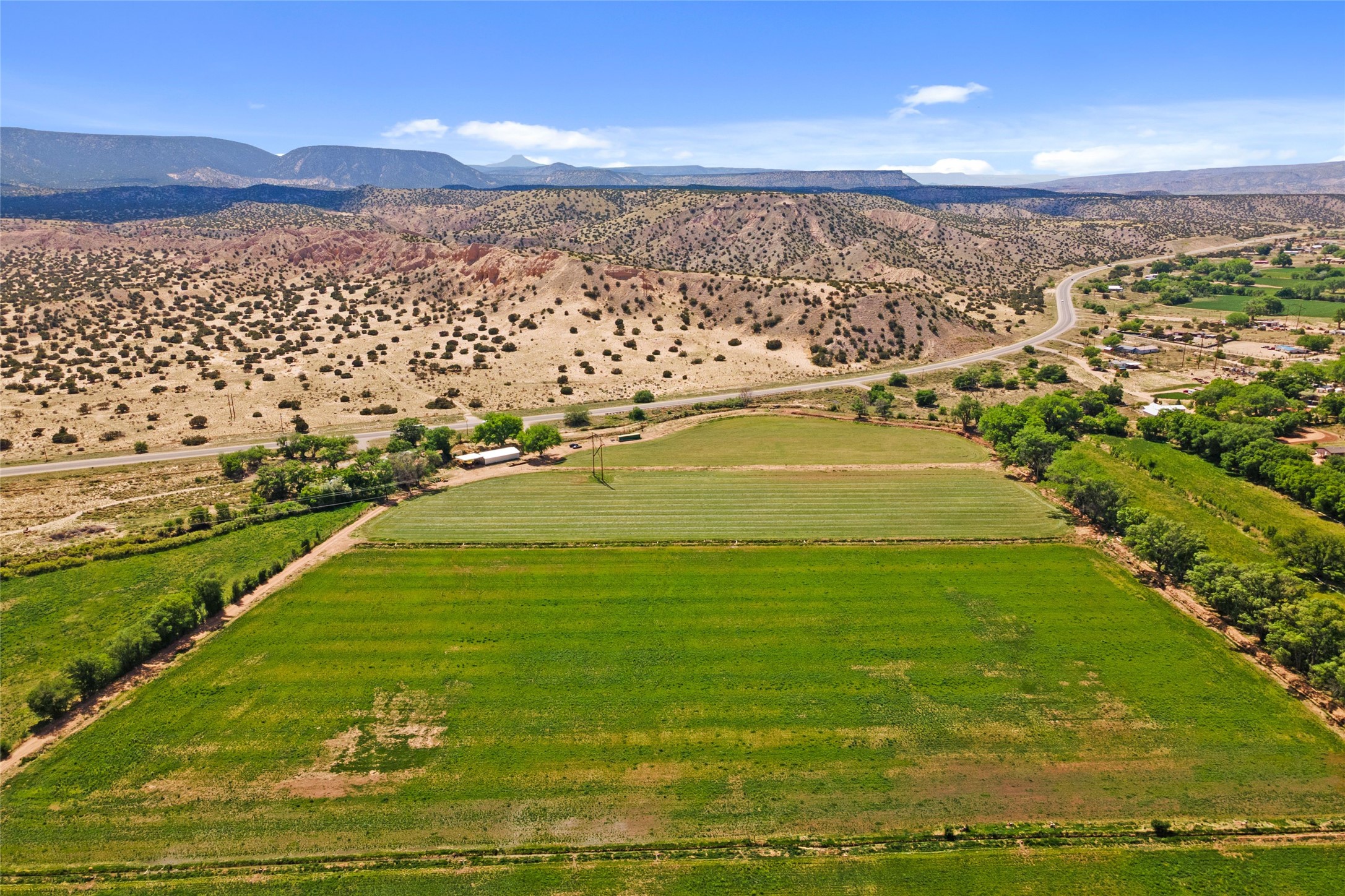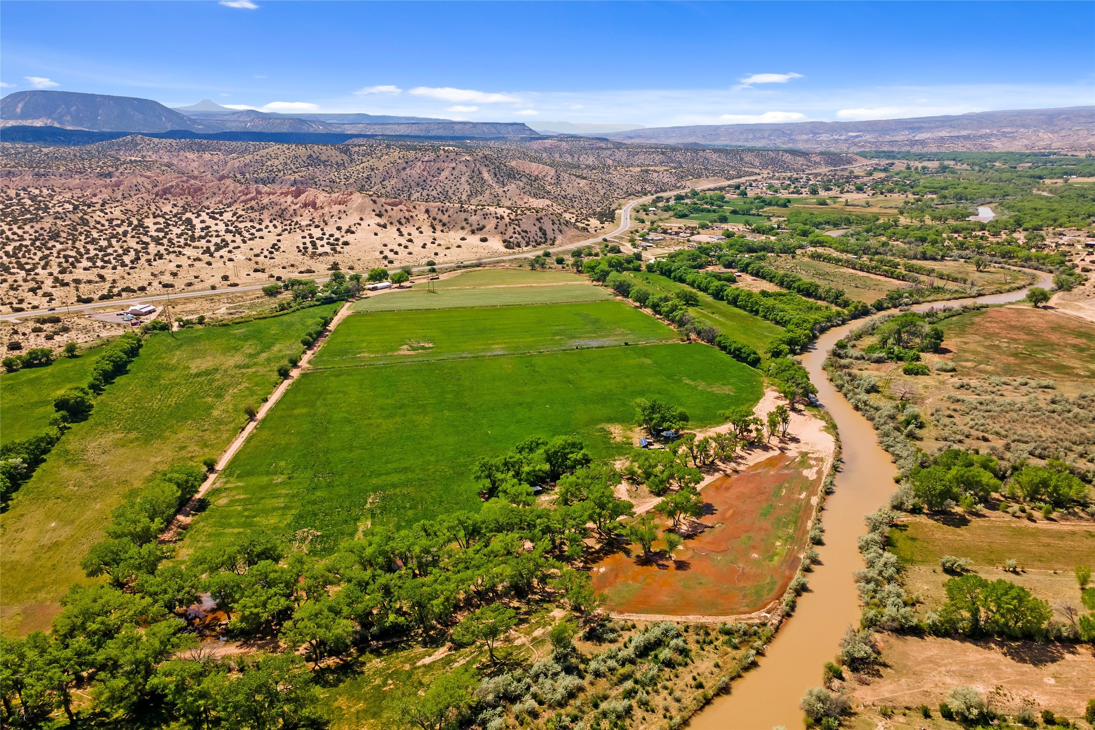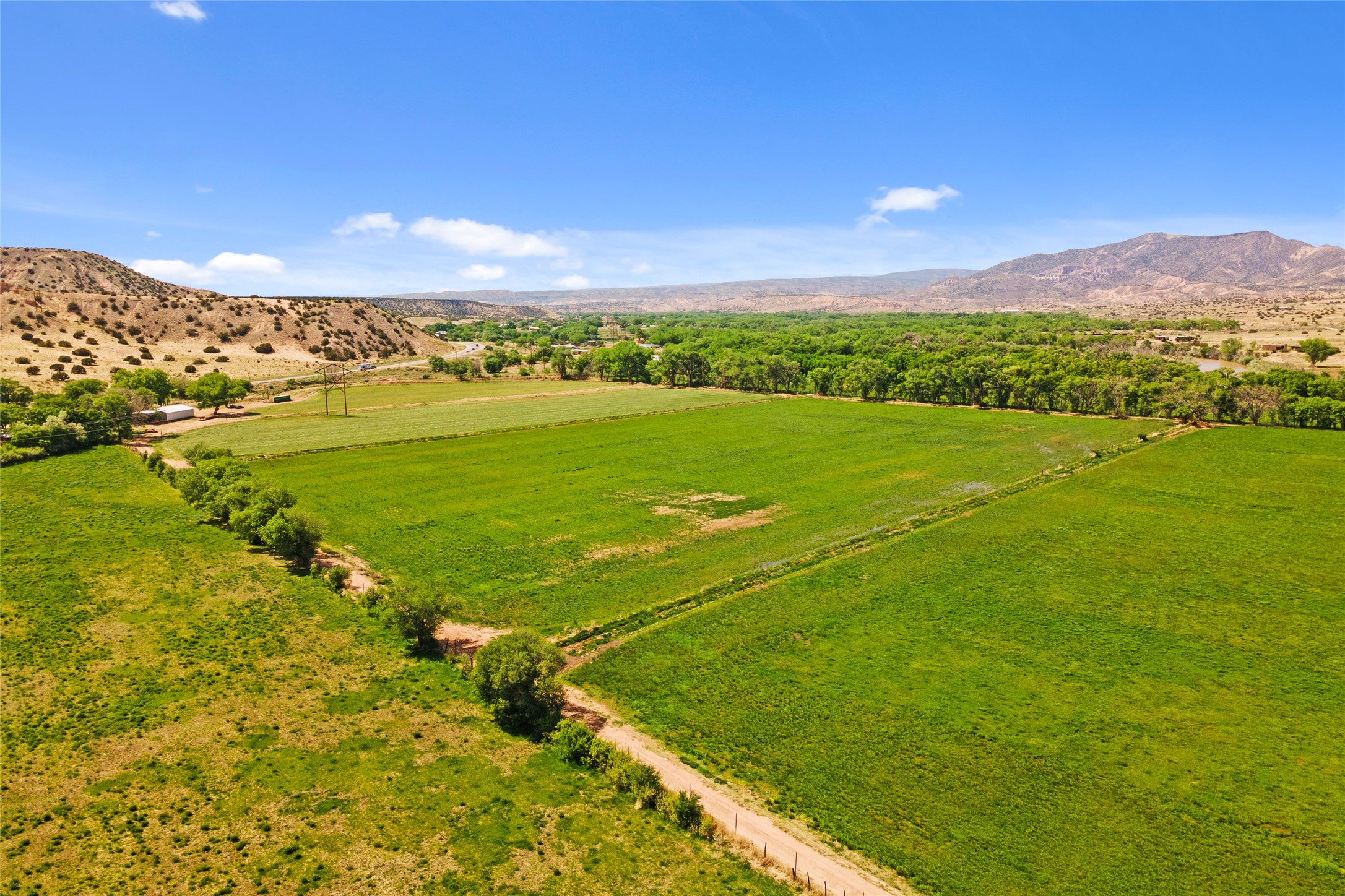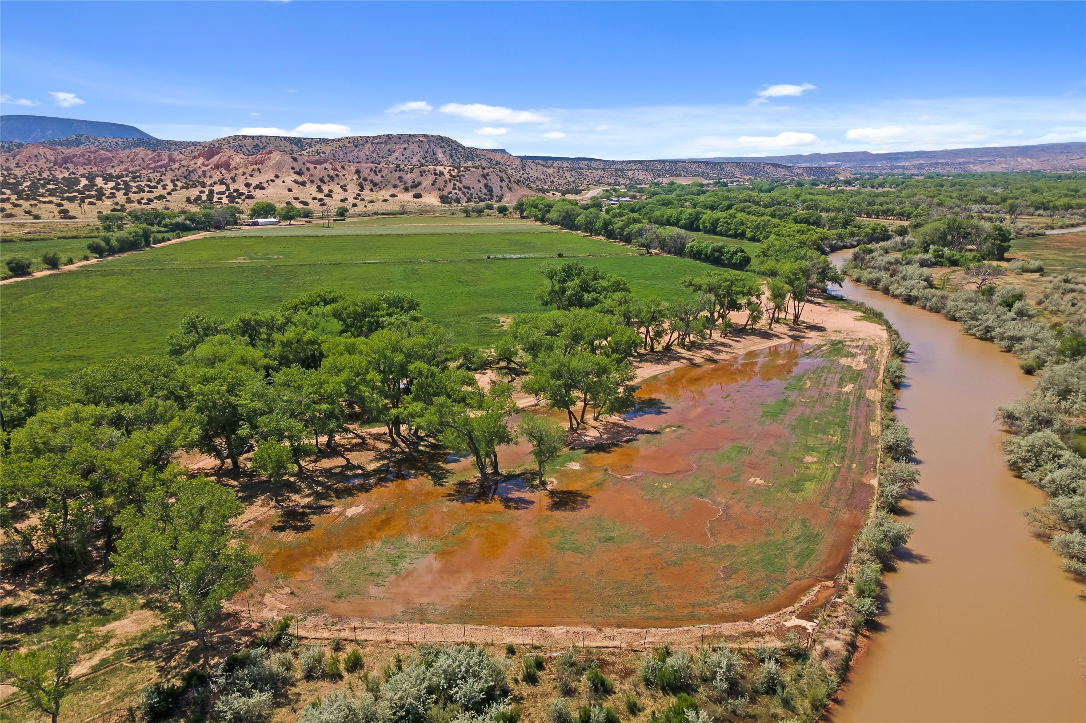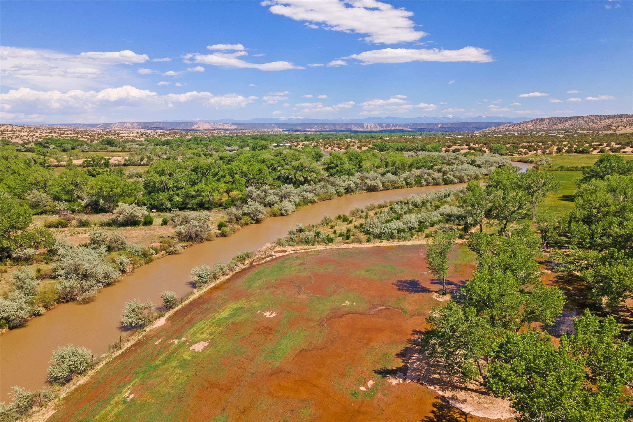 Ideal setting in the Rio Chama Valley for homesite and equestrian facilities with river frontage and stunning views in all directions including barrancas and surrounding mountain ranges. Nestled into a bosque lined with cottonwood trees, willows and native grasses, the property has easy access to riding trails and the Carson National Forest Land. Located just south of Abiquiu, this 53+ acre fertile crop producing farmland with water rights has excellent income potential. Laser-levelled fields, extensive irrigation systems, gates and fencing, solar panels, equipment and storage barn and outbuildings are among the improvements made to this land.
