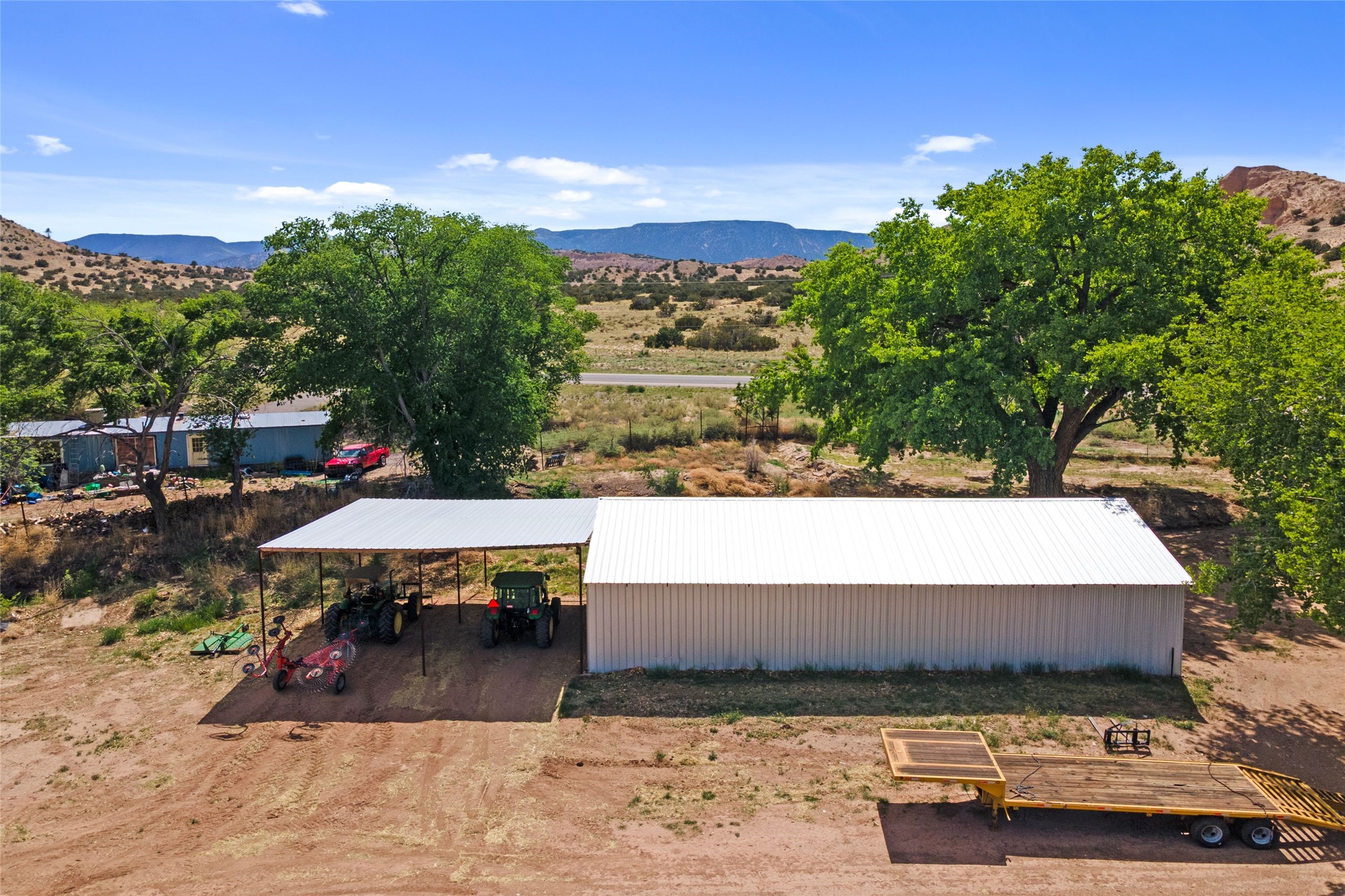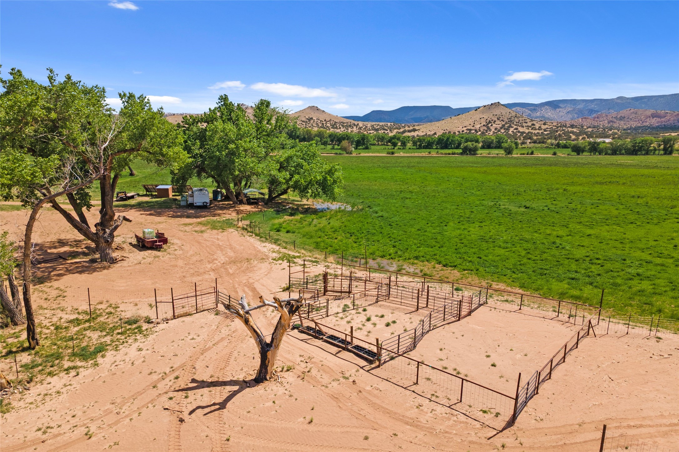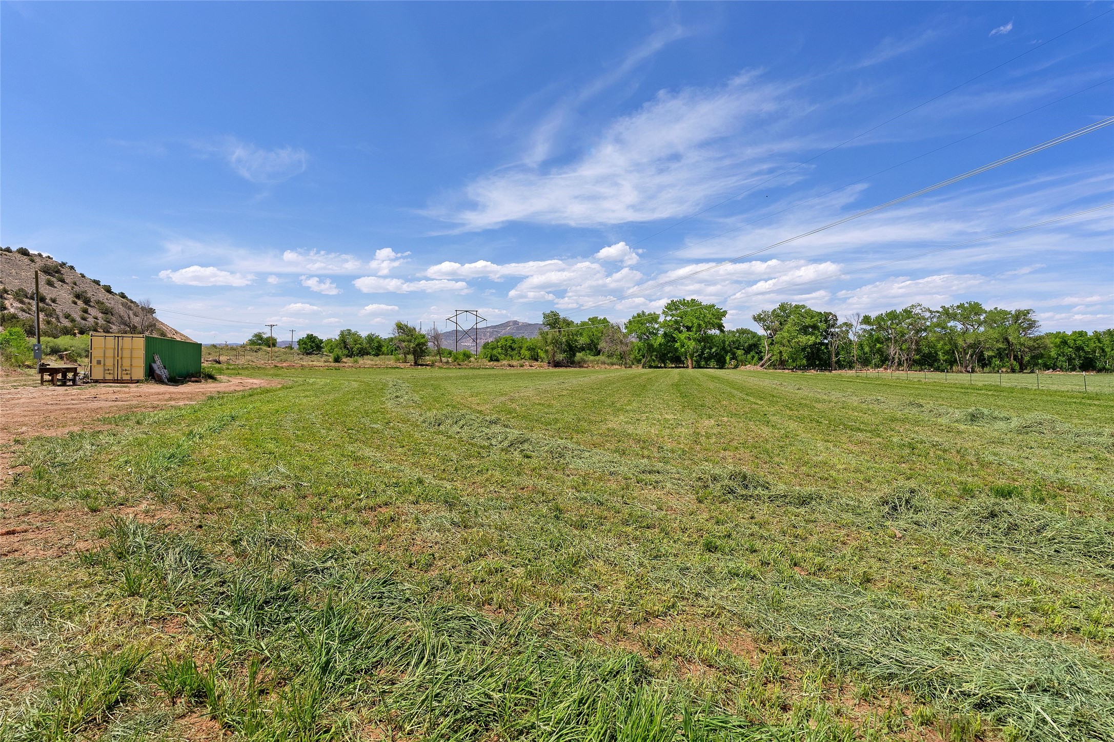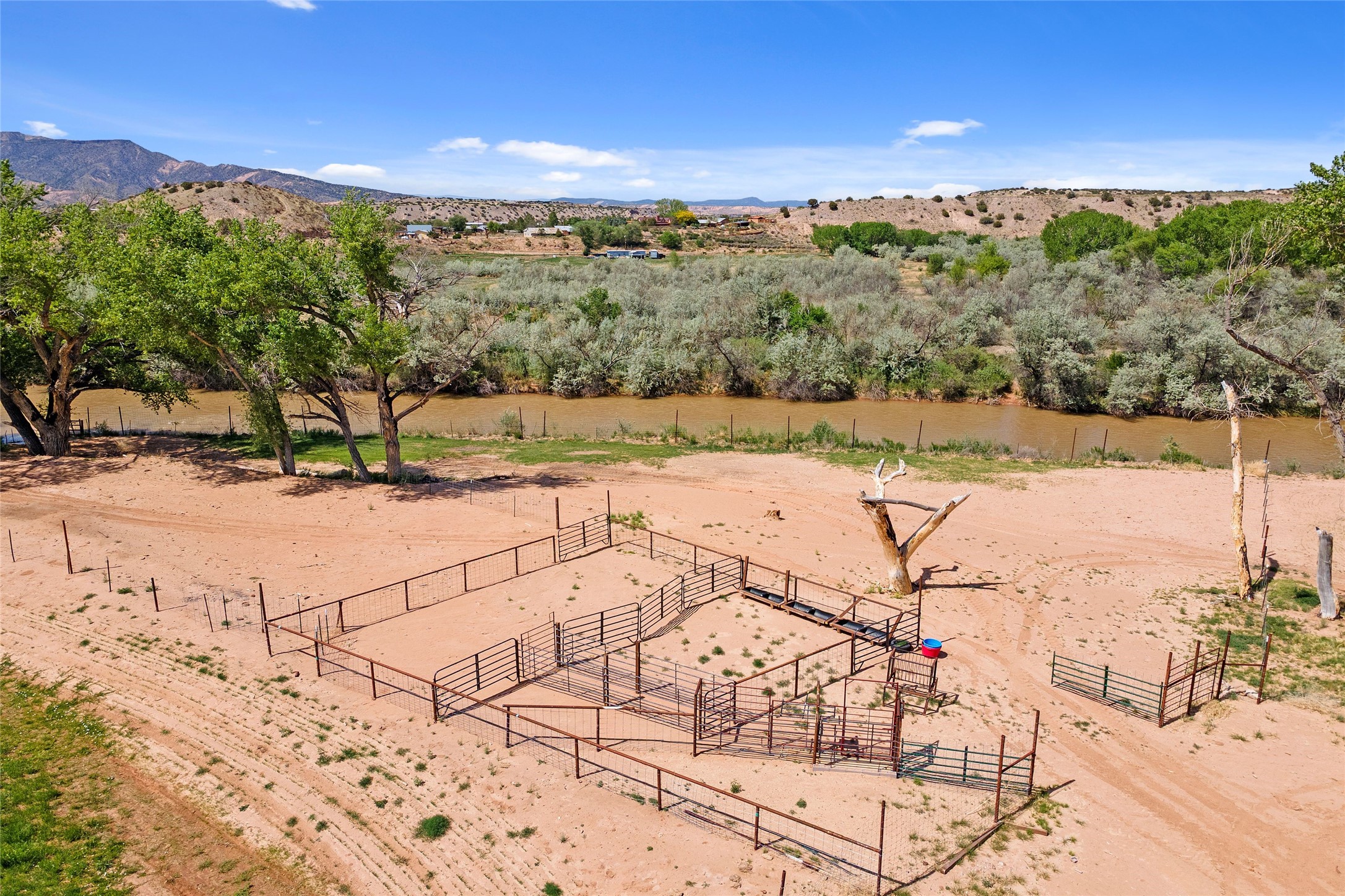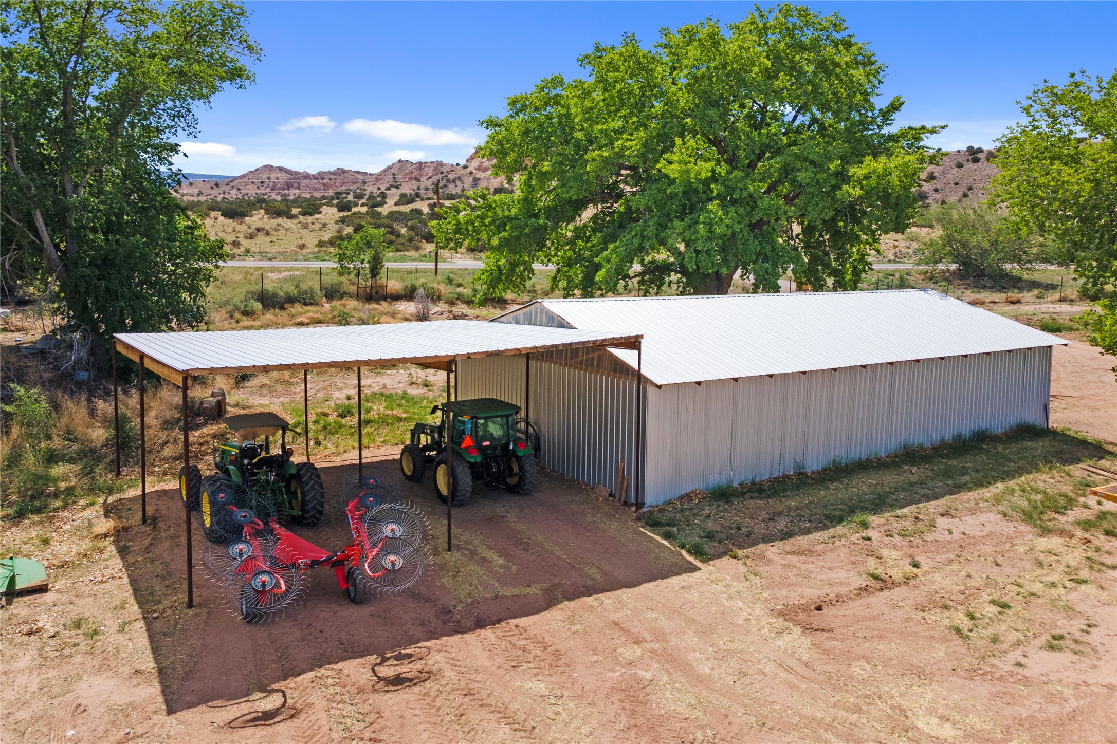 Ideal setting in the Rio Chama Valley for homesite and equestrian facilities with river frontage and stunning views in all directions including barrancas and surrounding mountain ranges. Nestled into a bosque lined with cottonwood trees, willows and native grasses, the property has easy access to riding trails and the Carson National Forest Land. Located just south of Abiquiu, this 53+ acre fertile crop producing farmland with water rights has excellent income potential. Laser-levelled fields, extensive irrigation systems, gates and fencing, solar panels, equipment and storage barn and outbuildings are among the improvements made to this land.
