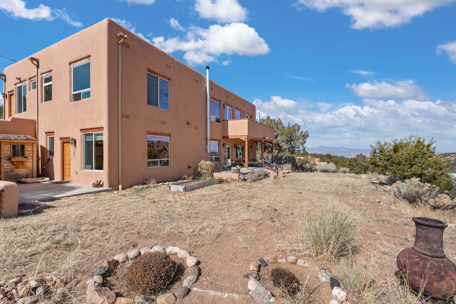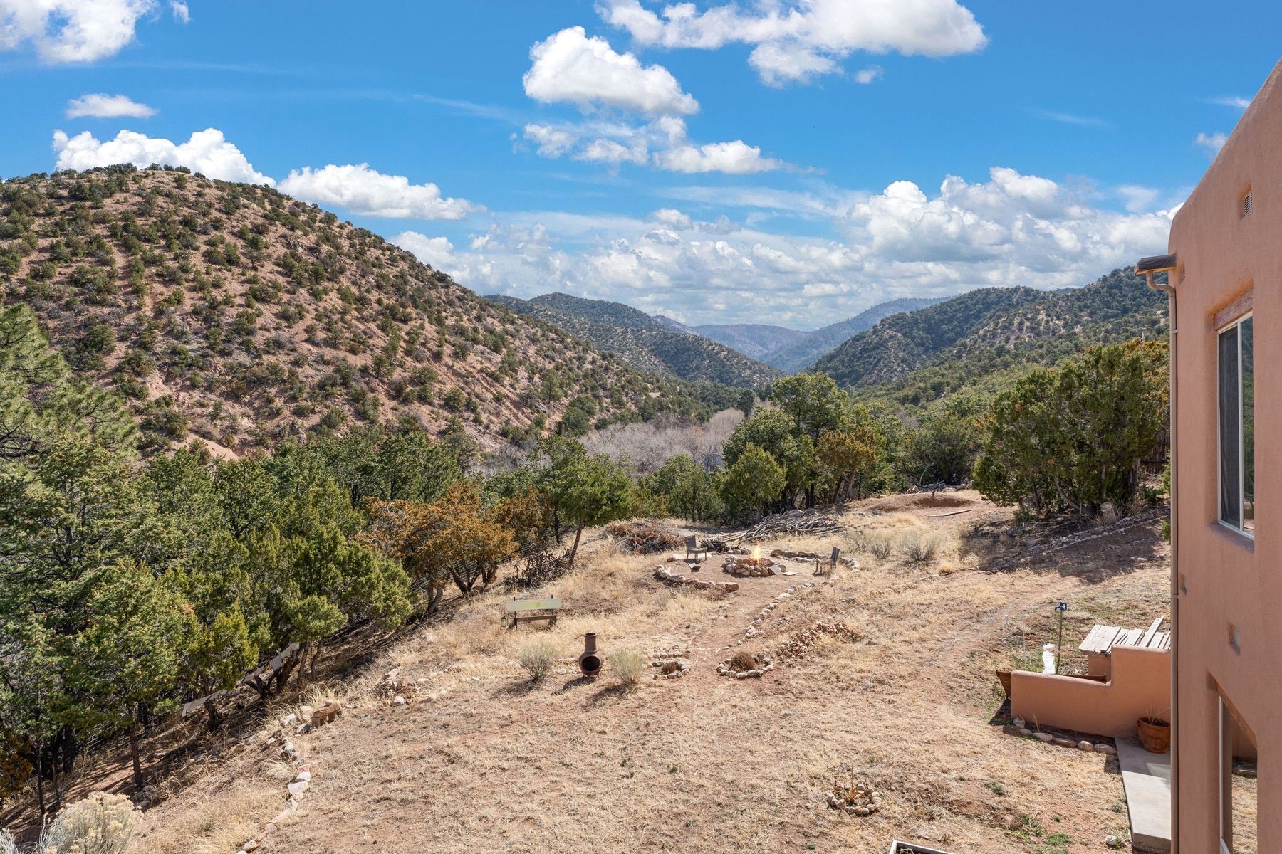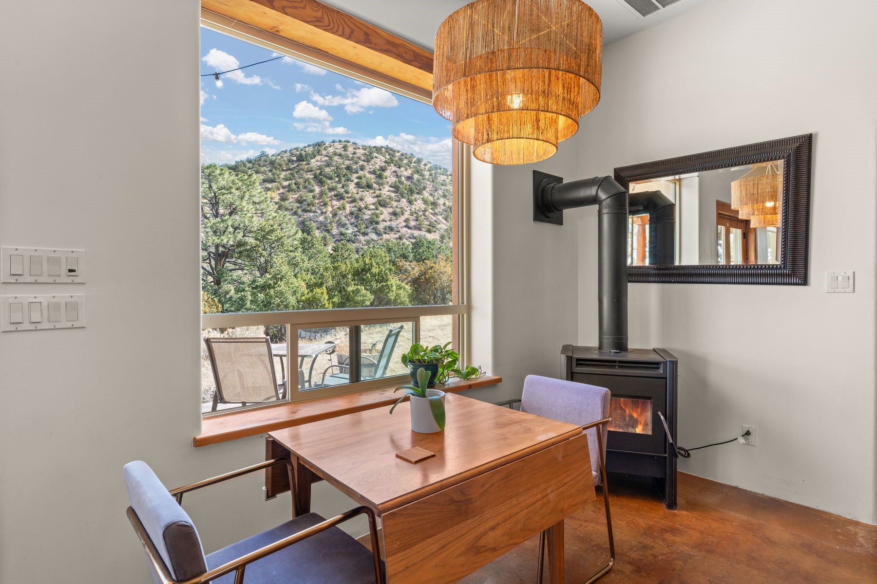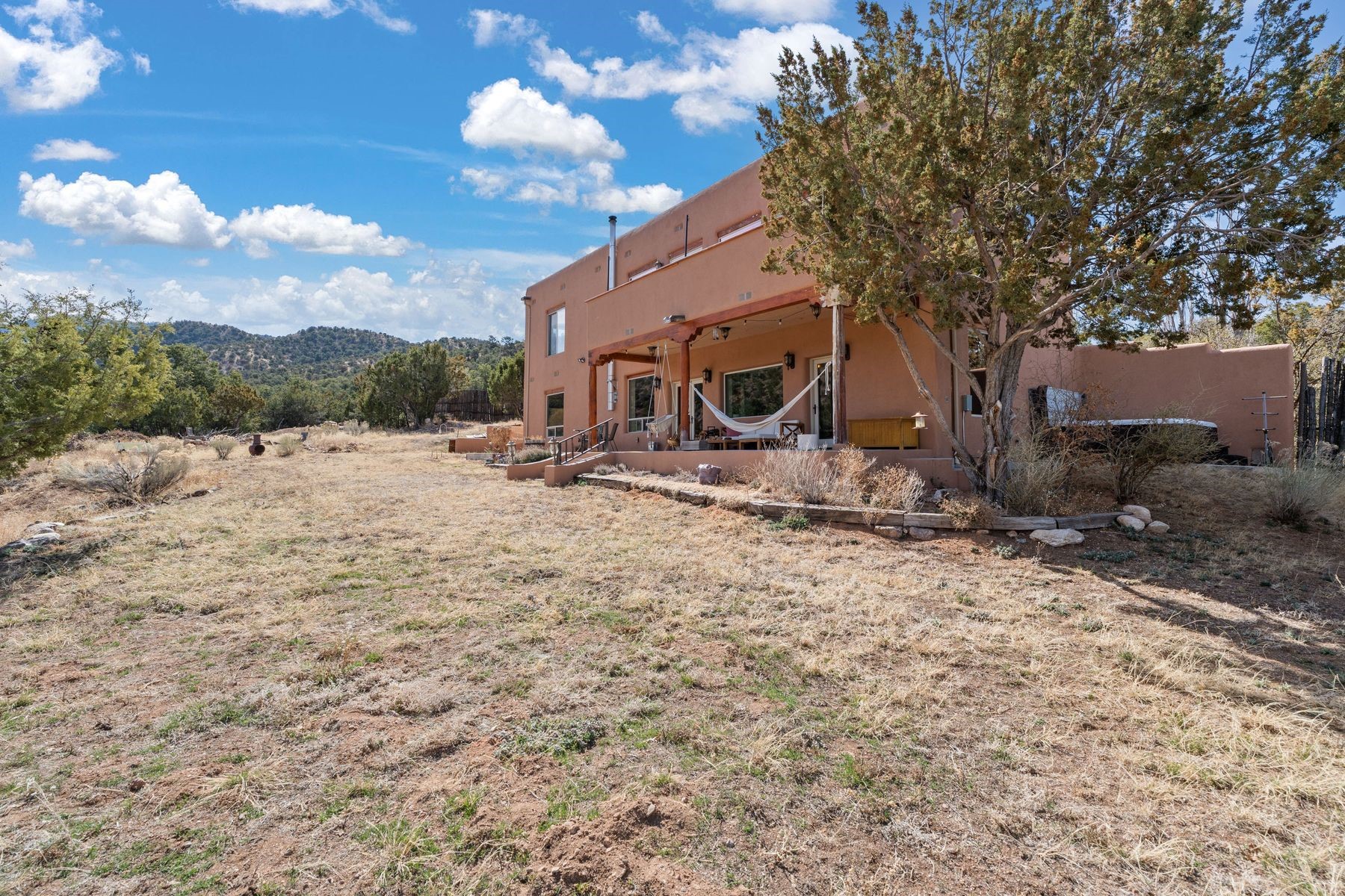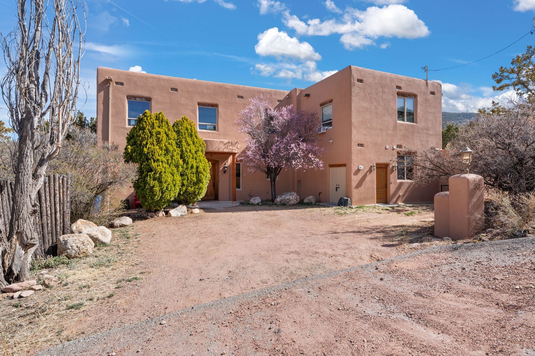 Sited in the heart of the mountains, this amazing approx. 3,394 sq. ft. home offers unparalleled privacy, Jemez and sunset views, and year-round natural beauty. Situated on a secluded 0.7-acre lot, the property is located near the river that flows year-round, lush surroundings, and abundant wildlife--truly a nature lover's or hiker's dream.Built in 2001 and thoughtfully remodeled by DreamStyle, this home blends modern comforts with rustic charm. Inside, stained concrete floors, radiant heat, and a wood-burning stove in the kitchen create a warm and inviting atmosphere. A new boiler ensures energy efficiency, while some newly replaced windows maximize natural light and showcase the stunning landscape.The main house features a spacious main floor with a powder room and an open flow to the outdoors, where a large portal and hot tub offer a perfect retreat. Upstairs, you'll find two bedrooms, an office space, a versatile den/living room, and an balcony with new decking--ideal for enjoying the mountain views.Adding to the home's versatility, an attached guesthouse with its own private entrance, kitchen, bedroom, and living area provides the perfect space for guests, a studio, an office, or a rental opportunity. The guesthouse can be fully integrated with the main home or closed off for complete privacy.Recent upgrades include new stucco (completed last summer), several new windows and doors. The property has duct system, allowing for AC installation if desired. Outside, the lush backyard features fruit trees (plum and apricot), a traditional acequia, and a storage shed.Perfectly suited for remote workers (Starlink-ready for internet), artists, and outdoor enthusiasts, this tranquil retreat is just minutes to The Santa Fe Opera, Four Seasons Resort, Tesuque Village Market, and less than 15 miles from Santa Fe.This is mountain living at its finest--secluded, serene, and surrounded by natural beauty.