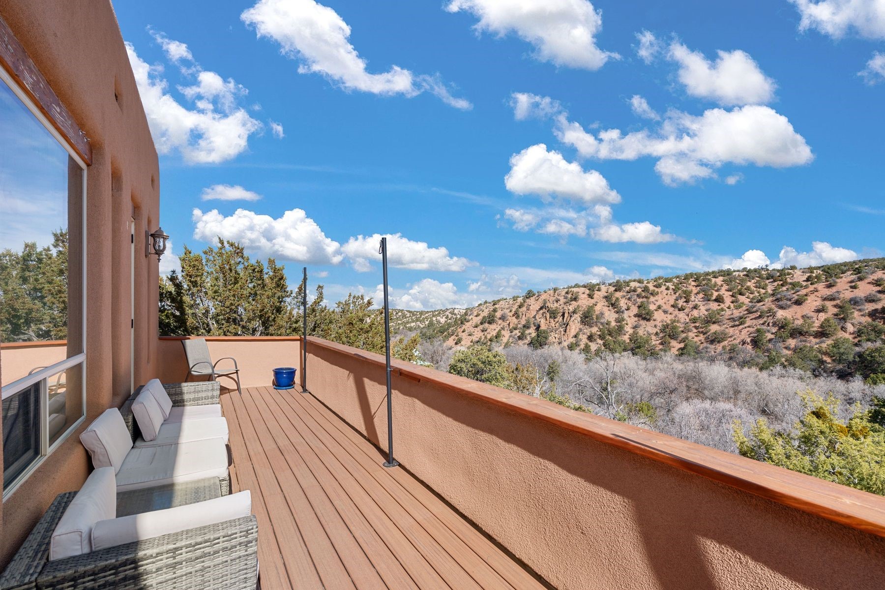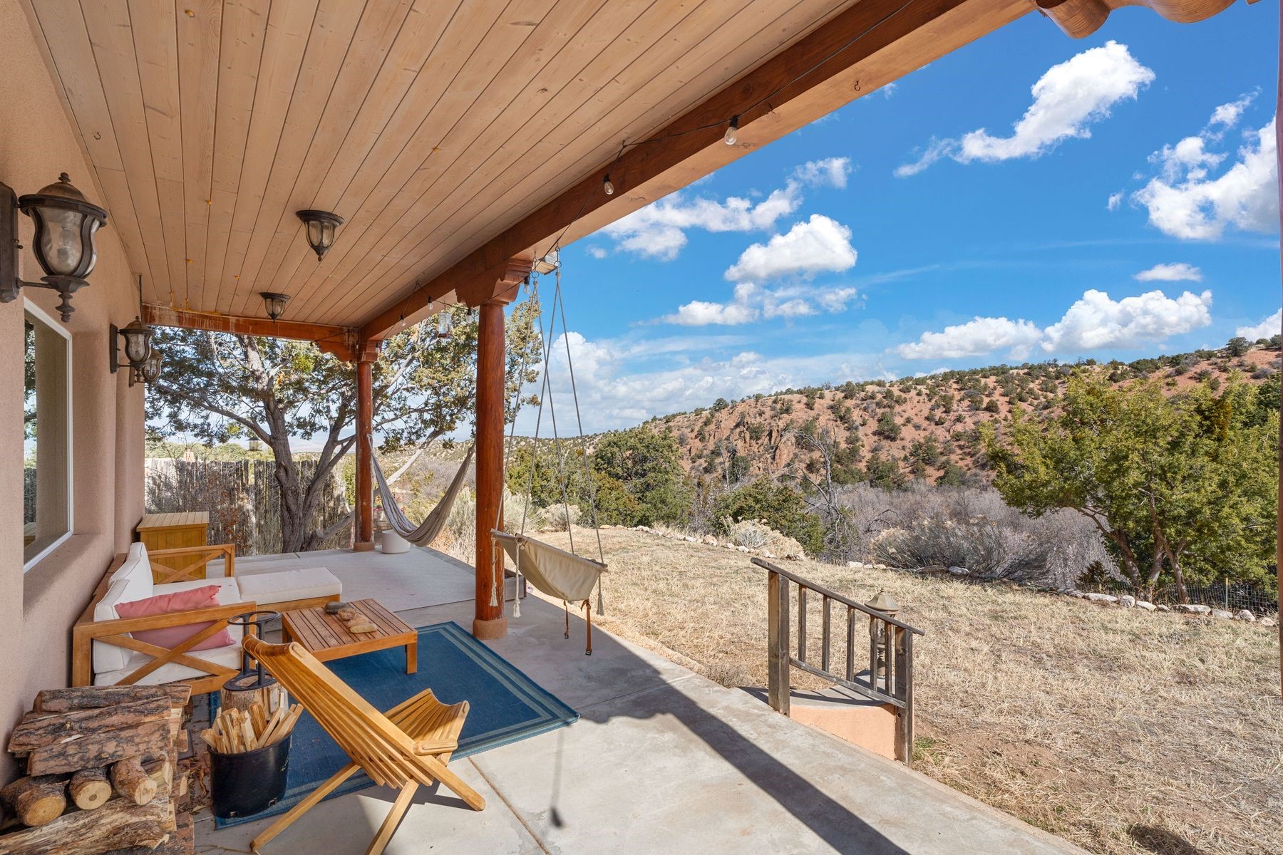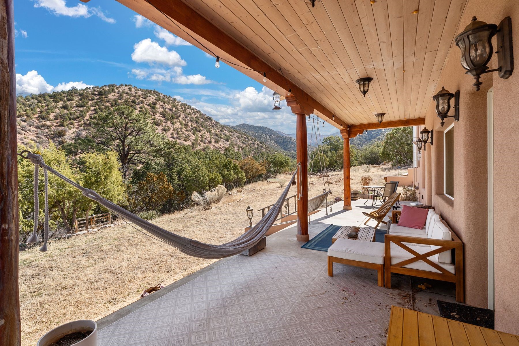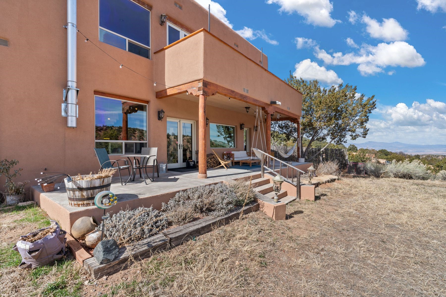 Sited in the heart of the mountains, this amazing approx. 3,394 sq. ft. home offers unparalleled privacy, Jemez and sunset views, and year-round natural beauty. Situated on a secluded 0.7-acre lot, the property is located near the river that flows year-round, lush surroundings, and abundant wildlife--truly a nature lover's or hiker's dream.Built in 2001 and thoughtfully remodeled by DreamStyle, this home blends modern comforts with rustic charm. Inside, stained concrete floors, radiant heat, and a wood-burning stove in the kitchen create a warm and inviting atmosphere. A new boiler ensures energy efficiency, while some newly replaced windows maximize natural light and showcase the stunning landscape.The main house features a spacious main floor with a powder room and an open flow to the outdoors, where a large portal and hot tub offer a perfect retreat. Upstairs, you'll find two bedrooms, an office space, a versatile den/living room, and an balcony with new decking--ideal for enjoying the mountain views.Adding to the home's versatility, an attached guesthouse with its own private entrance, kitchen, bedroom, and living area provides the perfect space for guests, a studio, an office, or a rental opportunity. The guesthouse can be fully integrated with the main home or closed off for complete privacy.Recent upgrades include new stucco (completed last summer), several new windows and doors. The property has duct system, allowing for AC installation if desired. Outside, the lush backyard features fruit trees (plum and apricot), a traditional acequia, and a storage shed.Perfectly suited for remote workers (Starlink-ready for internet), artists, and outdoor enthusiasts, this tranquil retreat is just minutes to The Santa Fe Opera, Four Seasons Resort, Tesuque Village Market, and less than 15 miles from Santa Fe.This is mountain living at its finest--secluded, serene, and surrounded by natural beauty.