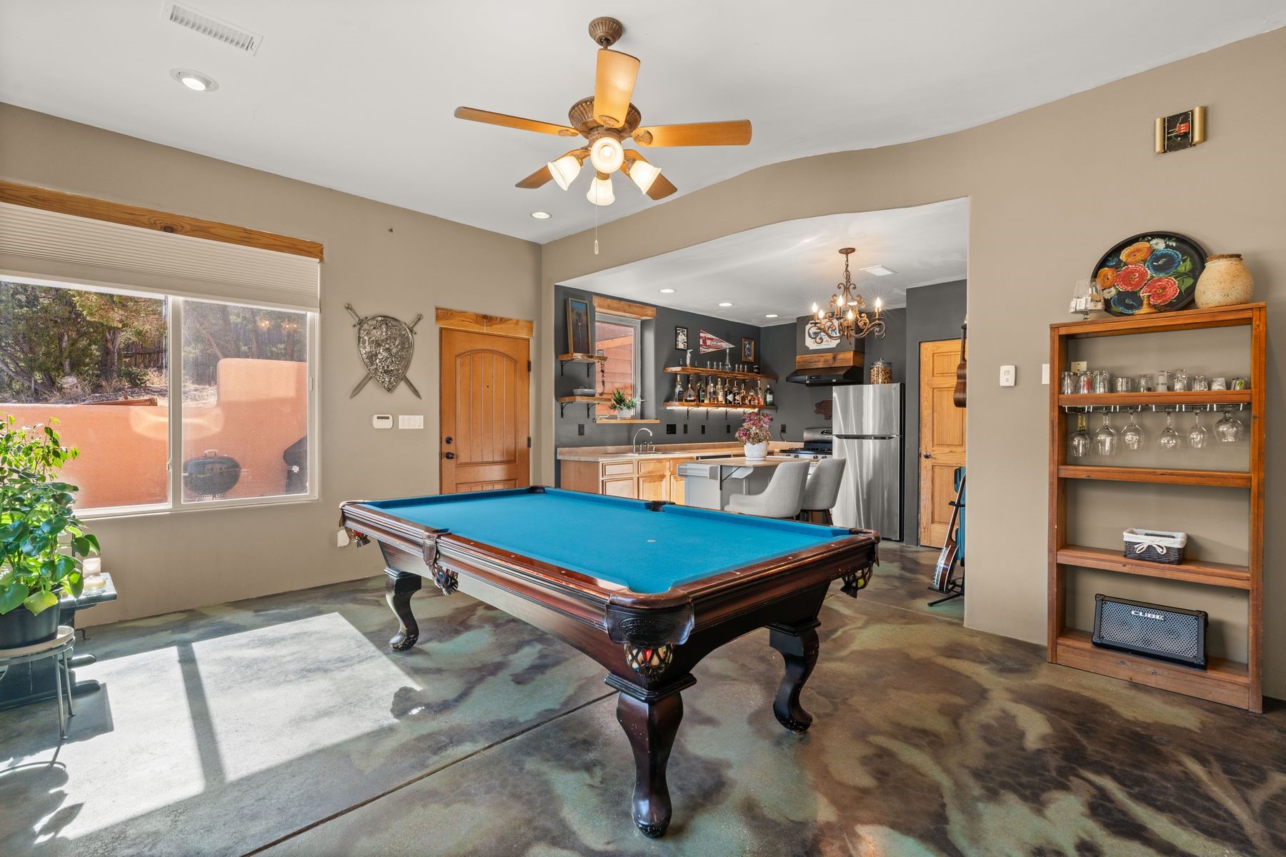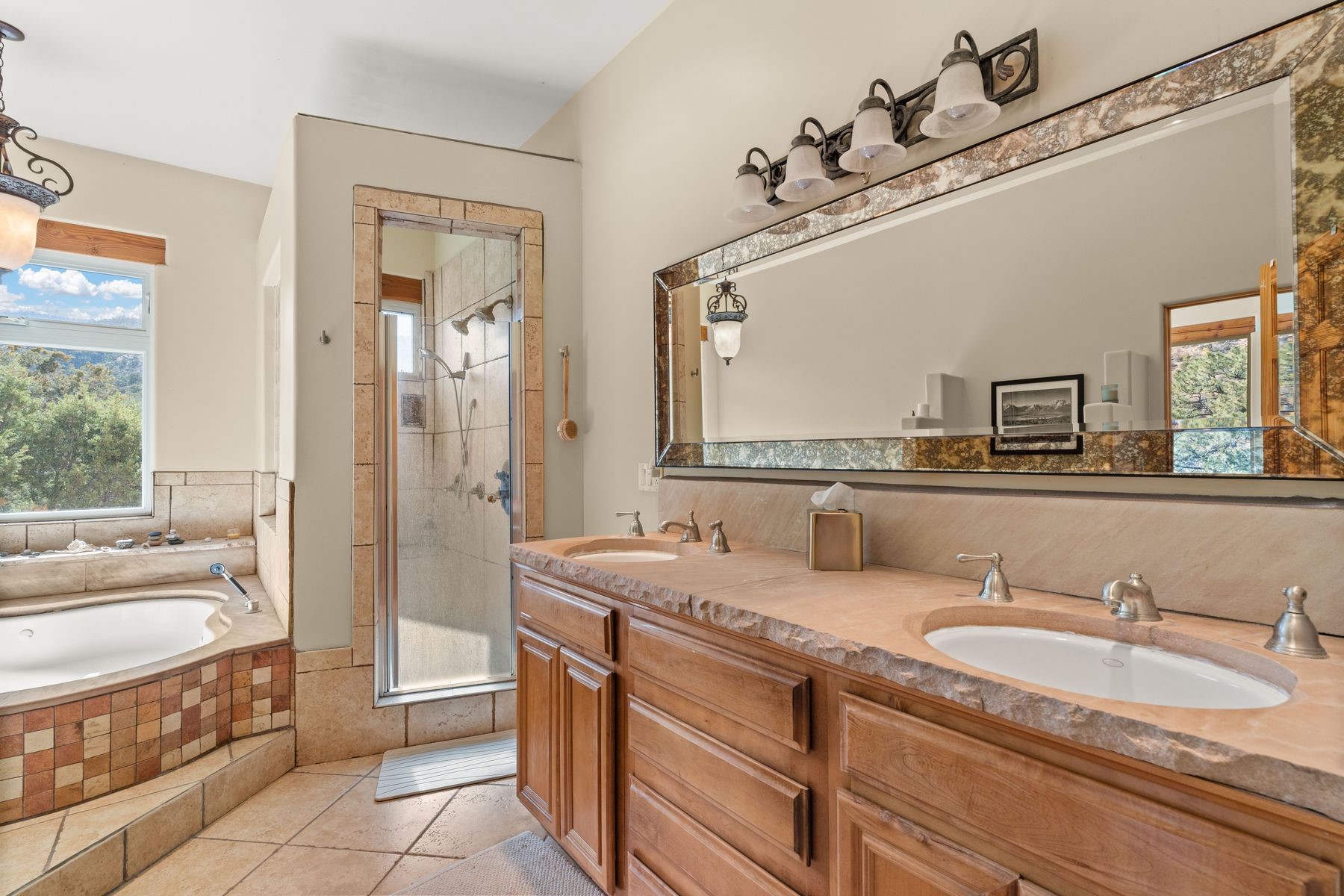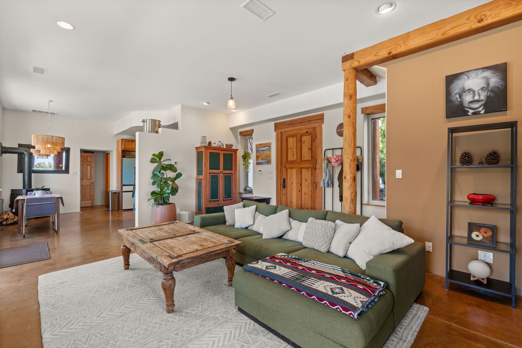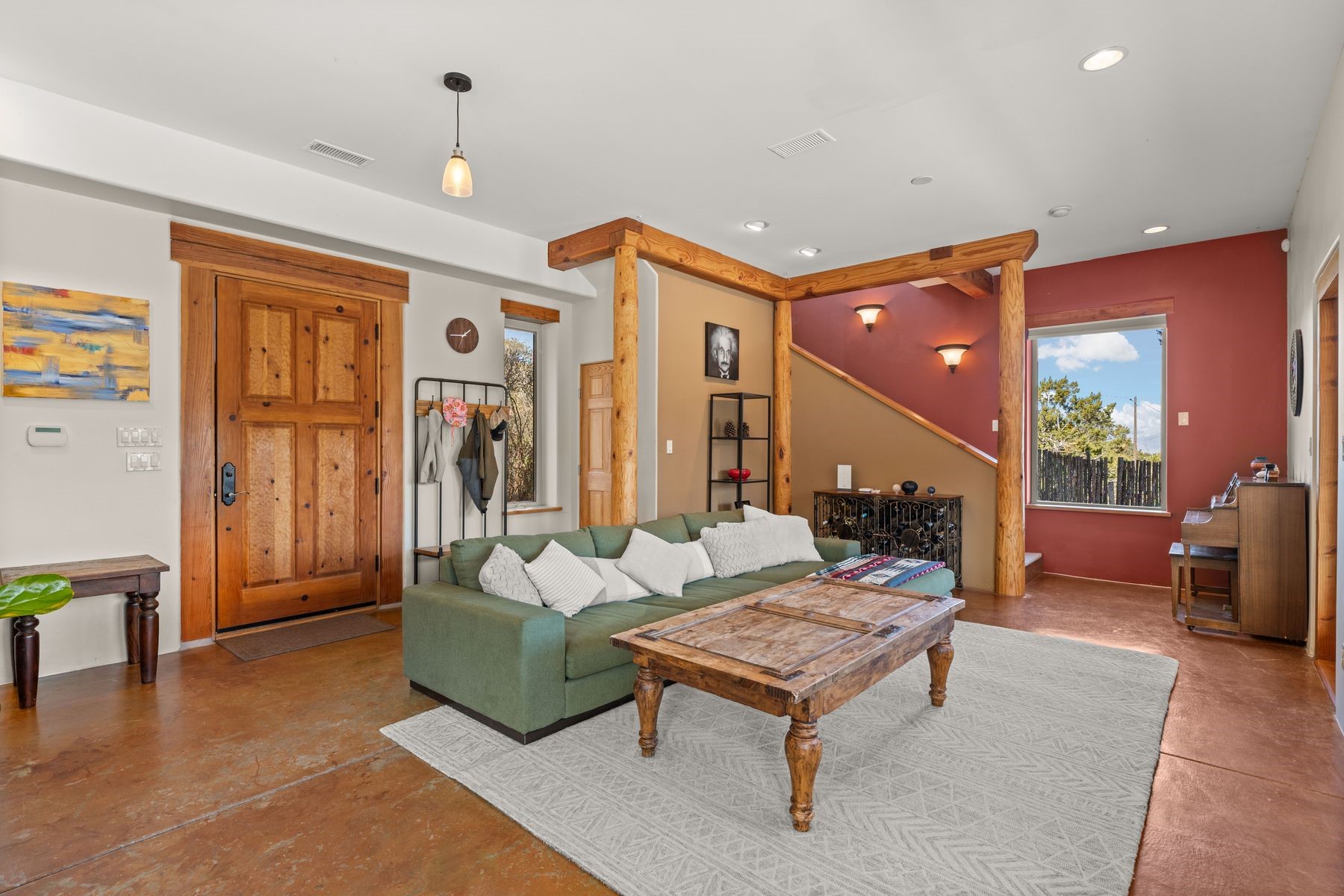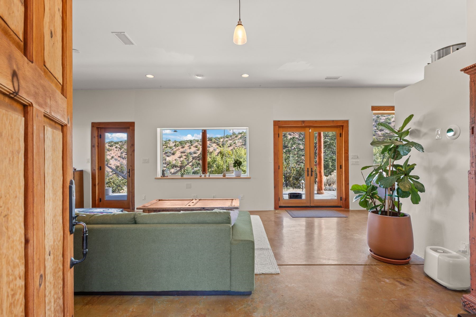 Sited in the heart of the mountains, this amazing approx. 3,394 sq. ft. home offers unparalleled privacy, Jemez and sunset views, and year-round natural beauty. Situated on a secluded 0.7-acre lot, the property is located near the river that flows year-round, lush surroundings, and abundant wildlife--truly a nature lover's or hiker's dream.Built in 2001 and thoughtfully remodeled by DreamStyle, this home blends modern comforts with rustic charm. Inside, stained concrete floors, radiant heat, and a wood-burning stove in the kitchen create a warm and inviting atmosphere. A new boiler ensures energy efficiency, while some newly replaced windows maximize natural light and showcase the stunning landscape.The main house features a spacious main floor with a powder room and an open flow to the outdoors, where a large portal and hot tub offer a perfect retreat. Upstairs, you'll find two bedrooms, an office space, a versatile den/living room, and an balcony with new decking--ideal for enjoying the mountain views.Adding to the home's versatility, an attached guesthouse with its own private entrance, kitchen, bedroom, and living area provides the perfect space for guests, a studio, an office, or a rental opportunity. The guesthouse can be fully integrated with the main home or closed off for complete privacy.Recent upgrades include new stucco (completed last summer), several new windows and doors. The property has duct system, allowing for AC installation if desired. Outside, the lush backyard features fruit trees (plum and apricot), a traditional acequia, and a storage shed.Perfectly suited for remote workers (Starlink-ready for internet), artists, and outdoor enthusiasts, this tranquil retreat is just minutes to The Santa Fe Opera, Four Seasons Resort, Tesuque Village Market, and less than 15 miles from Santa Fe.This is mountain living at its finest--secluded, serene, and surrounded by natural beauty.