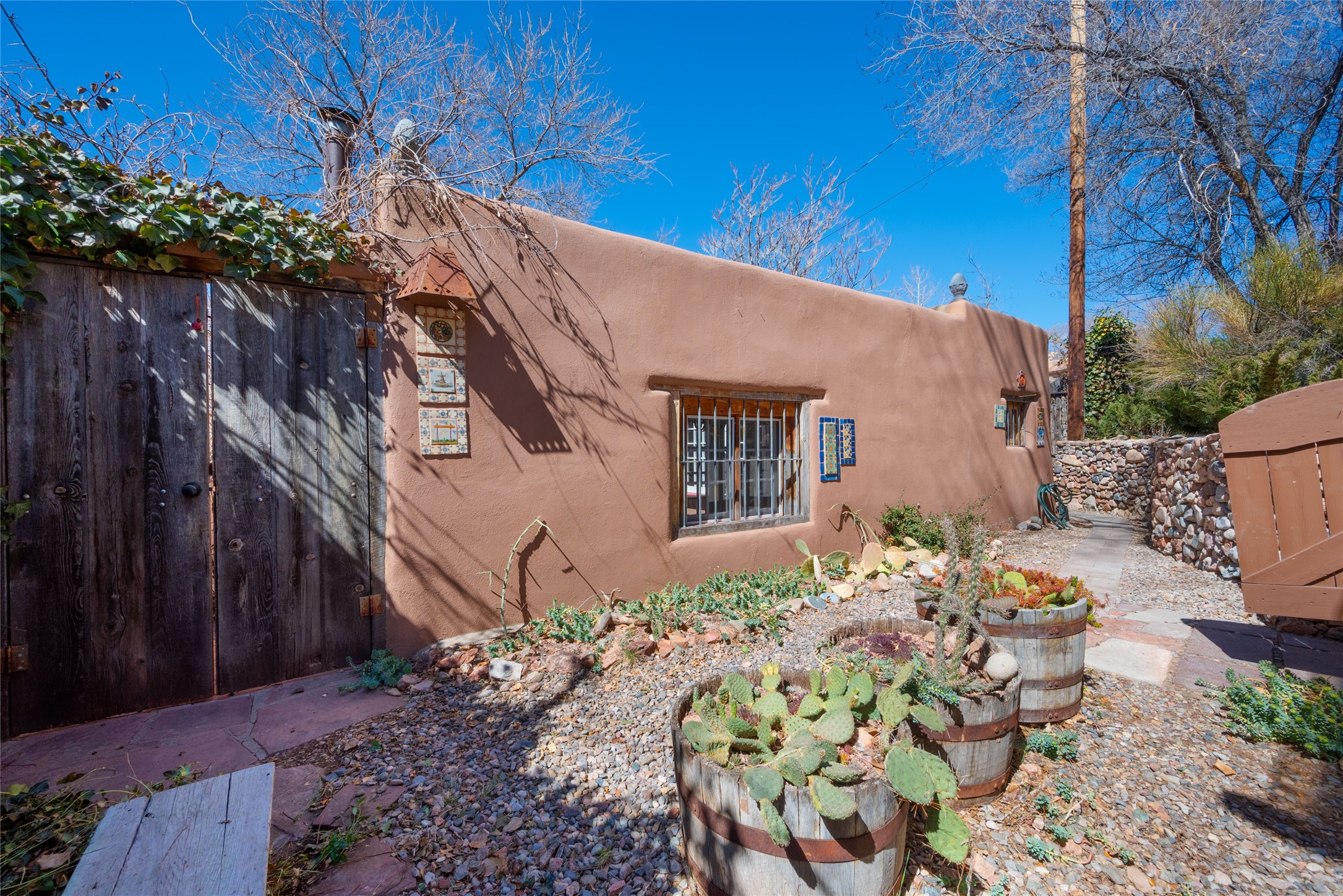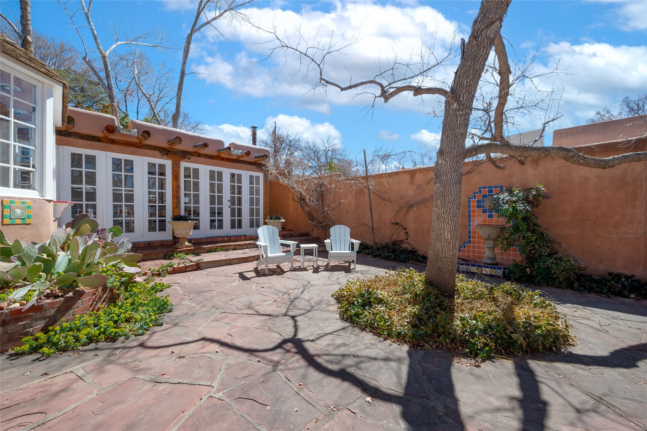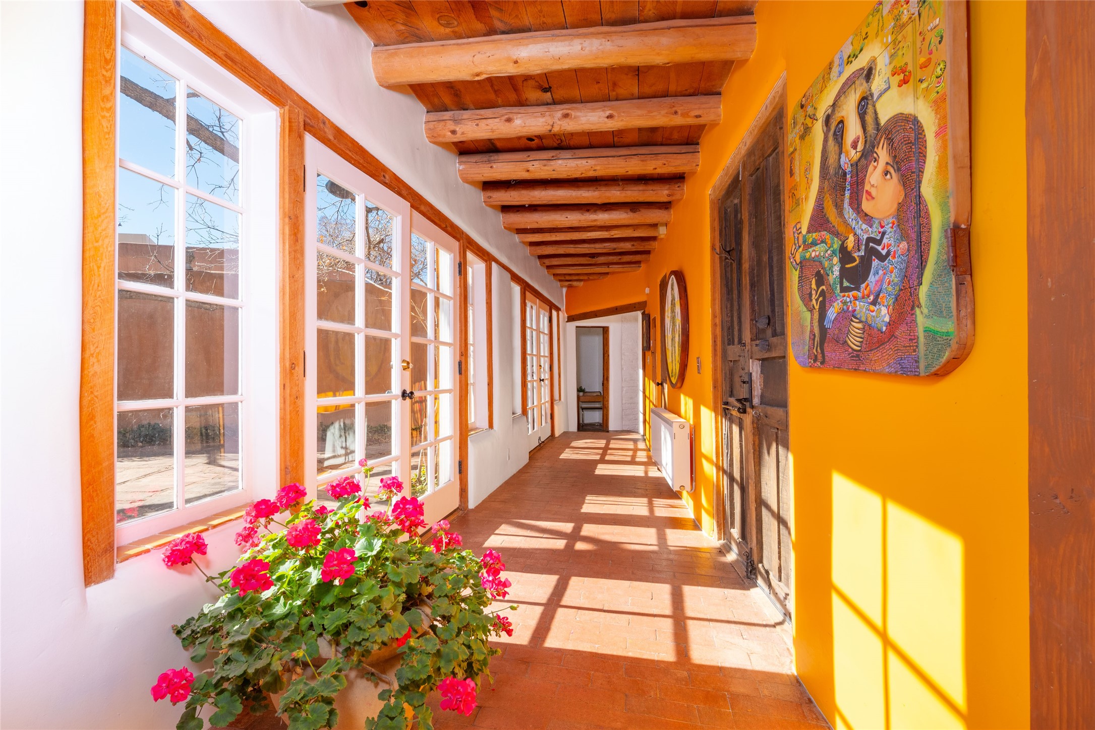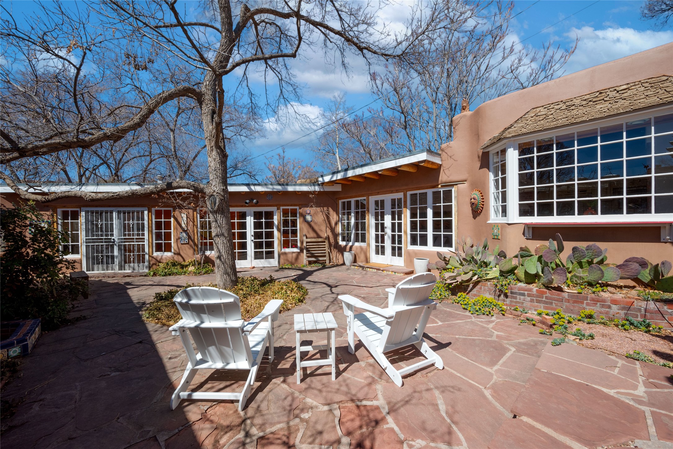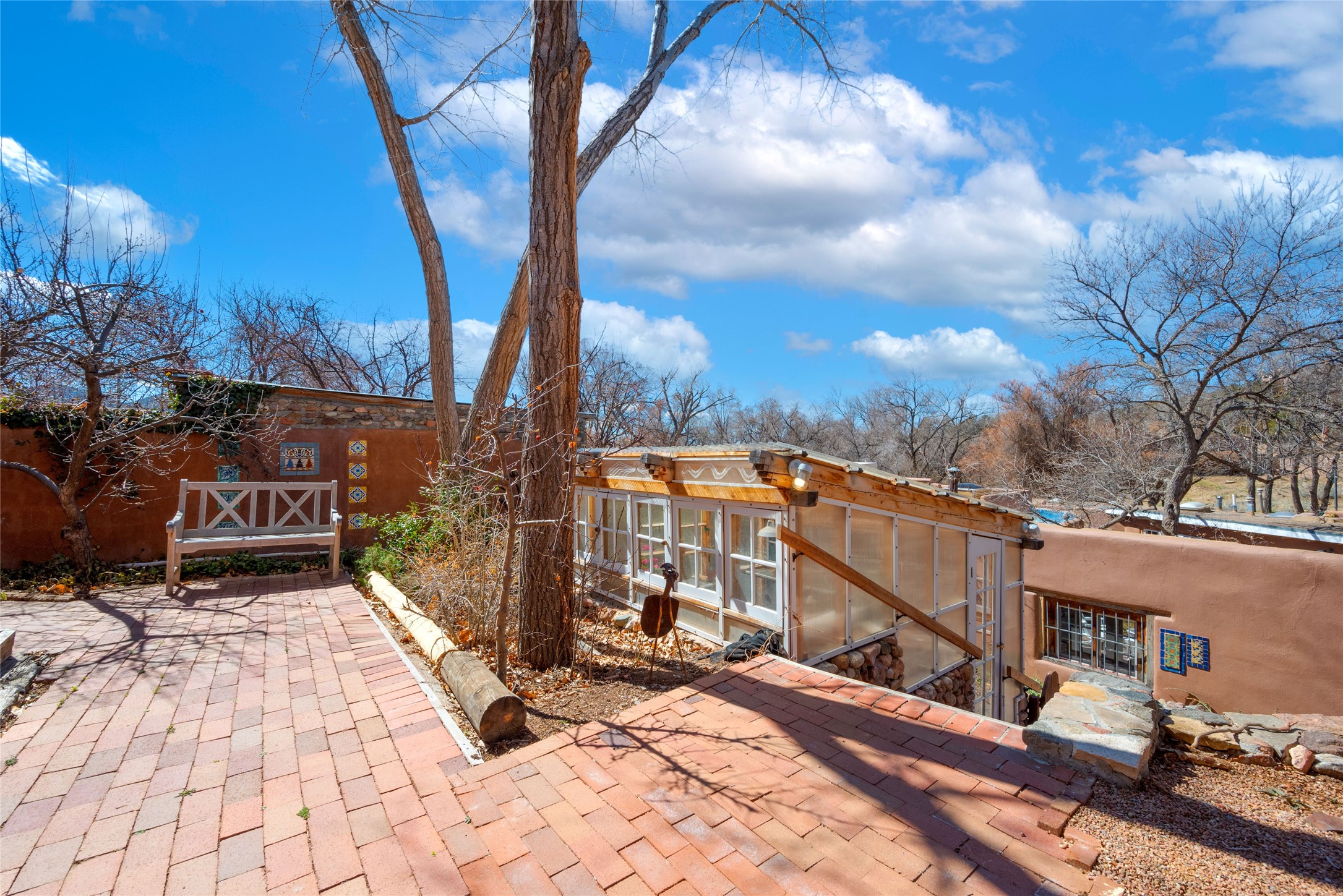 Upon entering the antique hand carved front doors, one is welcomed by a generous courtyard lined with multiple French doors filling the house with sunlight from morning to dusk. The beautiful bright hallway separates a private bedroom wing (2 bedrooms, 2 baths), laundry room, and office from the living room, breakfast nook and dining room area. The house has authentic New Mexican brick floors throughout and a traditional kiva fireplace surrounded by antique tiles. From the courtyard, an antique gate opens to hand-built stone walls, a year-round heated greenhouse, a terraced backyard filled with cactus and perennial gardens and apple trees. A tiled chapel sits high on the top of the property, offering views of the historic Lorenzo neighborhood. High above the house is the casita with 11 foot ceilings made of authentic split cedar latillas. There is a full kitchen, bath, bedroom and 2 kiva fireplaces. The living room and bedroom are accented by an expansive full length covered porch. The casita/guest house is surrounded by native New Mexican woodlands: pinon, juniper, cypress, chamisa, desert broom, purple aster and many other species, attracting birds and butterflies. The grounds are lined with brick walkways. The property is fully walled and fenced along the property lines, providing a private escape with plenty of room to explor and relax. The European style heaters were installed in 2025.