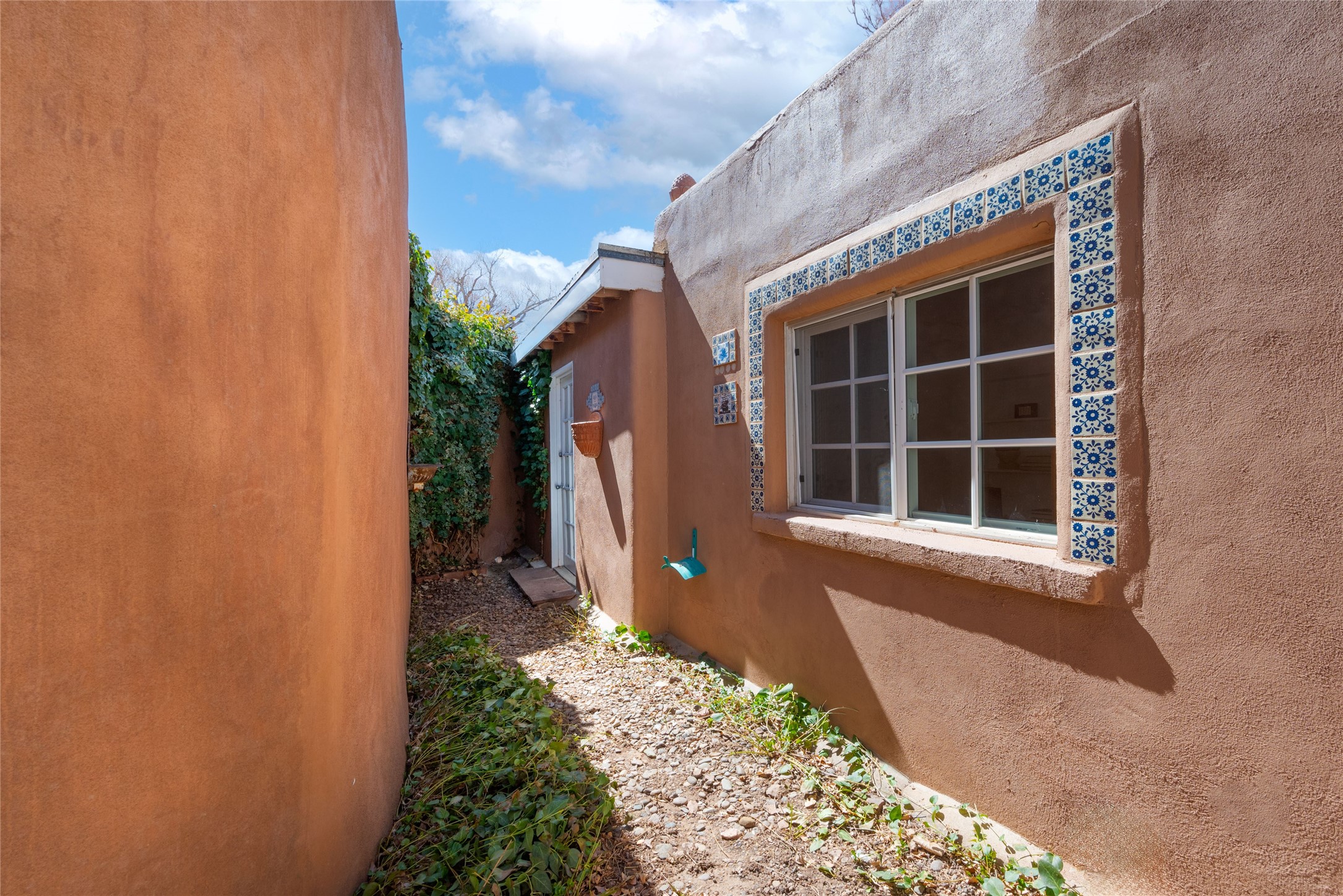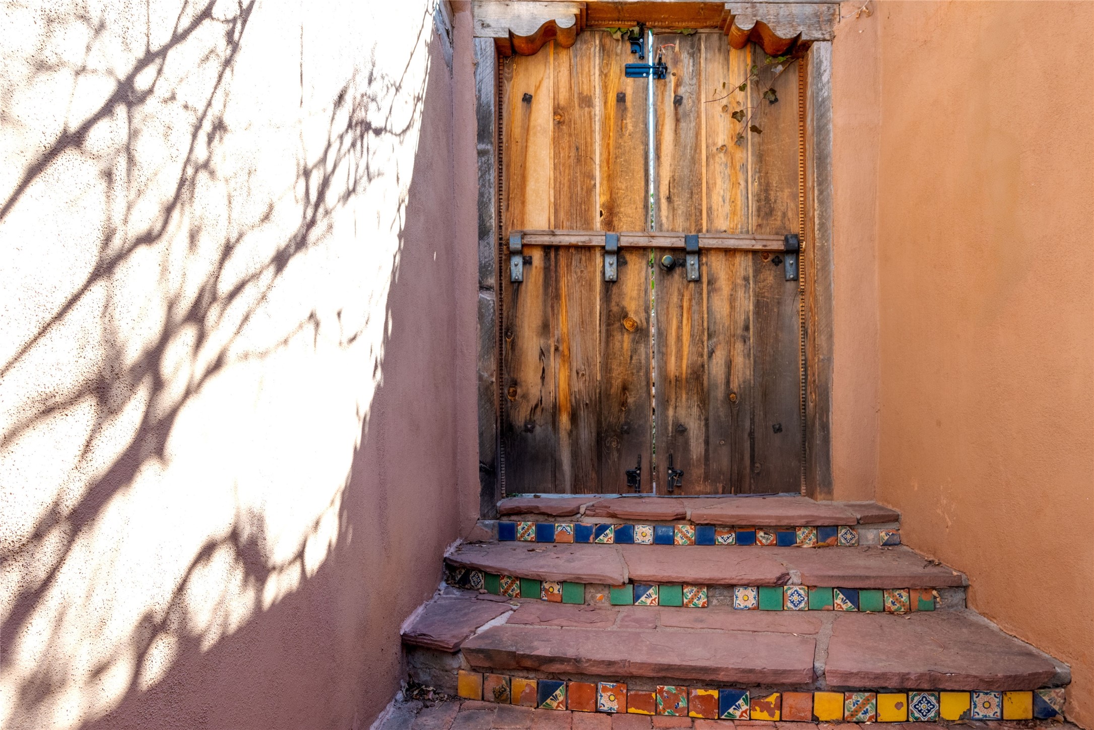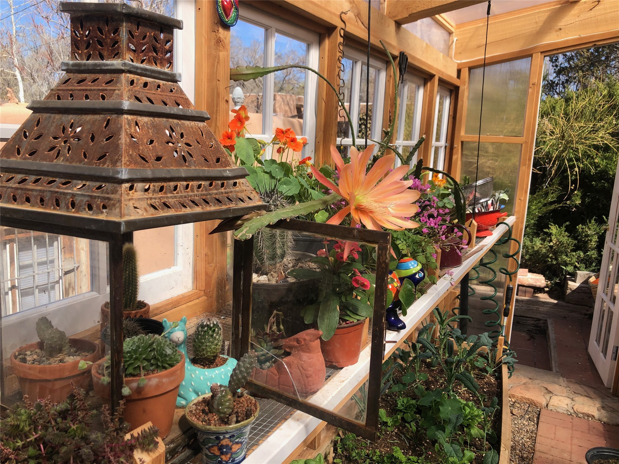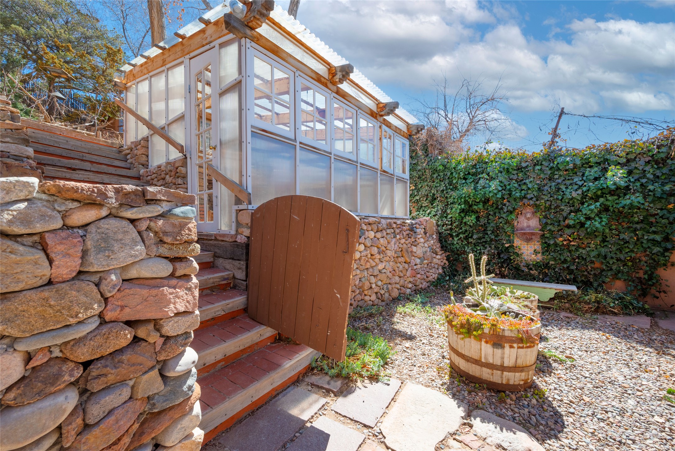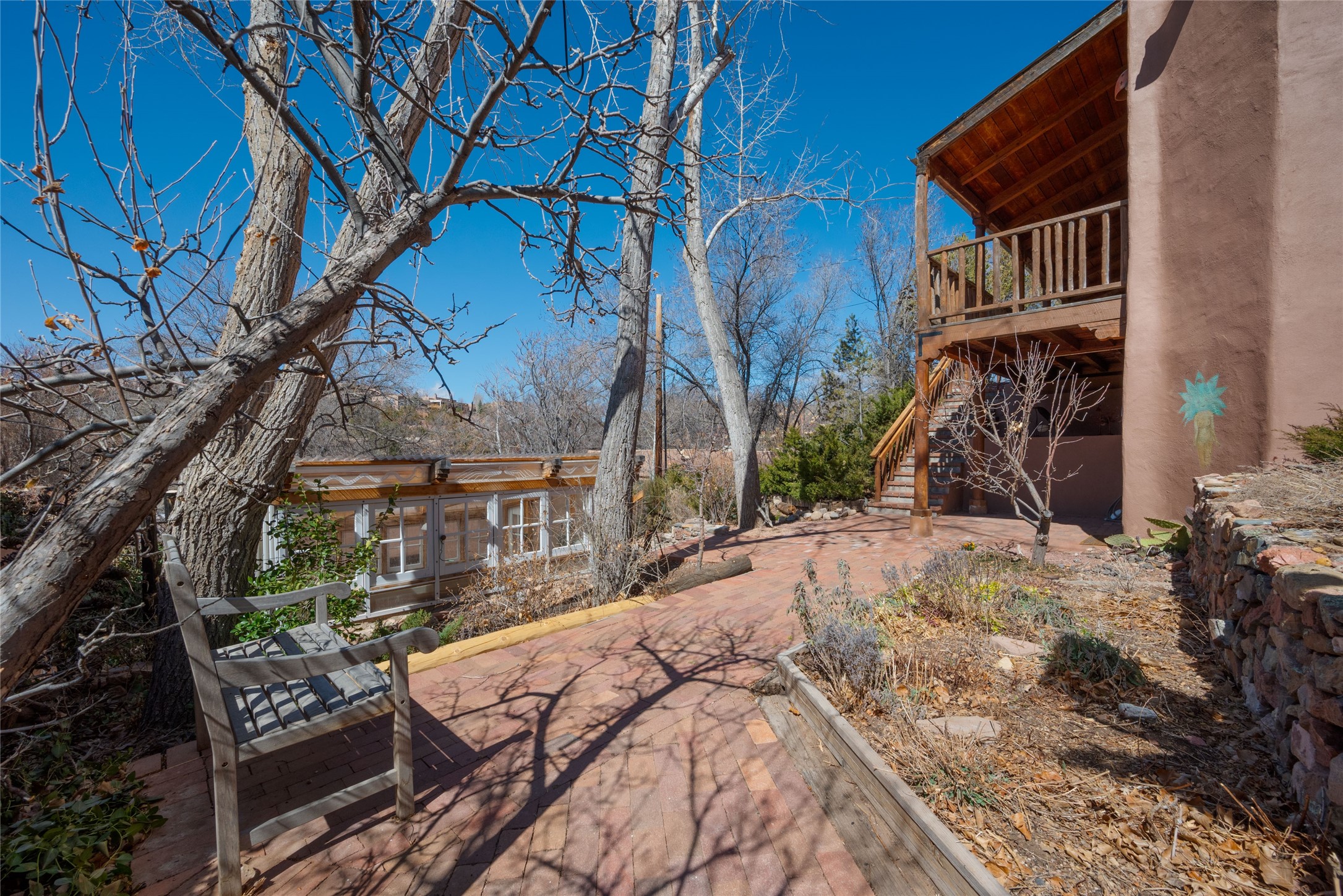 Upon entering the antique hand carved front doors, one is welcomed by a generous courtyard lined with multiple French doors filling the house with sunlight from morning to dusk. The beautiful bright hallway separates a private bedroom wing (2 bedrooms, 2 baths), laundry room, and office from the living room, breakfast nook and dining room area. The house has authentic New Mexican brick floors throughout and a traditional kiva fireplace surrounded by antique tiles. From the courtyard, an antique gate opens to hand-built stone walls, a year-round heated greenhouse, a terraced backyard filled with cactus and perennial gardens and apple trees. A tiled chapel sits high on the top of the property, offering views of the historic Lorenzo neighborhood. High above the house is the casita with 11 foot ceilings made of authentic split cedar latillas. There is a full kitchen, bath, bedroom and 2 kiva fireplaces. The living room and bedroom are accented by an expansive full length covered porch. The casita/guest house is surrounded by native New Mexican woodlands: pinon, juniper, cypress, chamisa, desert broom, purple aster and many other species, attracting birds and butterflies. The grounds are lined with brick walkways. The property is fully walled and fenced along the property lines, providing a private escape with plenty of room to explor and relax. The European style heaters were installed in 2025.