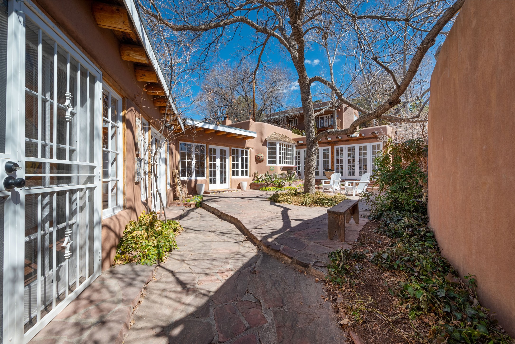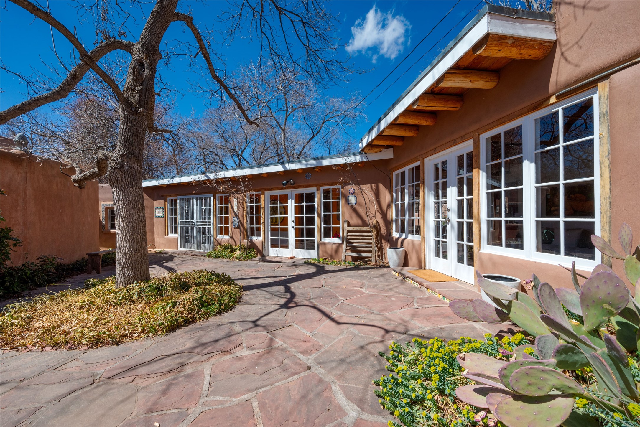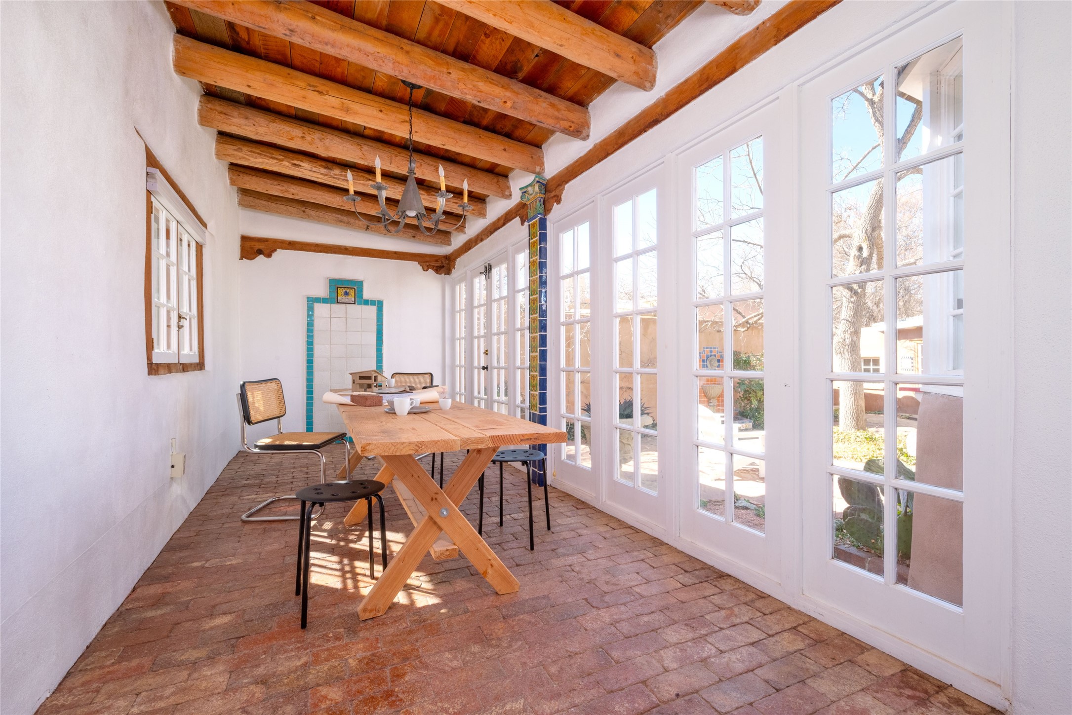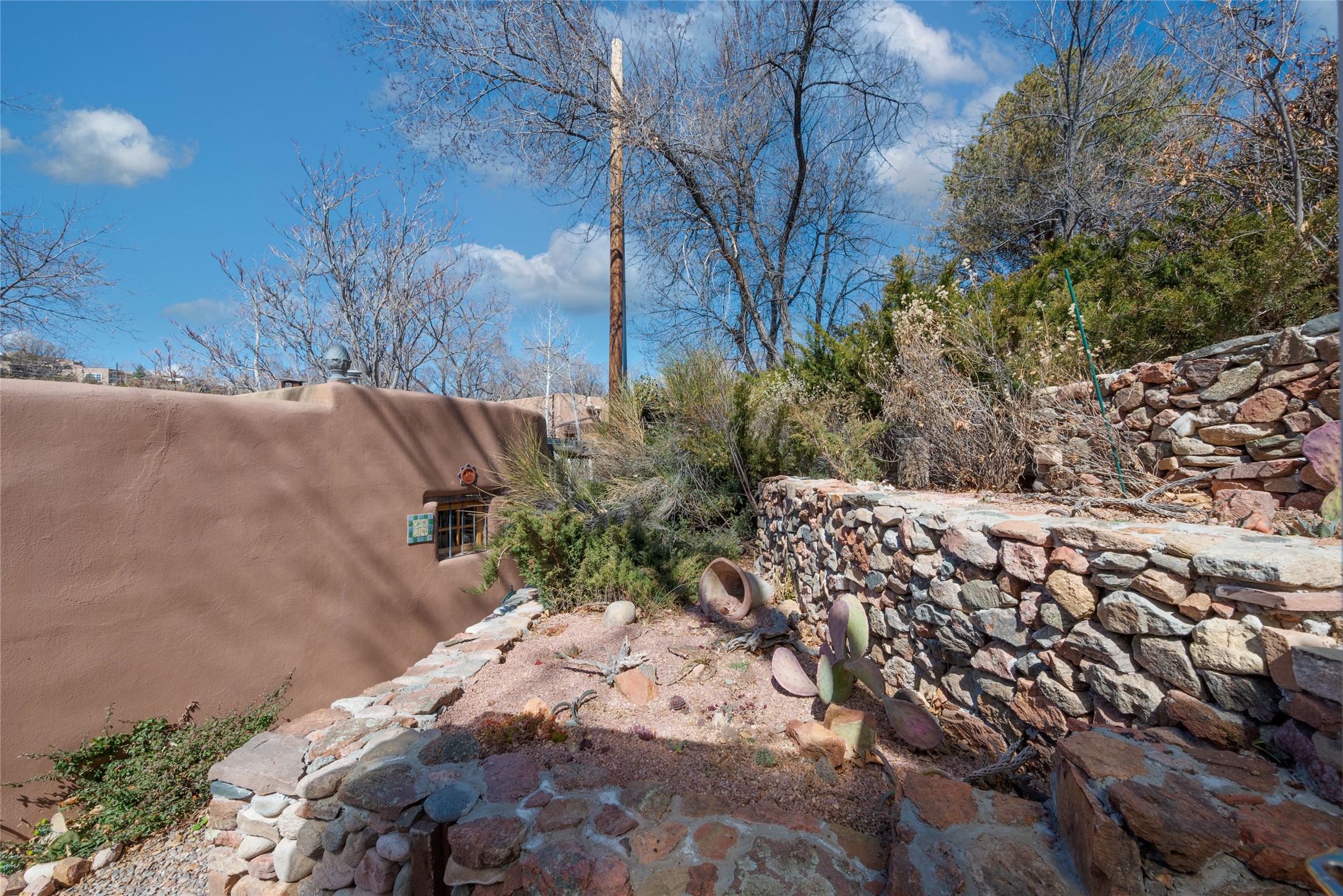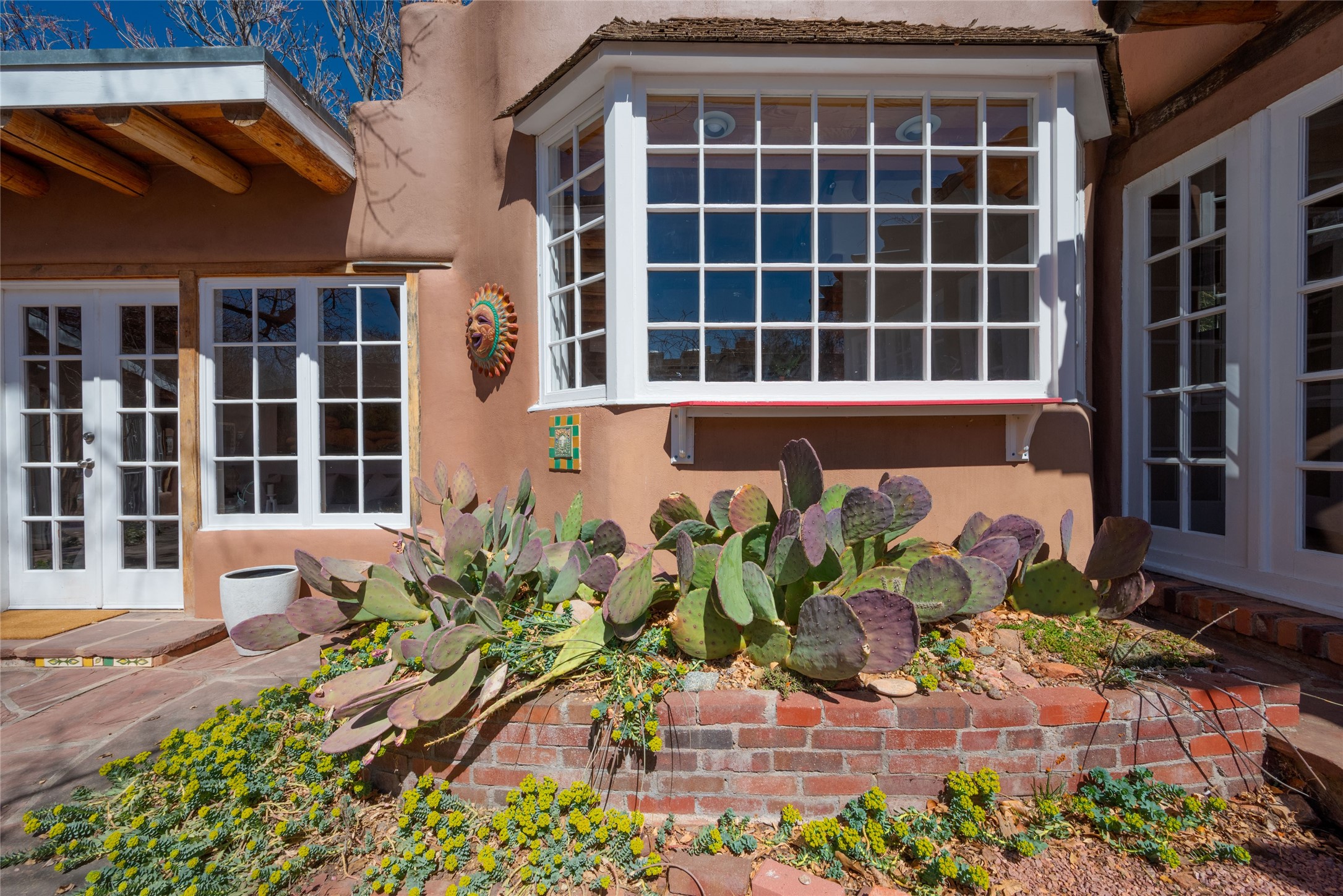 Upon entering the antique hand carved front doors, one is welcomed by a generous courtyard lined with multiple French doors filling the house with sunlight from morning to dusk. The beautiful bright hallway separates a private bedroom wing (2 bedrooms, 2 baths), laundry room, and office from the living room, breakfast nook and dining room area. The house has authentic New Mexican brick floors throughout and a traditional kiva fireplace surrounded by antique tiles. From the courtyard, an antique gate opens to hand-built stone walls, a year-round heated greenhouse, a terraced backyard filled with cactus and perennial gardens and apple trees. A tiled chapel sits high on the top of the property, offering views of the historic Lorenzo neighborhood. High above the house is the casita with 11 foot ceilings made of authentic split cedar latillas. There is a full kitchen, bath, bedroom and 2 kiva fireplaces. The living room and bedroom are accented by an expansive full length covered porch. The casita/guest house is surrounded by native New Mexican woodlands: pinon, juniper, cypress, chamisa, desert broom, purple aster and many other species, attracting birds and butterflies. The grounds are lined with brick walkways. The property is fully walled and fenced along the property lines, providing a private escape with plenty of room to explor and relax. The European style heaters were installed in 2025.