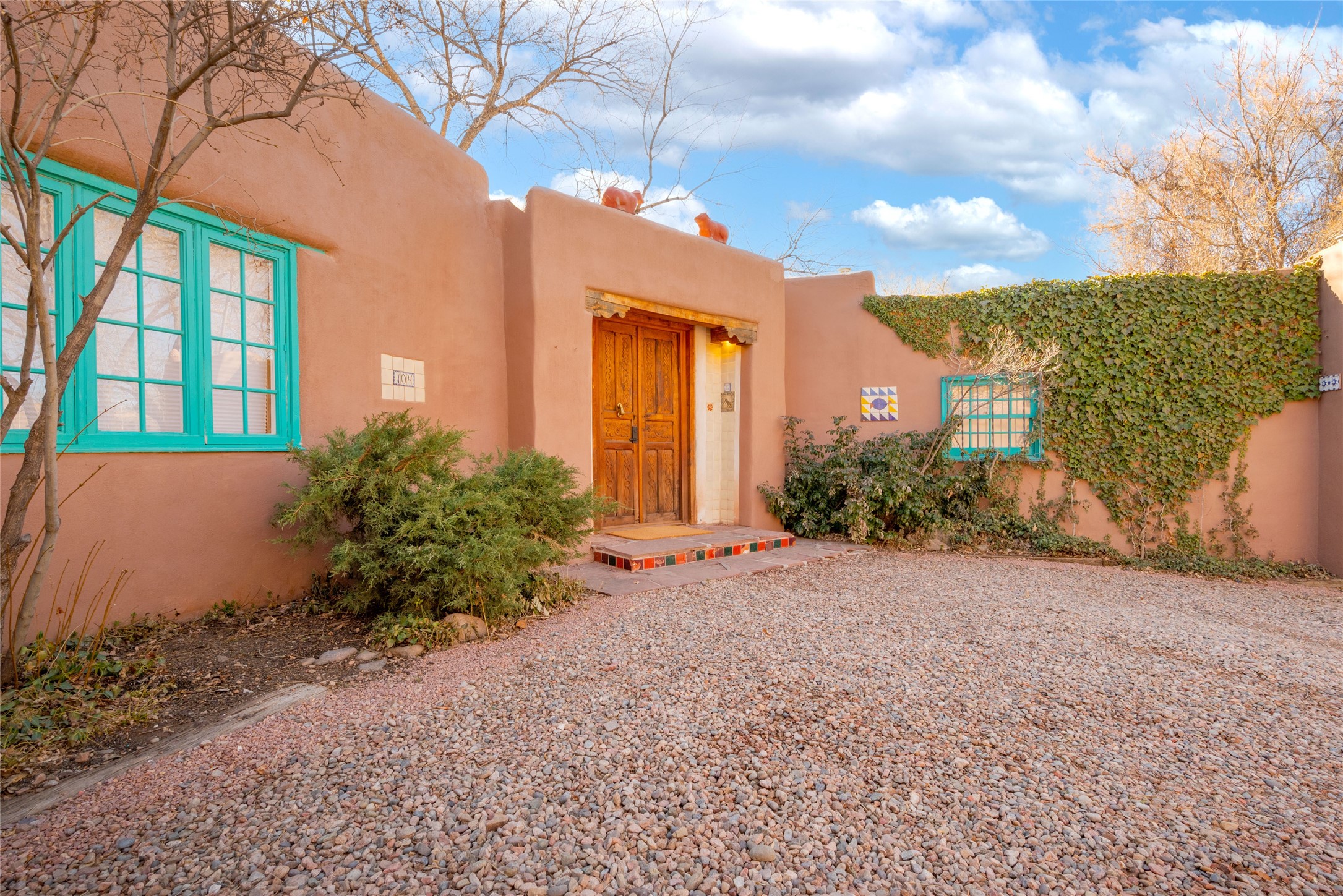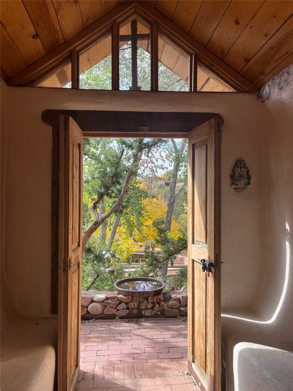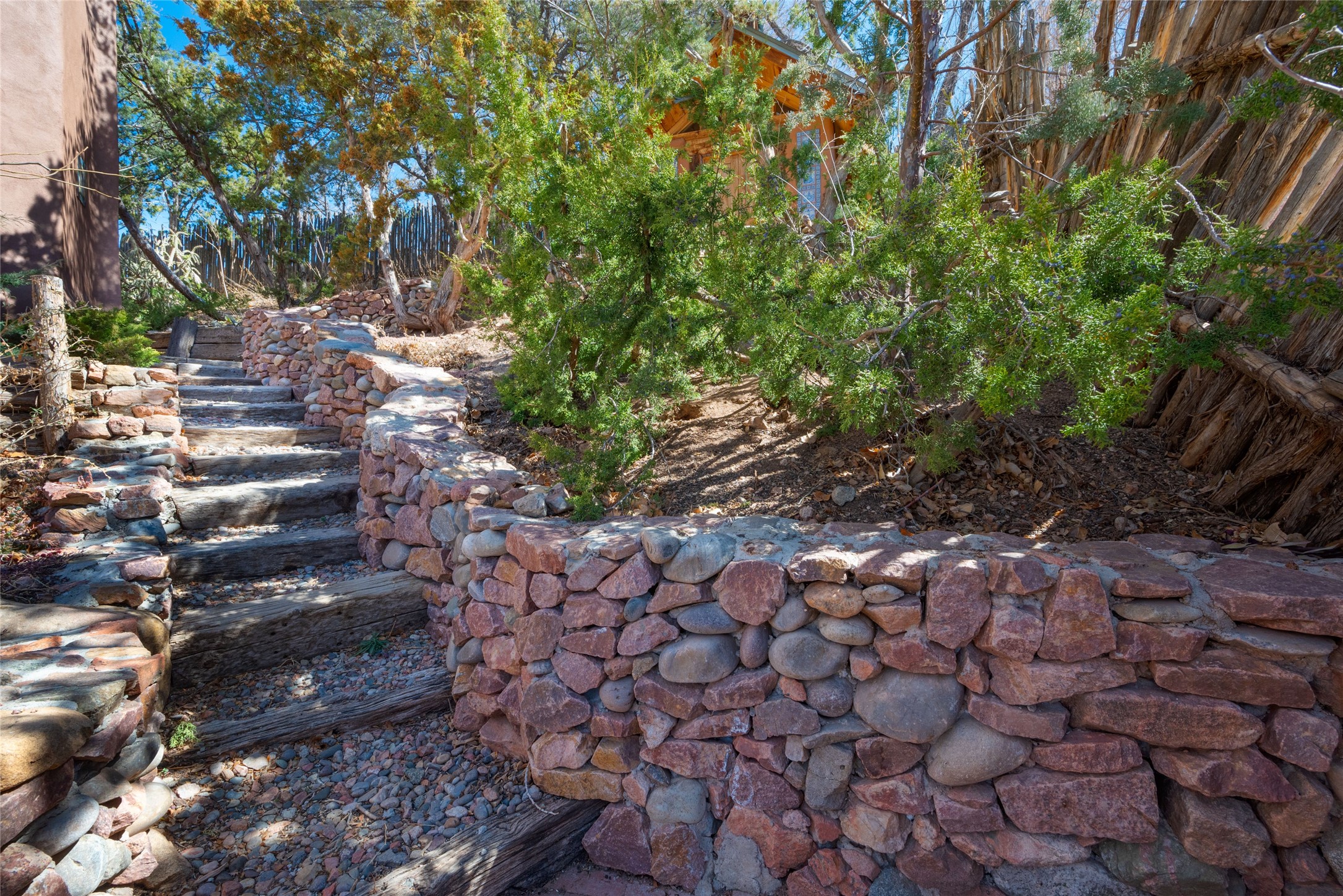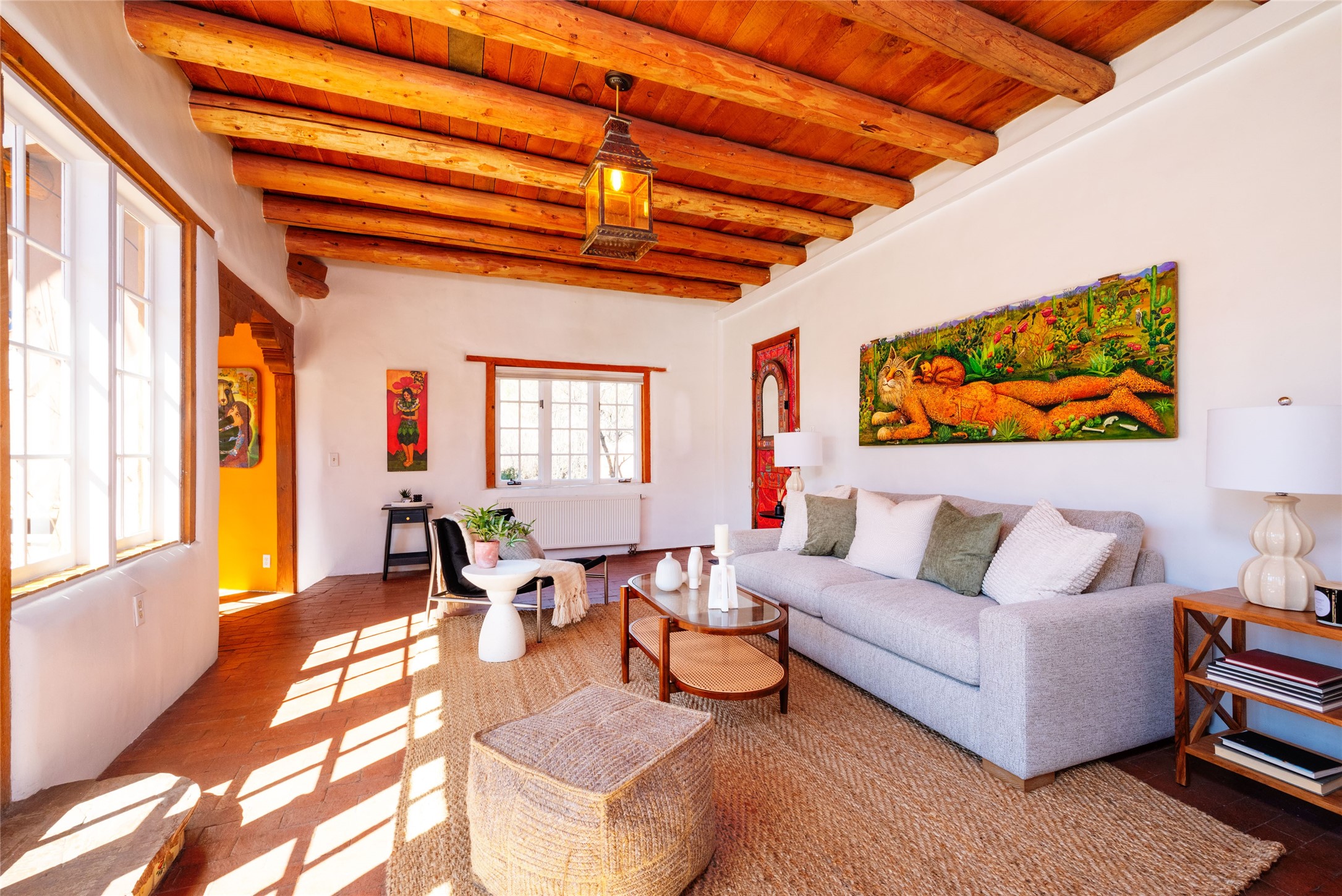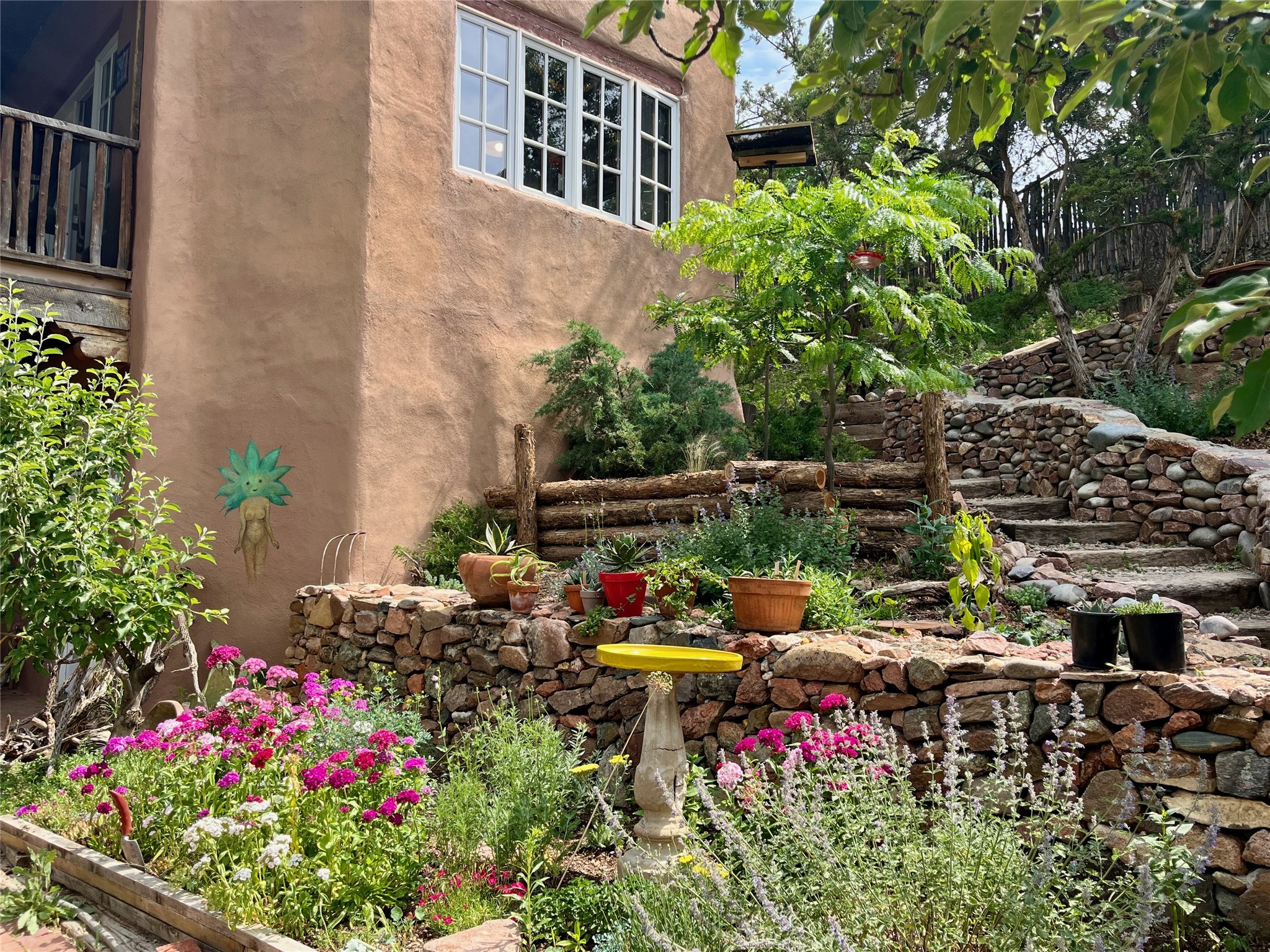 Upon entering the antique hand carved front doors, one is welcomed by a generous courtyard lined with multiple French doors filling the house with sunlight from morning to dusk. The beautiful bright hallway separates a private bedroom wing (2 bedrooms, 2 baths), laundry room, and office from the living room, breakfast nook and dining room area. The house has authentic New Mexican brick floors throughout and a traditional kiva fireplace surrounded by antique tiles. From the courtyard, an antique gate opens to hand-built stone walls, a year-round heated greenhouse, a terraced backyard filled with cactus and perennial gardens and apple trees. A tiled chapel sits high on the top of the property, offering views of the historic Lorenzo neighborhood. High above the house is the casita with 11 foot ceilings made of authentic split cedar latillas. There is a full kitchen, bath, bedroom and 2 kiva fireplaces. The living room and bedroom are accented by an expansive full length covered porch. The casita/guest house is surrounded by native New Mexican woodlands: pinon, juniper, cypress, chamisa, desert broom, purple aster and many other species, attracting birds and butterflies. The grounds are lined with brick walkways. The property is fully walled and fenced along the property lines, providing a private escape with plenty of room to explor and relax. The European style heaters were installed in 2025.