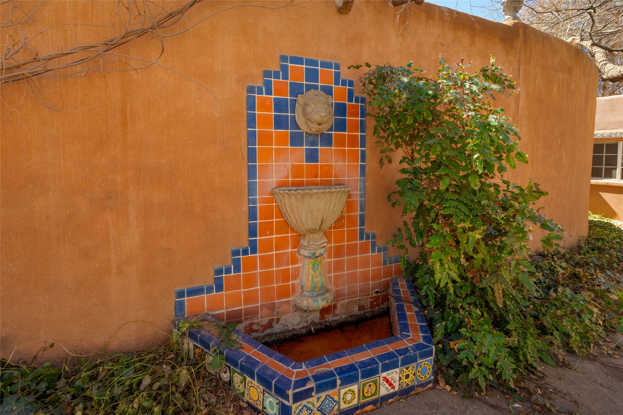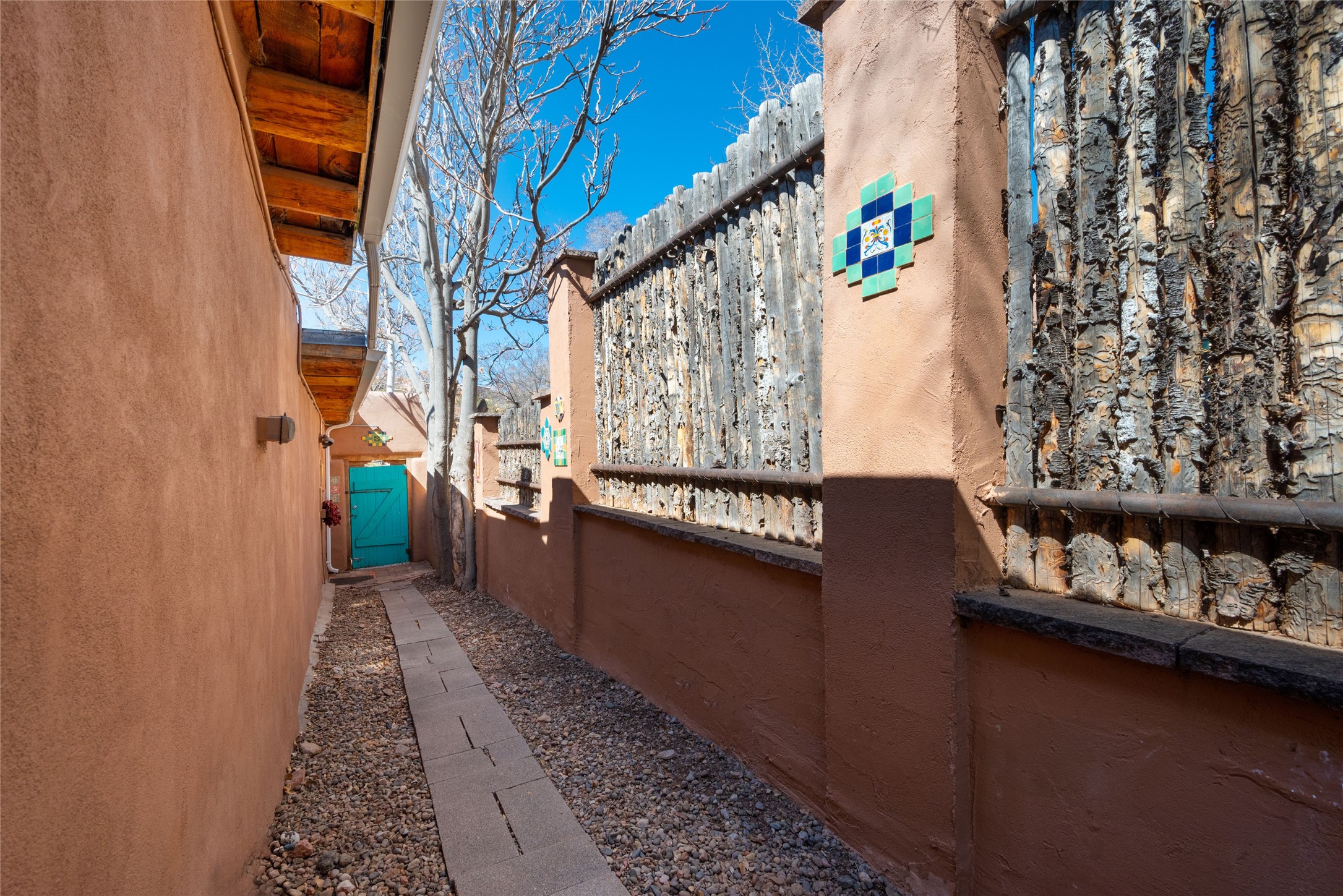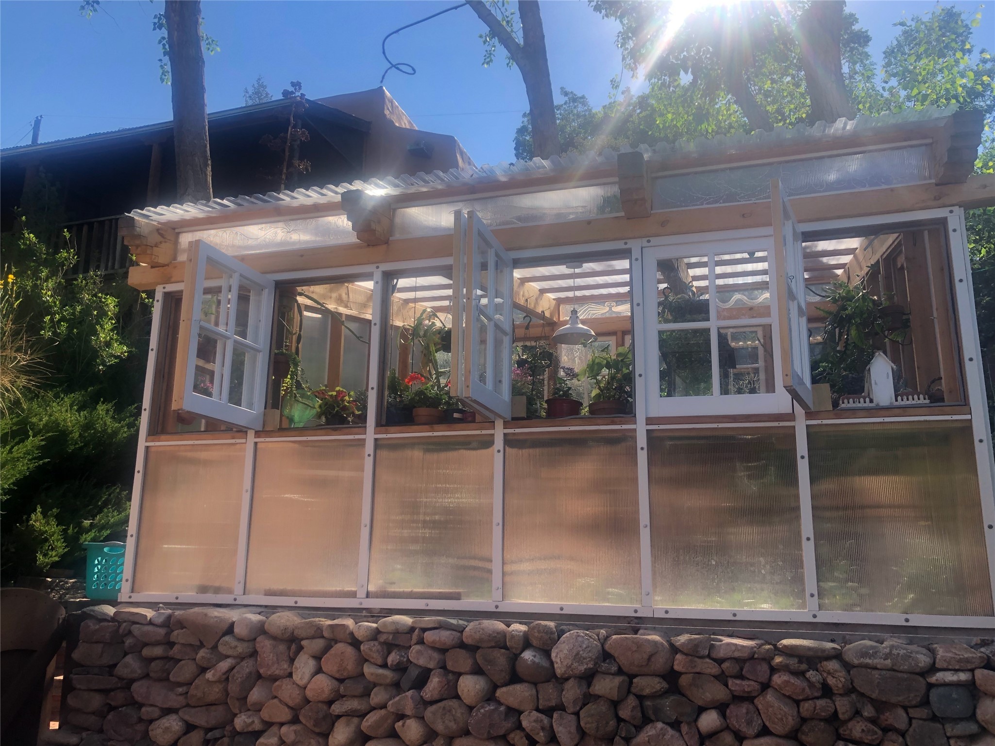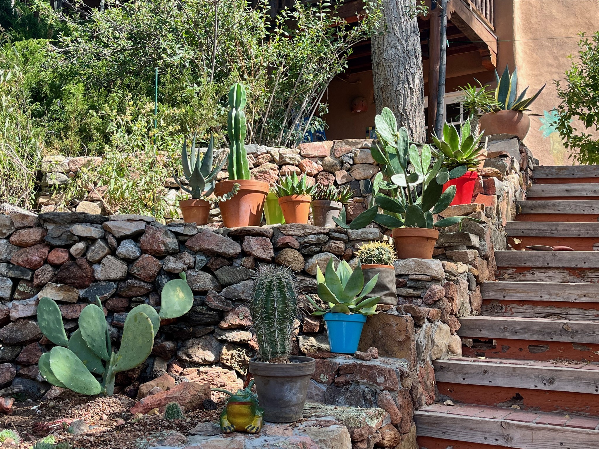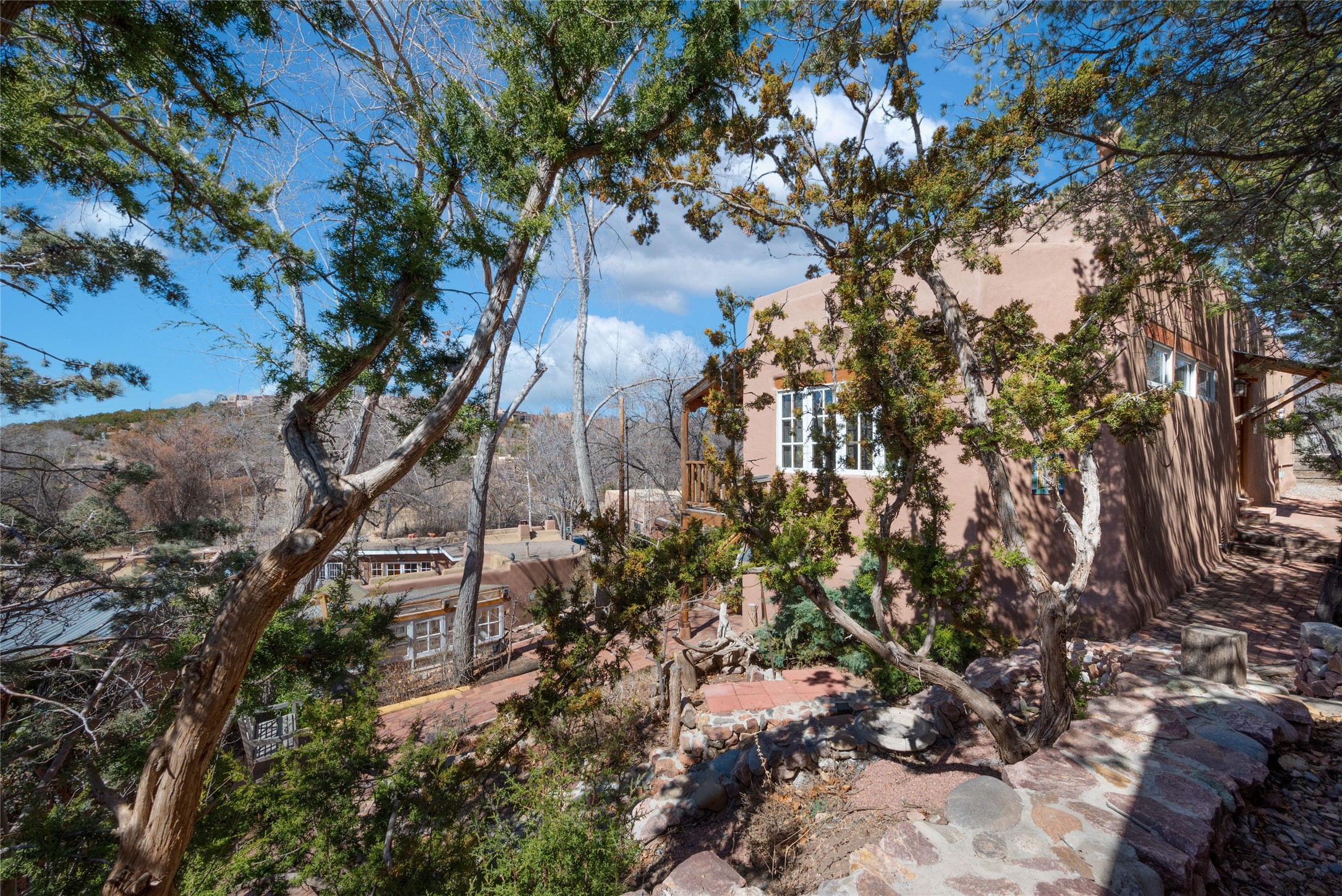 Upon entering the antique hand carved front doors, one is welcomed by a generous courtyard lined with multiple French doors filling the house with sunlight from morning to dusk. The beautiful bright hallway separates a private bedroom wing (2 bedrooms, 2 baths), laundry room, and office from the living room, breakfast nook and dining room area. The house has authentic New Mexican brick floors throughout and a traditional kiva fireplace surrounded by antique tiles. From the courtyard, an antique gate opens to hand-built stone walls, a year-round heated greenhouse, a terraced backyard filled with cactus and perennial gardens and apple trees. A tiled chapel sits high on the top of the property, offering views of the historic Lorenzo neighborhood. High above the house is the casita with 11 foot ceilings made of authentic split cedar latillas. There is a full kitchen, bath, bedroom and 2 kiva fireplaces. The living room and bedroom are accented by an expansive full length covered porch. The casita/guest house is surrounded by native New Mexican woodlands: pinon, juniper, cypress, chamisa, desert broom, purple aster and many other species, attracting birds and butterflies. The grounds are lined with brick walkways. The property is fully walled and fenced along the property lines, providing a private escape with plenty of room to explor and relax. The European style heaters were installed in 2025.