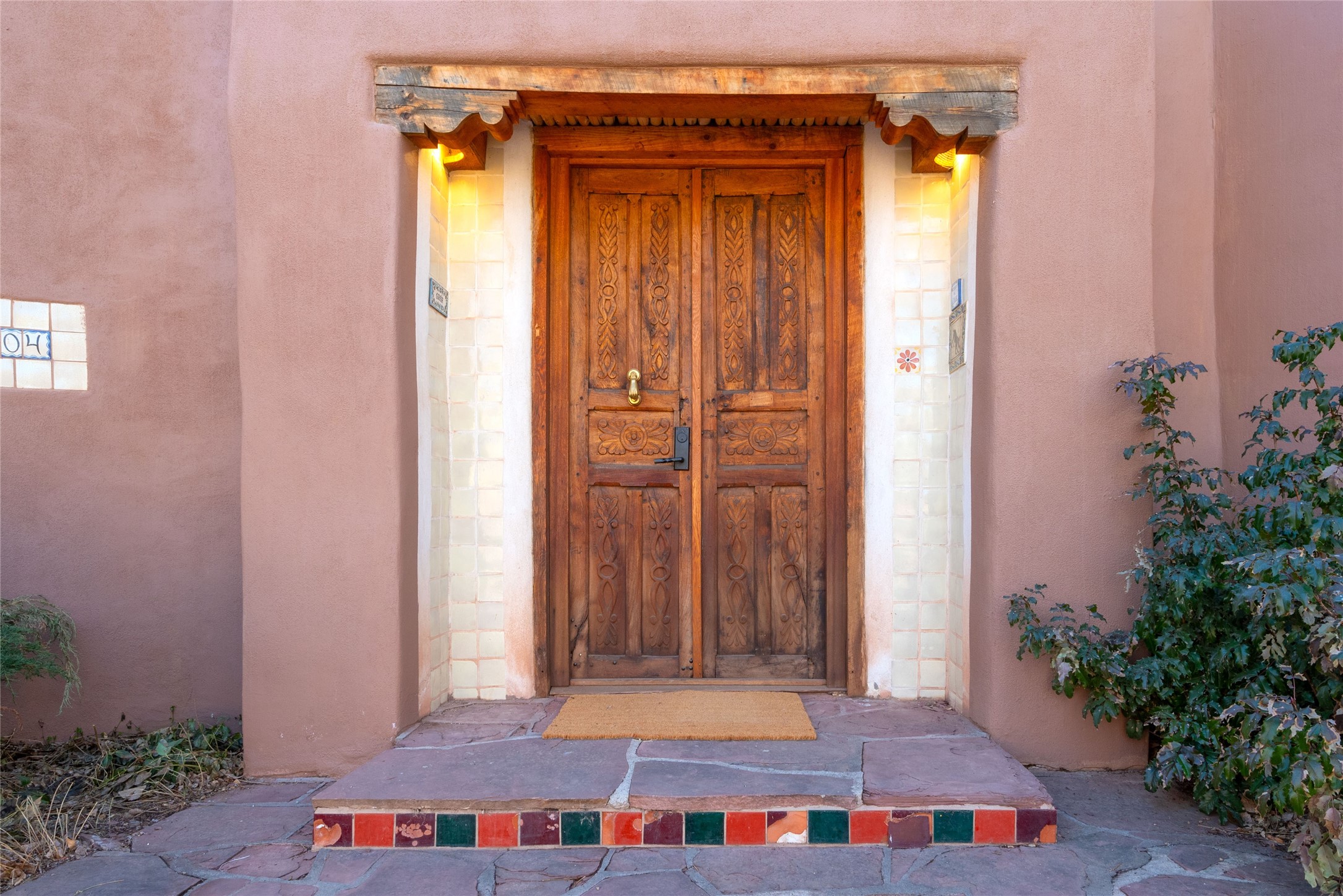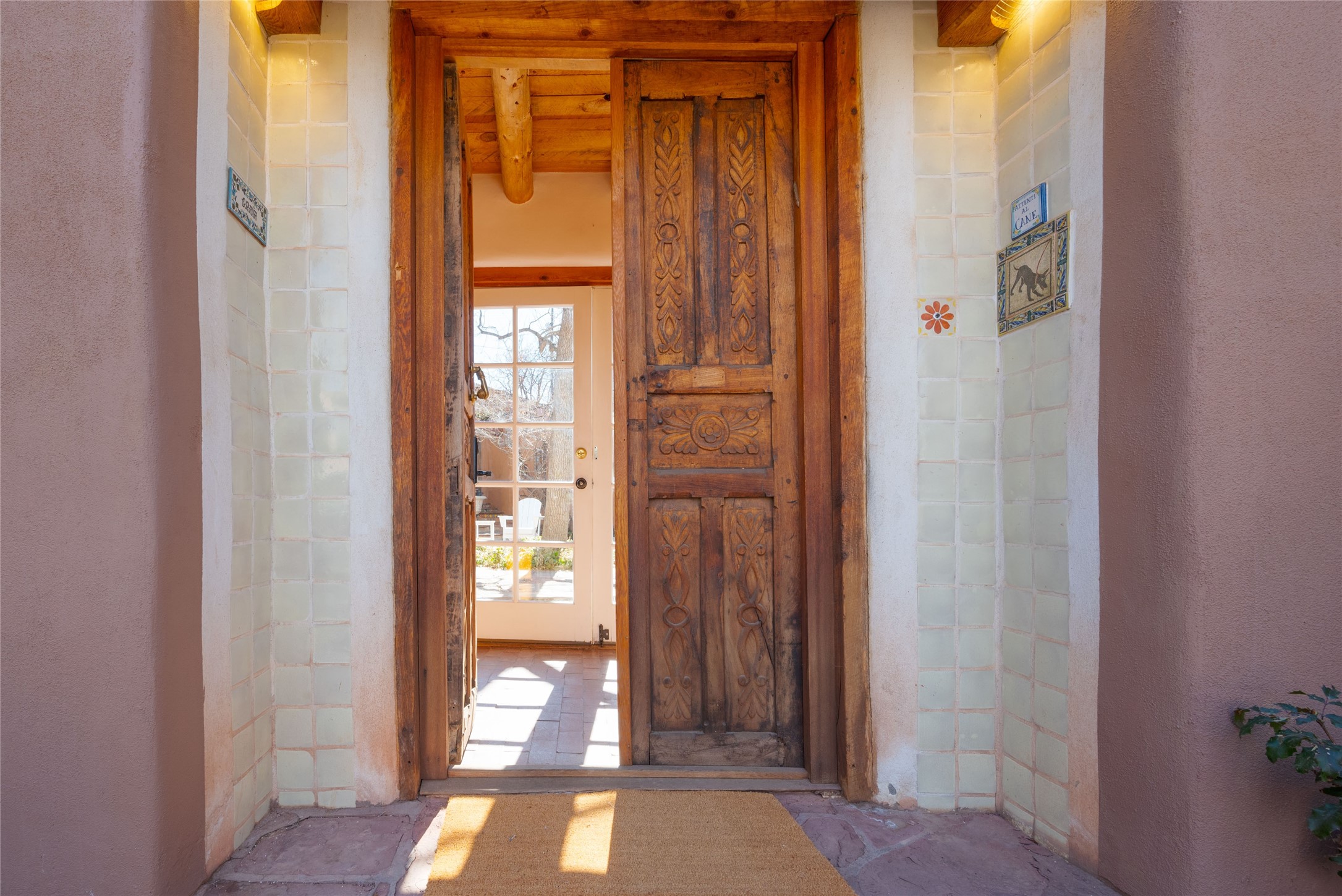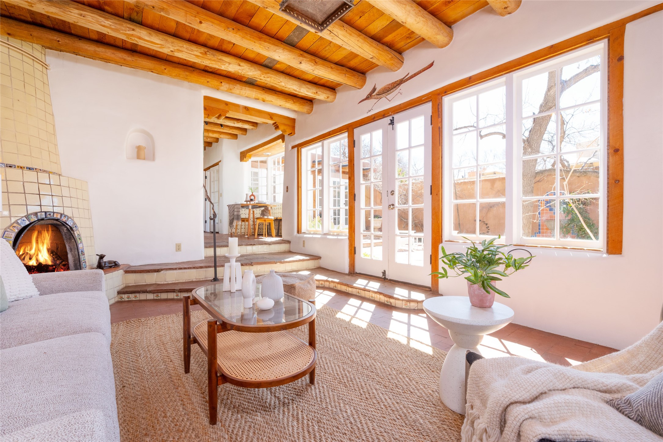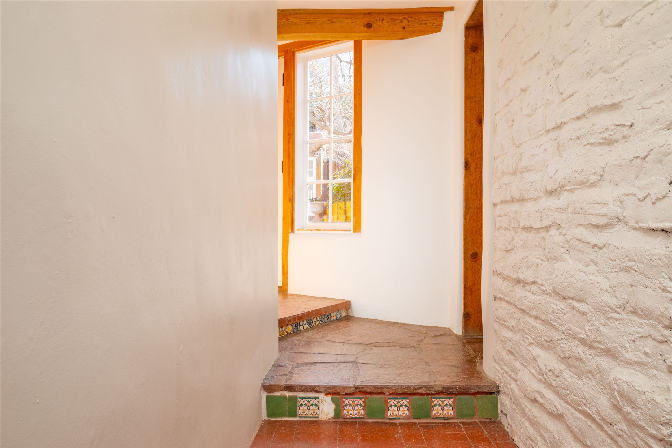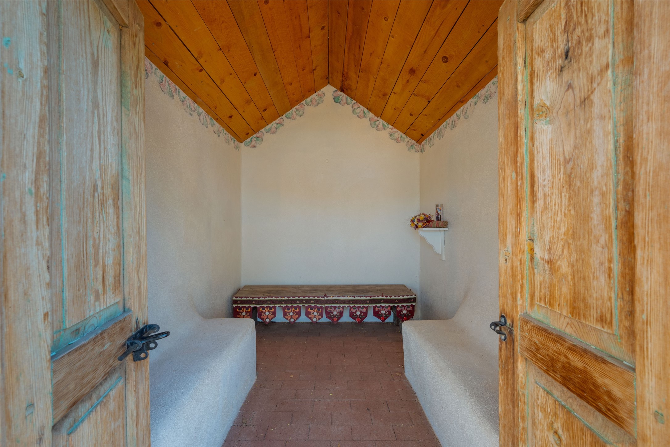 Upon entering the antique hand carved front doors, one is welcomed by a generous courtyard lined with multiple French doors filling the house with sunlight from morning to dusk. The beautiful bright hallway separates a private bedroom wing (2 bedrooms, 2 baths), laundry room, and office from the living room, breakfast nook and dining room area. The house has authentic New Mexican brick floors throughout and a traditional kiva fireplace surrounded by antique tiles. From the courtyard, an antique gate opens to hand-built stone walls, a year-round heated greenhouse, a terraced backyard filled with cactus and perennial gardens and apple trees. A tiled chapel sits high on the top of the property, offering views of the historic Lorenzo neighborhood. High above the house is the casita with 11 foot ceilings made of authentic split cedar latillas. There is a full kitchen, bath, bedroom and 2 kiva fireplaces. The living room and bedroom are accented by an expansive full length covered porch. The casita/guest house is surrounded by native New Mexican woodlands: pinon, juniper, cypress, chamisa, desert broom, purple aster and many other species, attracting birds and butterflies. The grounds are lined with brick walkways. The property is fully walled and fenced along the property lines, providing a private escape with plenty of room to explor and relax. The European style heaters were installed in 2025.