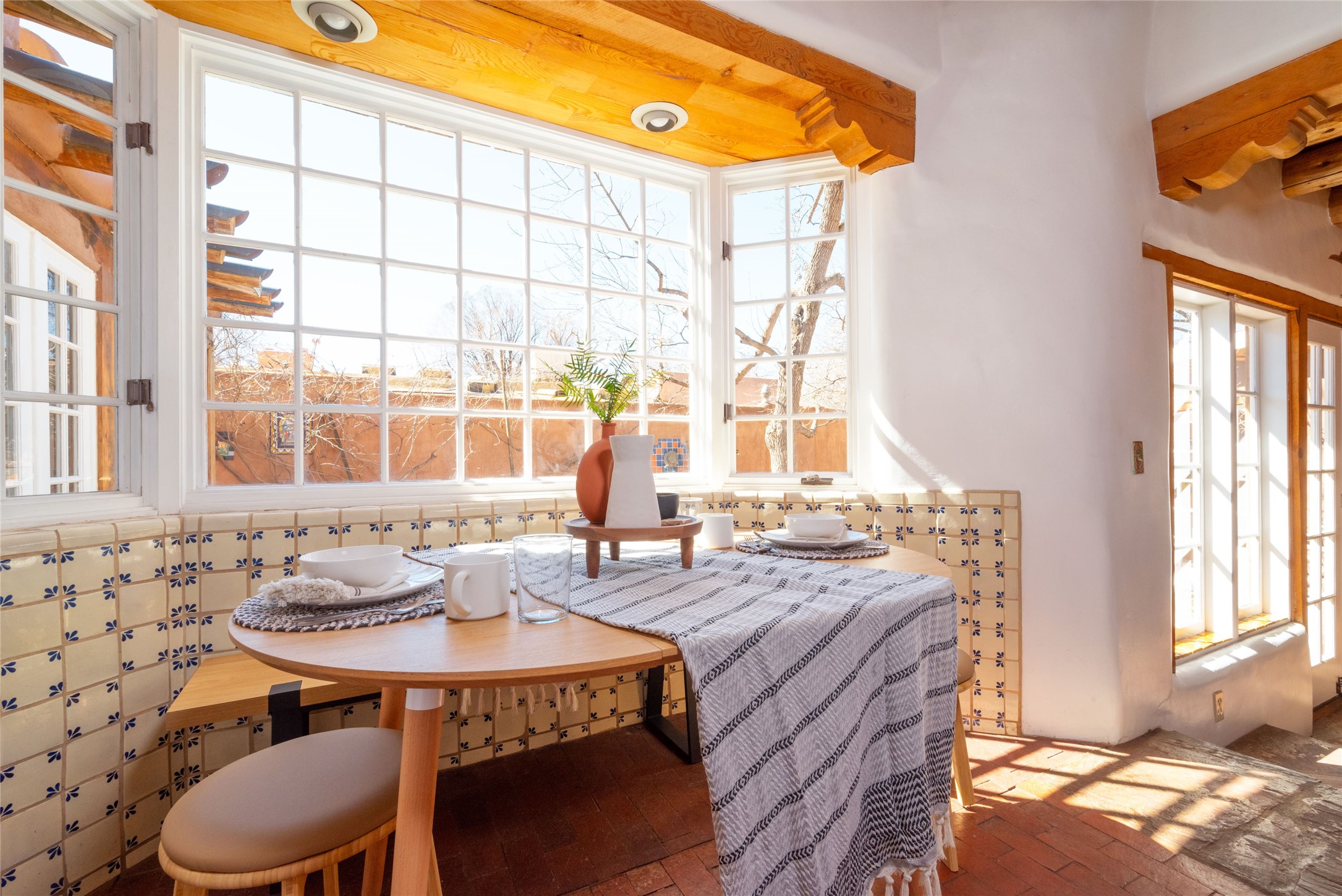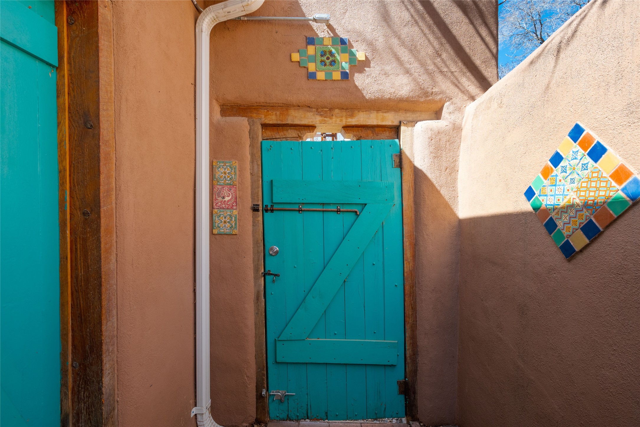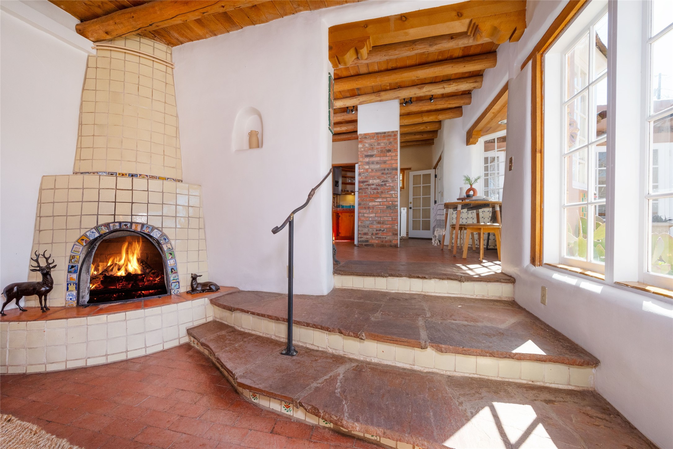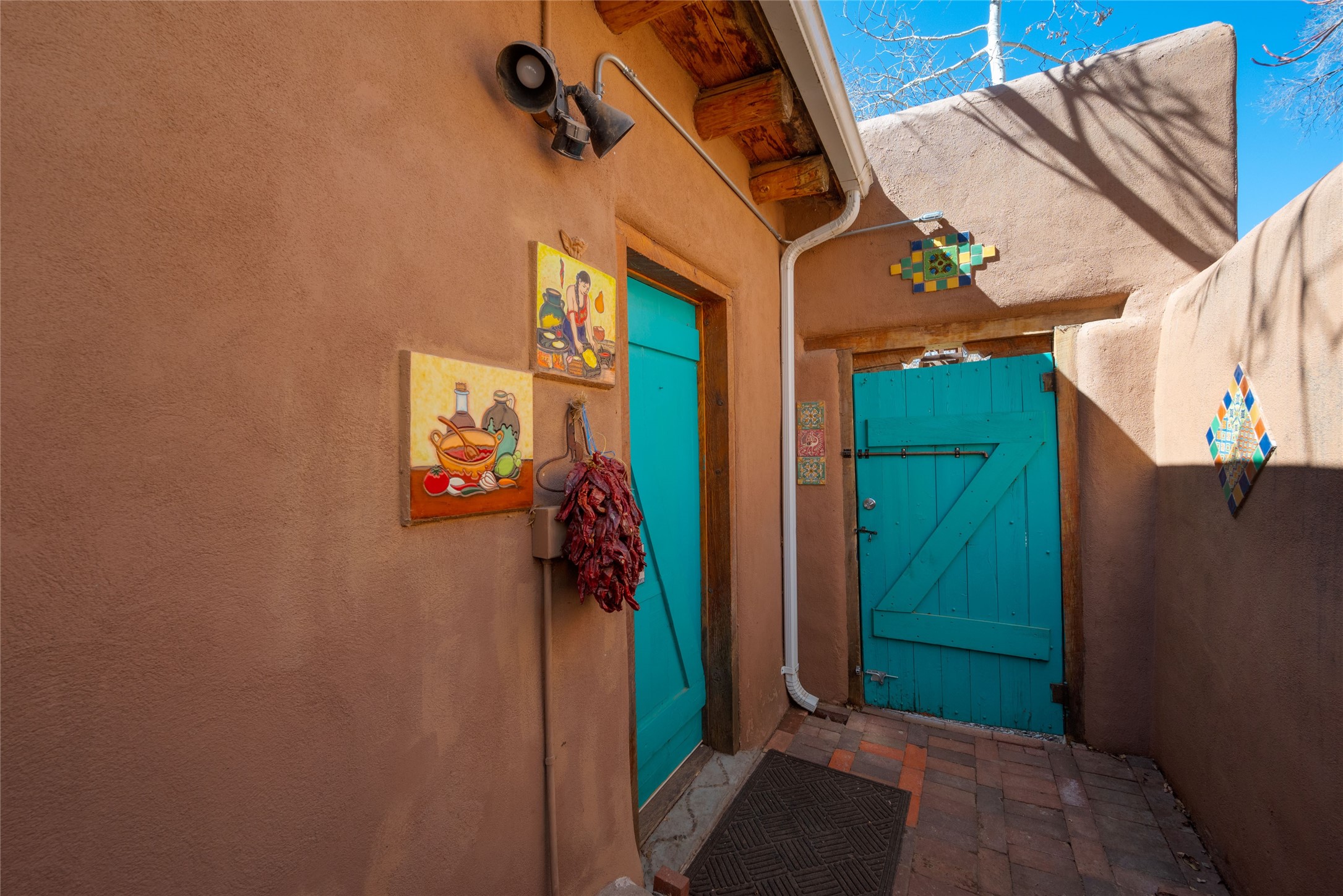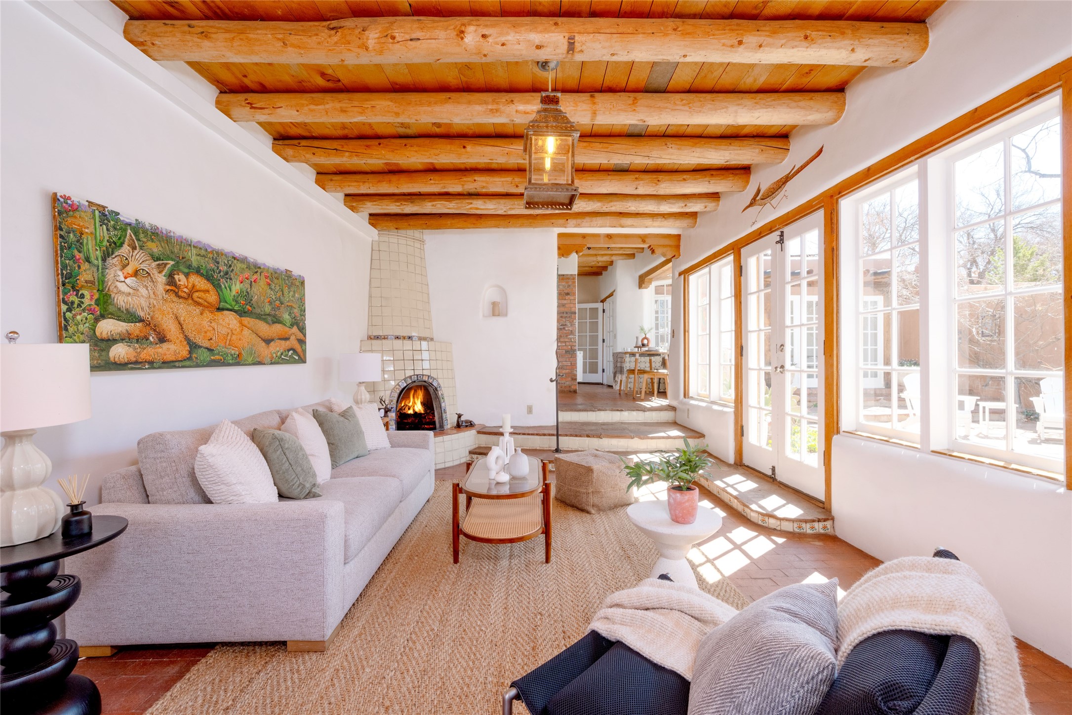 Upon entering the antique hand carved front doors, one is welcomed by a generous courtyard lined with multiple French doors filling the house with sunlight from morning to dusk. The beautiful bright hallway separates a private bedroom wing (2 bedrooms, 2 baths), laundry room, and office from the living room, breakfast nook and dining room area. The house has authentic New Mexican brick floors throughout and a traditional kiva fireplace surrounded by antique tiles. From the courtyard, an antique gate opens to hand-built stone walls, a year-round heated greenhouse, a terraced backyard filled with cactus and perennial gardens and apple trees. A tiled chapel sits high on the top of the property, offering views of the historic Lorenzo neighborhood. High above the house is the casita with 11 foot ceilings made of authentic split cedar latillas. There is a full kitchen, bath, bedroom and 2 kiva fireplaces. The living room and bedroom are accented by an expansive full length covered porch. The casita/guest house is surrounded by native New Mexican woodlands: pinon, juniper, cypress, chamisa, desert broom, purple aster and many other species, attracting birds and butterflies. The grounds are lined with brick walkways. The property is fully walled and fenced along the property lines, providing a private escape with plenty of room to explor and relax. The European style heaters were installed in 2025.