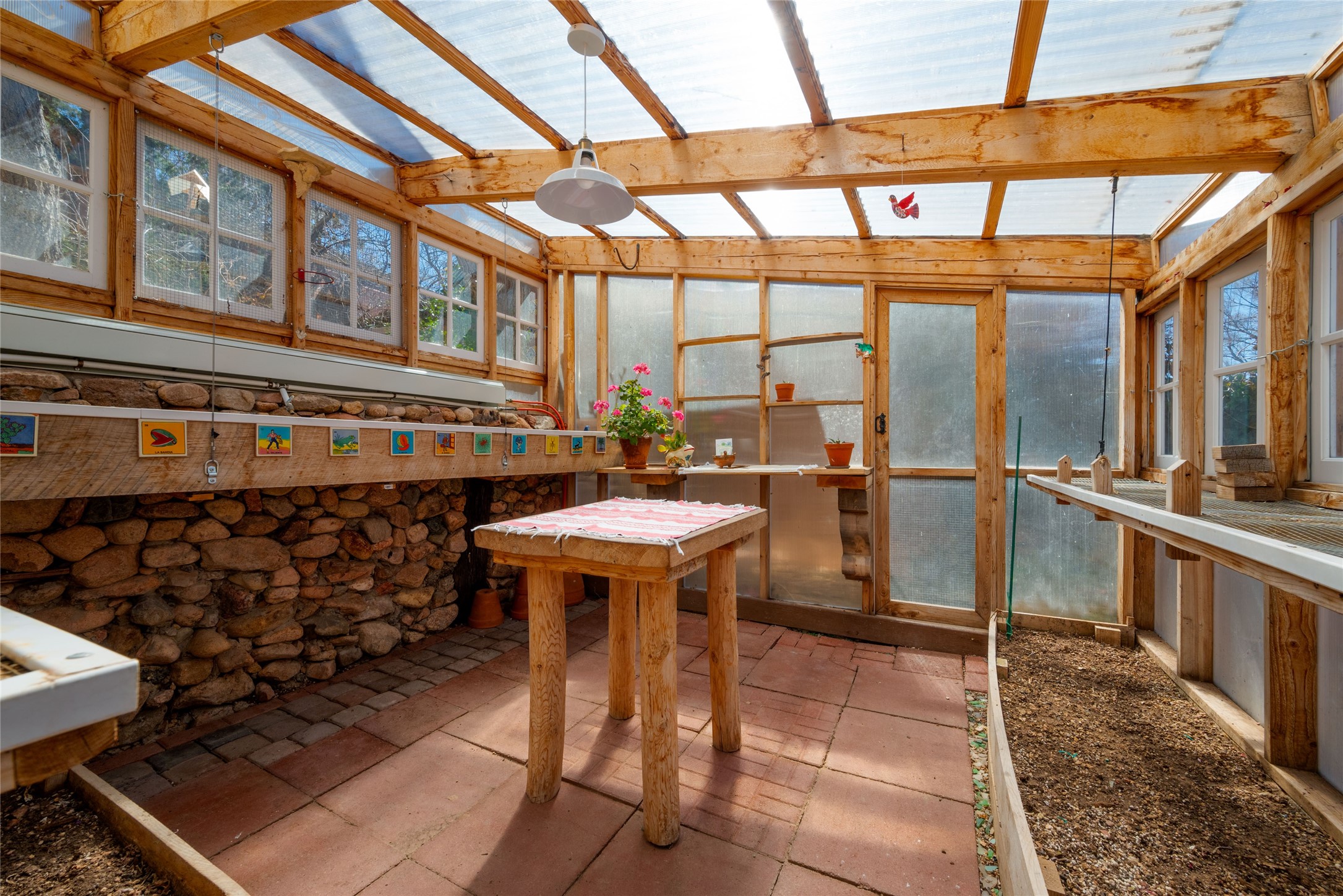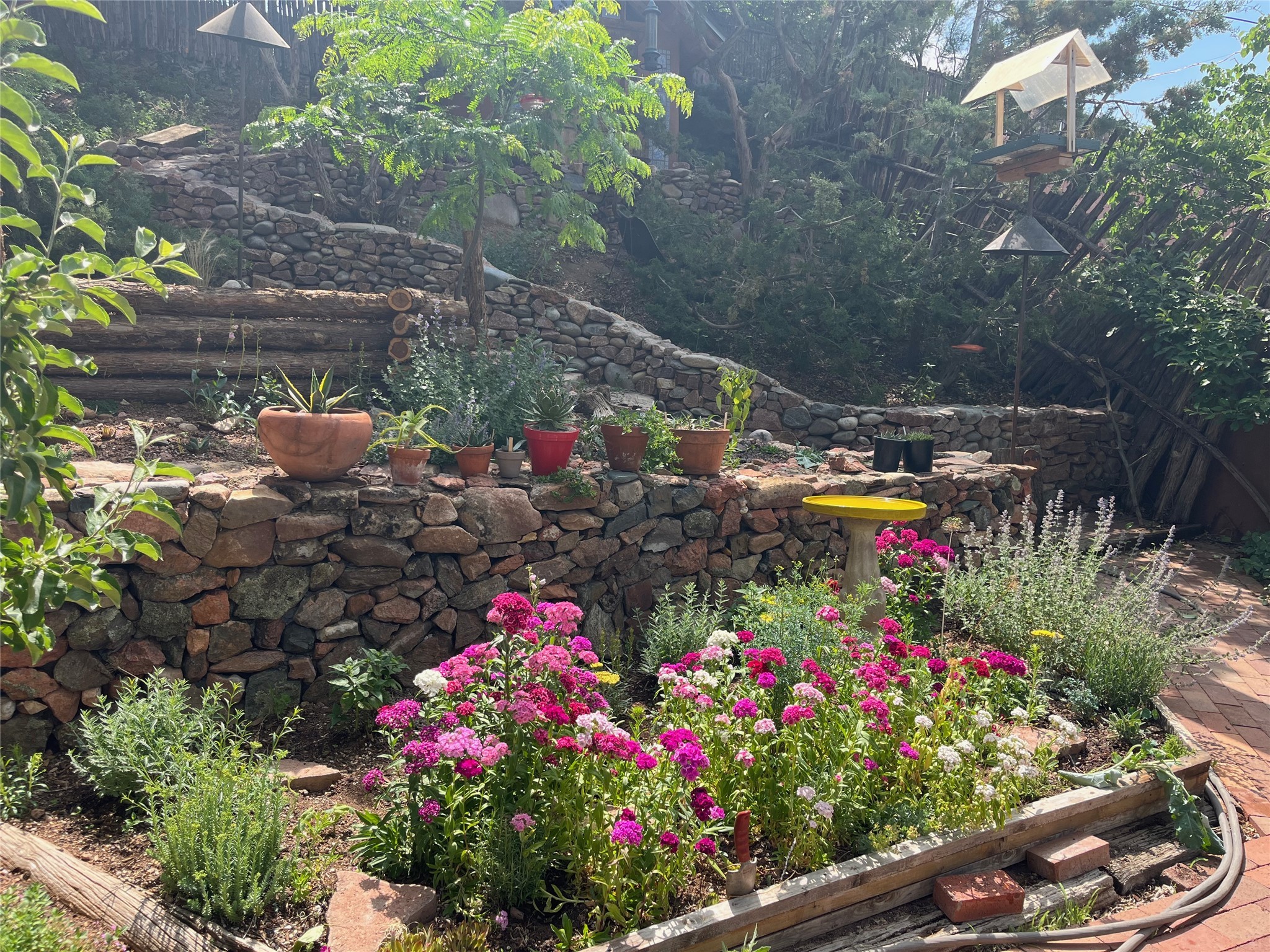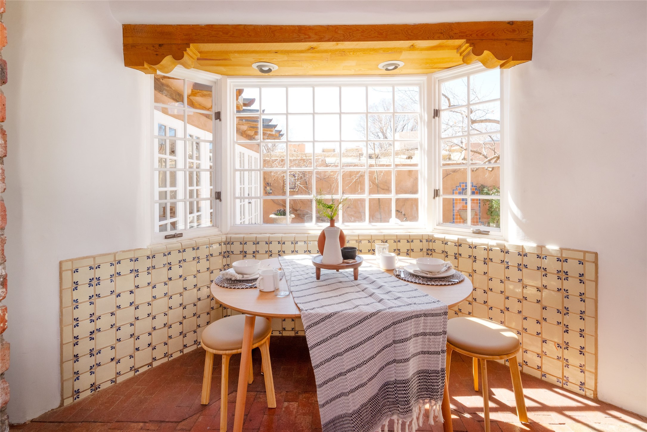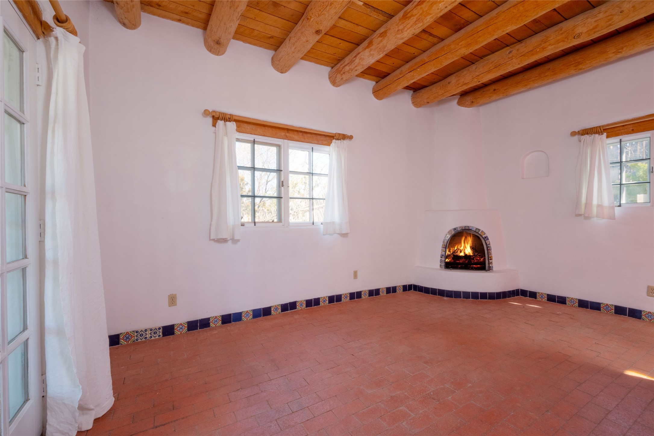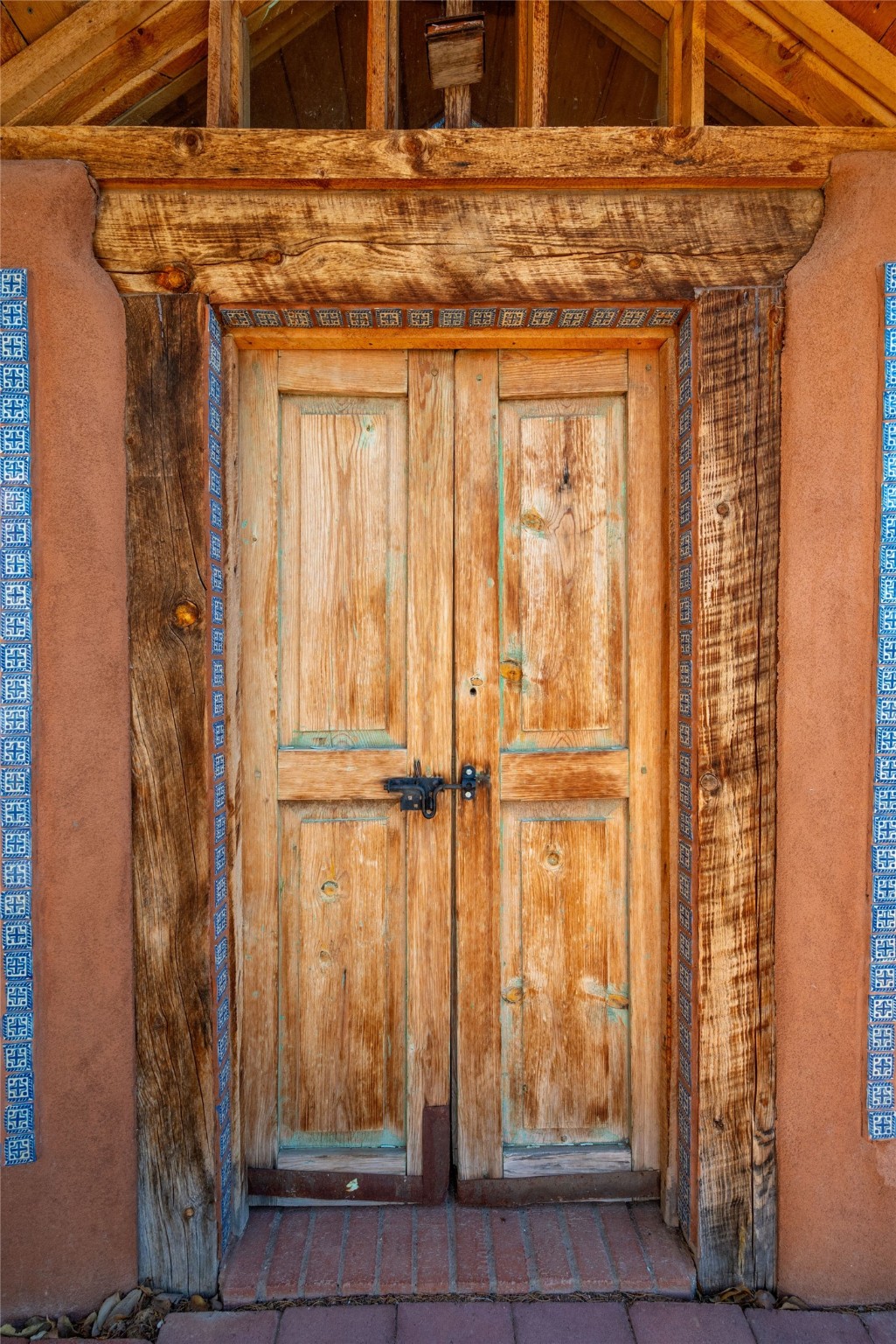 Upon entering the antique hand carved front doors, one is welcomed by a generous courtyard lined with multiple French doors filling the house with sunlight from morning to dusk. The beautiful bright hallway separates a private bedroom wing (2 bedrooms, 2 baths), laundry room, and office from the living room, breakfast nook and dining room area. The house has authentic New Mexican brick floors throughout and a traditional kiva fireplace surrounded by antique tiles. From the courtyard, an antique gate opens to hand-built stone walls, a year-round heated greenhouse, a terraced backyard filled with cactus and perennial gardens and apple trees. A tiled chapel sits high on the top of the property, offering views of the historic Lorenzo neighborhood. High above the house is the casita with 11 foot ceilings made of authentic split cedar latillas. There is a full kitchen, bath, bedroom and 2 kiva fireplaces. The living room and bedroom are accented by an expansive full length covered porch. The casita/guest house is surrounded by native New Mexican woodlands: pinon, juniper, cypress, chamisa, desert broom, purple aster and many other species, attracting birds and butterflies. The grounds are lined with brick walkways. The property is fully walled and fenced along the property lines, providing a private escape with plenty of room to explor and relax. The European style heaters were installed in 2025.