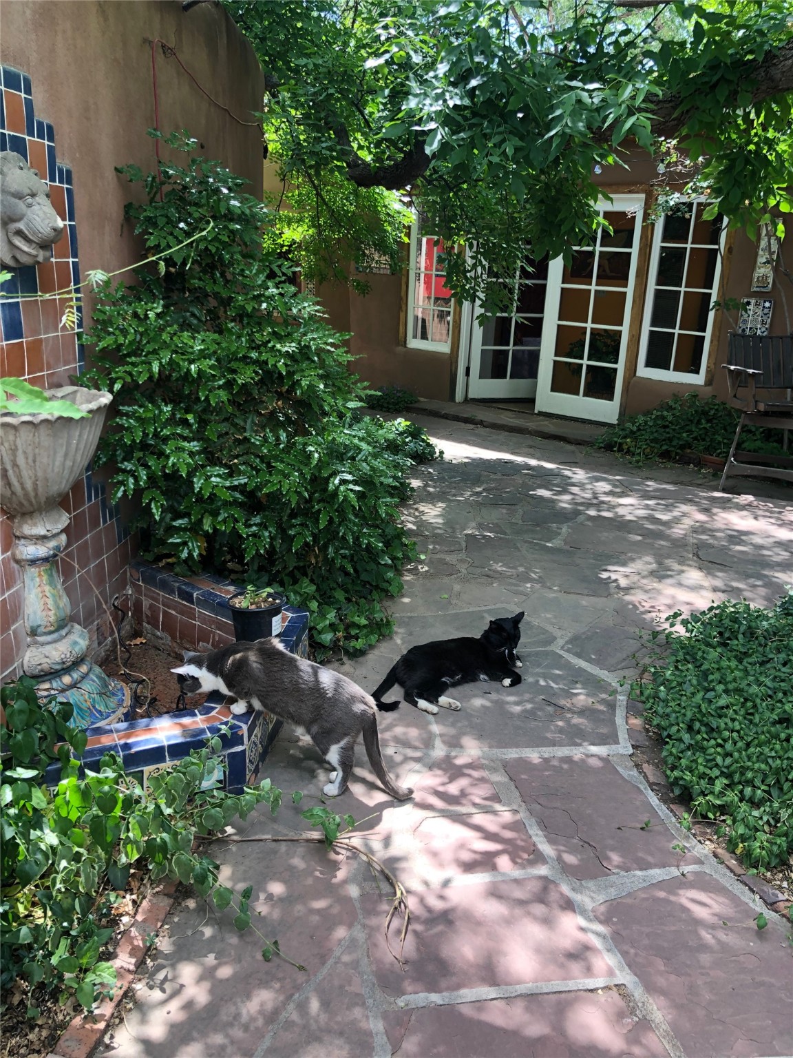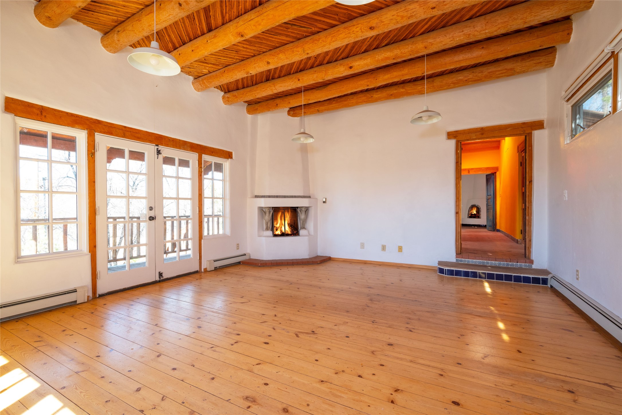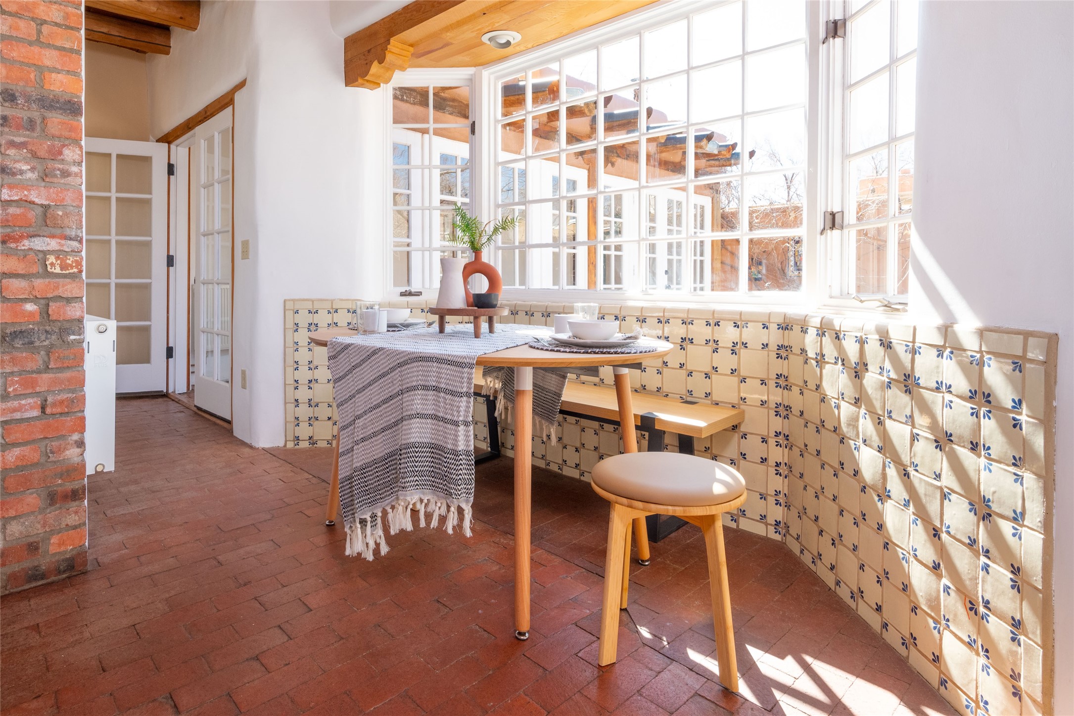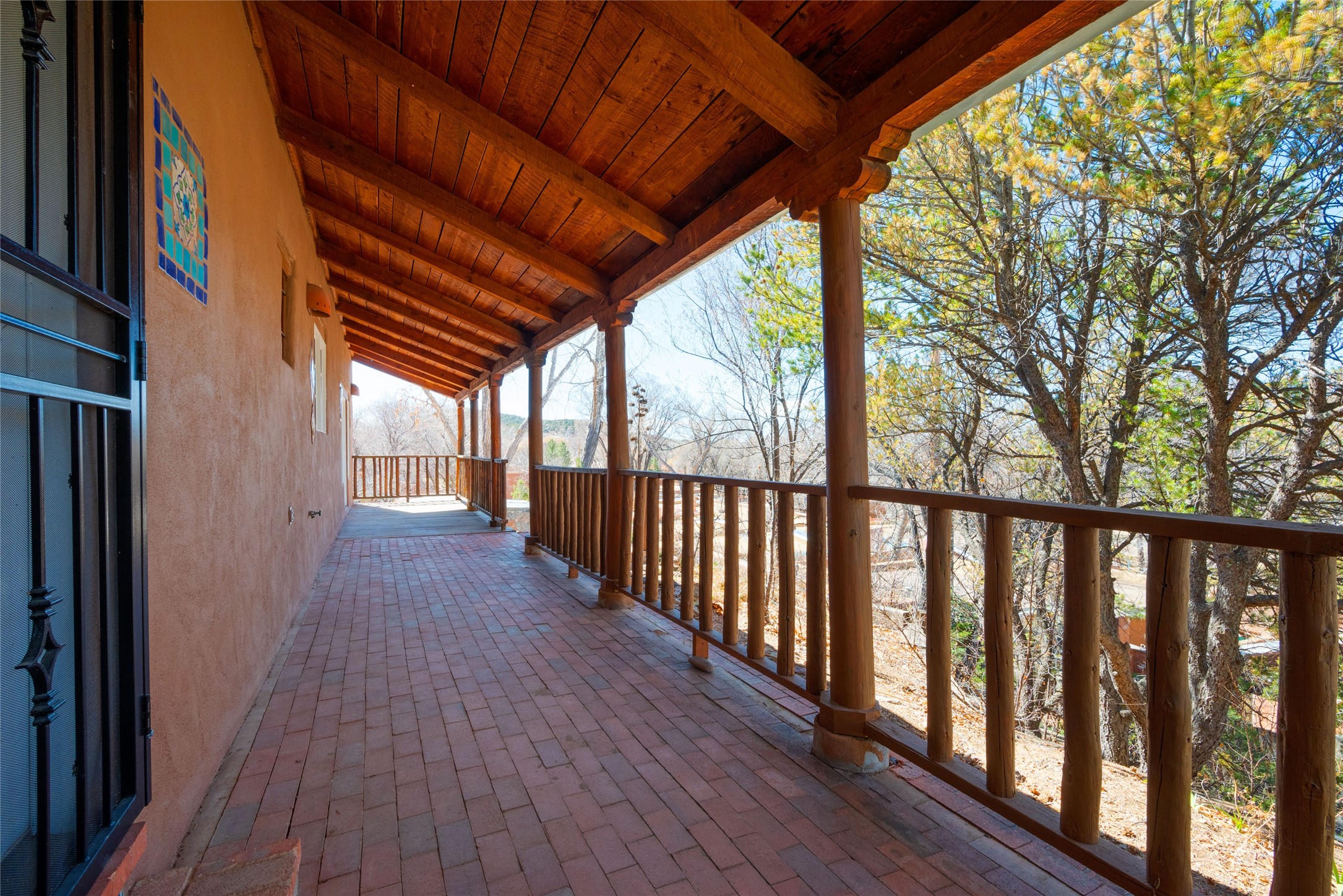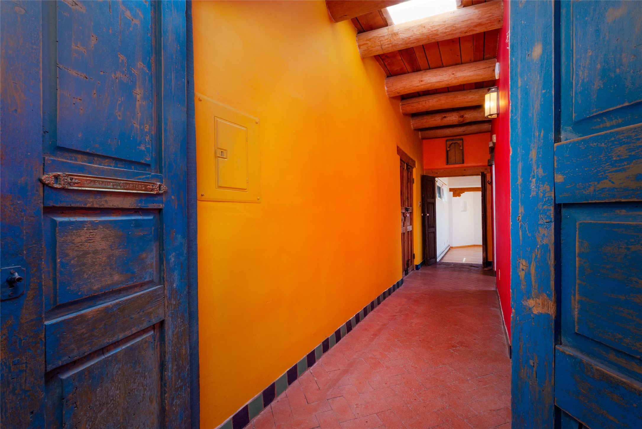 Upon entering the antique hand carved front doors, one is welcomed by a generous courtyard lined with multiple French doors filling the house with sunlight from morning to dusk. The beautiful bright hallway separates a private bedroom wing (2 bedrooms, 2 baths), laundry room, and office from the living room, breakfast nook and dining room area. The house has authentic New Mexican brick floors throughout and a traditional kiva fireplace surrounded by antique tiles. From the courtyard, an antique gate opens to hand-built stone walls, a year-round heated greenhouse, a terraced backyard filled with cactus and perennial gardens and apple trees. A tiled chapel sits high on the top of the property, offering views of the historic Lorenzo neighborhood. High above the house is the casita with 11 foot ceilings made of authentic split cedar latillas. There is a full kitchen, bath, bedroom and 2 kiva fireplaces. The living room and bedroom are accented by an expansive full length covered porch. The casita/guest house is surrounded by native New Mexican woodlands: pinon, juniper, cypress, chamisa, desert broom, purple aster and many other species, attracting birds and butterflies. The grounds are lined with brick walkways. The property is fully walled and fenced along the property lines, providing a private escape with plenty of room to explor and relax. The European style heaters were installed in 2025.