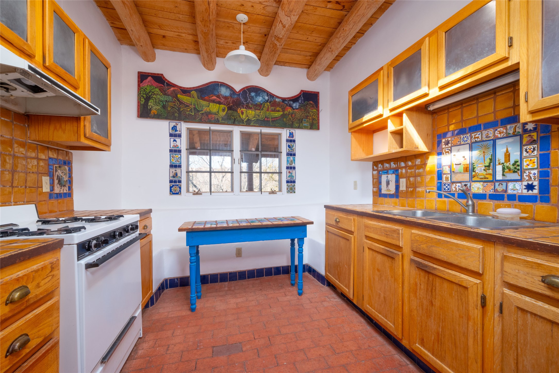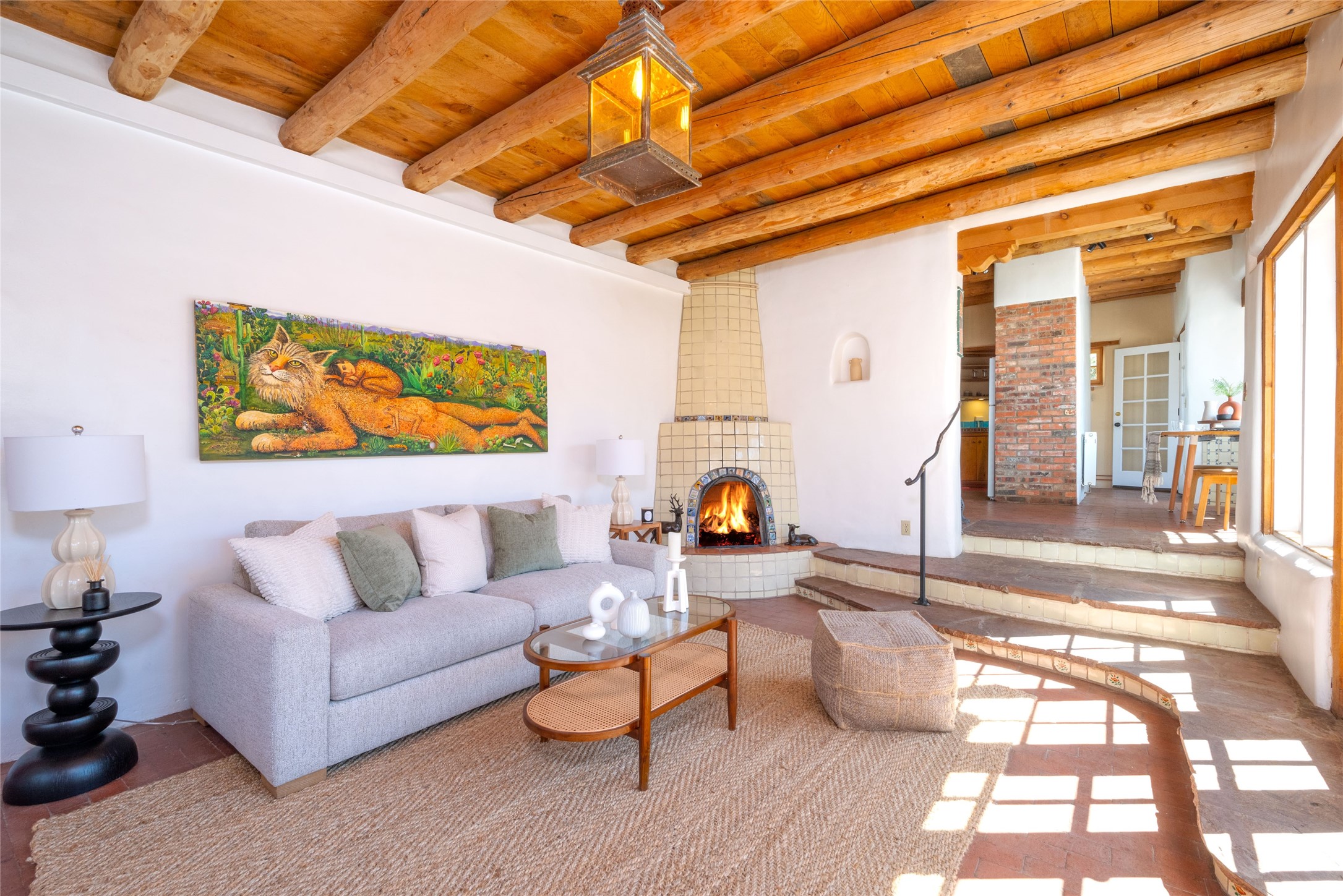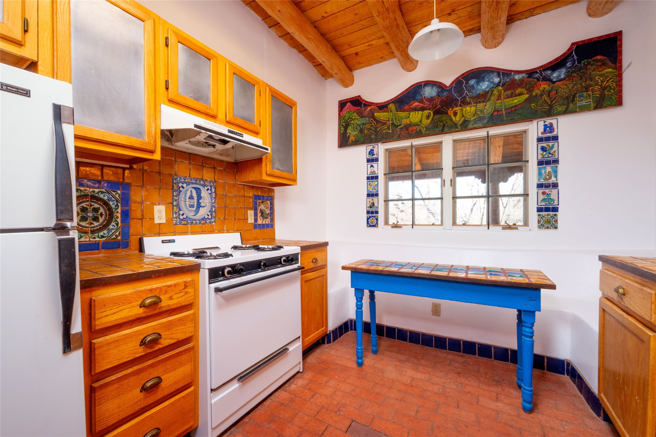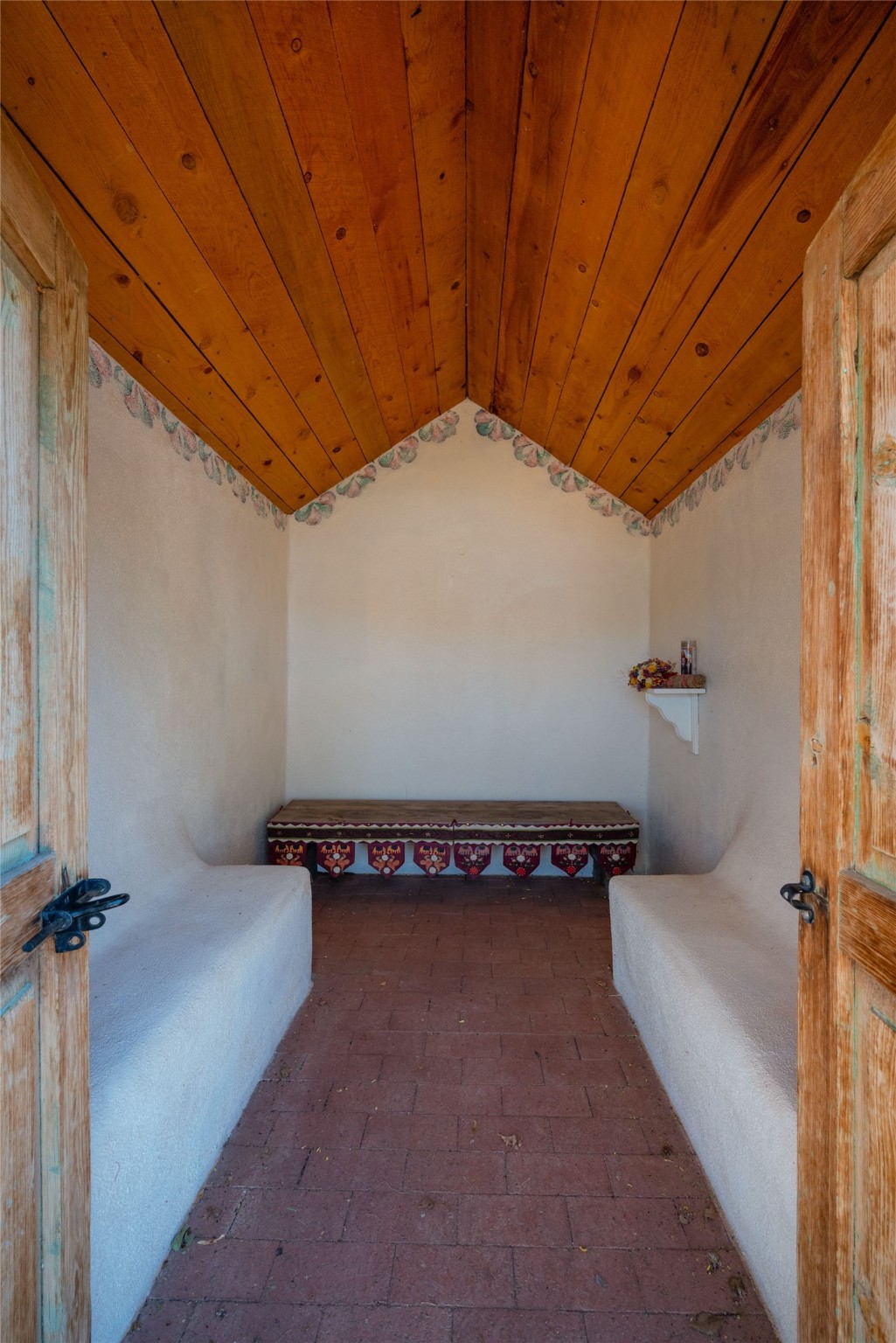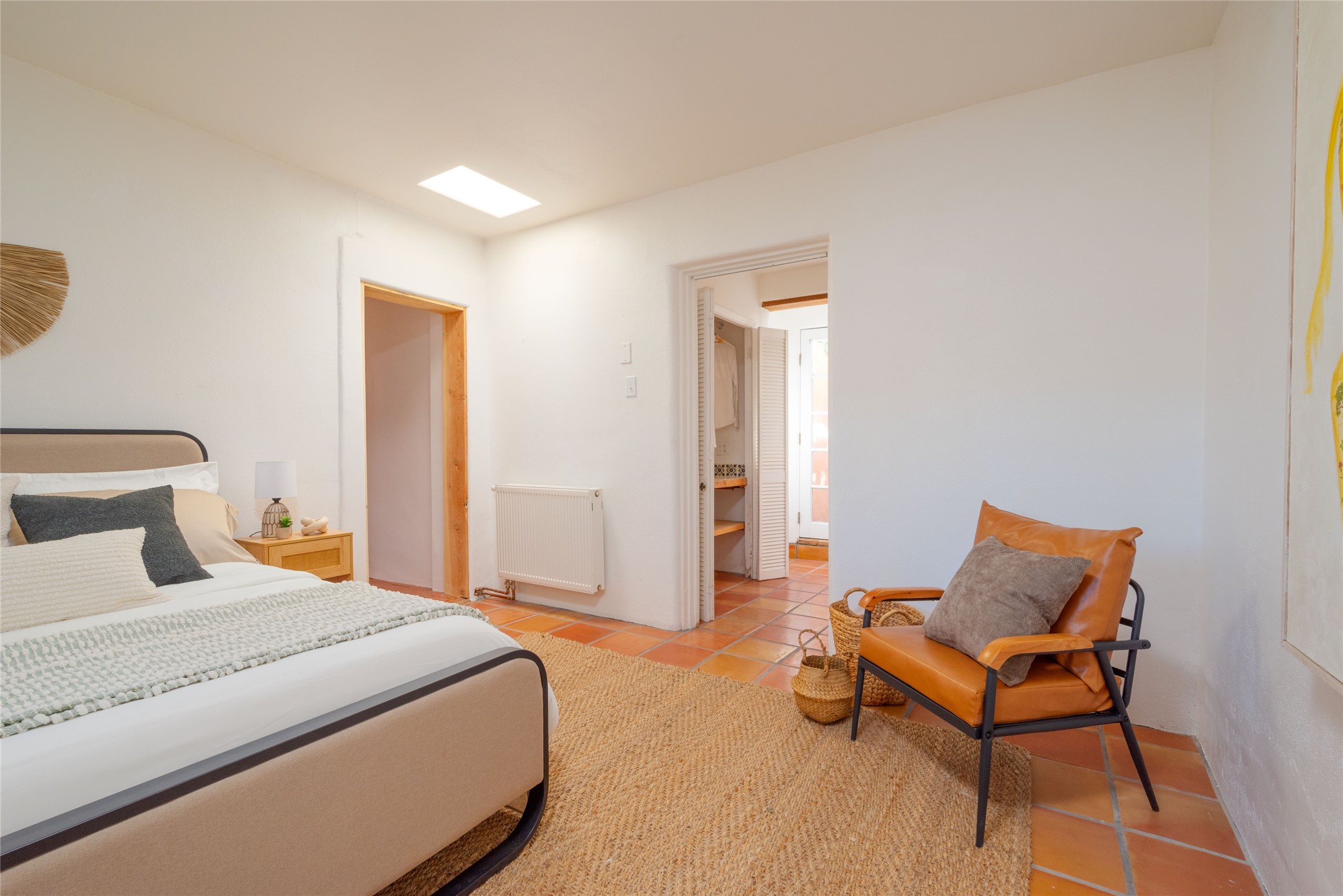 Upon entering the antique hand carved front doors, one is welcomed by a generous courtyard lined with multiple French doors filling the house with sunlight from morning to dusk. The beautiful bright hallway separates a private bedroom wing (2 bedrooms, 2 baths), laundry room, and office from the living room, breakfast nook and dining room area. The house has authentic New Mexican brick floors throughout and a traditional kiva fireplace surrounded by antique tiles. From the courtyard, an antique gate opens to hand-built stone walls, a year-round heated greenhouse, a terraced backyard filled with cactus and perennial gardens and apple trees. A tiled chapel sits high on the top of the property, offering views of the historic Lorenzo neighborhood. High above the house is the casita with 11 foot ceilings made of authentic split cedar latillas. There is a full kitchen, bath, bedroom and 2 kiva fireplaces. The living room and bedroom are accented by an expansive full length covered porch. The casita/guest house is surrounded by native New Mexican woodlands: pinon, juniper, cypress, chamisa, desert broom, purple aster and many other species, attracting birds and butterflies. The grounds are lined with brick walkways. The property is fully walled and fenced along the property lines, providing a private escape with plenty of room to explor and relax. The European style heaters were installed in 2025.
