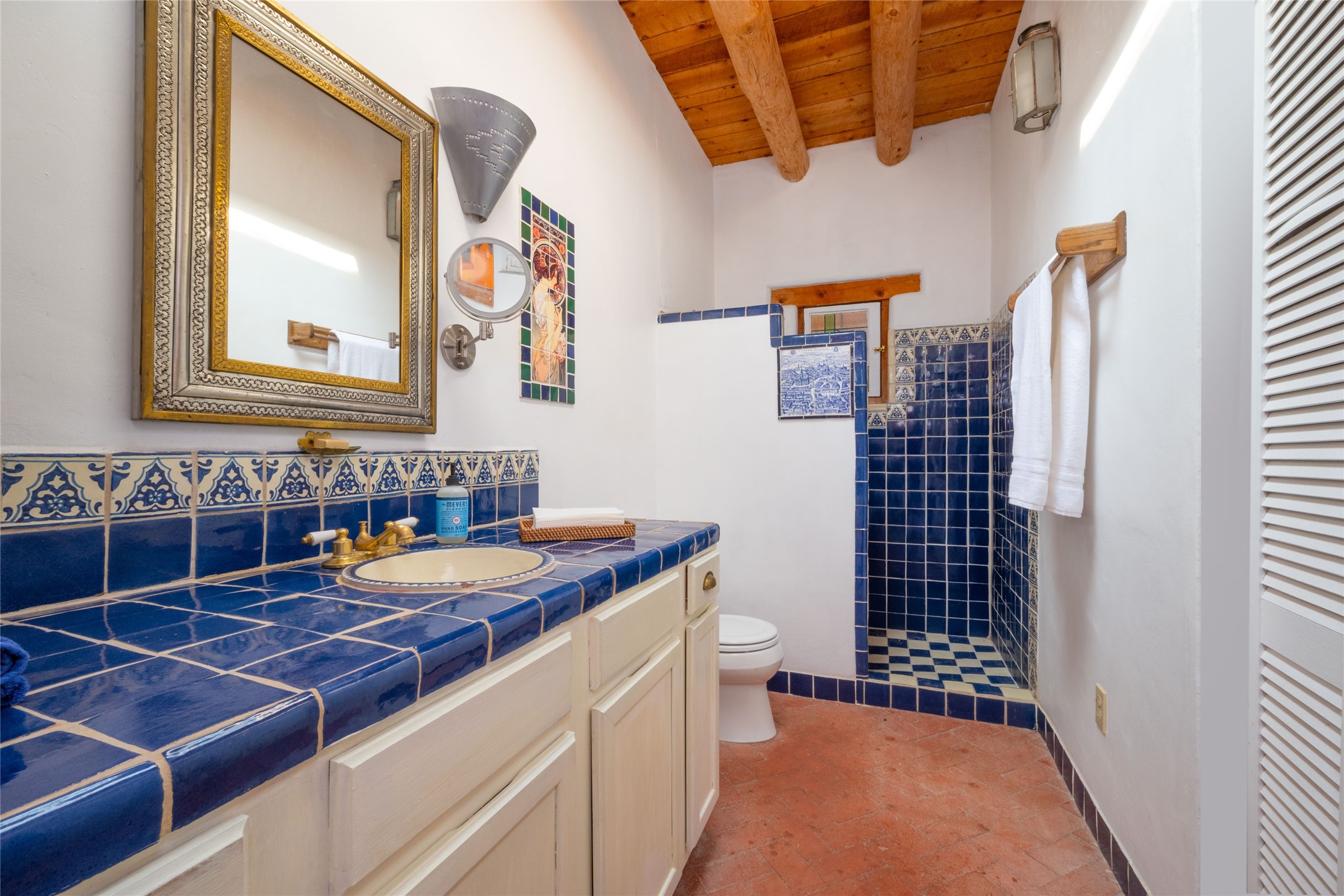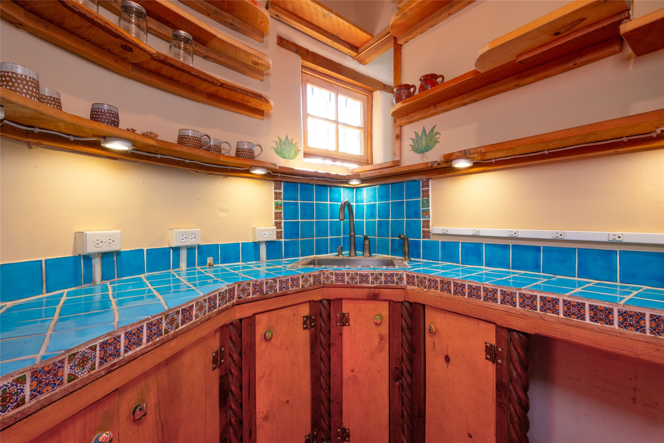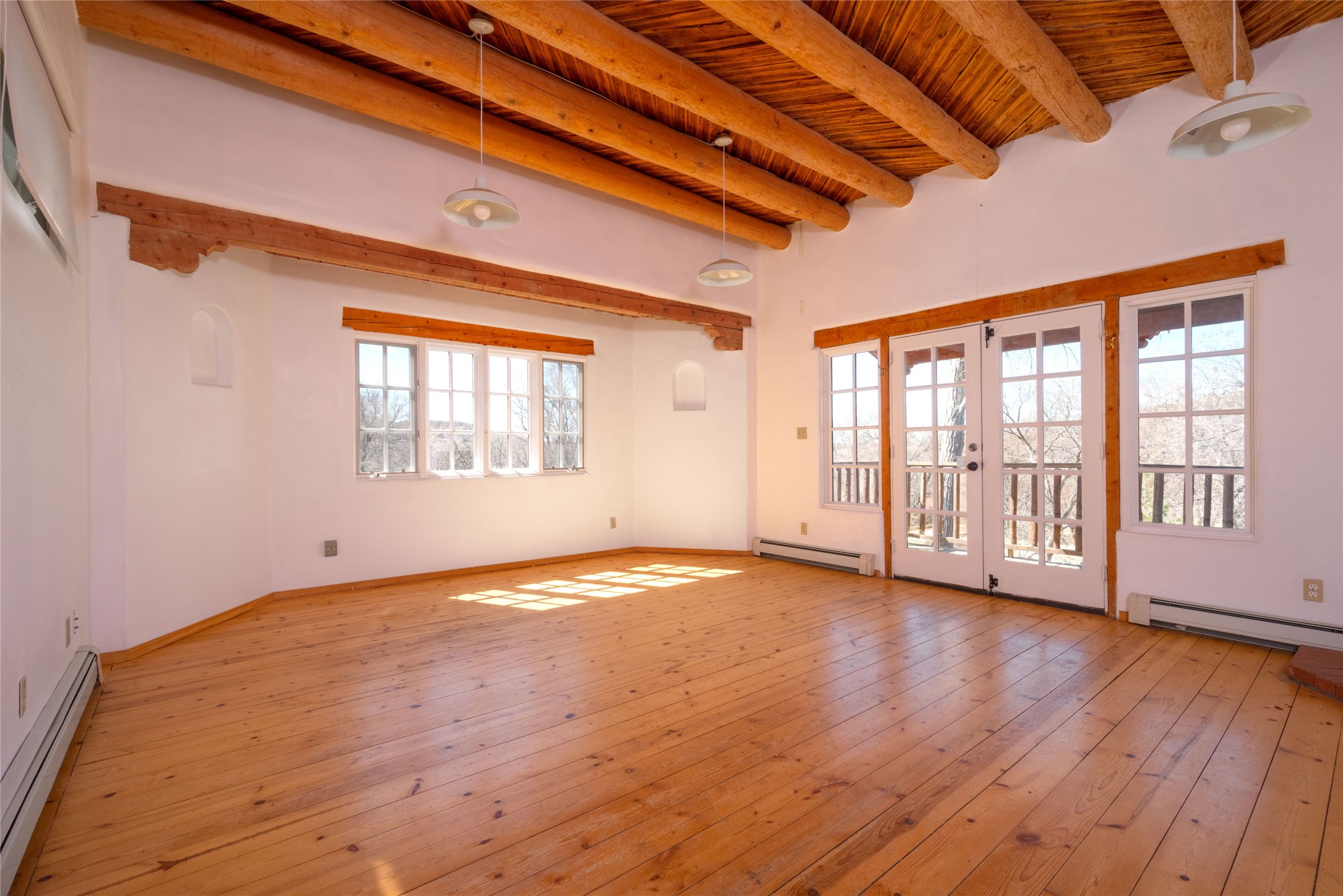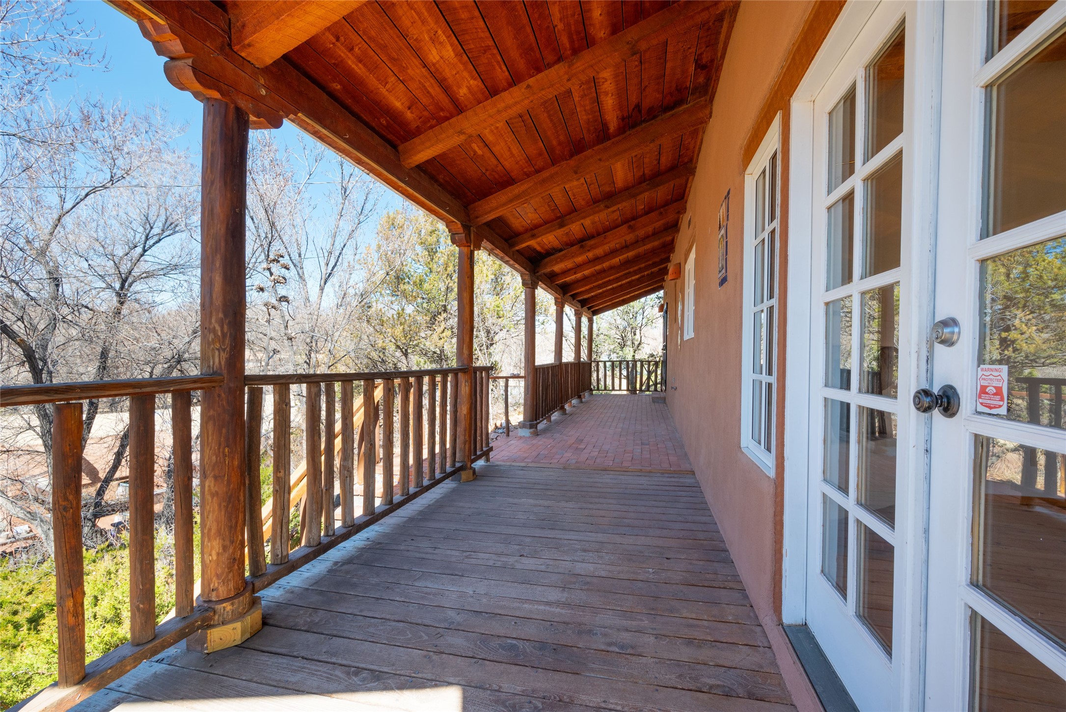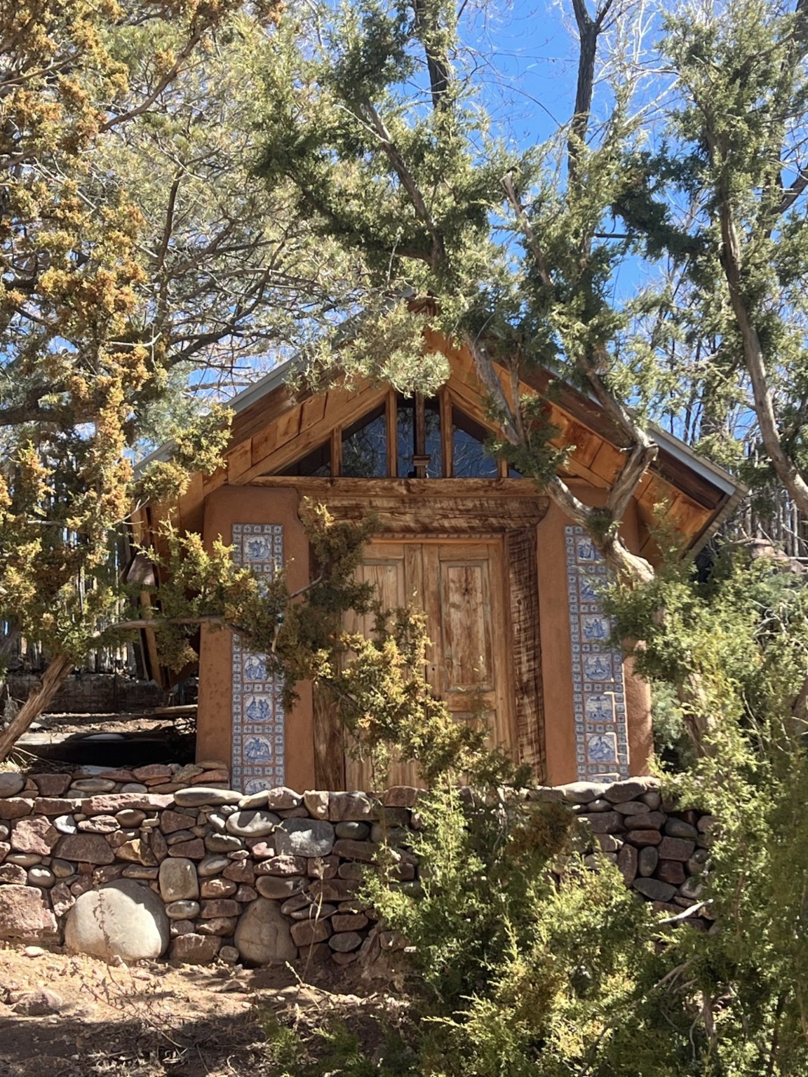 Upon entering the antique hand carved front doors, one is welcomed by a generous courtyard lined with multiple French doors filling the house with sunlight from morning to dusk. The beautiful bright hallway separates a private bedroom wing (2 bedrooms, 2 baths), laundry room, and office from the living room, breakfast nook and dining room area. The house has authentic New Mexican brick floors throughout and a traditional kiva fireplace surrounded by antique tiles. From the courtyard, an antique gate opens to hand-built stone walls, a year-round heated greenhouse, a terraced backyard filled with cactus and perennial gardens and apple trees. A tiled chapel sits high on the top of the property, offering views of the historic Lorenzo neighborhood. High above the house is the casita with 11 foot ceilings made of authentic split cedar latillas. There is a full kitchen, bath, bedroom and 2 kiva fireplaces. The living room and bedroom are accented by an expansive full length covered porch. The casita/guest house is surrounded by native New Mexican woodlands: pinon, juniper, cypress, chamisa, desert broom, purple aster and many other species, attracting birds and butterflies. The grounds are lined with brick walkways. The property is fully walled and fenced along the property lines, providing a private escape with plenty of room to explor and relax. The European style heaters were installed in 2025.