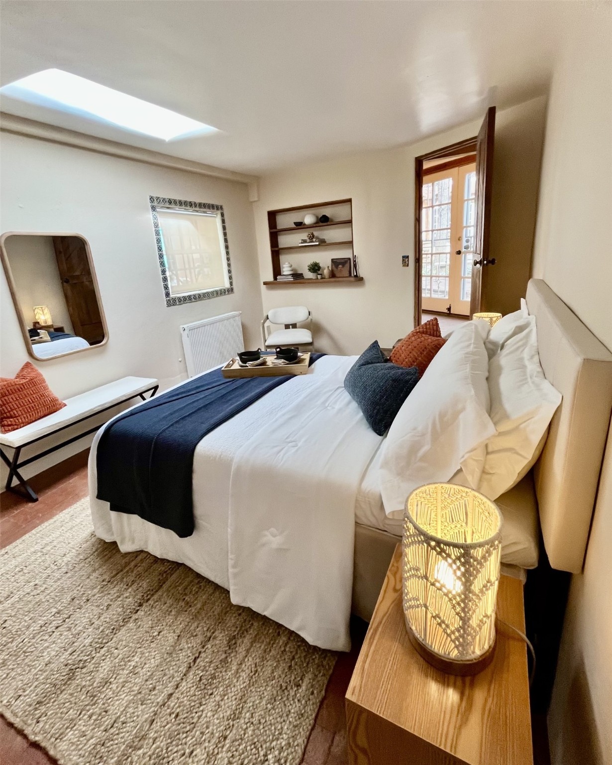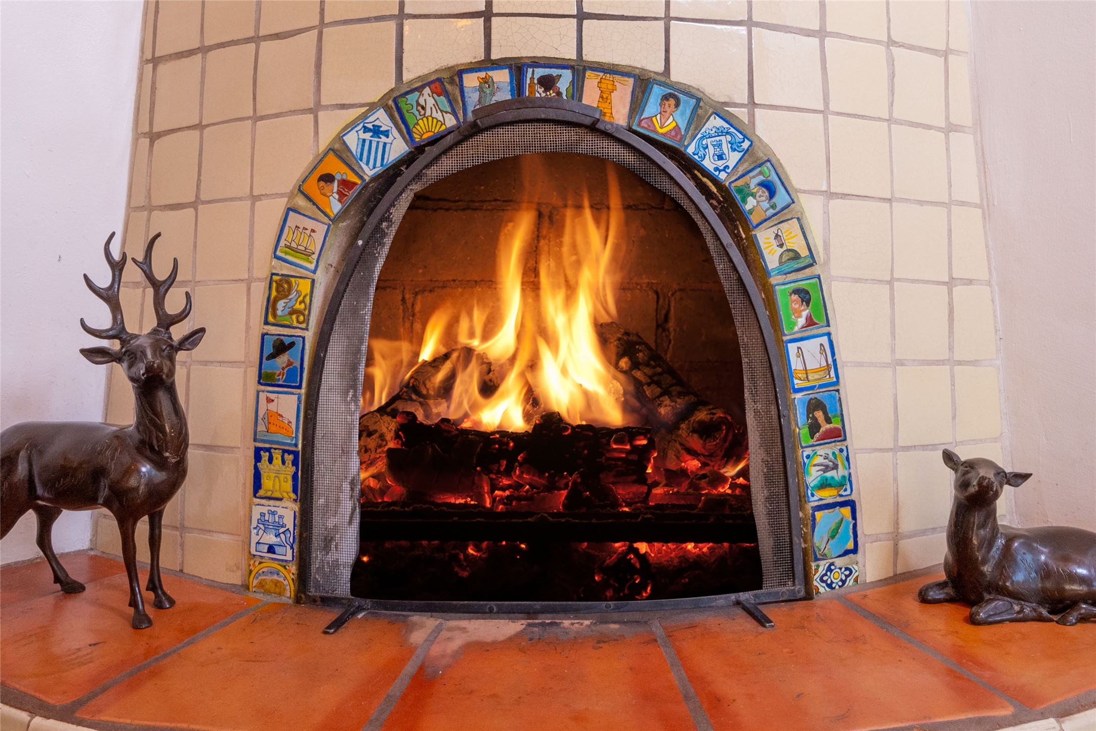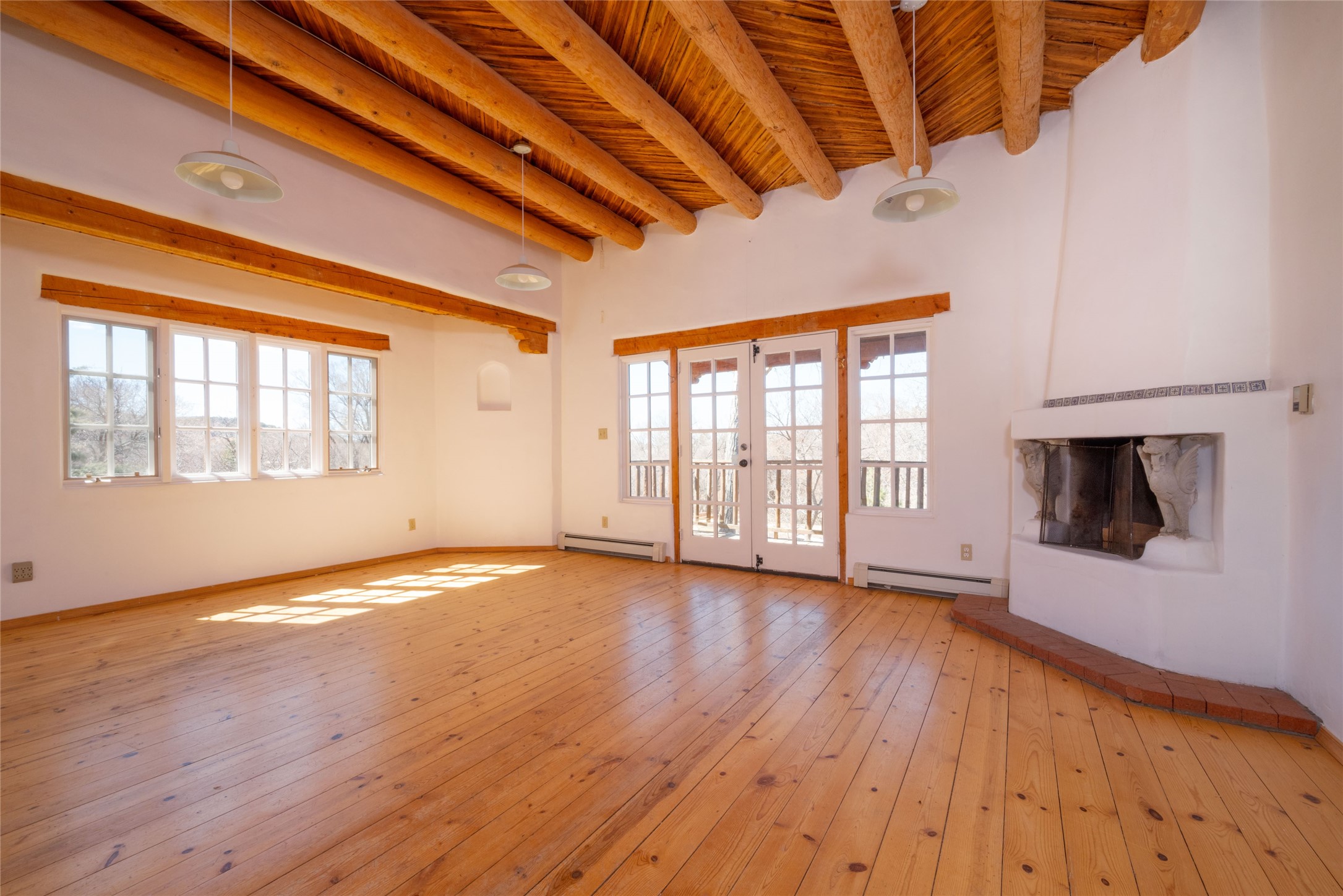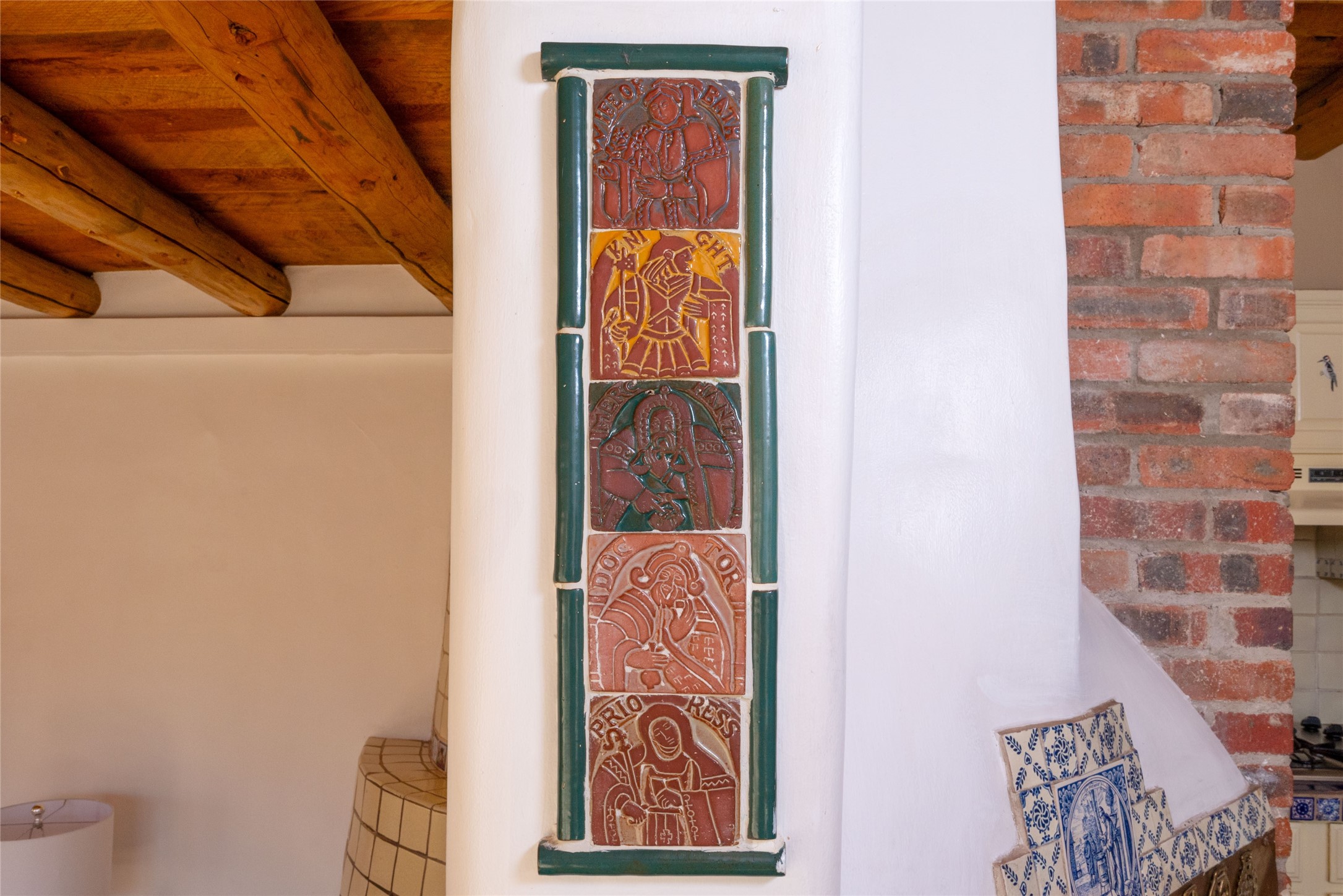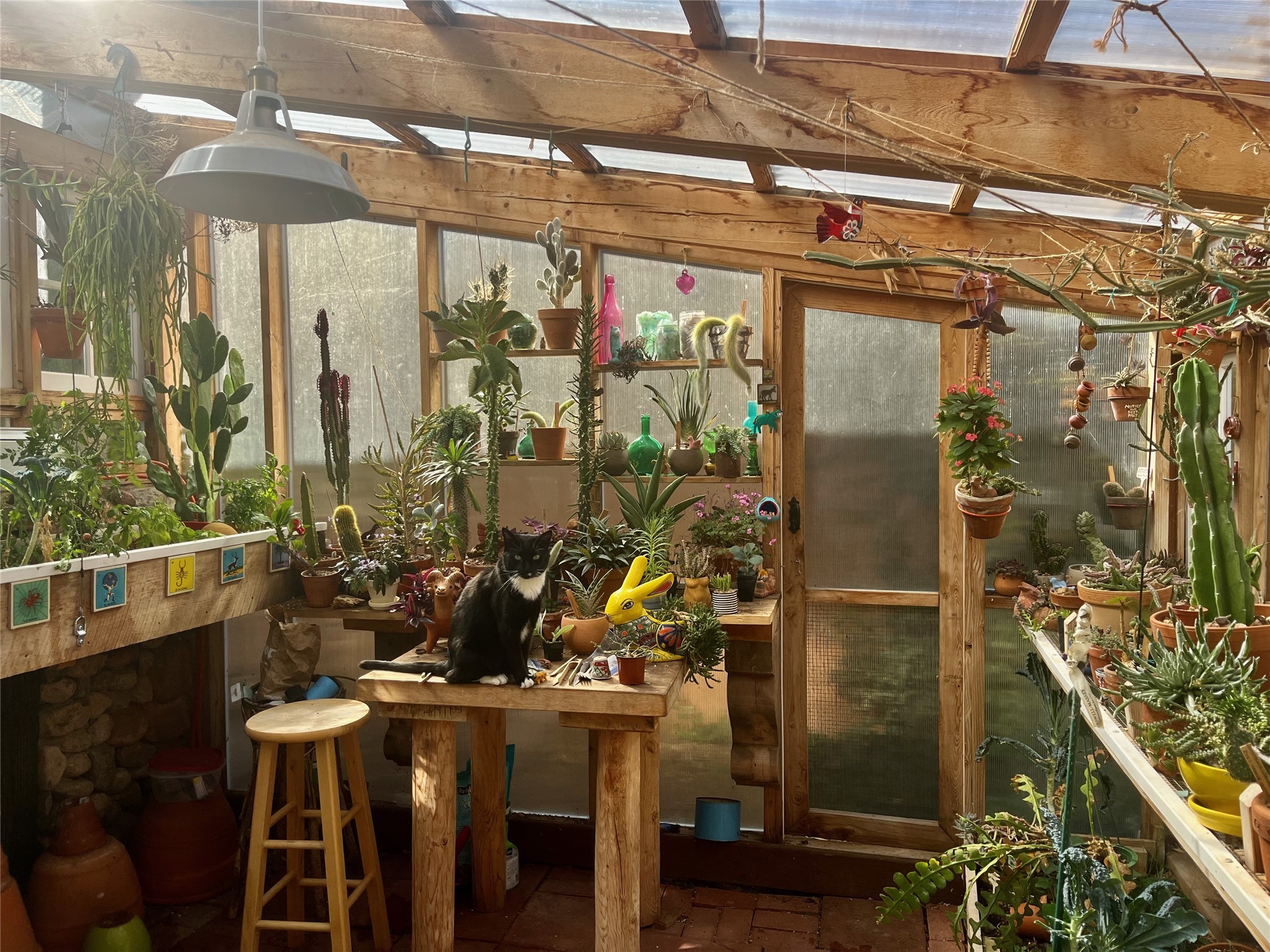 Upon entering the antique hand carved front doors, one is welcomed by a generous courtyard lined with multiple French doors filling the house with sunlight from morning to dusk. The beautiful bright hallway separates a private bedroom wing (2 bedrooms, 2 baths), laundry room, and office from the living room, breakfast nook and dining room area. The house has authentic New Mexican brick floors throughout and a traditional kiva fireplace surrounded by antique tiles. From the courtyard, an antique gate opens to hand-built stone walls, a year-round heated greenhouse, a terraced backyard filled with cactus and perennial gardens and apple trees. A tiled chapel sits high on the top of the property, offering views of the historic Lorenzo neighborhood. High above the house is the casita with 11 foot ceilings made of authentic split cedar latillas. There is a full kitchen, bath, bedroom and 2 kiva fireplaces. The living room and bedroom are accented by an expansive full length covered porch. The casita/guest house is surrounded by native New Mexican woodlands: pinon, juniper, cypress, chamisa, desert broom, purple aster and many other species, attracting birds and butterflies. The grounds are lined with brick walkways. The property is fully walled and fenced along the property lines, providing a private escape with plenty of room to explor and relax. The European style heaters were installed in 2025.