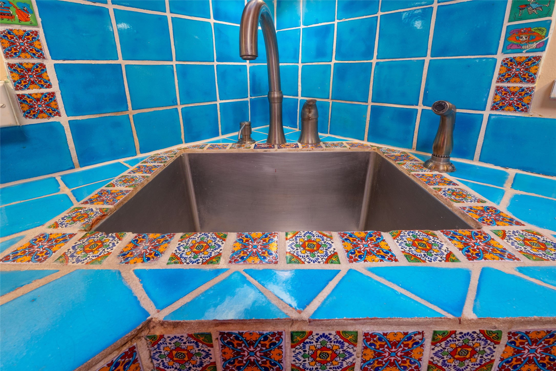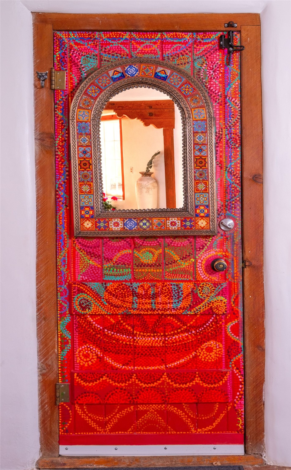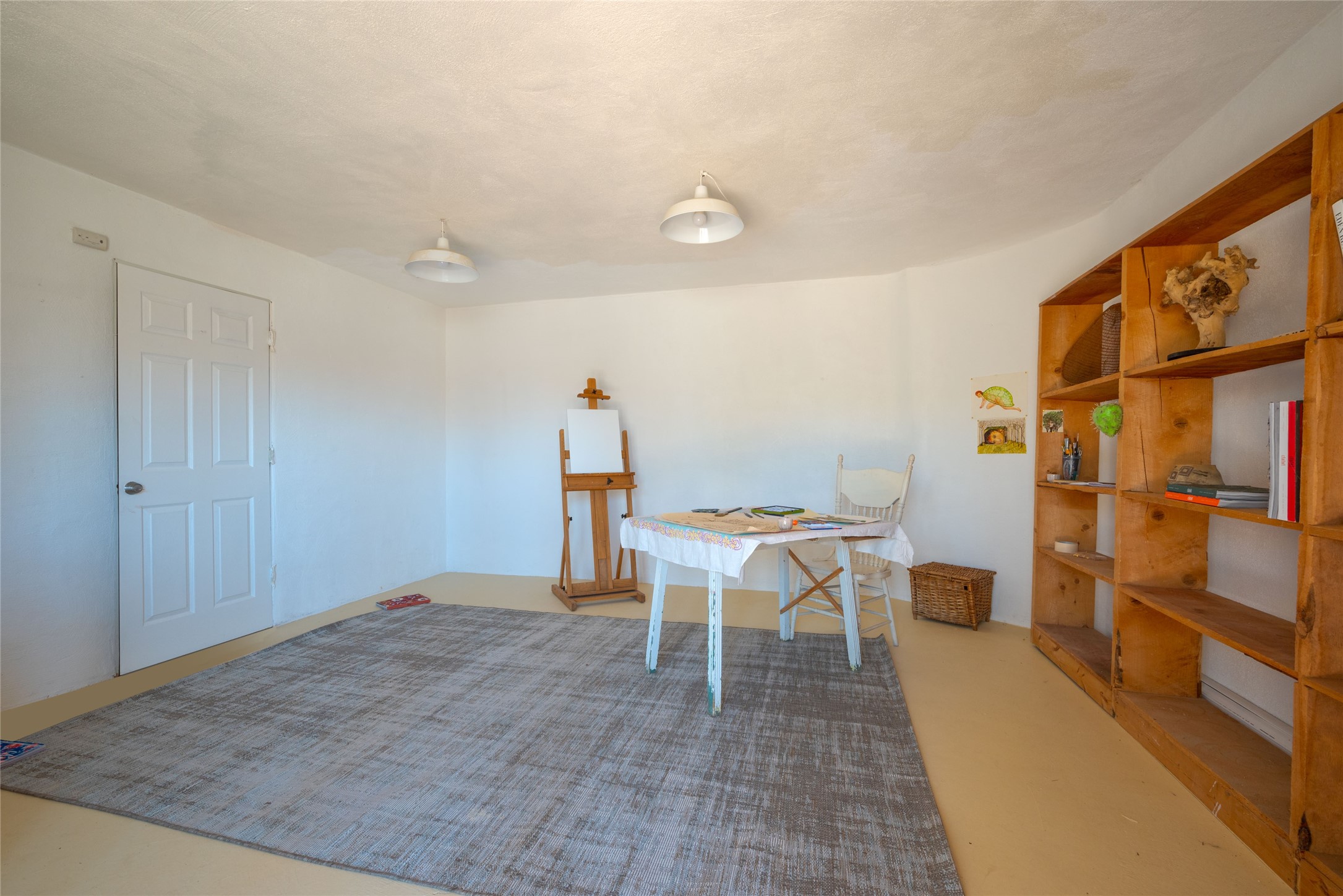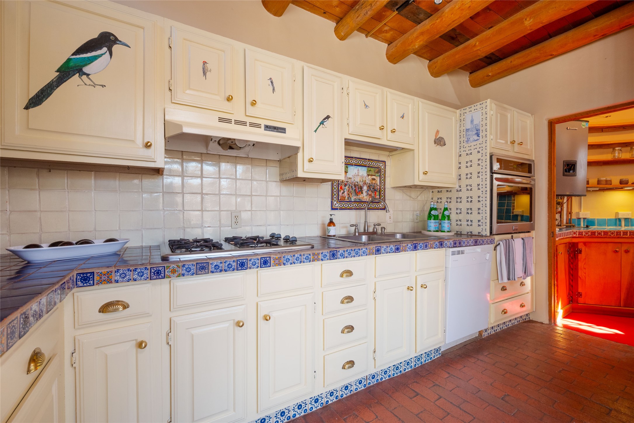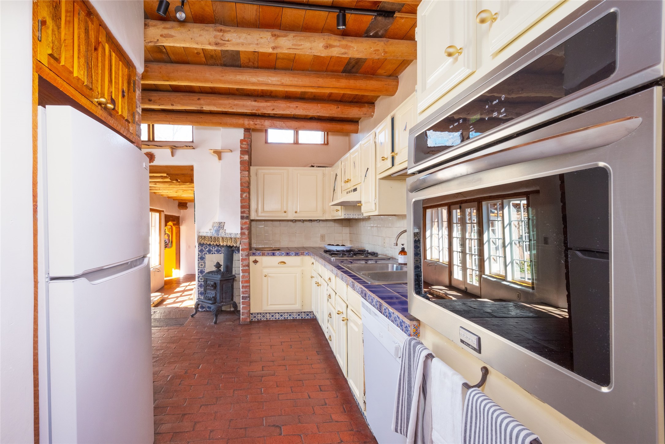 Upon entering the antique hand carved front doors, one is welcomed by a generous courtyard lined with multiple French doors filling the house with sunlight from morning to dusk. The beautiful bright hallway separates a private bedroom wing (2 bedrooms, 2 baths), laundry room, and office from the living room, breakfast nook and dining room area. The house has authentic New Mexican brick floors throughout and a traditional kiva fireplace surrounded by antique tiles. From the courtyard, an antique gate opens to hand-built stone walls, a year-round heated greenhouse, a terraced backyard filled with cactus and perennial gardens and apple trees. A tiled chapel sits high on the top of the property, offering views of the historic Lorenzo neighborhood. High above the house is the casita with 11 foot ceilings made of authentic split cedar latillas. There is a full kitchen, bath, bedroom and 2 kiva fireplaces. The living room and bedroom are accented by an expansive full length covered porch. The casita/guest house is surrounded by native New Mexican woodlands: pinon, juniper, cypress, chamisa, desert broom, purple aster and many other species, attracting birds and butterflies. The grounds are lined with brick walkways. The property is fully walled and fenced along the property lines, providing a private escape with plenty of room to explor and relax. The European style heaters were installed in 2025.