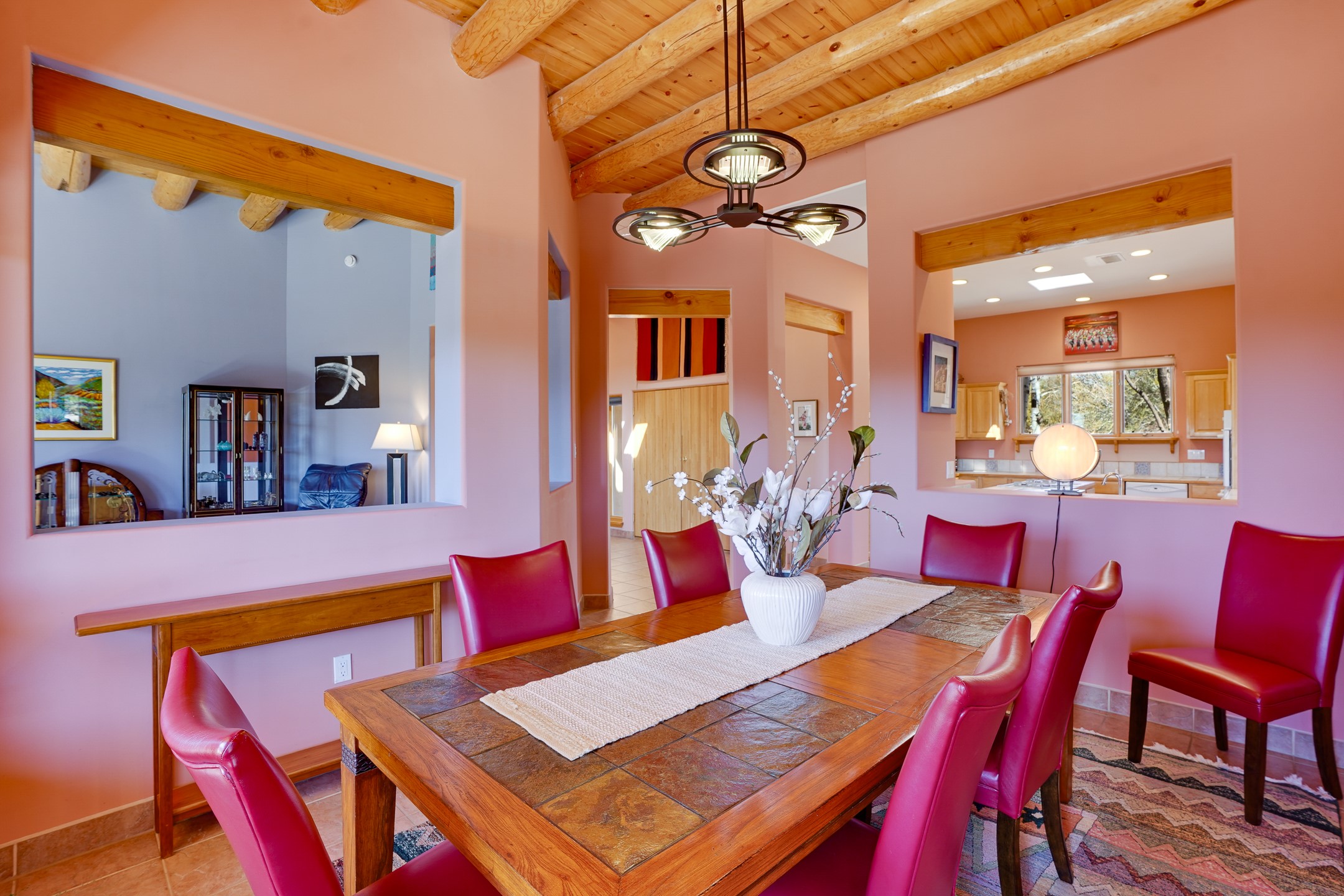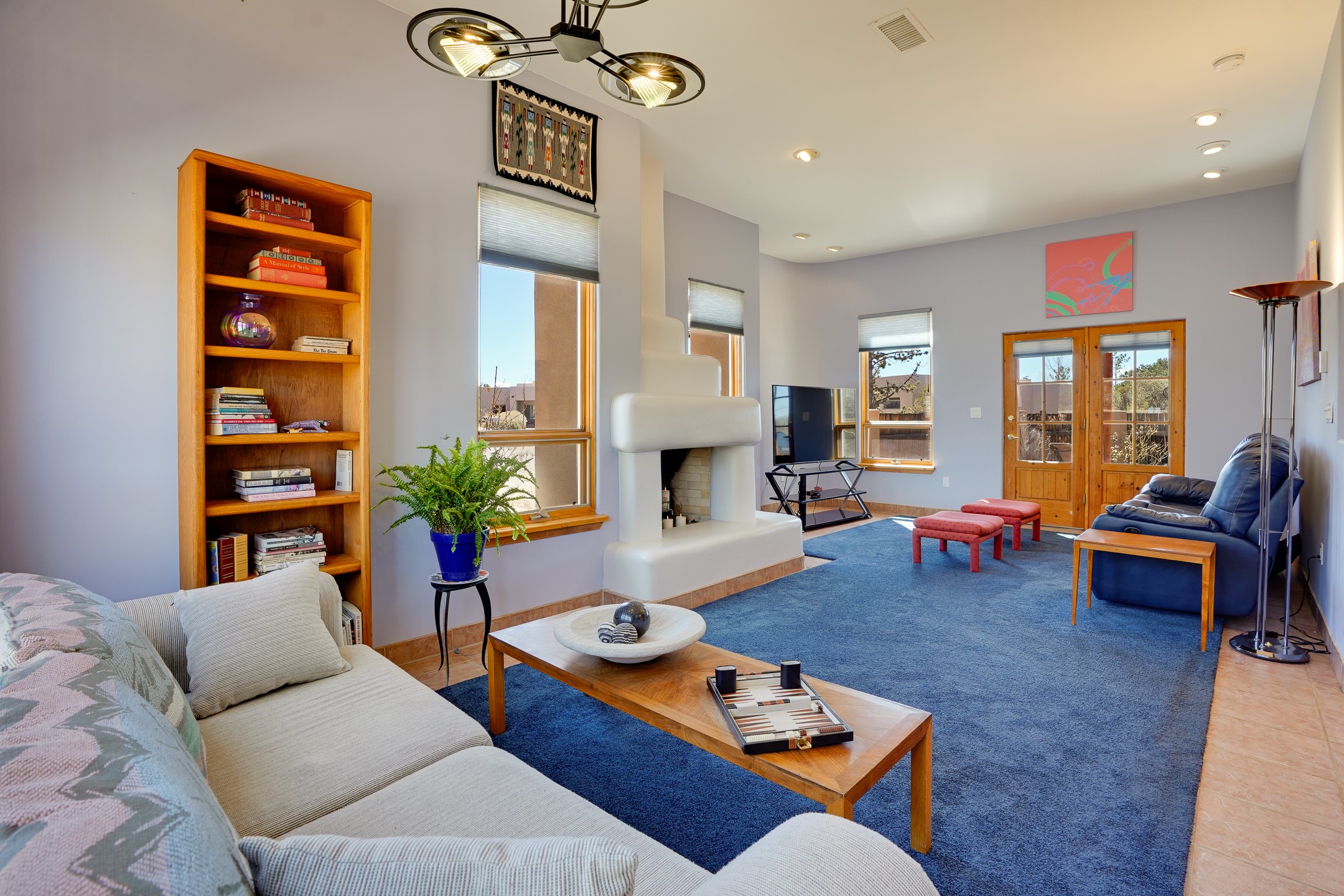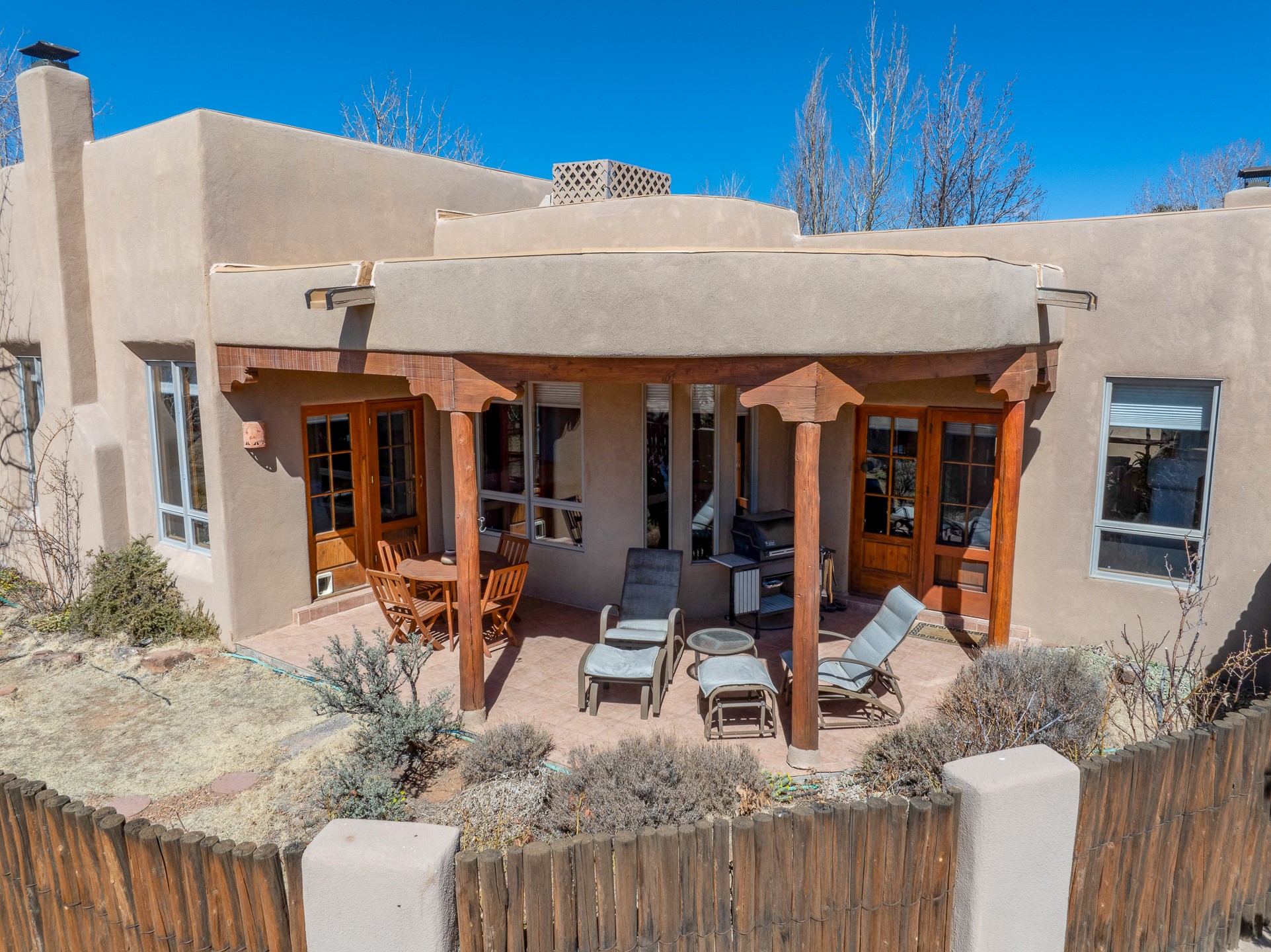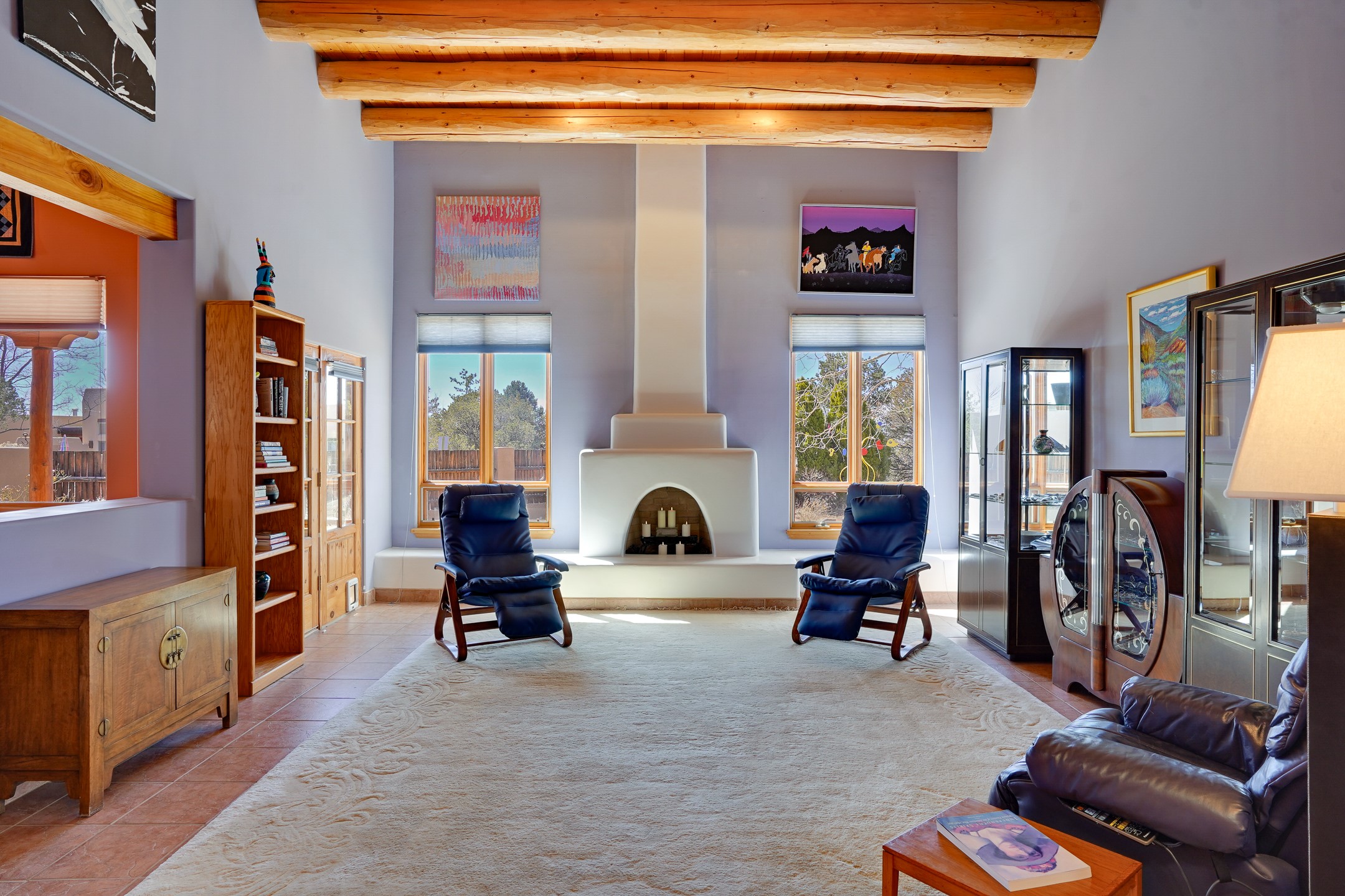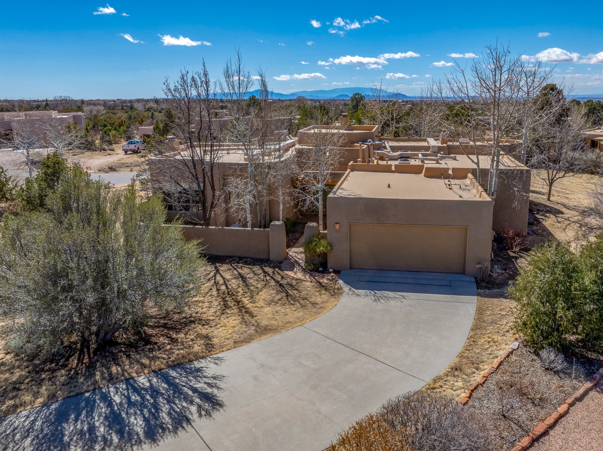 Welcome to this very gracious single level home nestled in the foothills of Santa Fe offering comfort, privacy and convenience with mountain views and spectacular sunsets. It sits on .40 acres just minutes away from museums, shopping, the local hospitals and schools on a cul-de-sac and at the end of the street. The historic plaza is within 4 miles. This home has beautiful high ceilings ( 10 ft,12 ft ,and 14 ft) with vigas in the entryway, dining room and living room. The living room, family room and primary bedroom offer sculpted fireplaces. The primary suite is very spacious and romantic with the stand alone sculpted fireplace, the bathroom has a jetted tub for relaxation, a walk-in shower with grab bars, a large walk-in closet, double sinks, a makeup vanity, tons of light and space. The open kitchen is a 'cooks kitchen' with generous space, double ovens and a center island cooktop. The kitchen and dining room open to a covered back patio with an inline gas barbecue. The patio looks out onto a beautiful garden area offering mature landscaping (with drip irrigation) with cherry and peach trees and dramatic sunset views. This home includes a newer roof (11/2021), new Navien hot water heater and boiler (12/2024), wheelchair accessibility, central air, radiant floor heat, seven skylights and an oversized garage.