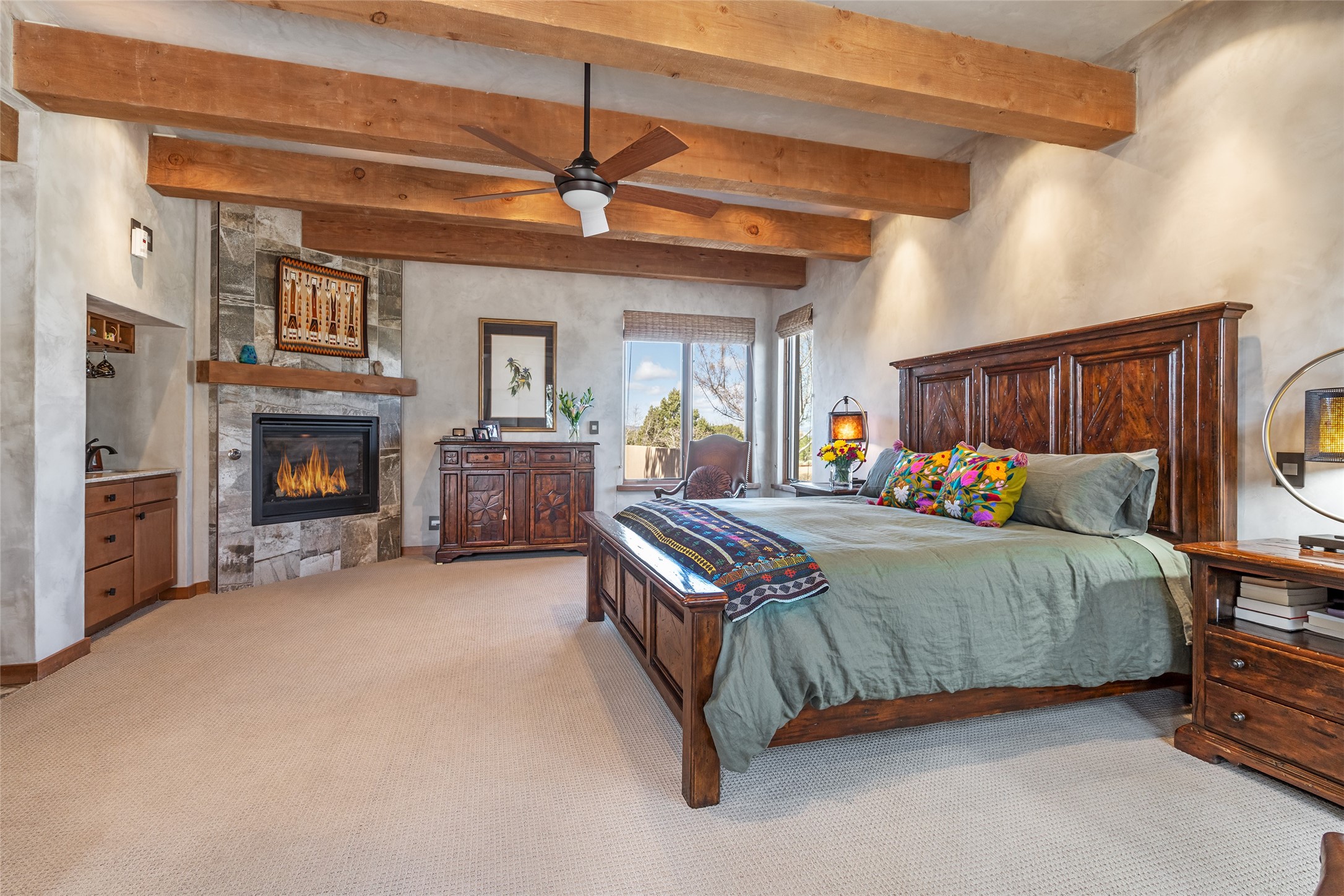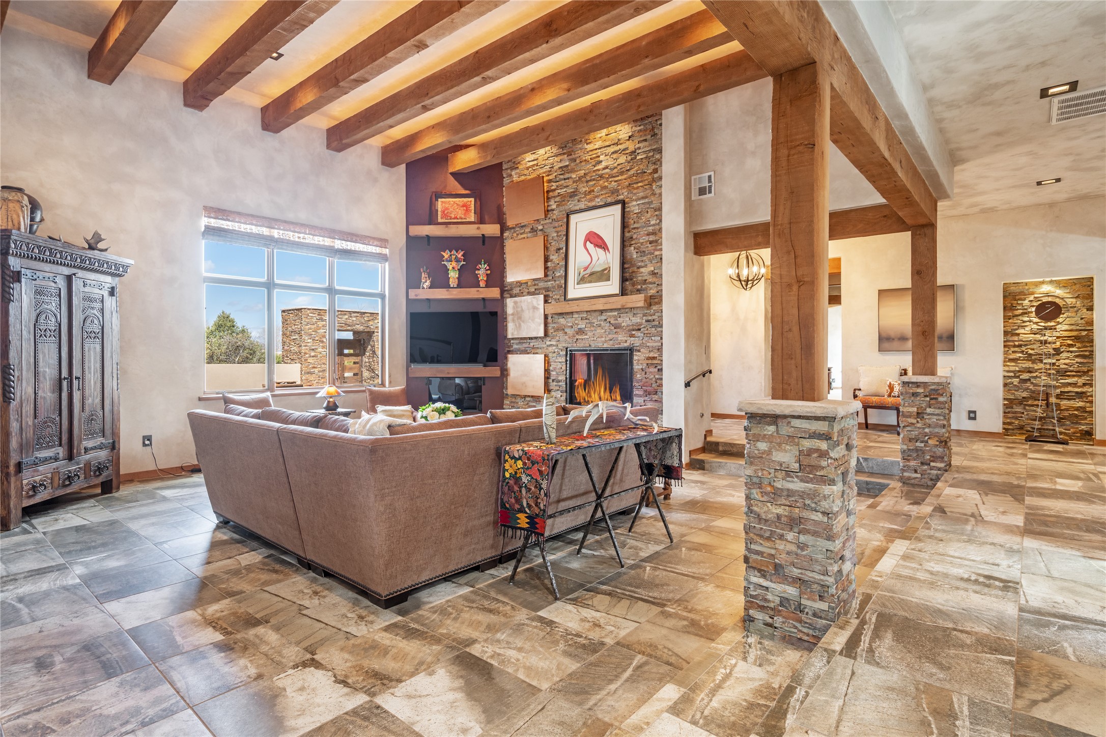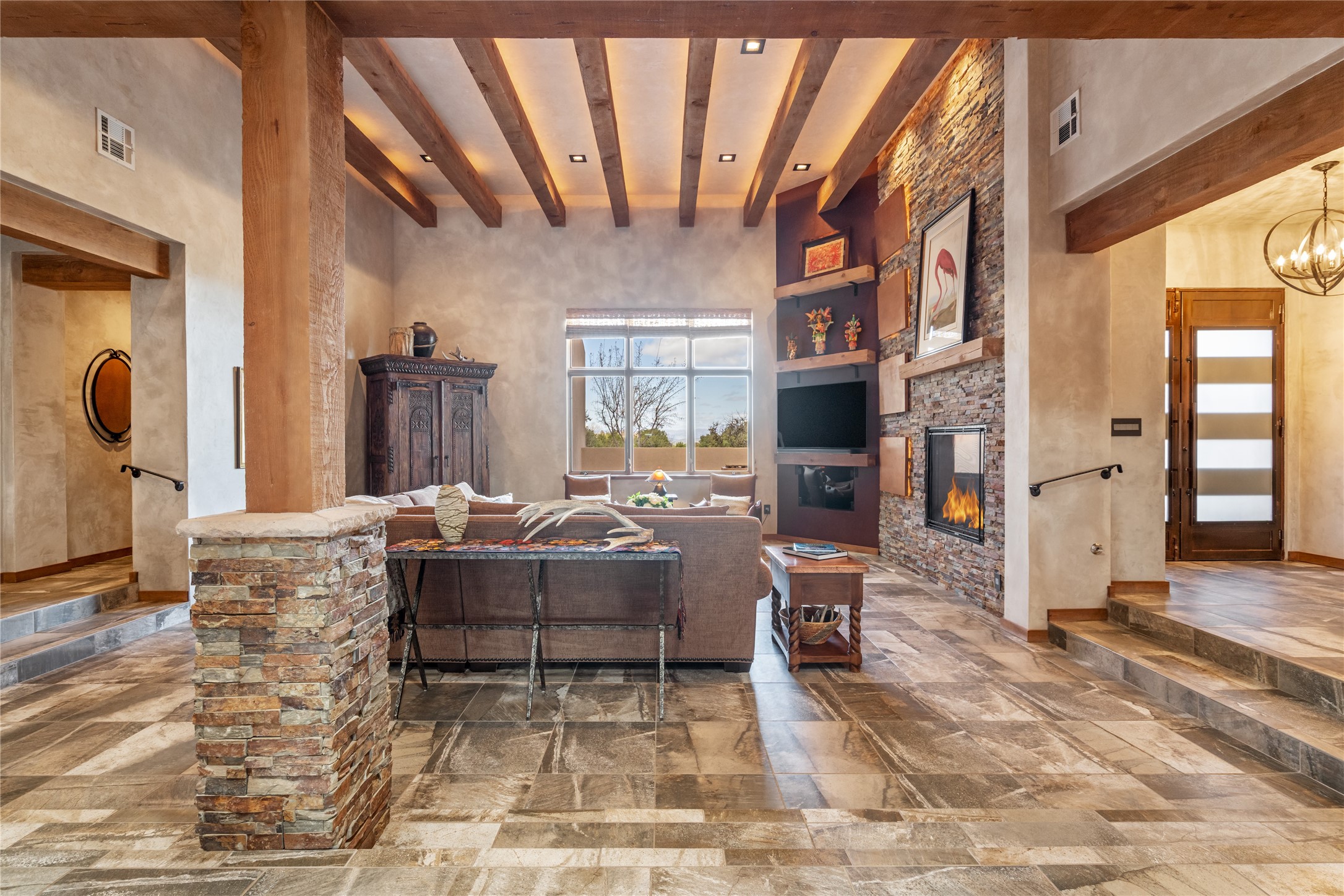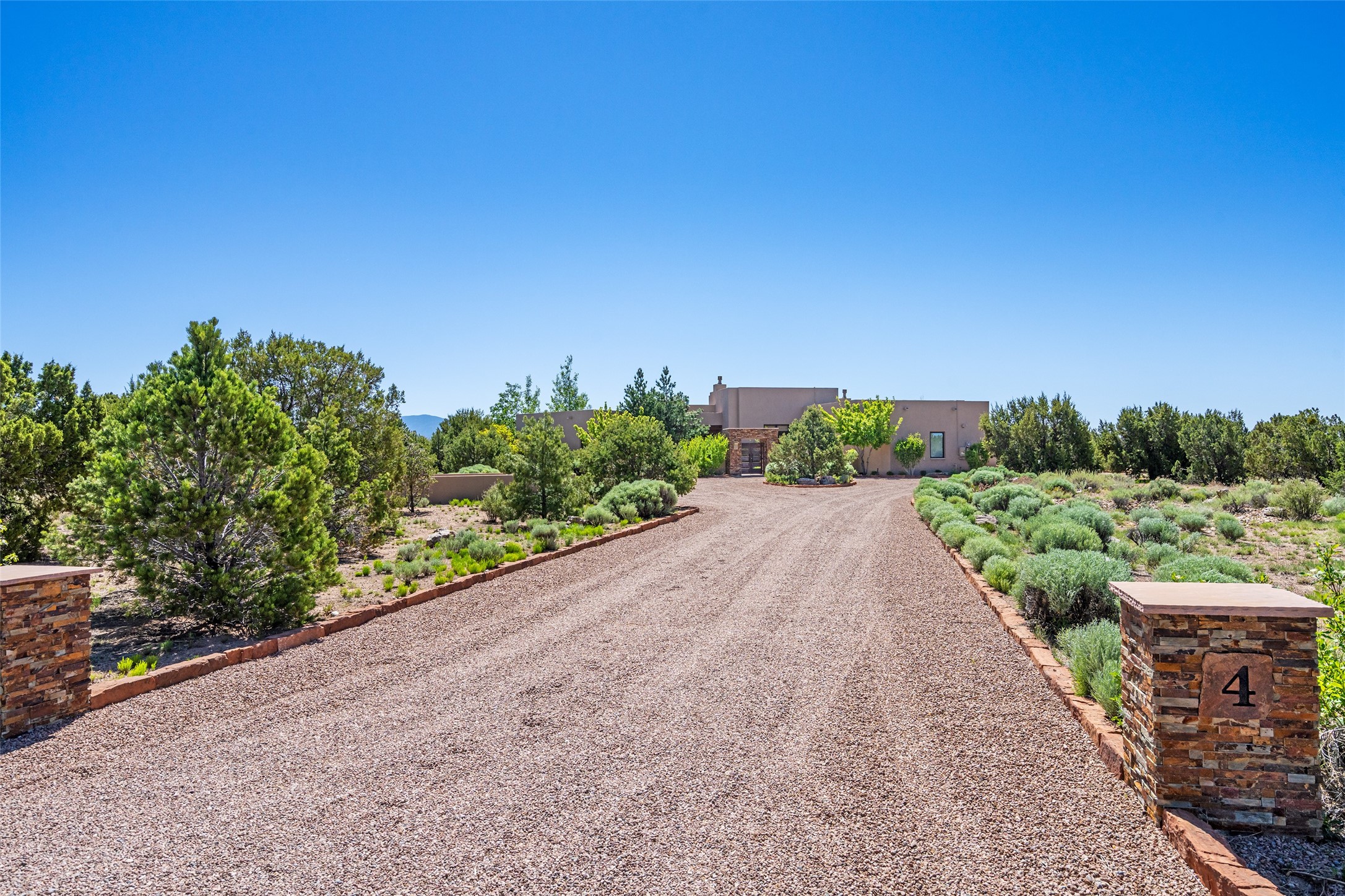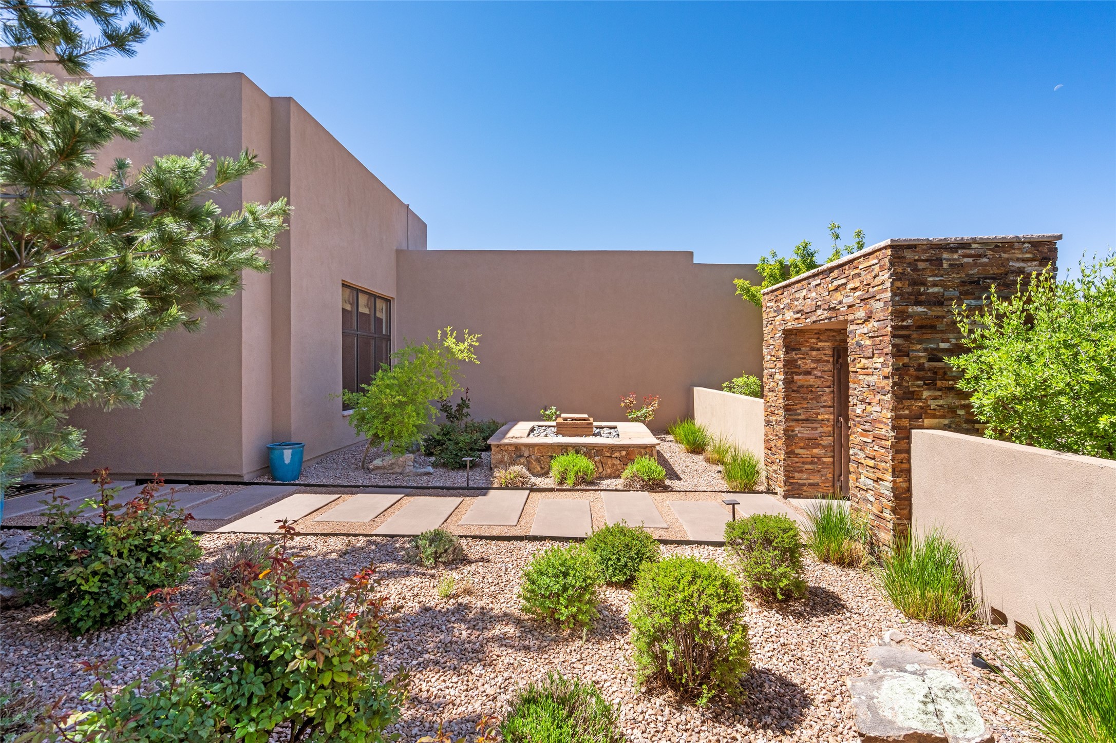 Embrace the beauty of contemporary Pueblo-style architecture in this exquisite 3-bedroom, 3.5-bath home, thoughtfully designed with sophisticated finishes throughout. Nestled on 1.8 acres, this stunning residence is perfectly positioned for privacy and tranquility, offering elegant indoor and outdoor living spaces with Jemez Mountain views.A private entry courtyard with a serene stone water feature sets the tone for the refined interiors. At the heart of the home, the grand chef's kitchen boasts top-tier appliances, custom cabinetry, and an inviting layout ideal for entertaining. The generous primary suite is a true retreat, featuring a cozy gas fireplace, two walk-in closets, office space, a spa-inspired bath, and private portal. The guest wing contains two spacious guest rooms, each with an ensuite bath, providing exceptional comfort and privacy. A large office/den with a separate entrance and its own portal offers the perfect space for work or creative pursuitsOutdoor living is just as inviting, with a spacious rear portal with a large fireplace, built-in gas grill, a second water feature, and plenty of space for dining al fresco while taking in the tranquil surroundings. A three-car direct-entry garage adds to the exceptional features of this property. This home seamlessly blends timeless Southwestern charm with modern sophistication -- an unparalleled sanctuary just waiting to be enjoyed.