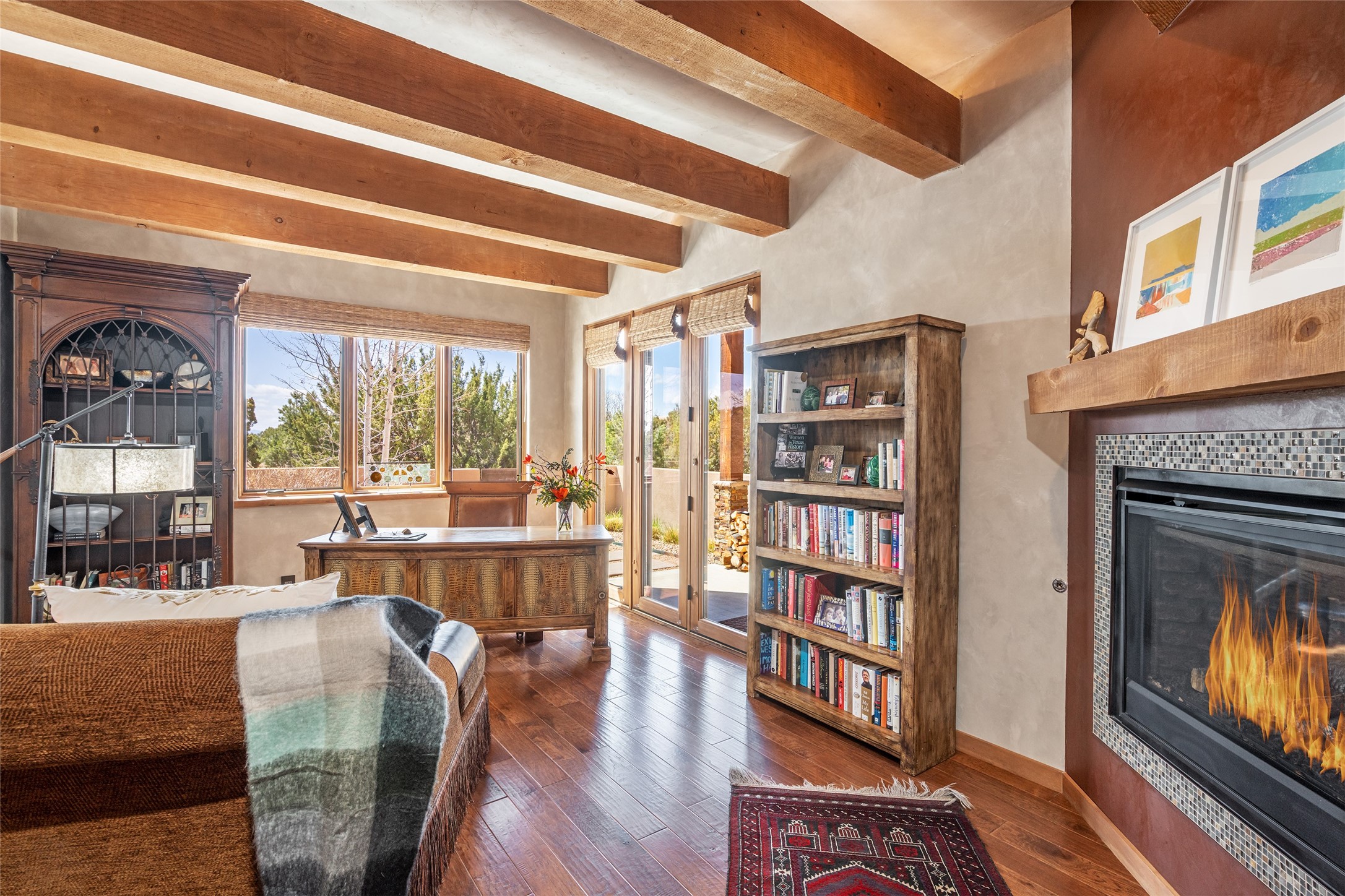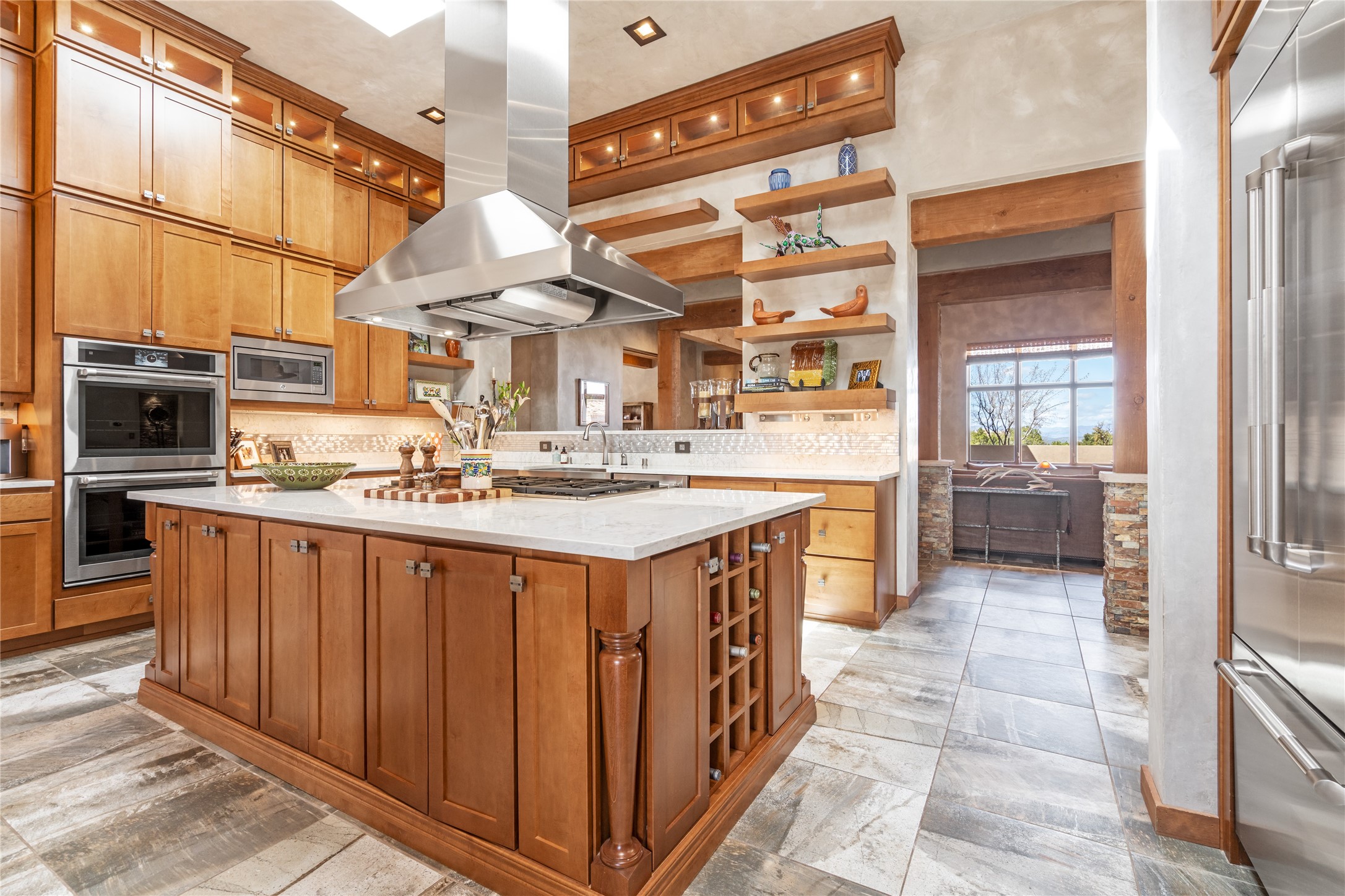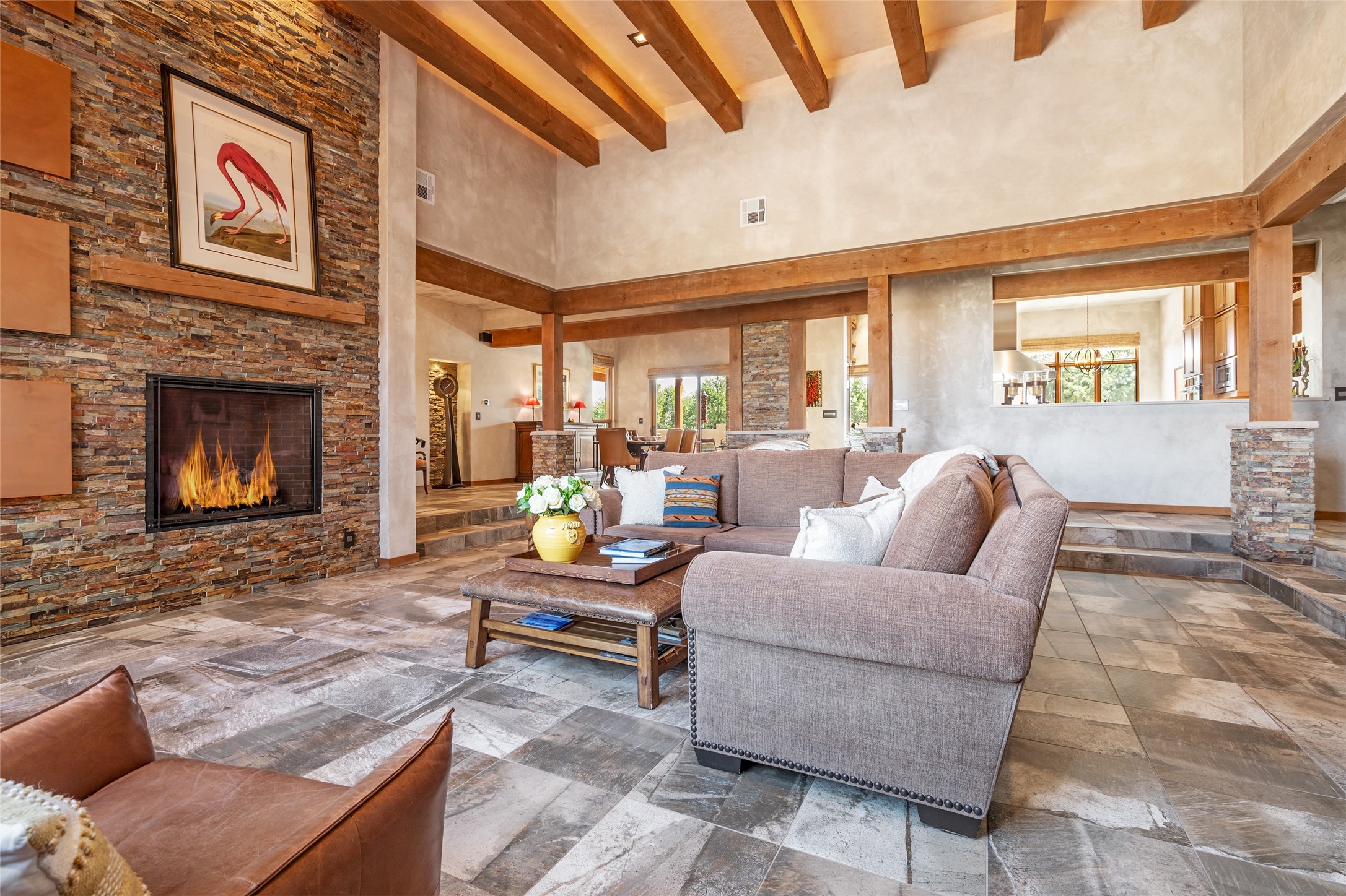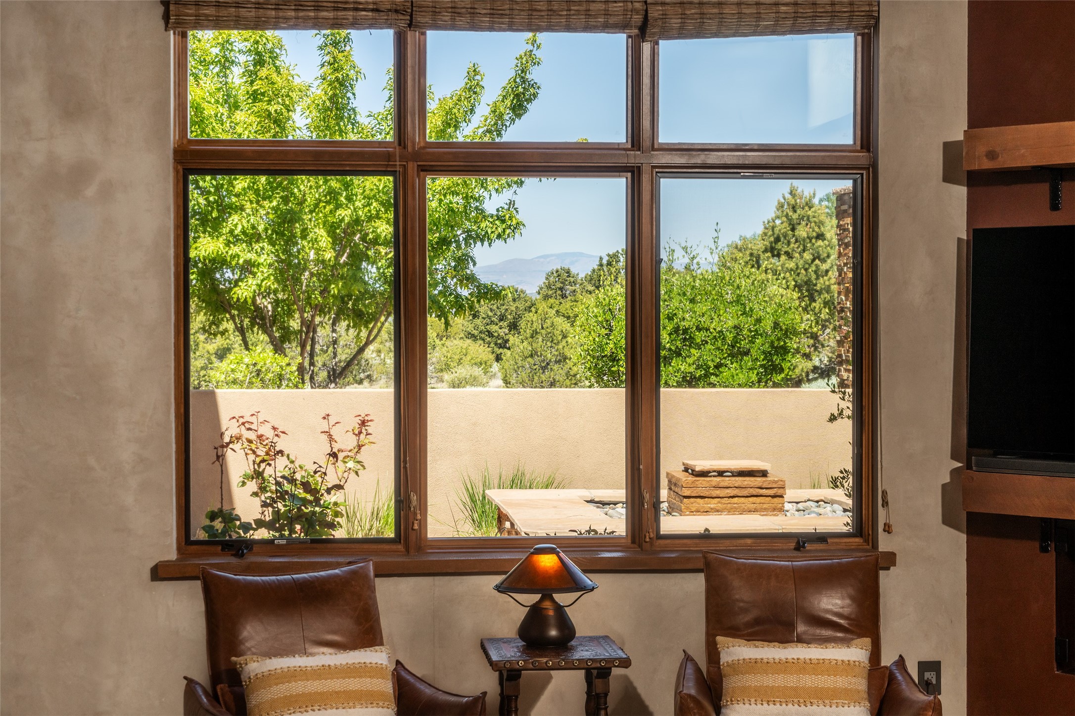 Embrace the beauty of contemporary Pueblo-style architecture in this exquisite 3-bedroom, 3.5-bath home, thoughtfully designed with sophisticated finishes throughout. Nestled on 1.8 acres, this stunning residence is perfectly positioned for privacy and tranquility, offering elegant indoor and outdoor living spaces with Jemez Mountain views.A private entry courtyard with a serene stone water feature sets the tone for the refined interiors. At the heart of the home, the grand chef's kitchen boasts top-tier appliances, custom cabinetry, and an inviting layout ideal for entertaining. The generous primary suite is a true retreat, featuring a cozy gas fireplace, two walk-in closets, office space, a spa-inspired bath, and private portal. The guest wing contains two spacious guest rooms, each with an ensuite bath, providing exceptional comfort and privacy. A large office/den with a separate entrance and its own portal offers the perfect space for work or creative pursuitsOutdoor living is just as inviting, with a spacious rear portal with a large fireplace, built-in gas grill, a second water feature, and plenty of space for dining al fresco while taking in the tranquil surroundings. A three-car direct-entry garage adds to the exceptional features of this property. This home seamlessly blends timeless Southwestern charm with modern sophistication -- an unparalleled sanctuary just waiting to be enjoyed.