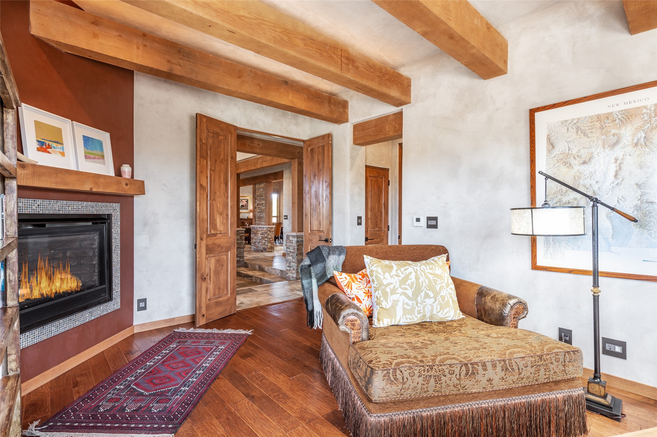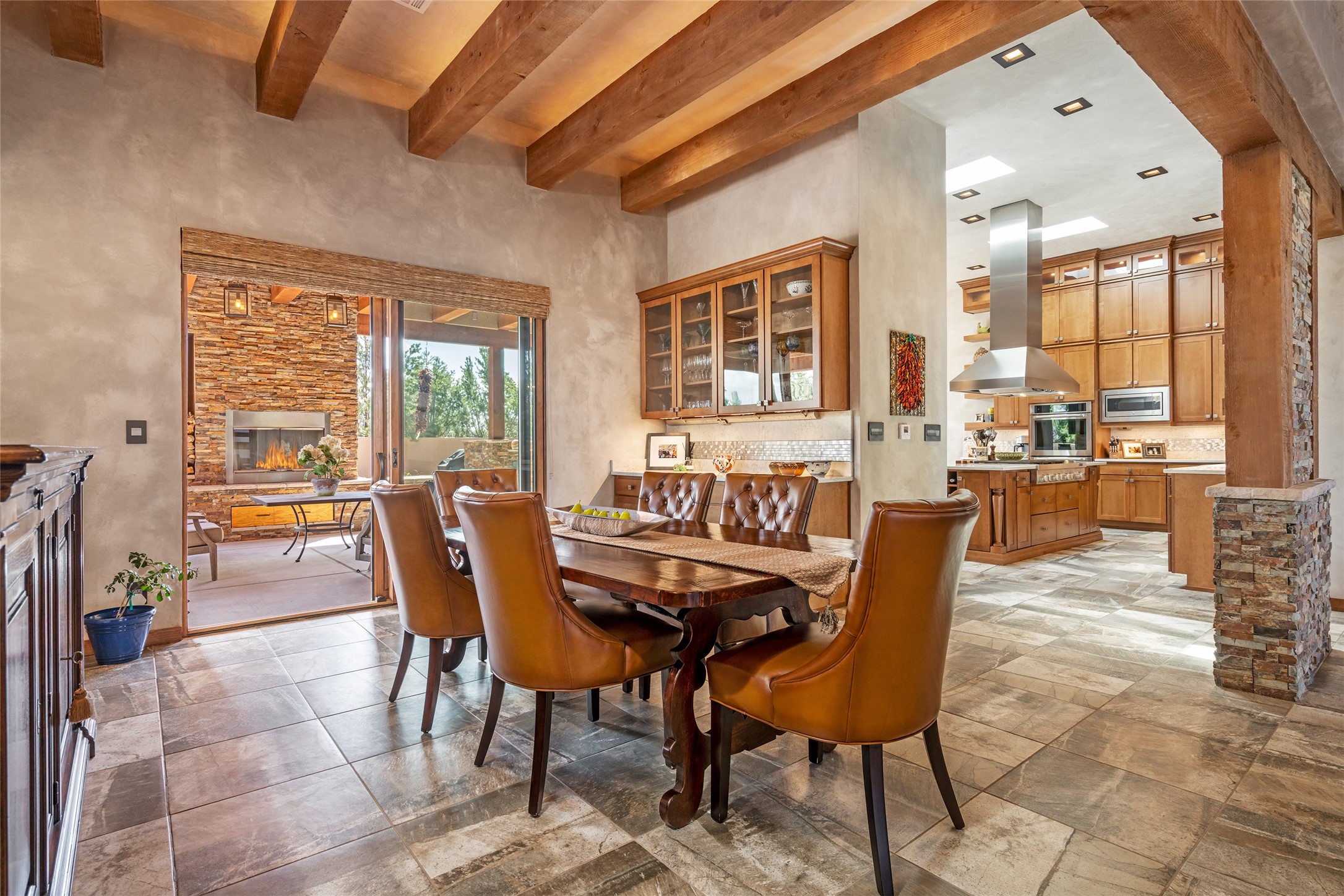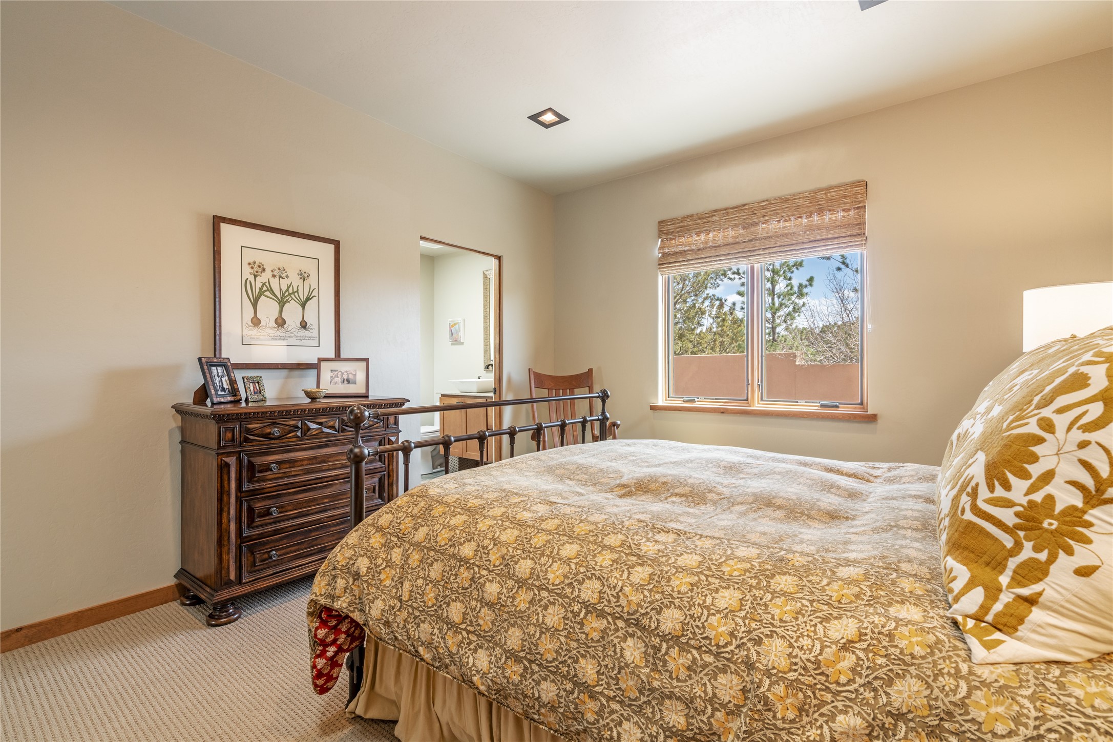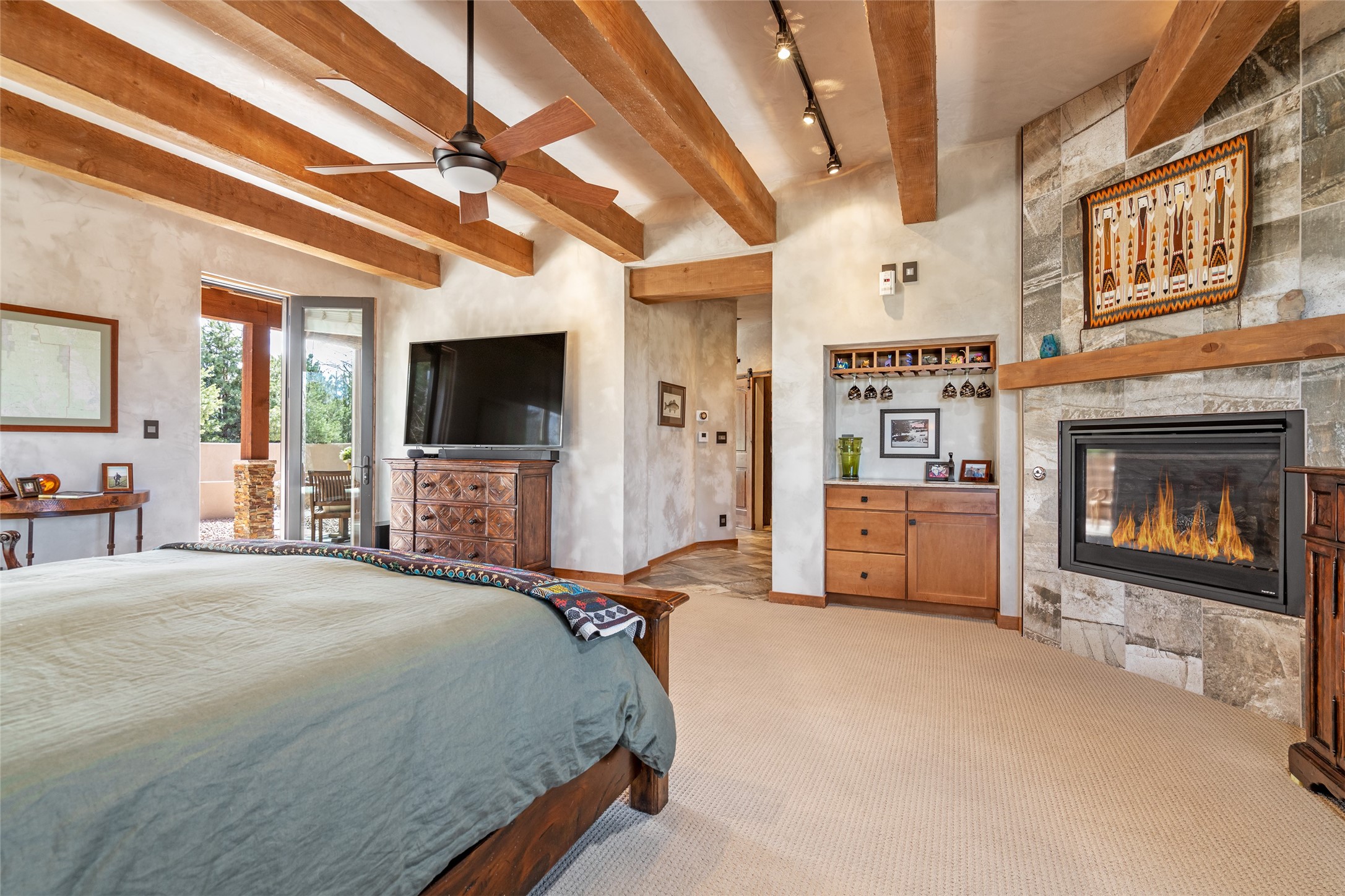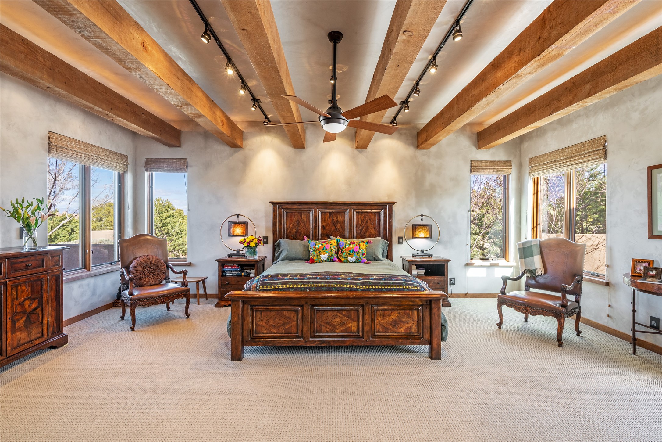 Embrace the beauty of contemporary Pueblo-style architecture in this exquisite 3-bedroom, 3.5-bath home, thoughtfully designed with sophisticated finishes throughout. Nestled on 1.8 acres, this stunning residence is perfectly positioned for privacy and tranquility, offering elegant indoor and outdoor living spaces with Jemez Mountain views.A private entry courtyard with a serene stone water feature sets the tone for the refined interiors. At the heart of the home, the grand chef's kitchen boasts top-tier appliances, custom cabinetry, and an inviting layout ideal for entertaining. The generous primary suite is a true retreat, featuring a cozy gas fireplace, two walk-in closets, office space, a spa-inspired bath, and private portal. The guest wing contains two spacious guest rooms, each with an ensuite bath, providing exceptional comfort and privacy. A large office/den with a separate entrance and its own portal offers the perfect space for work or creative pursuitsOutdoor living is just as inviting, with a spacious rear portal with a large fireplace, built-in gas grill, a second water feature, and plenty of space for dining al fresco while taking in the tranquil surroundings. A three-car direct-entry garage adds to the exceptional features of this property. This home seamlessly blends timeless Southwestern charm with modern sophistication -- an unparalleled sanctuary just waiting to be enjoyed.