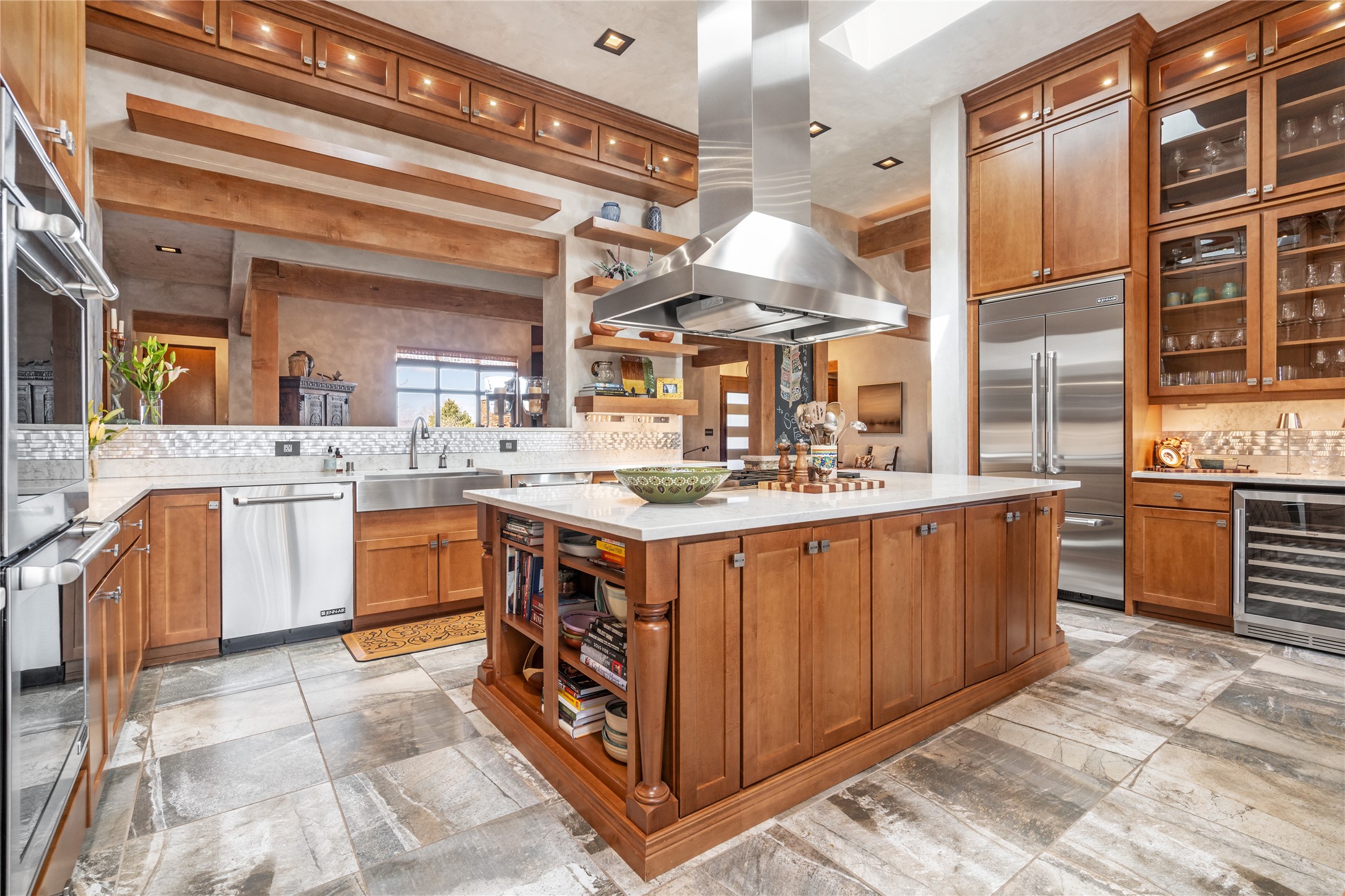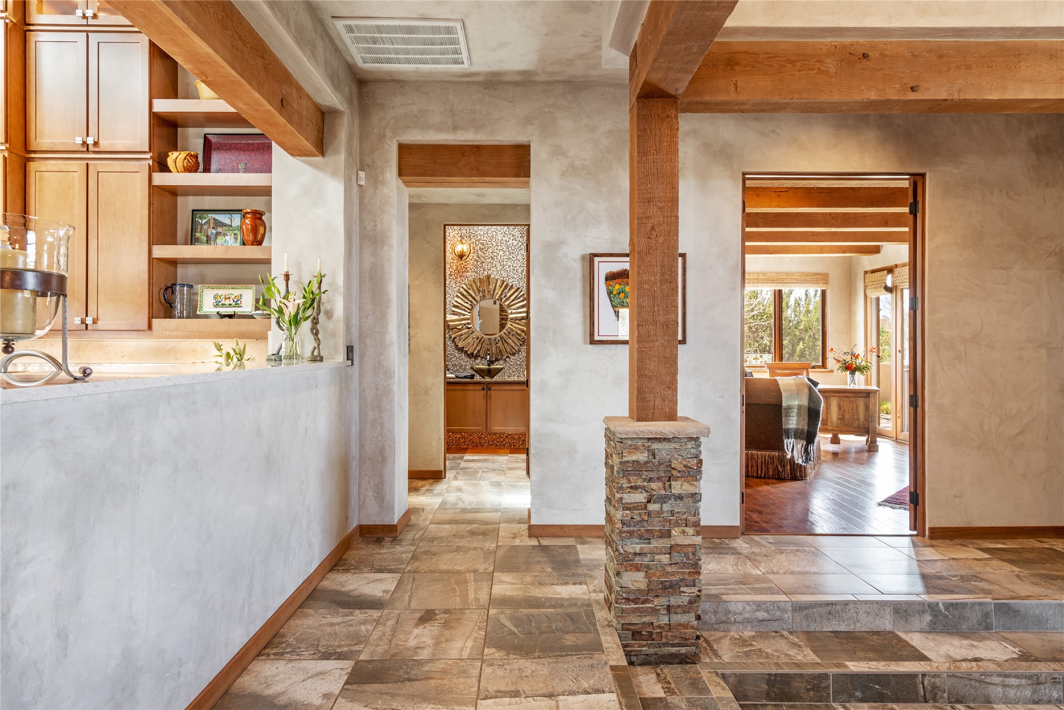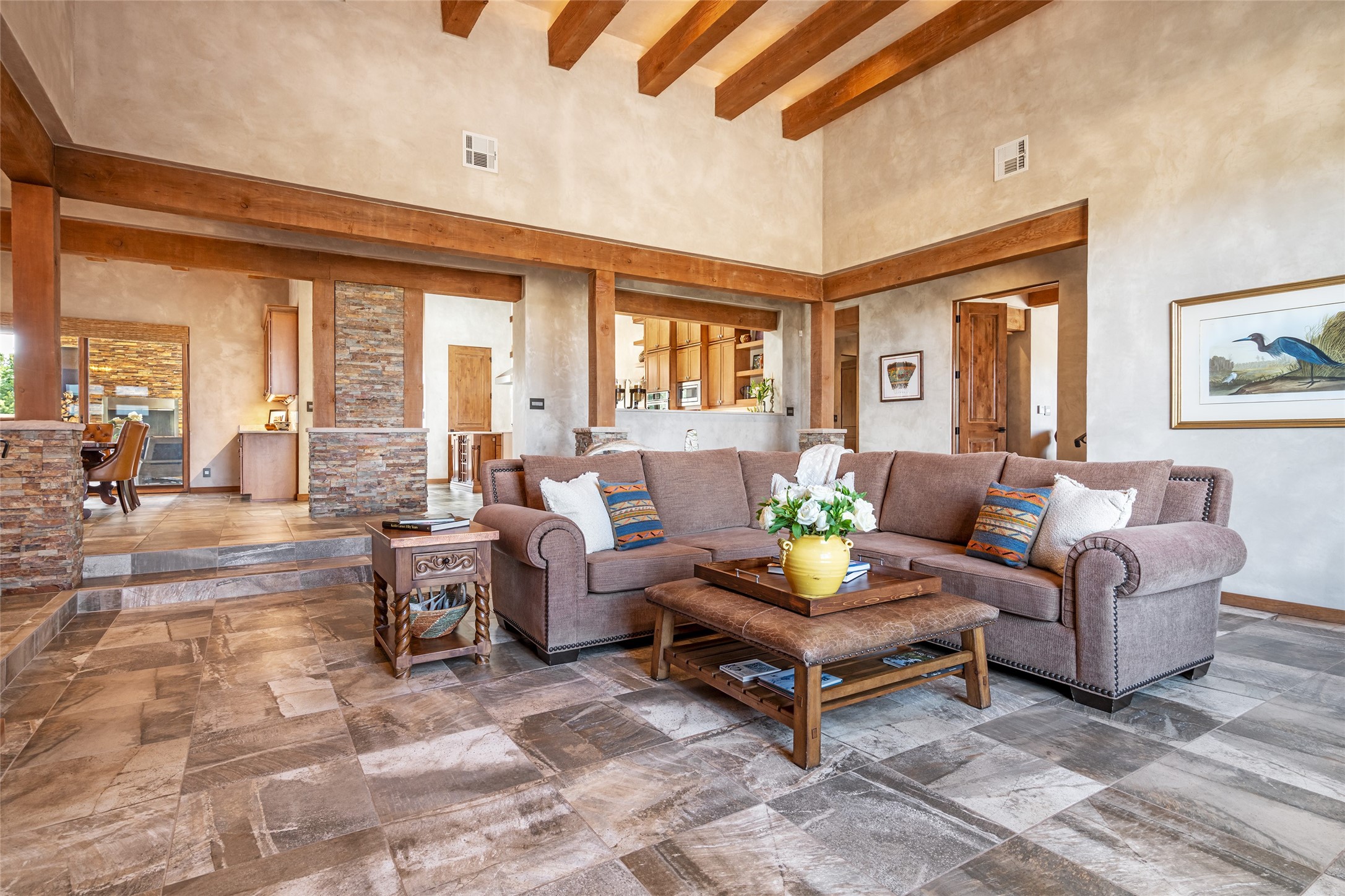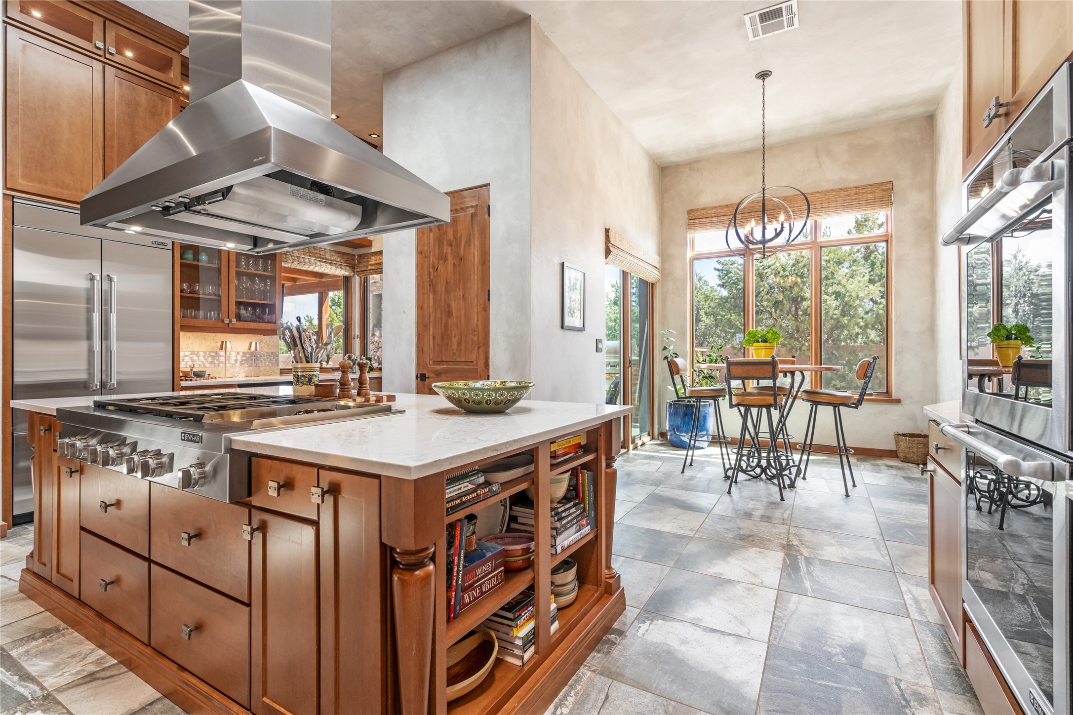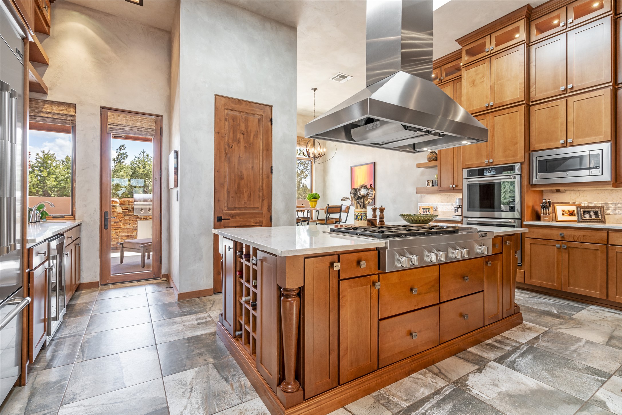 Embrace the beauty of contemporary Pueblo-style architecture in this exquisite 3-bedroom, 3.5-bath home, thoughtfully designed with sophisticated finishes throughout. Nestled on 1.8 acres, this stunning residence is perfectly positioned for privacy and tranquility, offering elegant indoor and outdoor living spaces with Jemez Mountain views.A private entry courtyard with a serene stone water feature sets the tone for the refined interiors. At the heart of the home, the grand chef's kitchen boasts top-tier appliances, custom cabinetry, and an inviting layout ideal for entertaining. The generous primary suite is a true retreat, featuring a cozy gas fireplace, two walk-in closets, office space, a spa-inspired bath, and private portal. The guest wing contains two spacious guest rooms, each with an ensuite bath, providing exceptional comfort and privacy. A large office/den with a separate entrance and its own portal offers the perfect space for work or creative pursuitsOutdoor living is just as inviting, with a spacious rear portal with a large fireplace, built-in gas grill, a second water feature, and plenty of space for dining al fresco while taking in the tranquil surroundings. A three-car direct-entry garage adds to the exceptional features of this property. This home seamlessly blends timeless Southwestern charm with modern sophistication -- an unparalleled sanctuary just waiting to be enjoyed.