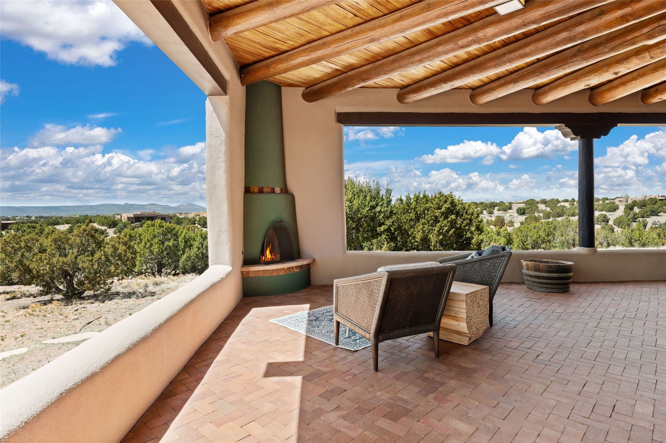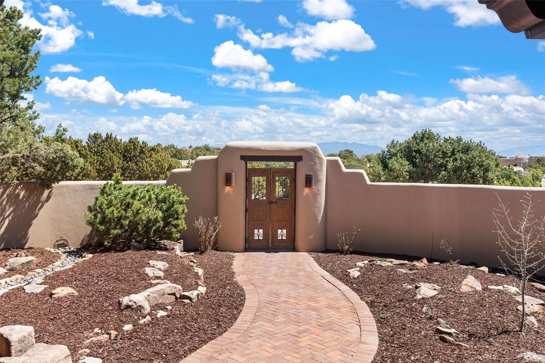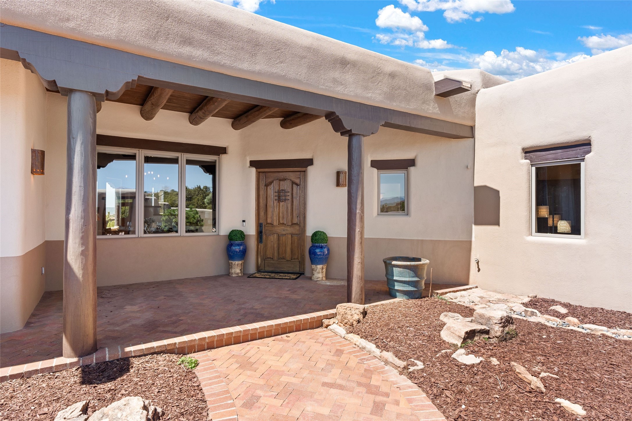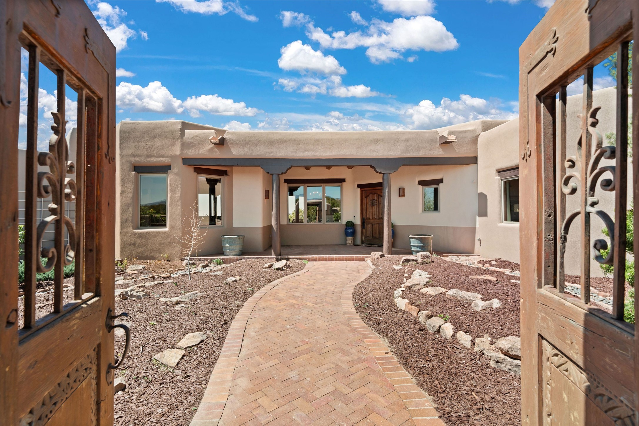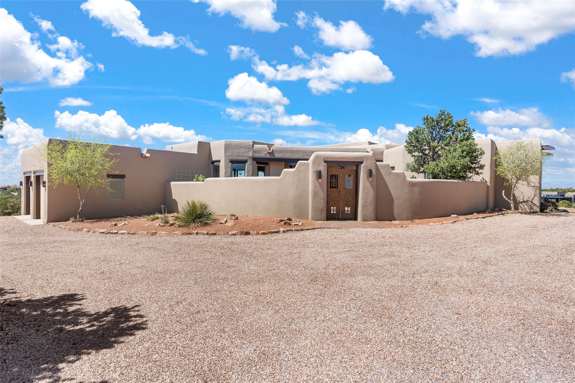 Tucked away on over 5 private acres just south of Las Campanas Drive, this distinctive Santa Fe-style home blends timeless design with sweeping 360-degree mountain views--from the Sangre de Cristo to the Jemez, Sandia, and Ortiz ranges. Built by master craftsman Don Wiles using pumice-crete construction, this 3-bedroom, 3-bath retreat delivers beauty, efficiency, and soul. A gated courtyard and 200 sq ft portal welcome you into a space designed for both comfort and connection to the outdoors. The sunlit living room offers panoramic views, a kiva fireplace, and access to a 1,200 sq ft wraparound portal--complete with a second fireplace for enjoying unforgettable sunsets year-round. The kitchen is both warm and functional, featuring alder cabinetry, a 6-burner Dacor range, separate wall oven, GE Profile fridge, microwave, walk-in pantry, and a cozy breakfast nook framed by bay windows. Throughout the home, plaster walls, ceramic tile floors, and coved ceilings create a soft, organic feel. The spacious primary suite includes double vanities, a generous closet, and a private redwood sauna. Two guest rooms--one ideal as a home office--are served by modern comforts like six Daikin mini-splits (installed in 2019), radiant heat with Wirsbo piping, and built-in speakers in key living areas. Outside, a raised bed garden adds a splash of green to the landscape, while the home's thoughtful layout invites indoor-outdoor living at every turn. Peaceful, energy-efficient, and just minutes from town, this one-of-a-kind property offers the best of Santa Fe living--with the views and quiet to prove it.
