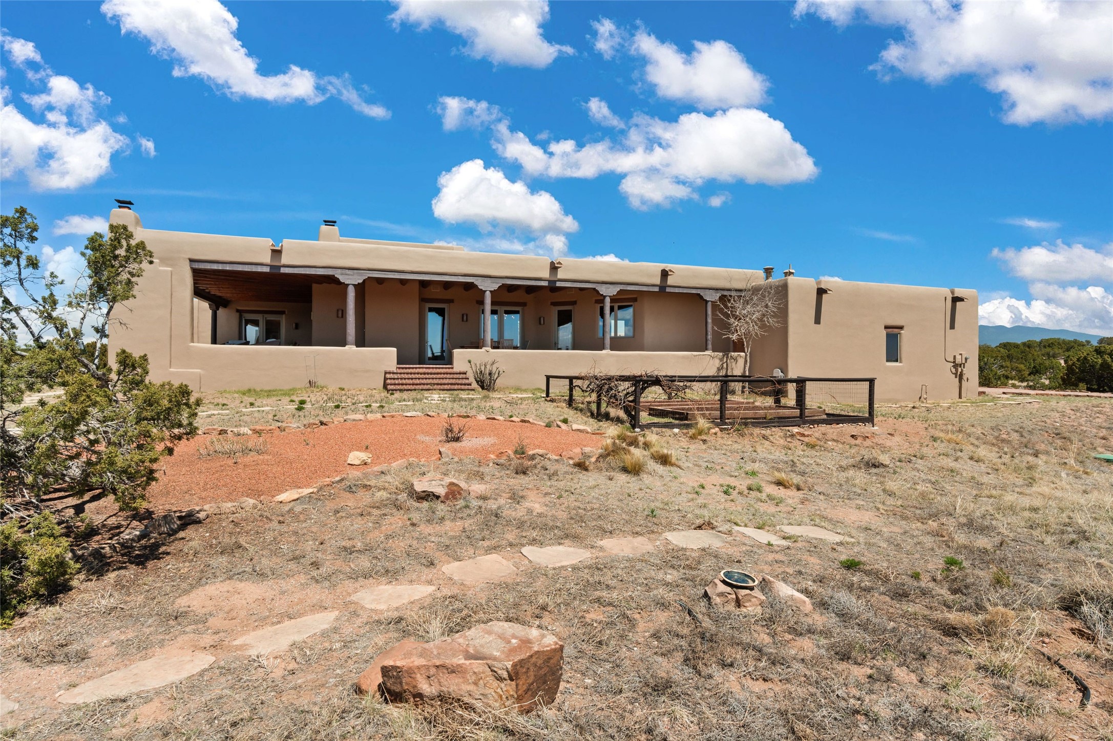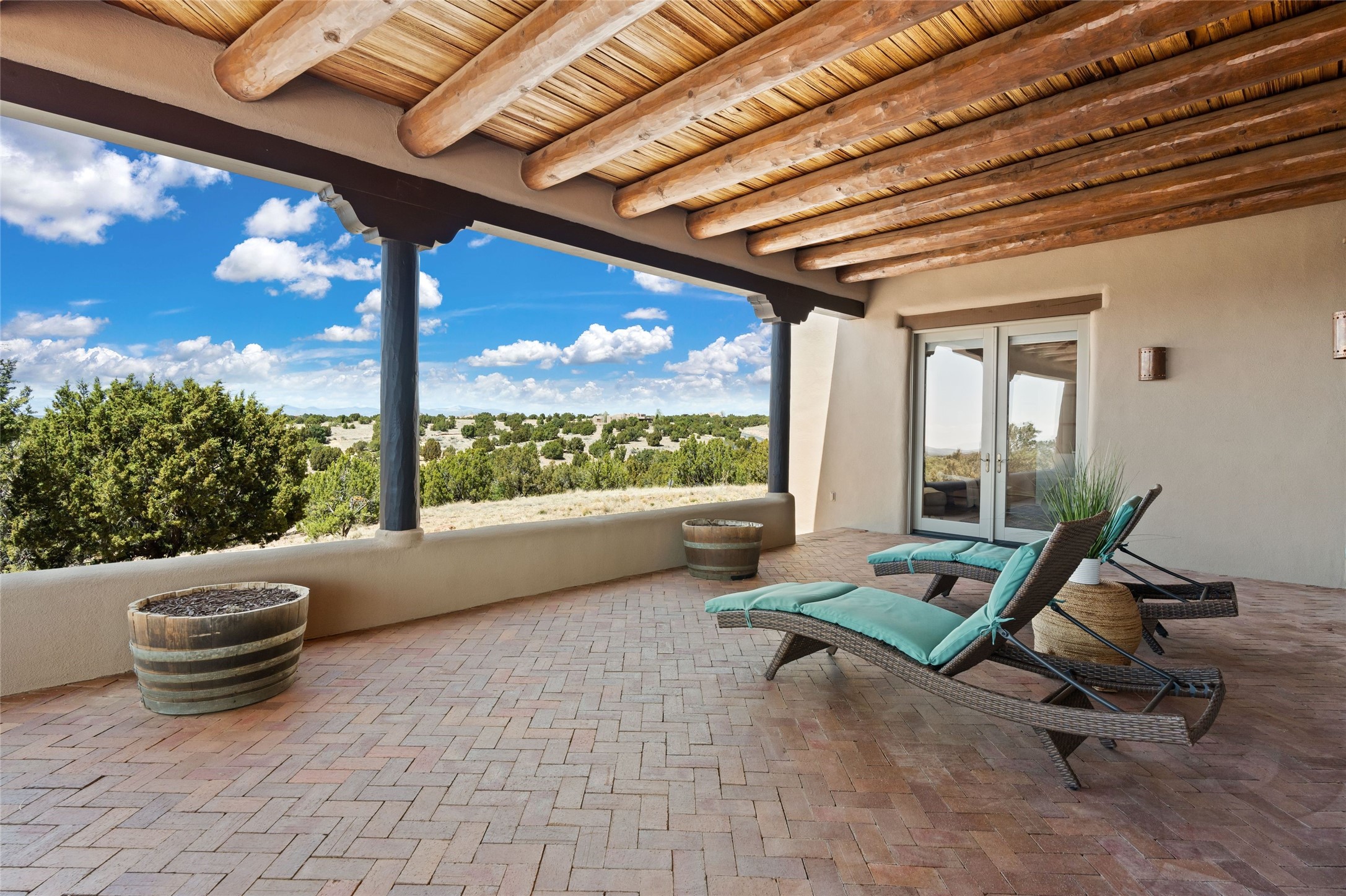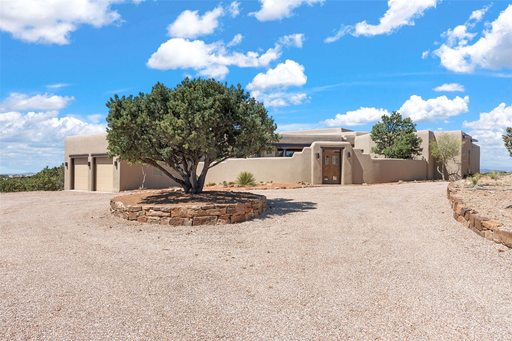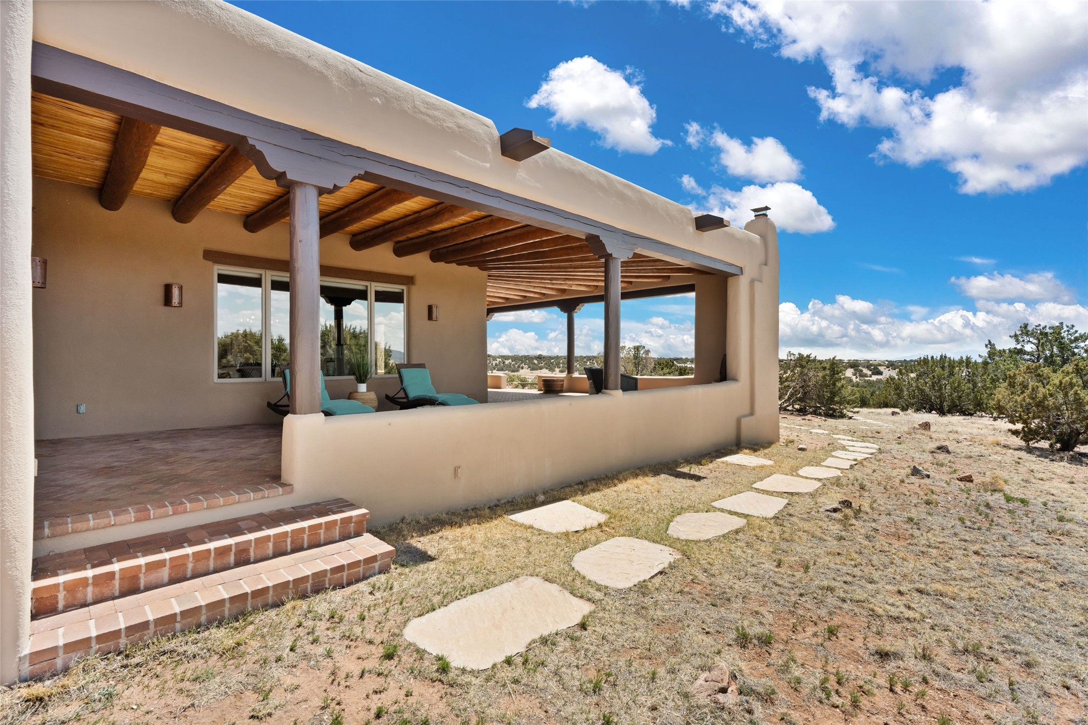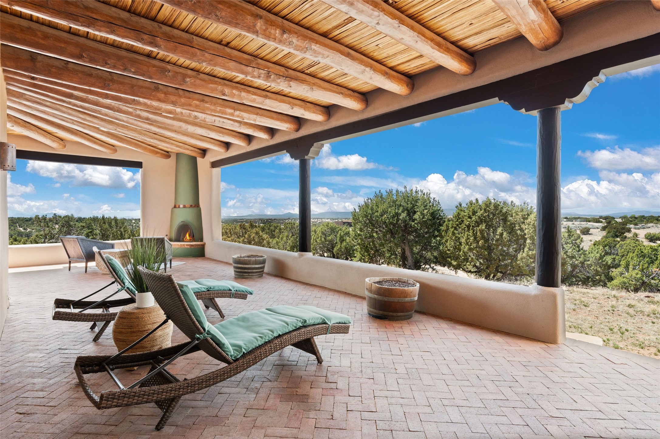 Tucked away on over 5 private acres just south of Las Campanas Drive, this distinctive Santa Fe-style home blends timeless design with sweeping 360-degree mountain views--from the Sangre de Cristo to the Jemez, Sandia, and Ortiz ranges. Built by master craftsman Don Wiles using pumice-crete construction, this 3-bedroom, 3-bath retreat delivers beauty, efficiency, and soul. A gated courtyard and 200 sq ft portal welcome you into a space designed for both comfort and connection to the outdoors. The sunlit living room offers panoramic views, a kiva fireplace, and access to a 1,200 sq ft wraparound portal--complete with a second fireplace for enjoying unforgettable sunsets year-round. The kitchen is both warm and functional, featuring alder cabinetry, a 6-burner Dacor range, separate wall oven, GE Profile fridge, microwave, walk-in pantry, and a cozy breakfast nook framed by bay windows. Throughout the home, plaster walls, ceramic tile floors, and coved ceilings create a soft, organic feel. The spacious primary suite includes double vanities, a generous closet, and a private redwood sauna. Two guest rooms--one ideal as a home office--are served by modern comforts like six Daikin mini-splits (installed in 2019), radiant heat with Wirsbo piping, and built-in speakers in key living areas. Outside, a raised bed garden adds a splash of green to the landscape, while the home's thoughtful layout invites indoor-outdoor living at every turn. Peaceful, energy-efficient, and just minutes from town, this one-of-a-kind property offers the best of Santa Fe living--with the views and quiet to prove it.