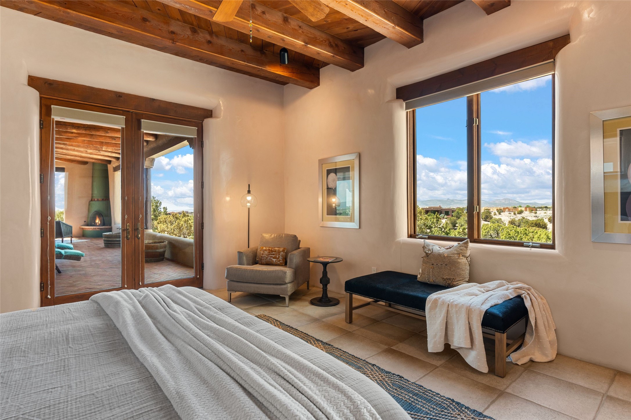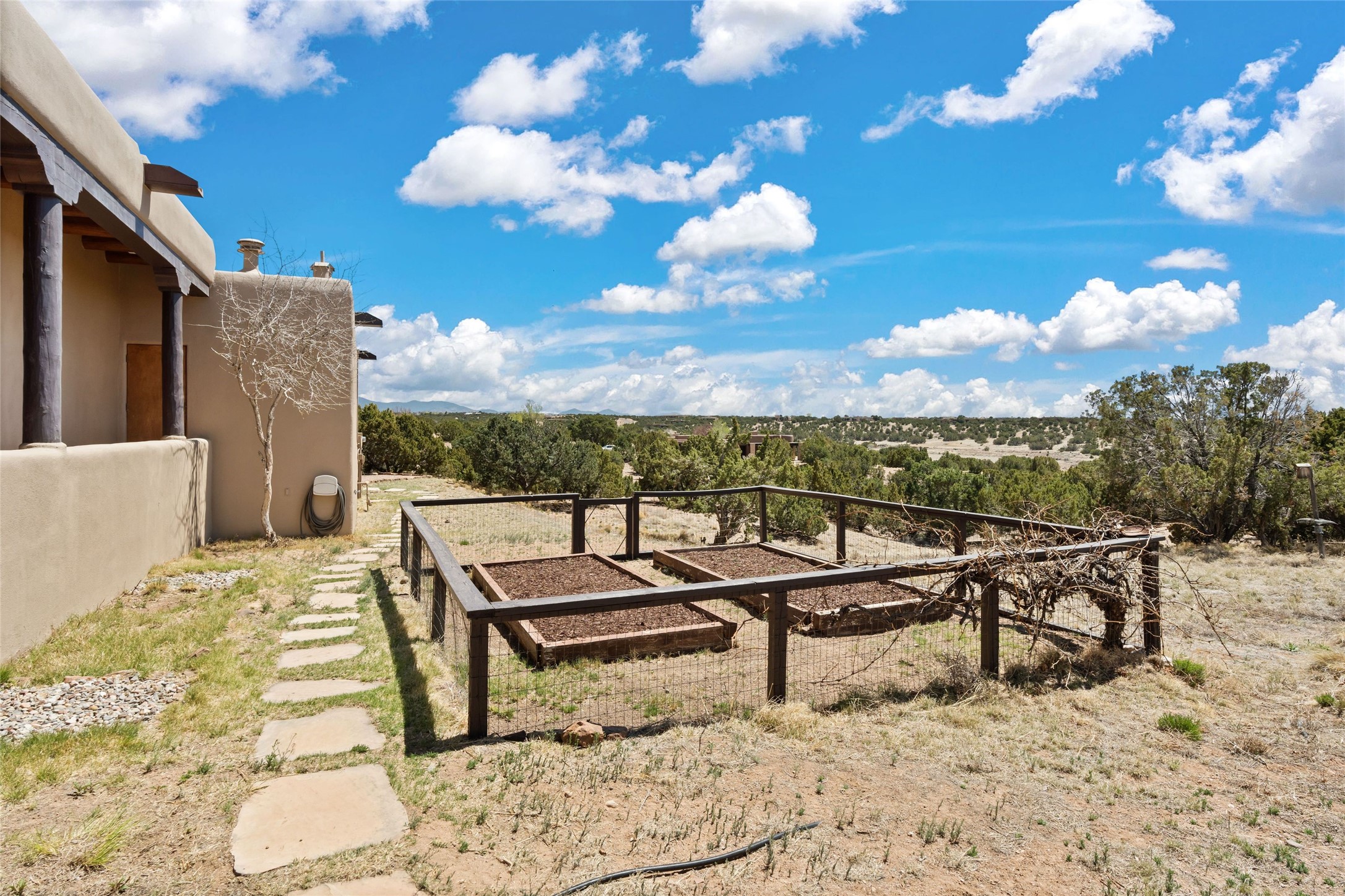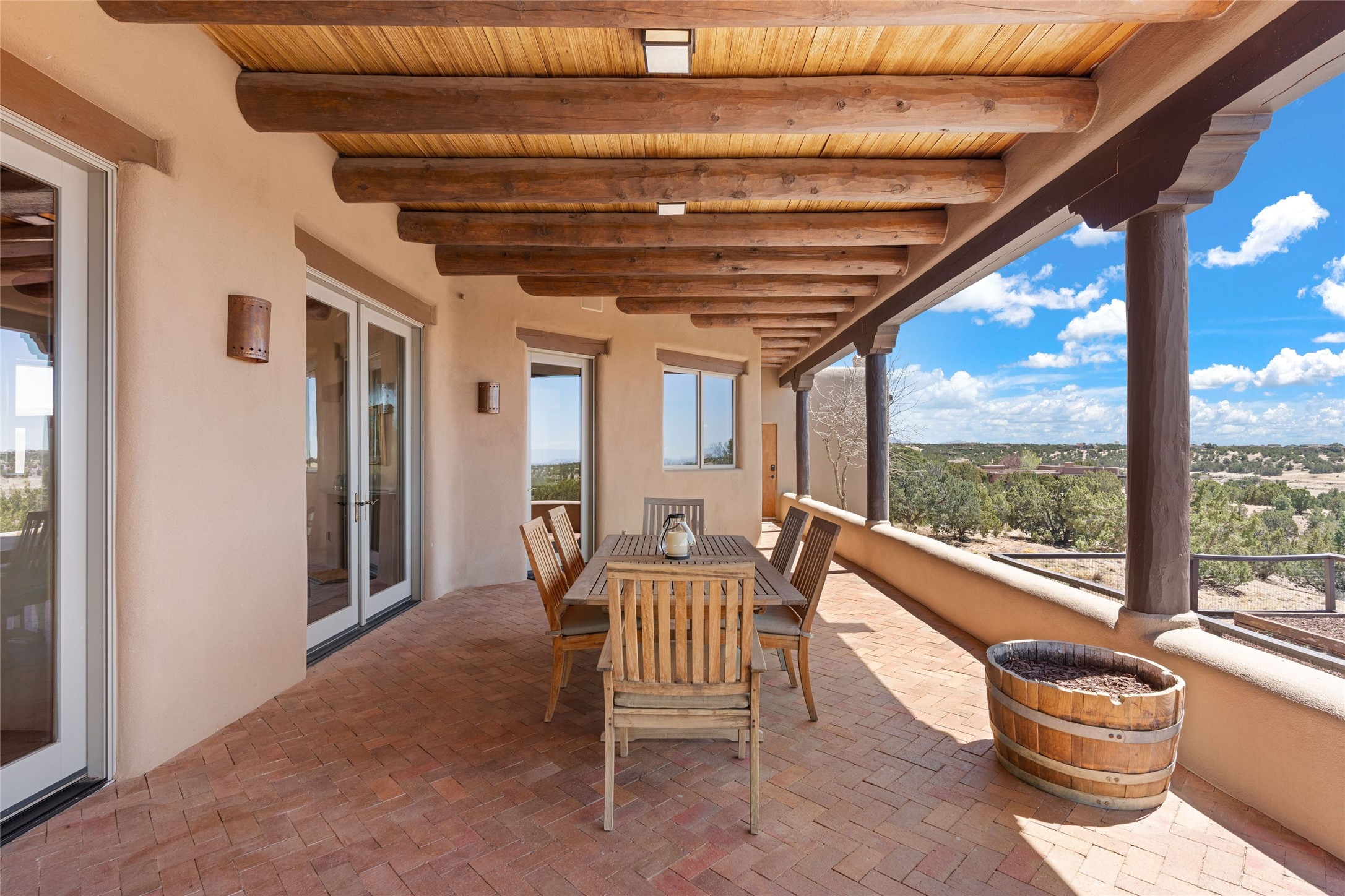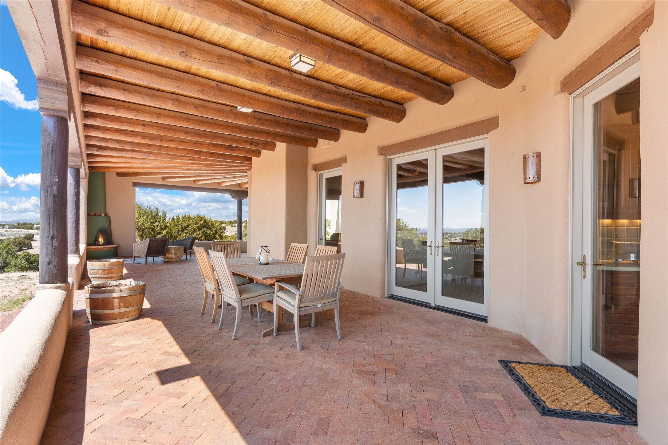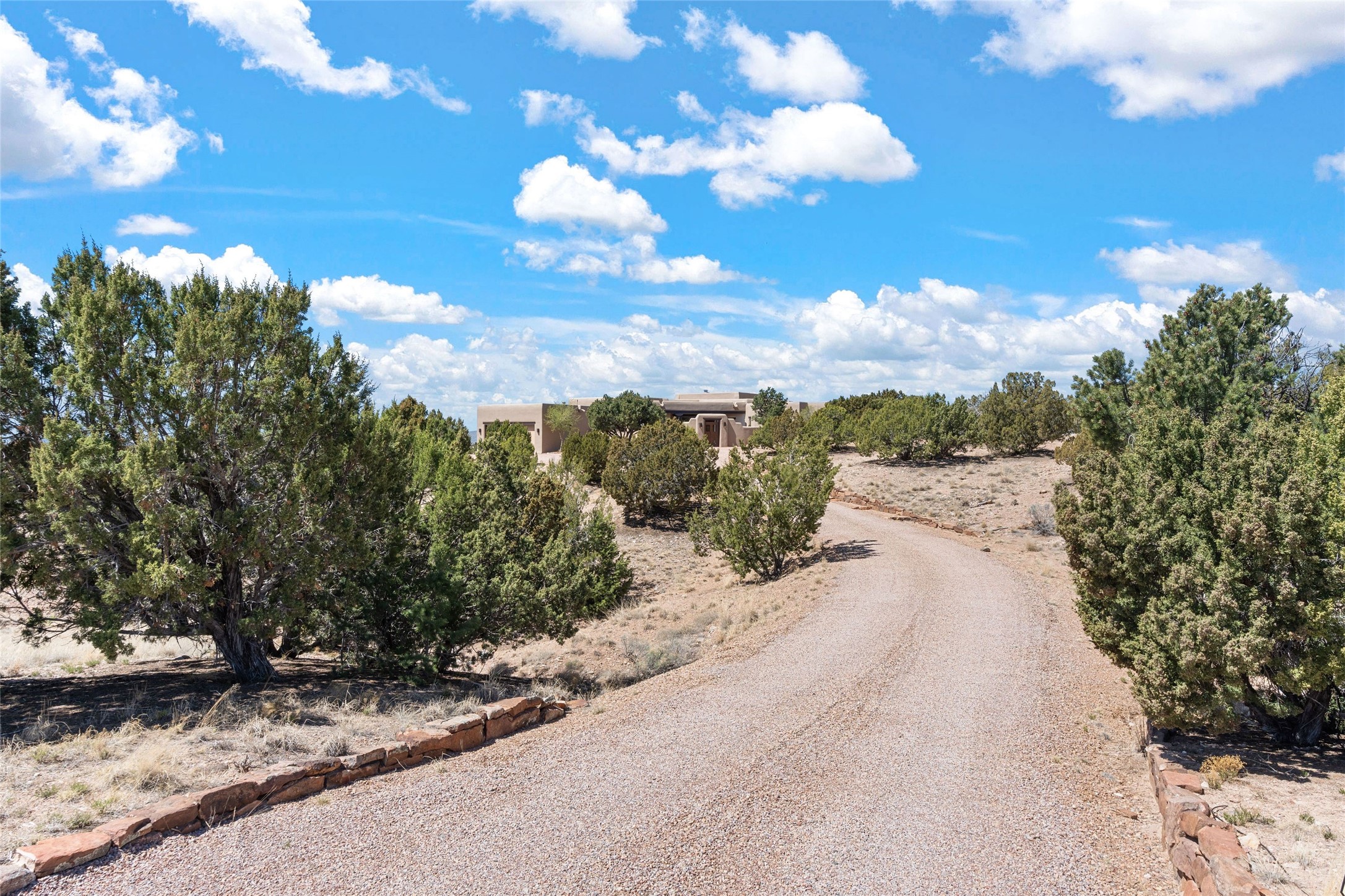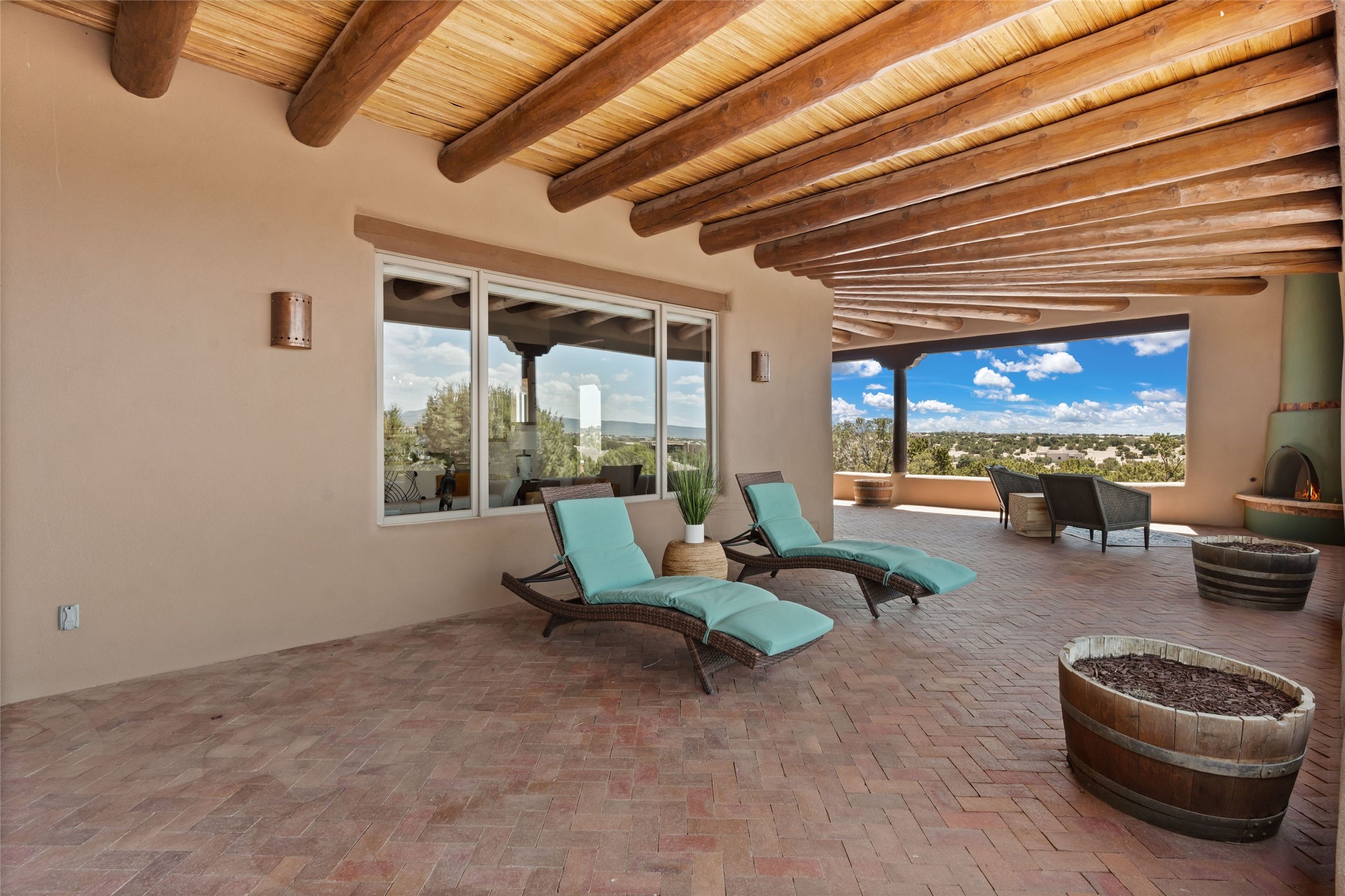 Tucked away on over 5 private acres just south of Las Campanas Drive, this distinctive Santa Fe-style home blends timeless design with sweeping 360-degree mountain views--from the Sangre de Cristo to the Jemez, Sandia, and Ortiz ranges. Built by master craftsman Don Wiles using pumice-crete construction, this 3-bedroom, 3-bath retreat delivers beauty, efficiency, and soul. A gated courtyard and 200 sq ft portal welcome you into a space designed for both comfort and connection to the outdoors. The sunlit living room offers panoramic views, a kiva fireplace, and access to a 1,200 sq ft wraparound portal--complete with a second fireplace for enjoying unforgettable sunsets year-round. The kitchen is both warm and functional, featuring alder cabinetry, a 6-burner Dacor range, separate wall oven, GE Profile fridge, microwave, walk-in pantry, and a cozy breakfast nook framed by bay windows. Throughout the home, plaster walls, ceramic tile floors, and coved ceilings create a soft, organic feel. The spacious primary suite includes double vanities, a generous closet, and a private redwood sauna. Two guest rooms--one ideal as a home office--are served by modern comforts like six Daikin mini-splits (installed in 2019), radiant heat with Wirsbo piping, and built-in speakers in key living areas. Outside, a raised bed garden adds a splash of green to the landscape, while the home's thoughtful layout invites indoor-outdoor living at every turn. Peaceful, energy-efficient, and just minutes from town, this one-of-a-kind property offers the best of Santa Fe living--with the views and quiet to prove it.