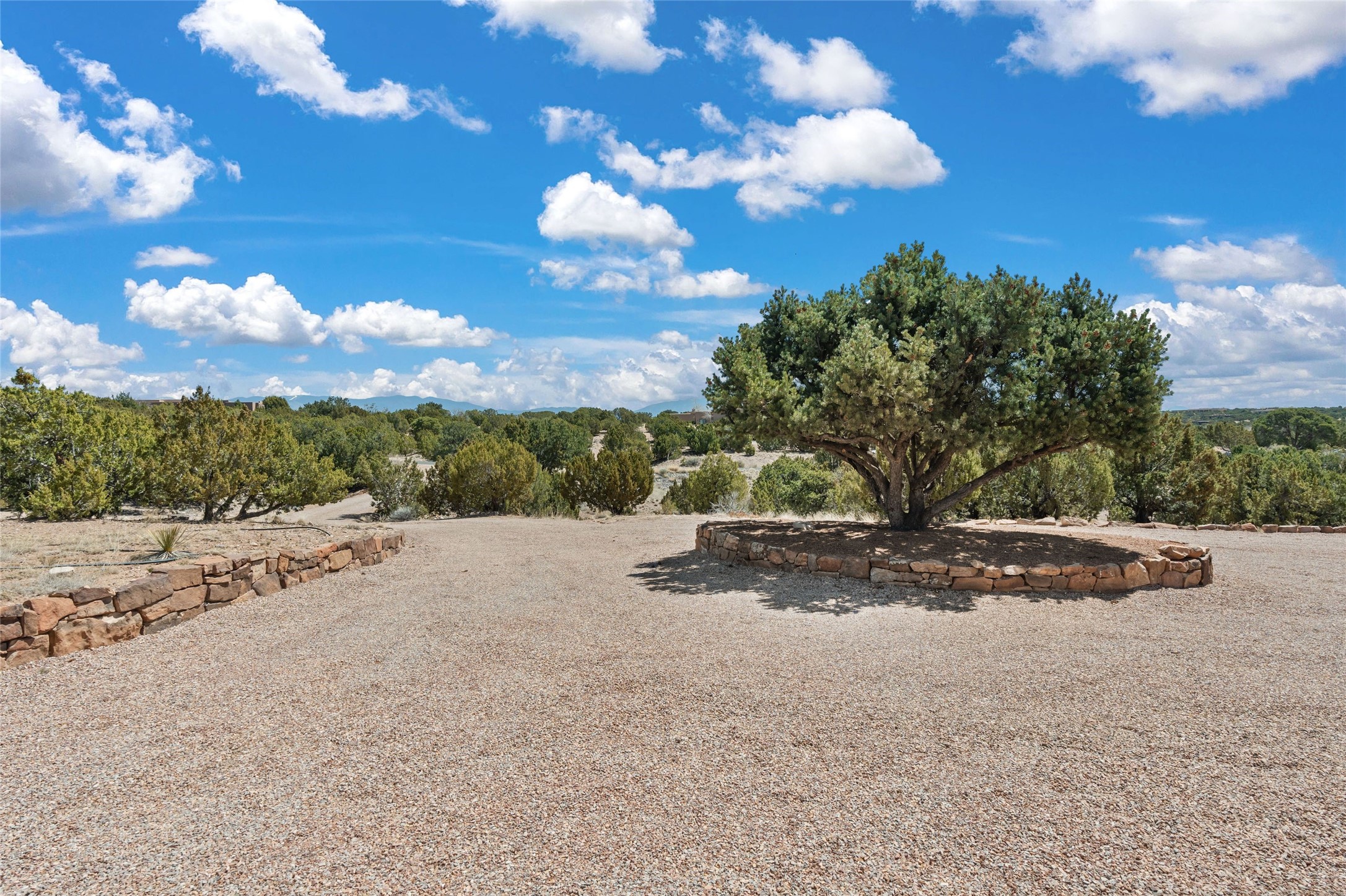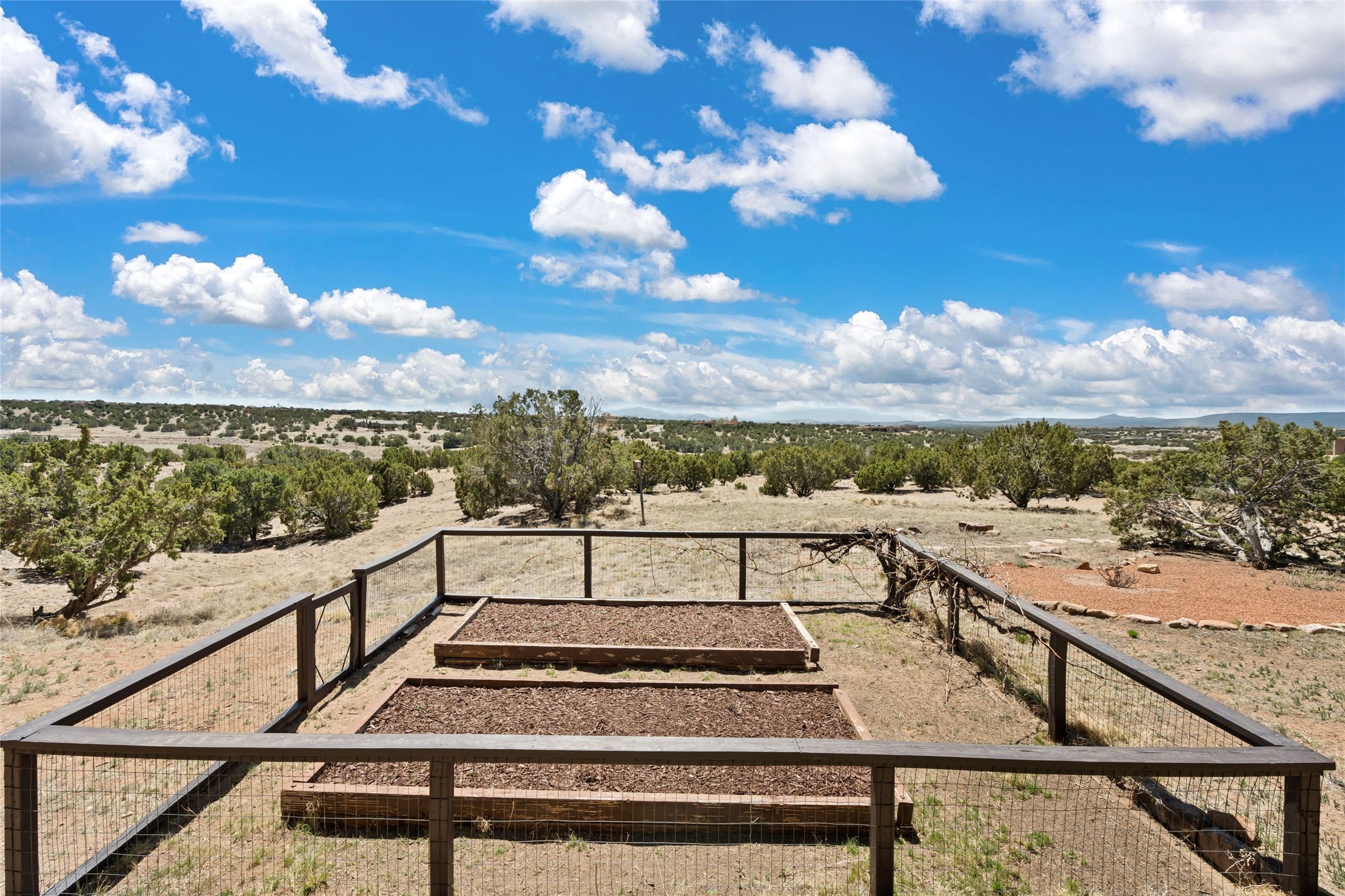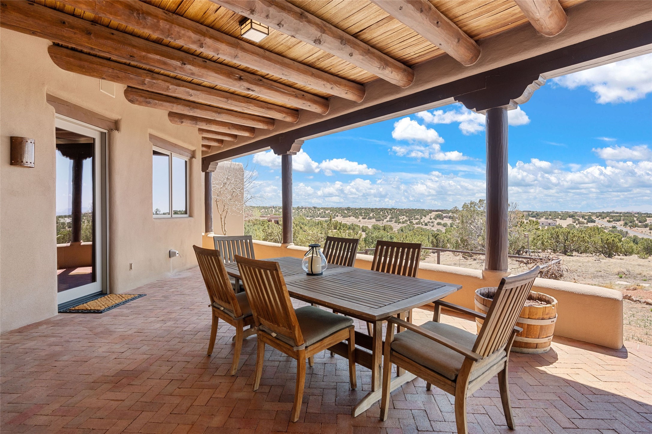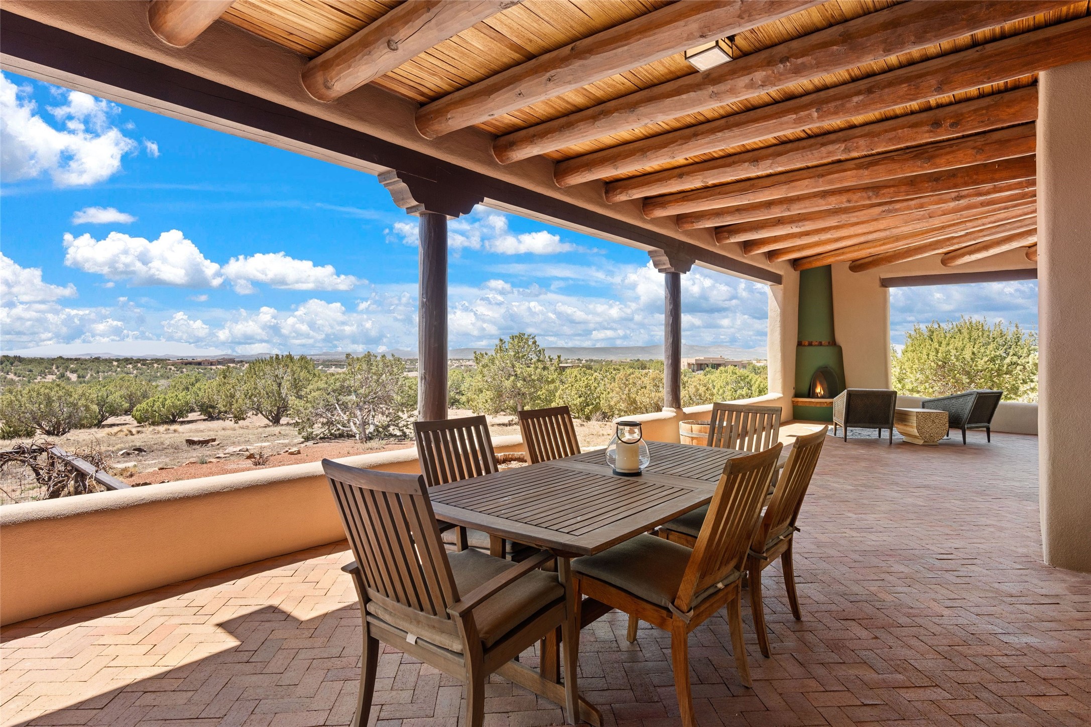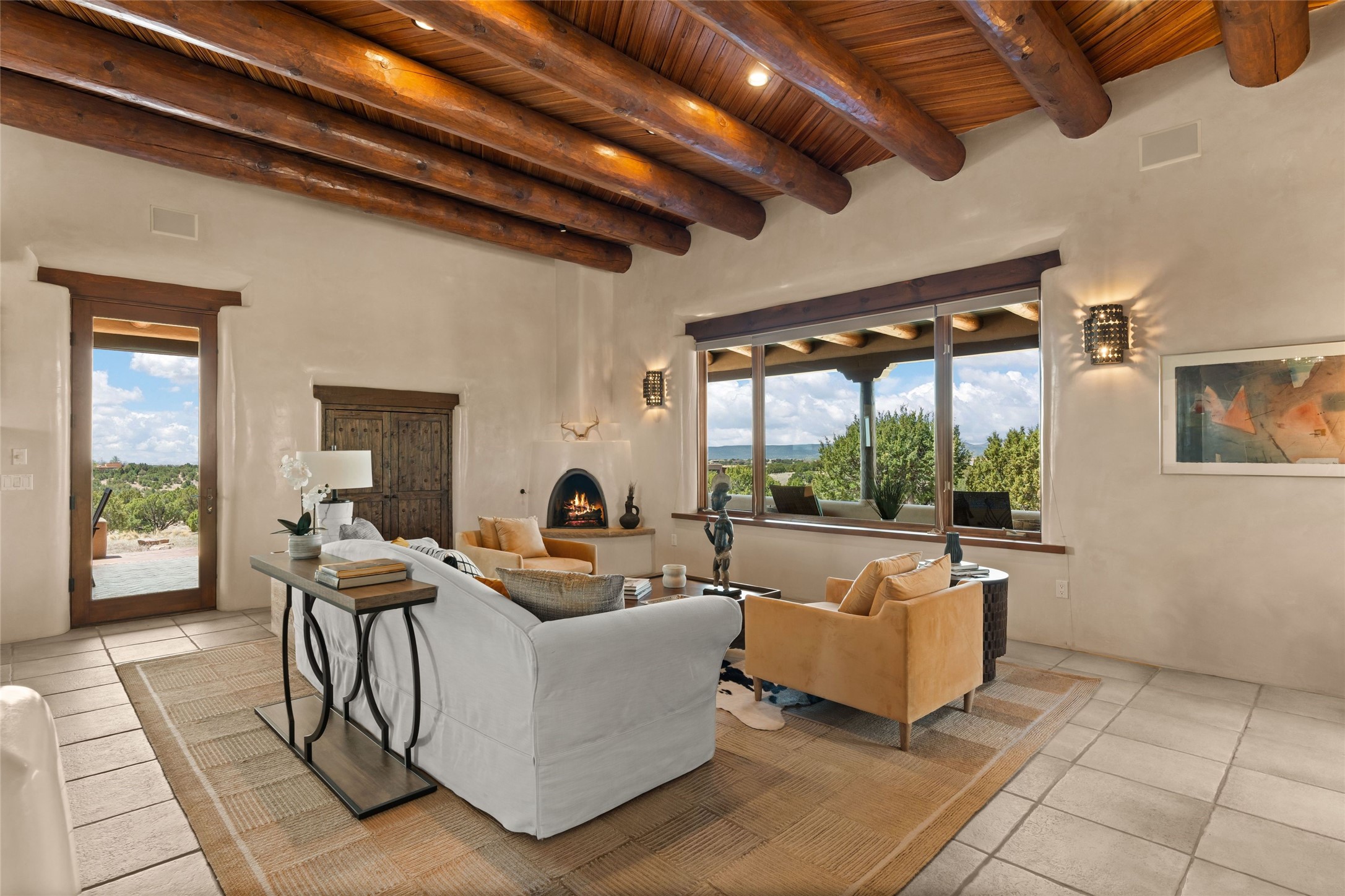 Tucked away on over 5 private acres just south of Las Campanas Drive, this distinctive Santa Fe-style home blends timeless design with sweeping 360-degree mountain views--from the Sangre de Cristo to the Jemez, Sandia, and Ortiz ranges. Built by master craftsman Don Wiles using pumice-crete construction, this 3-bedroom, 3-bath retreat delivers beauty, efficiency, and soul. A gated courtyard and 200 sq ft portal welcome you into a space designed for both comfort and connection to the outdoors. The sunlit living room offers panoramic views, a kiva fireplace, and access to a 1,200 sq ft wraparound portal--complete with a second fireplace for enjoying unforgettable sunsets year-round. The kitchen is both warm and functional, featuring alder cabinetry, a 6-burner Dacor range, separate wall oven, GE Profile fridge, microwave, walk-in pantry, and a cozy breakfast nook framed by bay windows. Throughout the home, plaster walls, ceramic tile floors, and coved ceilings create a soft, organic feel. The spacious primary suite includes double vanities, a generous closet, and a private redwood sauna. Two guest rooms--one ideal as a home office--are served by modern comforts like six Daikin mini-splits (installed in 2019), radiant heat with Wirsbo piping, and built-in speakers in key living areas. Outside, a raised bed garden adds a splash of green to the landscape, while the home's thoughtful layout invites indoor-outdoor living at every turn. Peaceful, energy-efficient, and just minutes from town, this one-of-a-kind property offers the best of Santa Fe living--with the views and quiet to prove it.