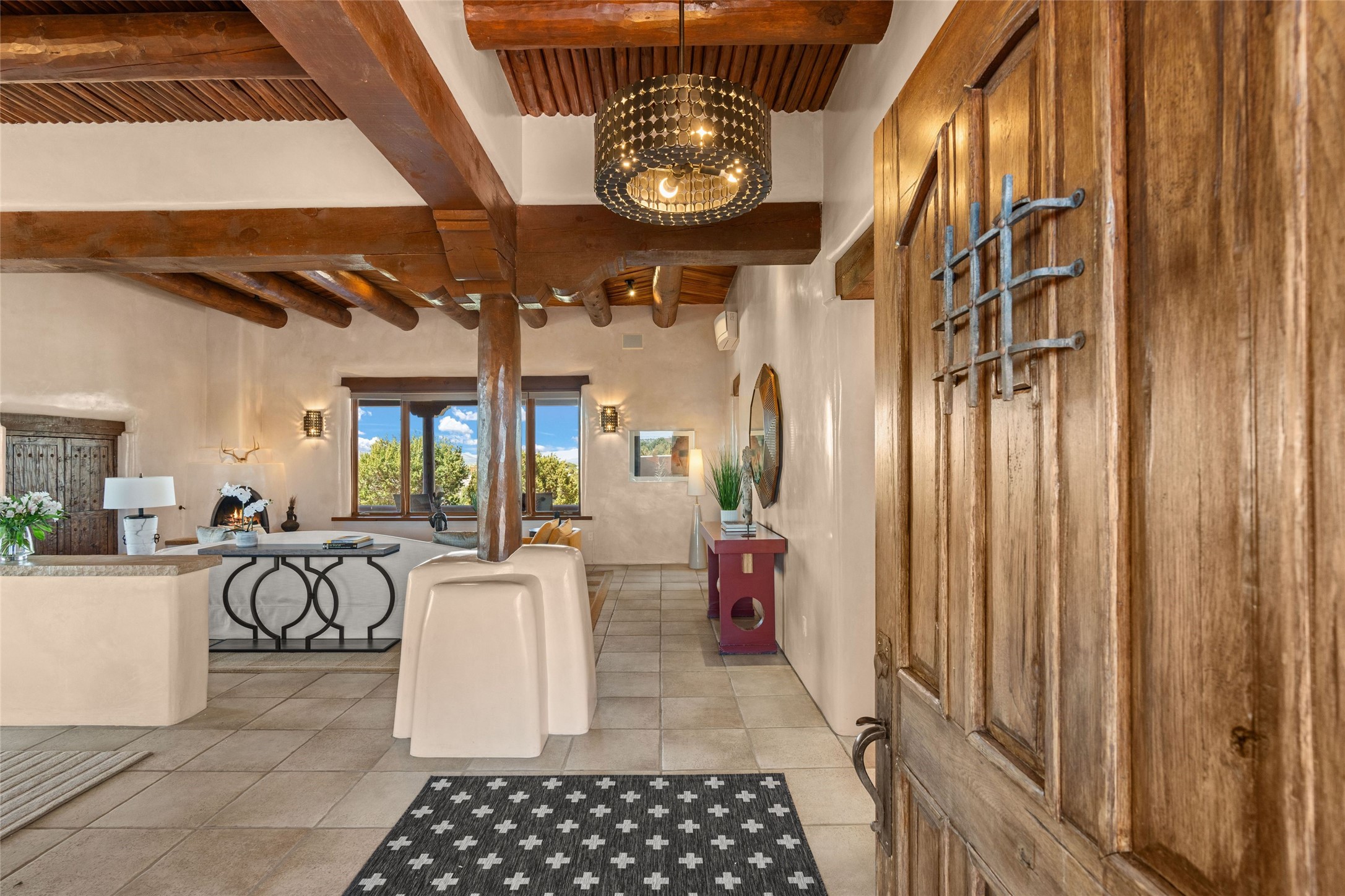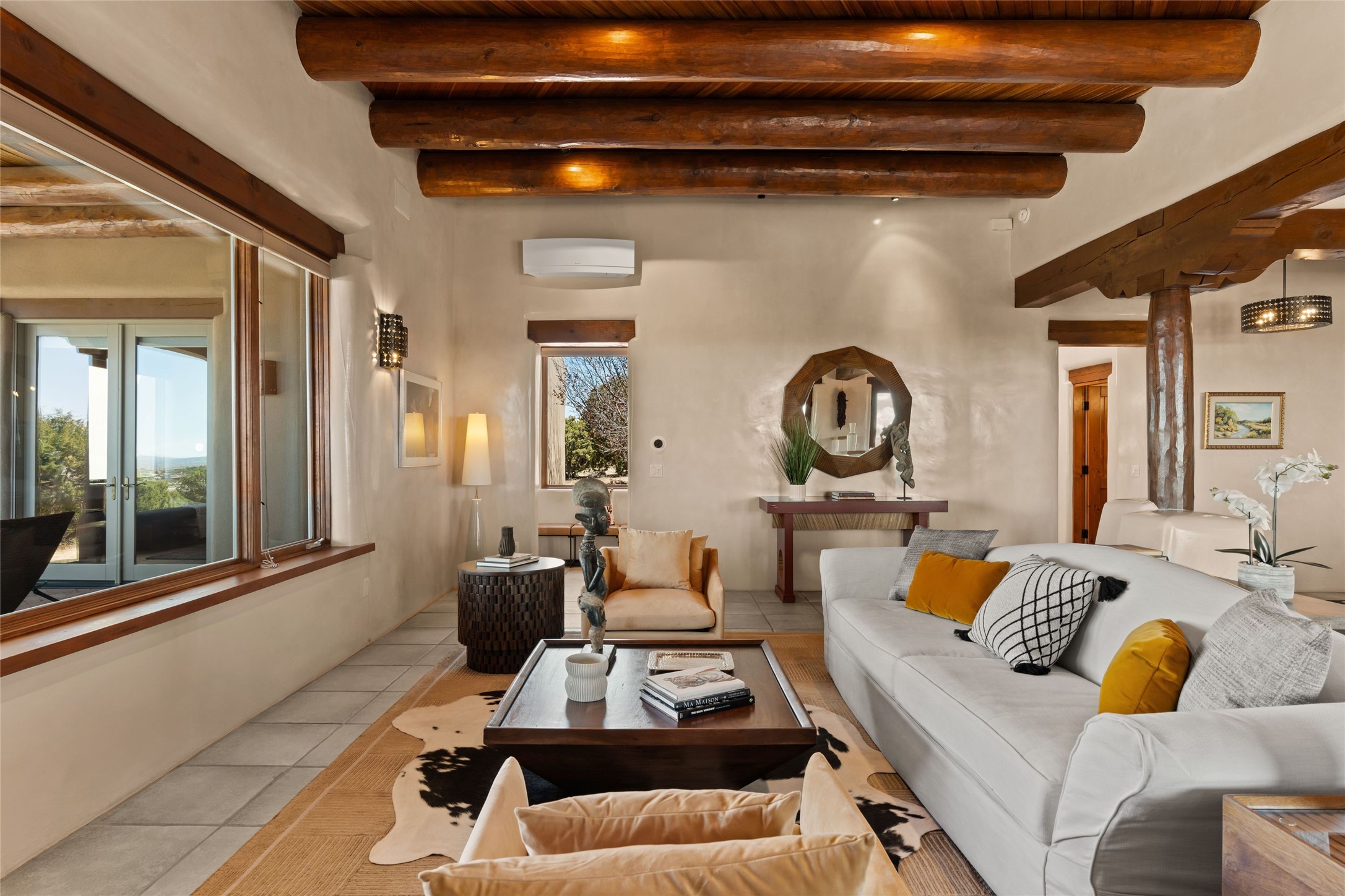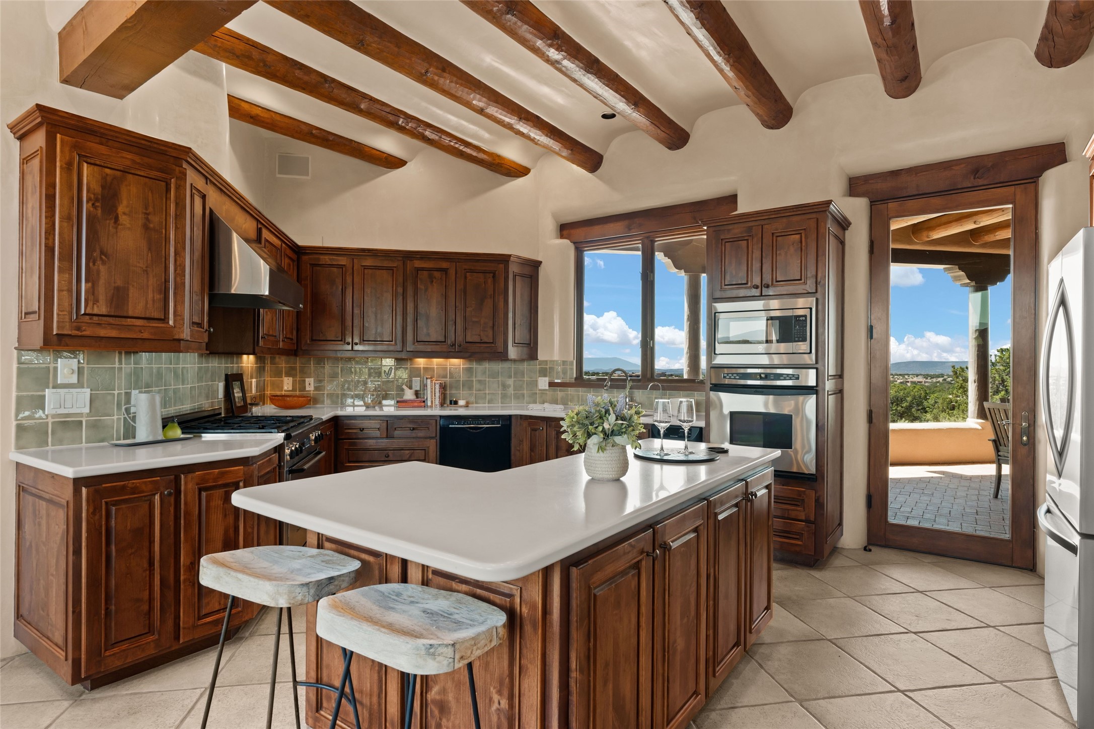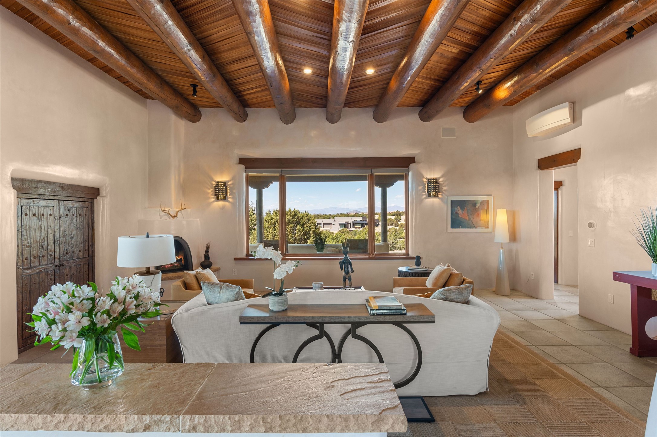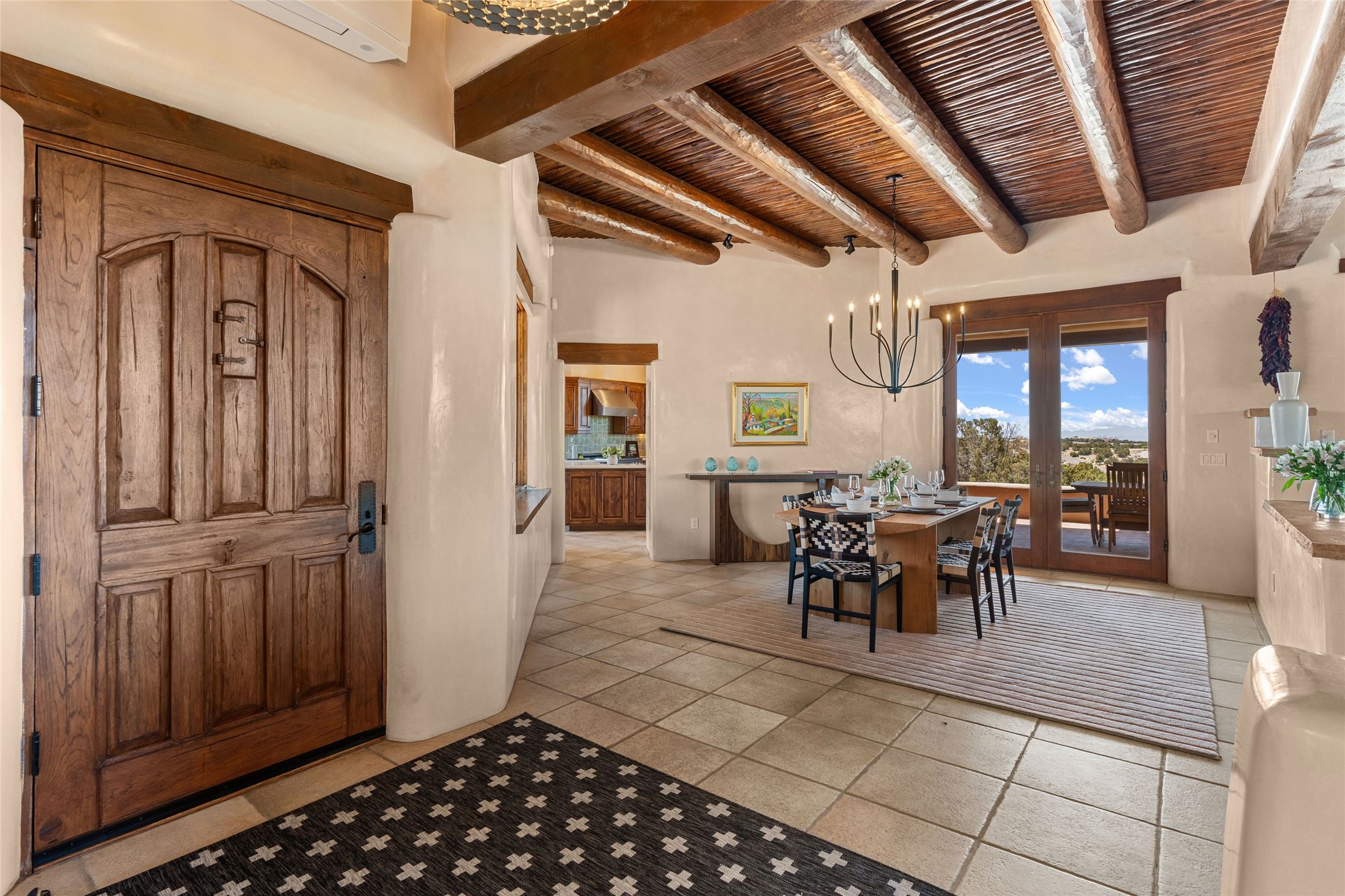 Tucked away on over 5 private acres just south of Las Campanas Drive, this distinctive Santa Fe-style home blends timeless design with sweeping 360-degree mountain views--from the Sangre de Cristo to the Jemez, Sandia, and Ortiz ranges. Built by master craftsman Don Wiles using pumice-crete construction, this 3-bedroom, 3-bath retreat delivers beauty, efficiency, and soul. A gated courtyard and 200 sq ft portal welcome you into a space designed for both comfort and connection to the outdoors. The sunlit living room offers panoramic views, a kiva fireplace, and access to a 1,200 sq ft wraparound portal--complete with a second fireplace for enjoying unforgettable sunsets year-round. The kitchen is both warm and functional, featuring alder cabinetry, a 6-burner Dacor range, separate wall oven, GE Profile fridge, microwave, walk-in pantry, and a cozy breakfast nook framed by bay windows. Throughout the home, plaster walls, ceramic tile floors, and coved ceilings create a soft, organic feel. The spacious primary suite includes double vanities, a generous closet, and a private redwood sauna. Two guest rooms--one ideal as a home office--are served by modern comforts like six Daikin mini-splits (installed in 2019), radiant heat with Wirsbo piping, and built-in speakers in key living areas. Outside, a raised bed garden adds a splash of green to the landscape, while the home's thoughtful layout invites indoor-outdoor living at every turn. Peaceful, energy-efficient, and just minutes from town, this one-of-a-kind property offers the best of Santa Fe living--with the views and quiet to prove it.