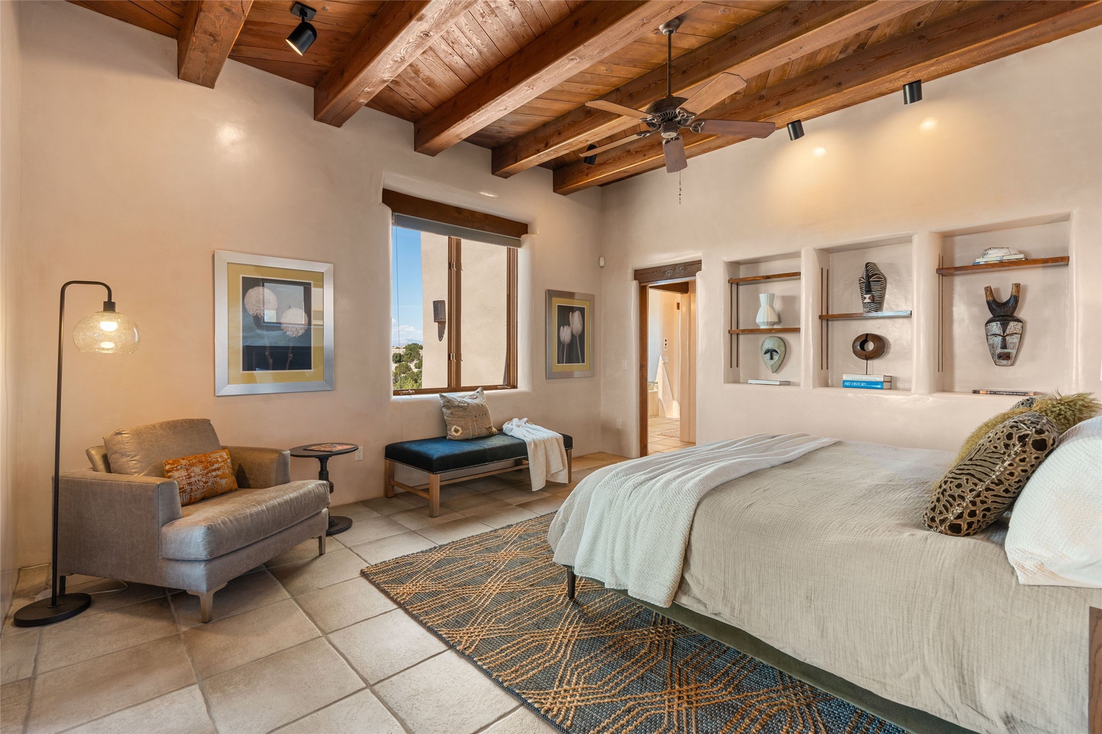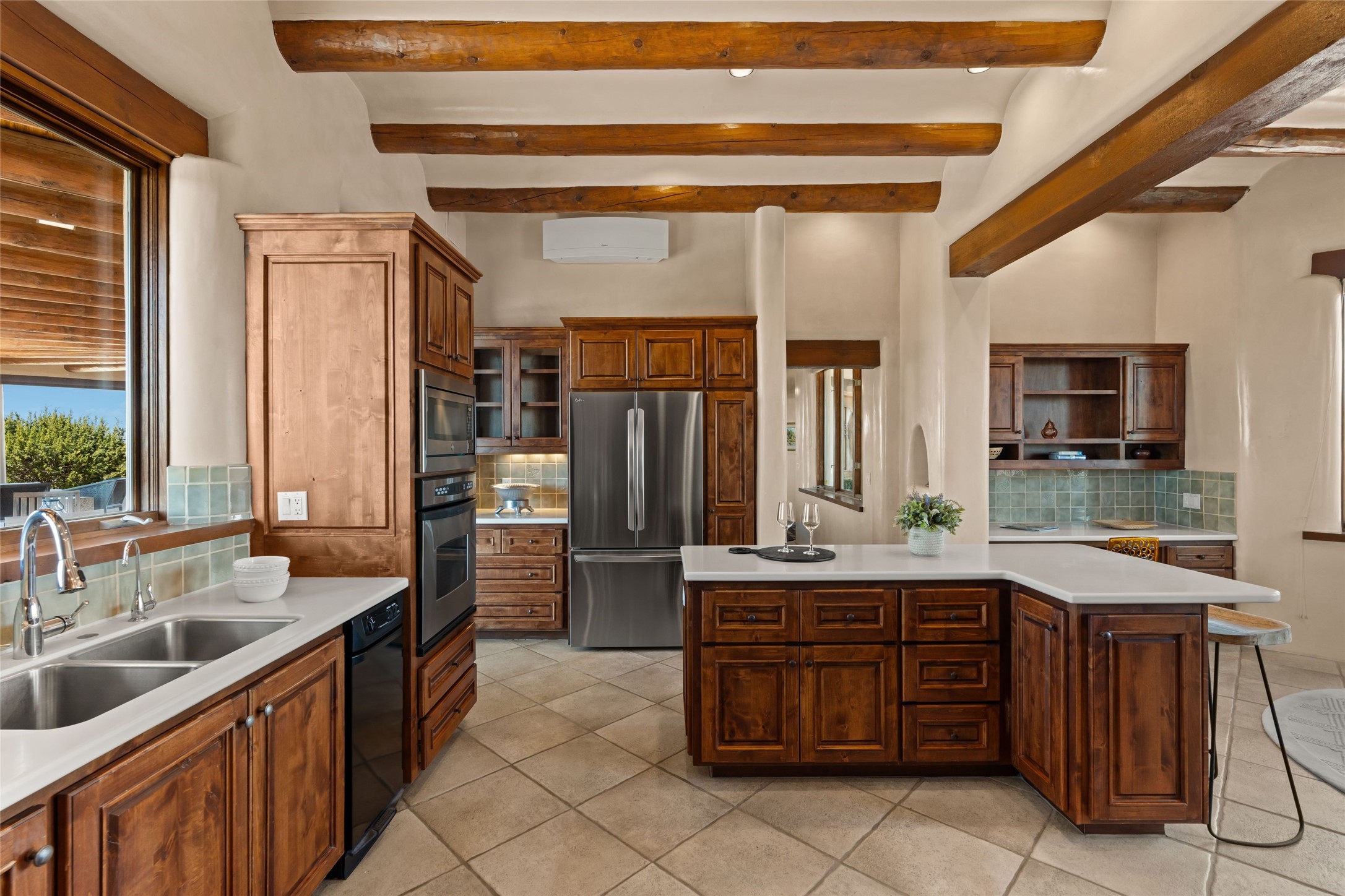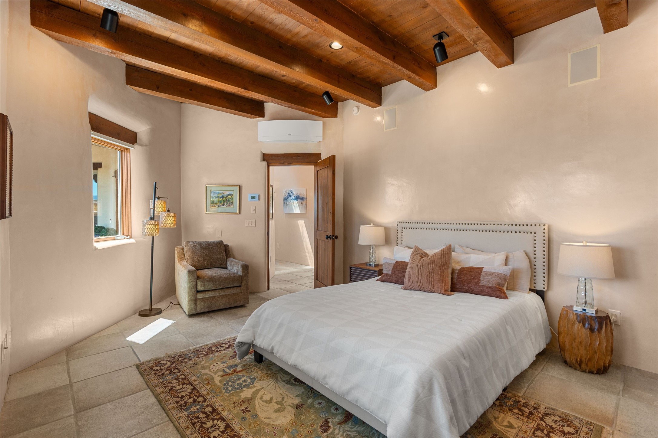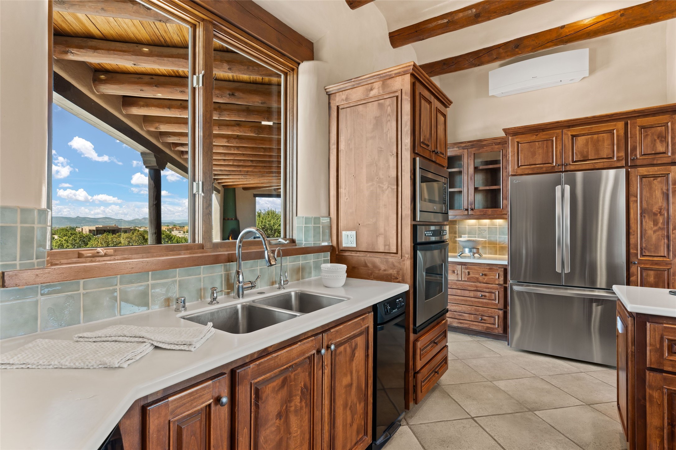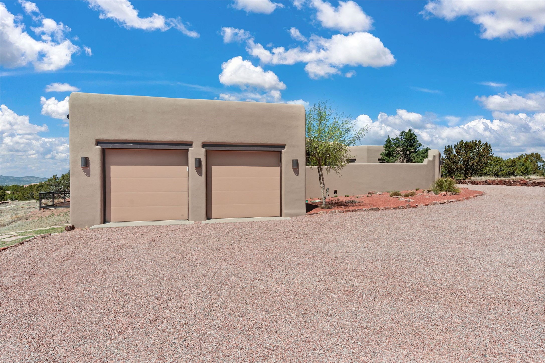 Tucked away on over 5 private acres just south of Las Campanas Drive, this distinctive Santa Fe-style home blends timeless design with sweeping 360-degree mountain views--from the Sangre de Cristo to the Jemez, Sandia, and Ortiz ranges. Built by master craftsman Don Wiles using pumice-crete construction, this 3-bedroom, 3-bath retreat delivers beauty, efficiency, and soul. A gated courtyard and 200 sq ft portal welcome you into a space designed for both comfort and connection to the outdoors. The sunlit living room offers panoramic views, a kiva fireplace, and access to a 1,200 sq ft wraparound portal--complete with a second fireplace for enjoying unforgettable sunsets year-round. The kitchen is both warm and functional, featuring alder cabinetry, a 6-burner Dacor range, separate wall oven, GE Profile fridge, microwave, walk-in pantry, and a cozy breakfast nook framed by bay windows. Throughout the home, plaster walls, ceramic tile floors, and coved ceilings create a soft, organic feel. The spacious primary suite includes double vanities, a generous closet, and a private redwood sauna. Two guest rooms--one ideal as a home office--are served by modern comforts like six Daikin mini-splits (installed in 2019), radiant heat with Wirsbo piping, and built-in speakers in key living areas. Outside, a raised bed garden adds a splash of green to the landscape, while the home's thoughtful layout invites indoor-outdoor living at every turn. Peaceful, energy-efficient, and just minutes from town, this one-of-a-kind property offers the best of Santa Fe living--with the views and quiet to prove it.