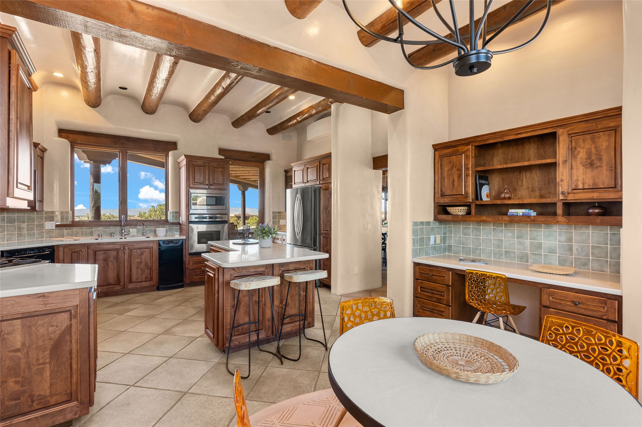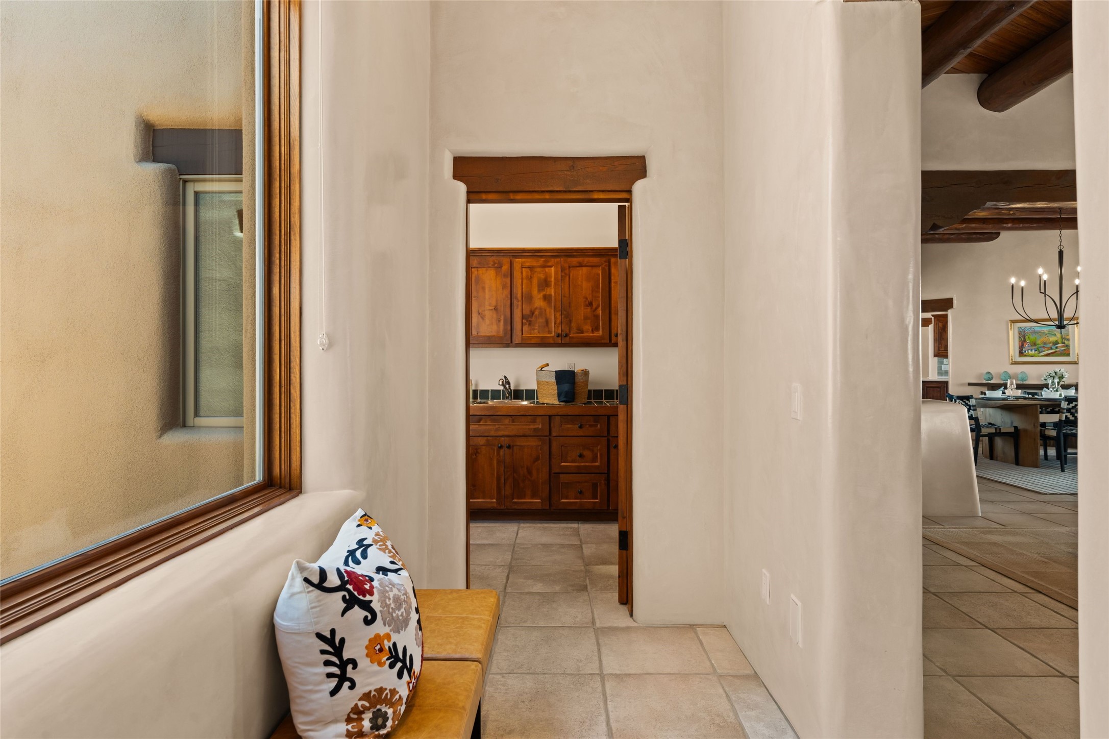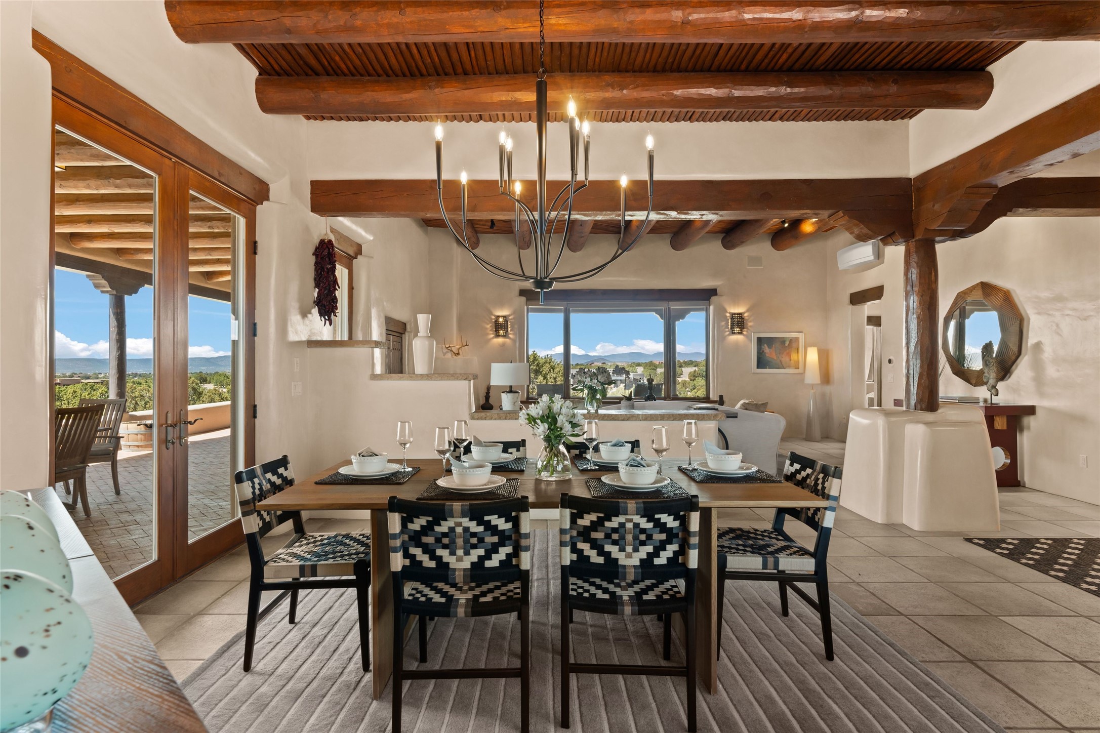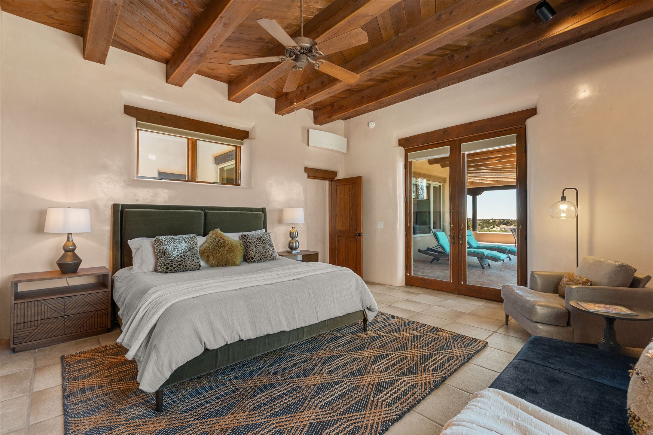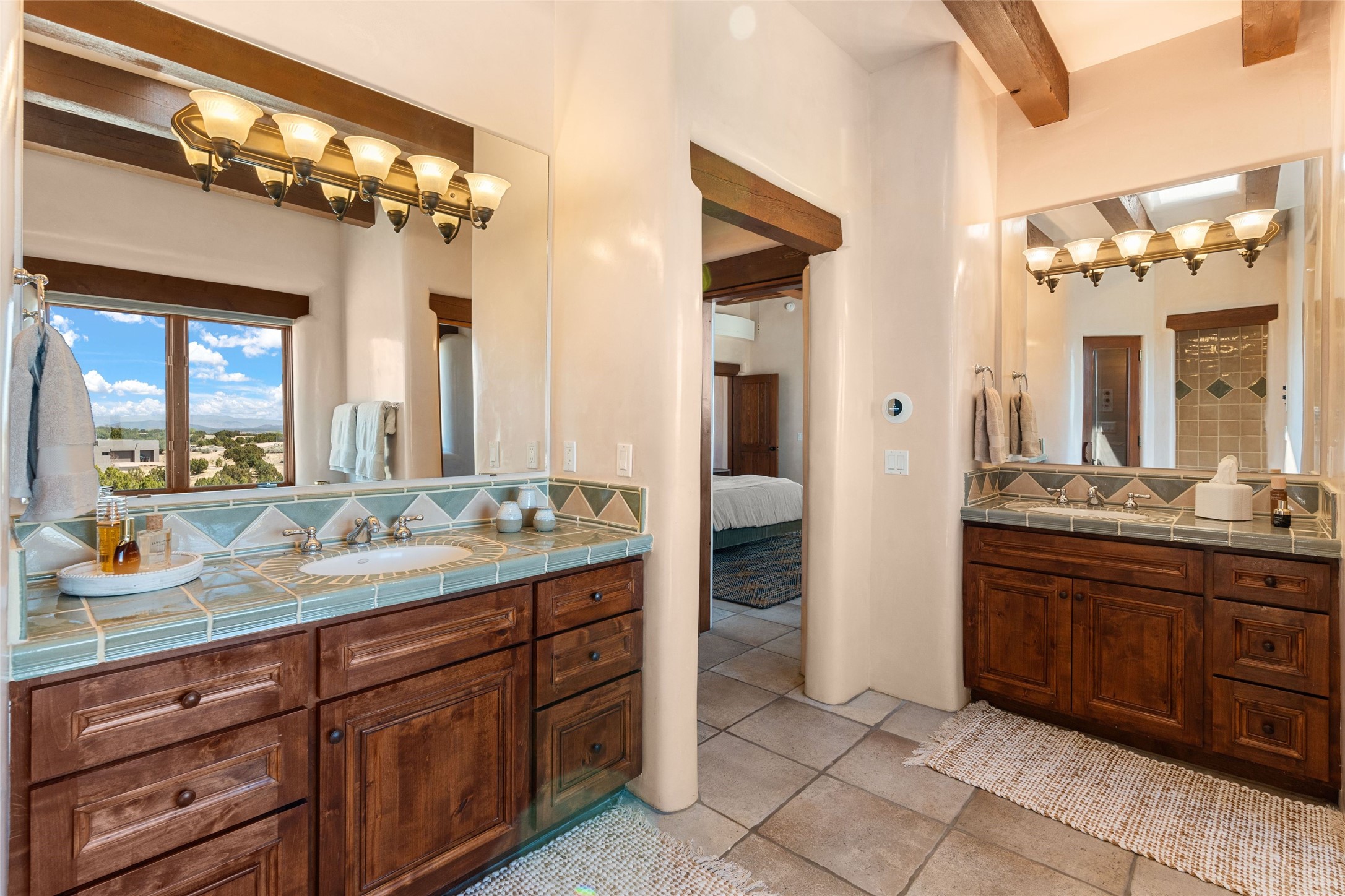 Tucked away on over 5 private acres just south of Las Campanas Drive, this distinctive Santa Fe-style home blends timeless design with sweeping 360-degree mountain views--from the Sangre de Cristo to the Jemez, Sandia, and Ortiz ranges. Built by master craftsman Don Wiles using pumice-crete construction, this 3-bedroom, 3-bath retreat delivers beauty, efficiency, and soul. A gated courtyard and 200 sq ft portal welcome you into a space designed for both comfort and connection to the outdoors. The sunlit living room offers panoramic views, a kiva fireplace, and access to a 1,200 sq ft wraparound portal--complete with a second fireplace for enjoying unforgettable sunsets year-round. The kitchen is both warm and functional, featuring alder cabinetry, a 6-burner Dacor range, separate wall oven, GE Profile fridge, microwave, walk-in pantry, and a cozy breakfast nook framed by bay windows. Throughout the home, plaster walls, ceramic tile floors, and coved ceilings create a soft, organic feel. The spacious primary suite includes double vanities, a generous closet, and a private redwood sauna. Two guest rooms--one ideal as a home office--are served by modern comforts like six Daikin mini-splits (installed in 2019), radiant heat with Wirsbo piping, and built-in speakers in key living areas. Outside, a raised bed garden adds a splash of green to the landscape, while the home's thoughtful layout invites indoor-outdoor living at every turn. Peaceful, energy-efficient, and just minutes from town, this one-of-a-kind property offers the best of Santa Fe living--with the views and quiet to prove it.