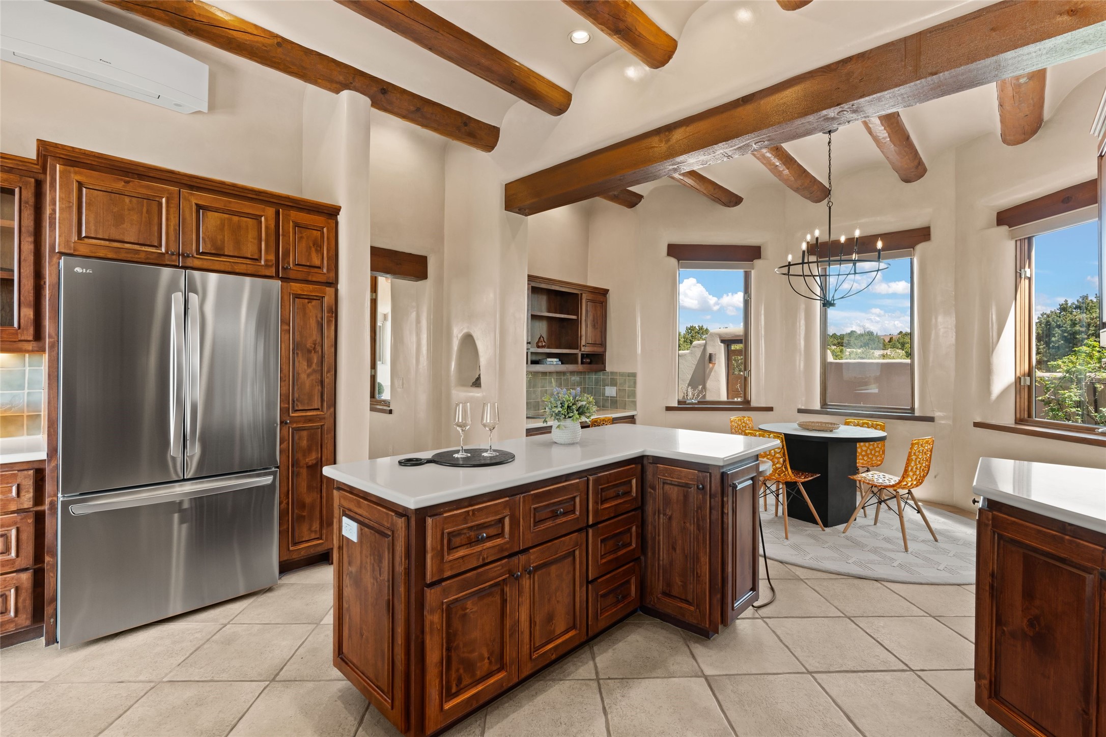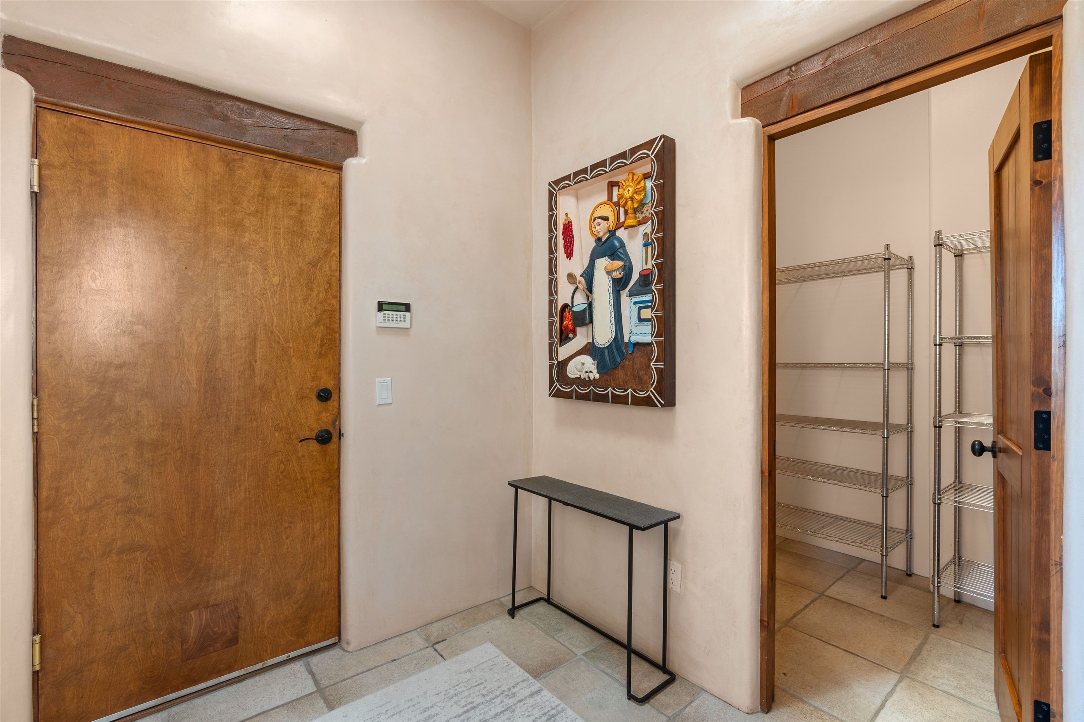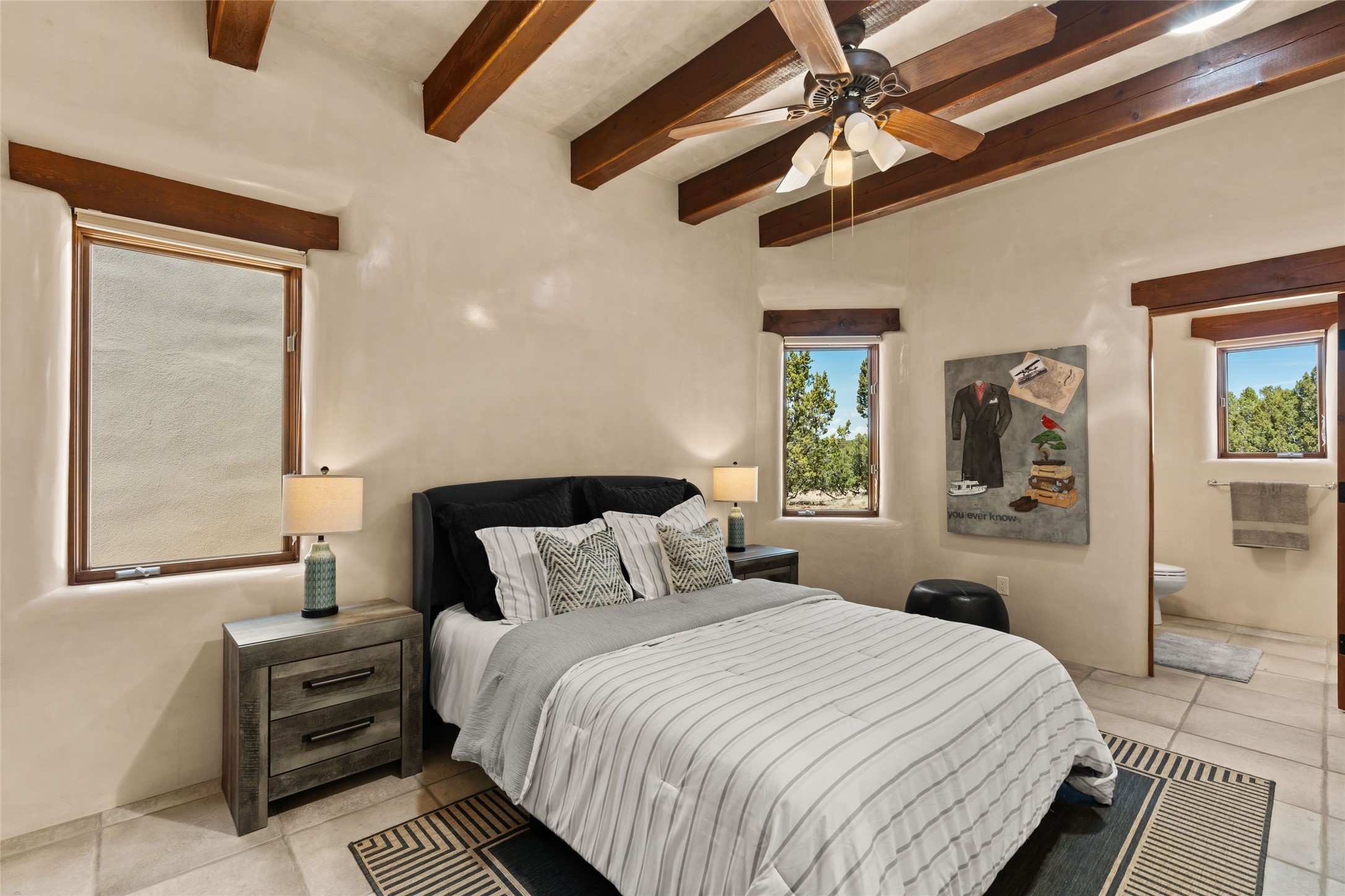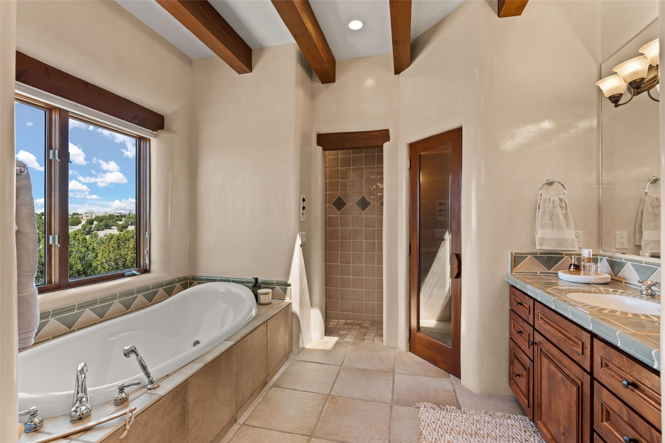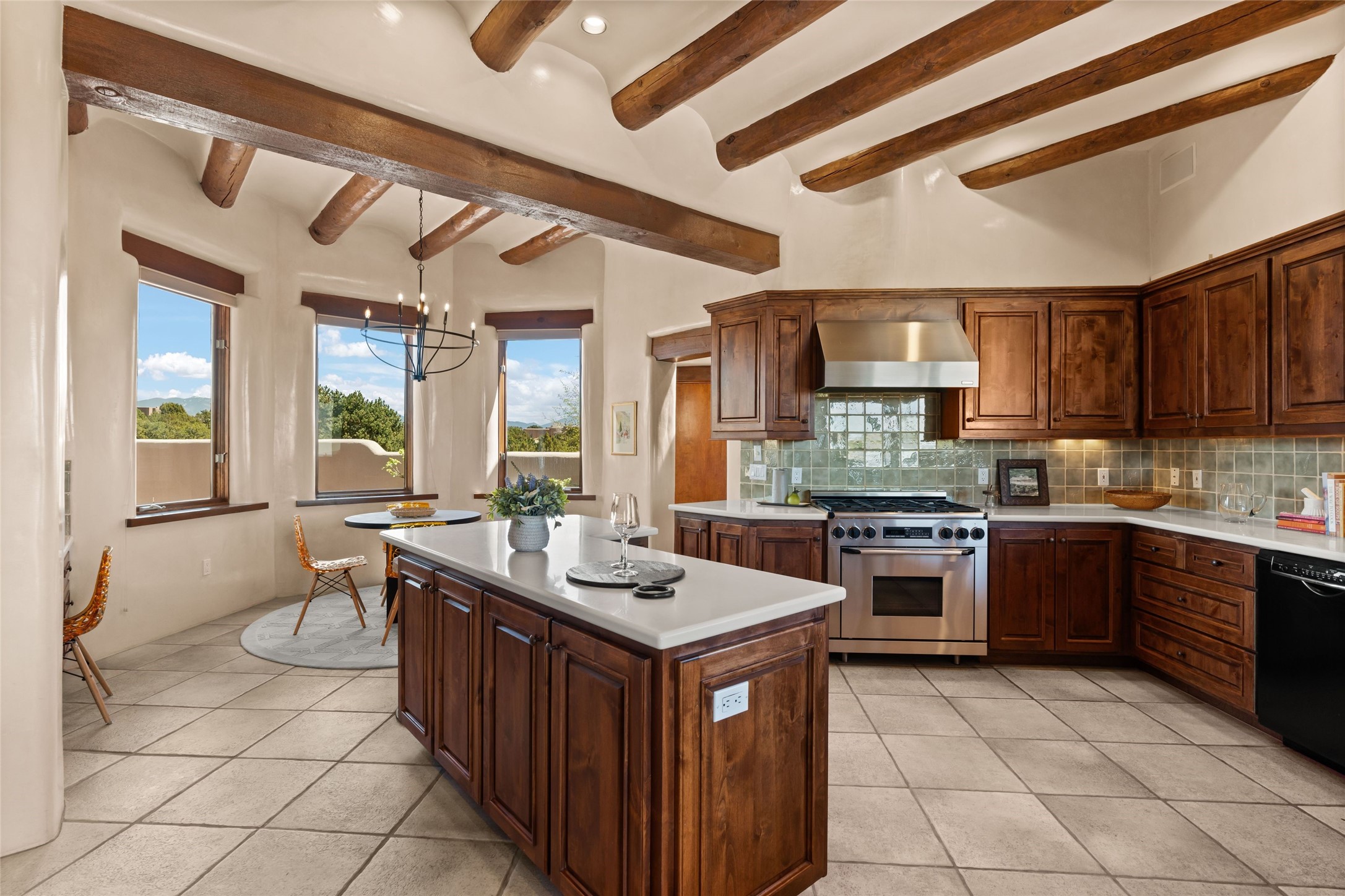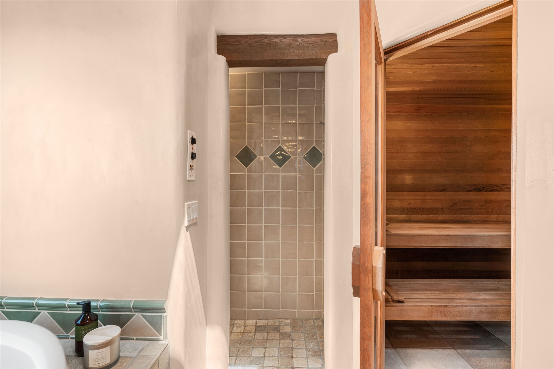 Tucked away on over 5 private acres just south of Las Campanas Drive, this distinctive Santa Fe-style home blends timeless design with sweeping 360-degree mountain views--from the Sangre de Cristo to the Jemez, Sandia, and Ortiz ranges. Built by master craftsman Don Wiles using pumice-crete construction, this 3-bedroom, 3-bath retreat delivers beauty, efficiency, and soul. A gated courtyard and 200 sq ft portal welcome you into a space designed for both comfort and connection to the outdoors. The sunlit living room offers panoramic views, a kiva fireplace, and access to a 1,200 sq ft wraparound portal--complete with a second fireplace for enjoying unforgettable sunsets year-round. The kitchen is both warm and functional, featuring alder cabinetry, a 6-burner Dacor range, separate wall oven, GE Profile fridge, microwave, walk-in pantry, and a cozy breakfast nook framed by bay windows. Throughout the home, plaster walls, ceramic tile floors, and coved ceilings create a soft, organic feel. The spacious primary suite includes double vanities, a generous closet, and a private redwood sauna. Two guest rooms--one ideal as a home office--are served by modern comforts like six Daikin mini-splits (installed in 2019), radiant heat with Wirsbo piping, and built-in speakers in key living areas. Outside, a raised bed garden adds a splash of green to the landscape, while the home's thoughtful layout invites indoor-outdoor living at every turn. Peaceful, energy-efficient, and just minutes from town, this one-of-a-kind property offers the best of Santa Fe living--with the views and quiet to prove it.