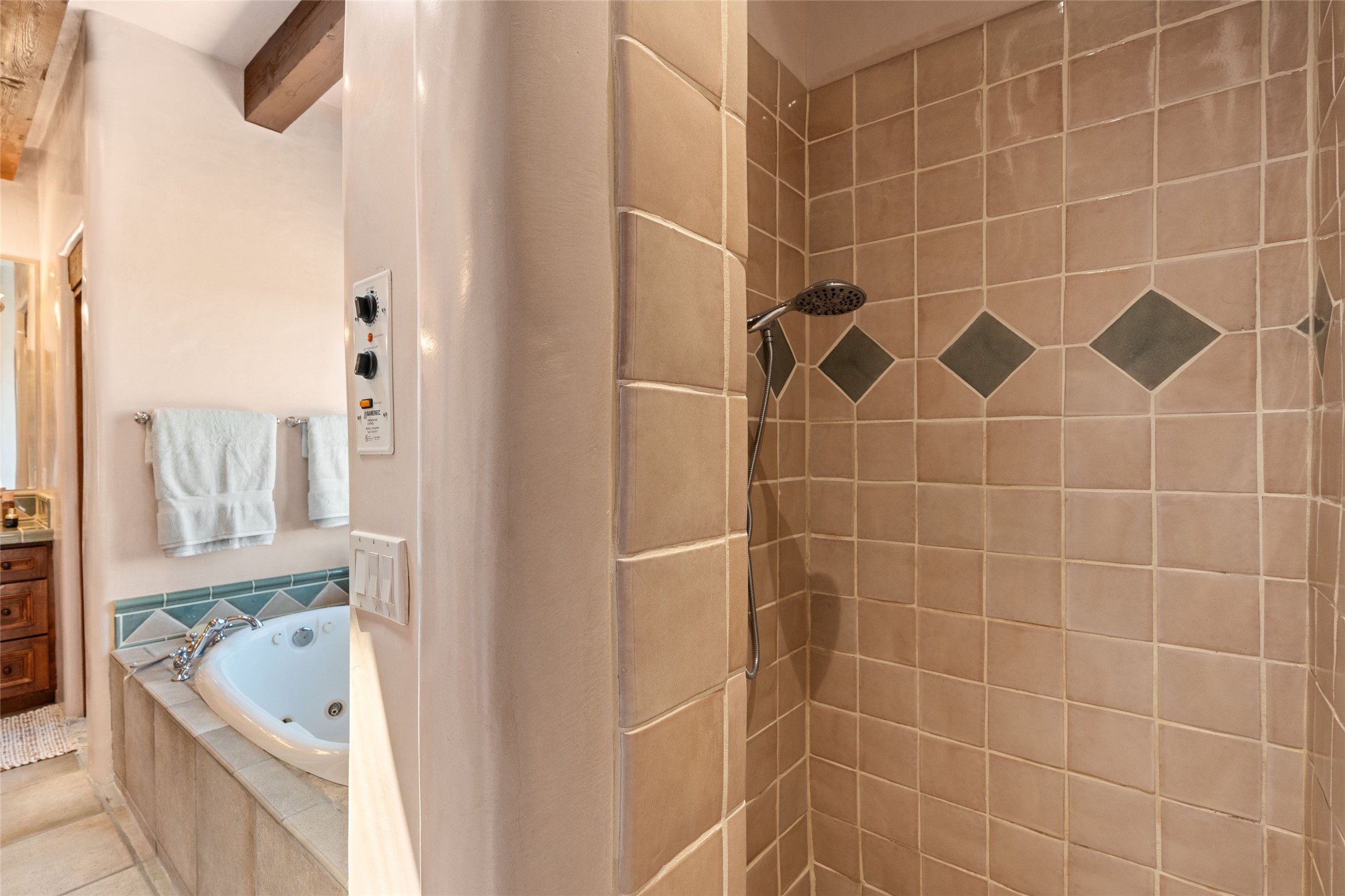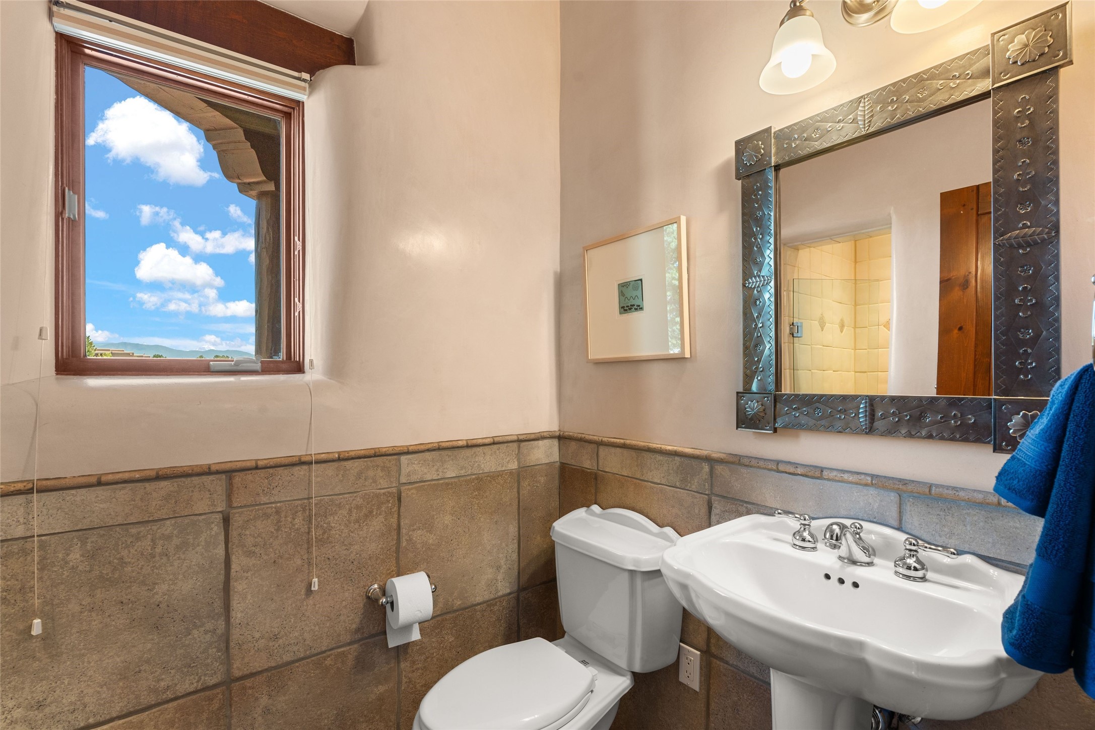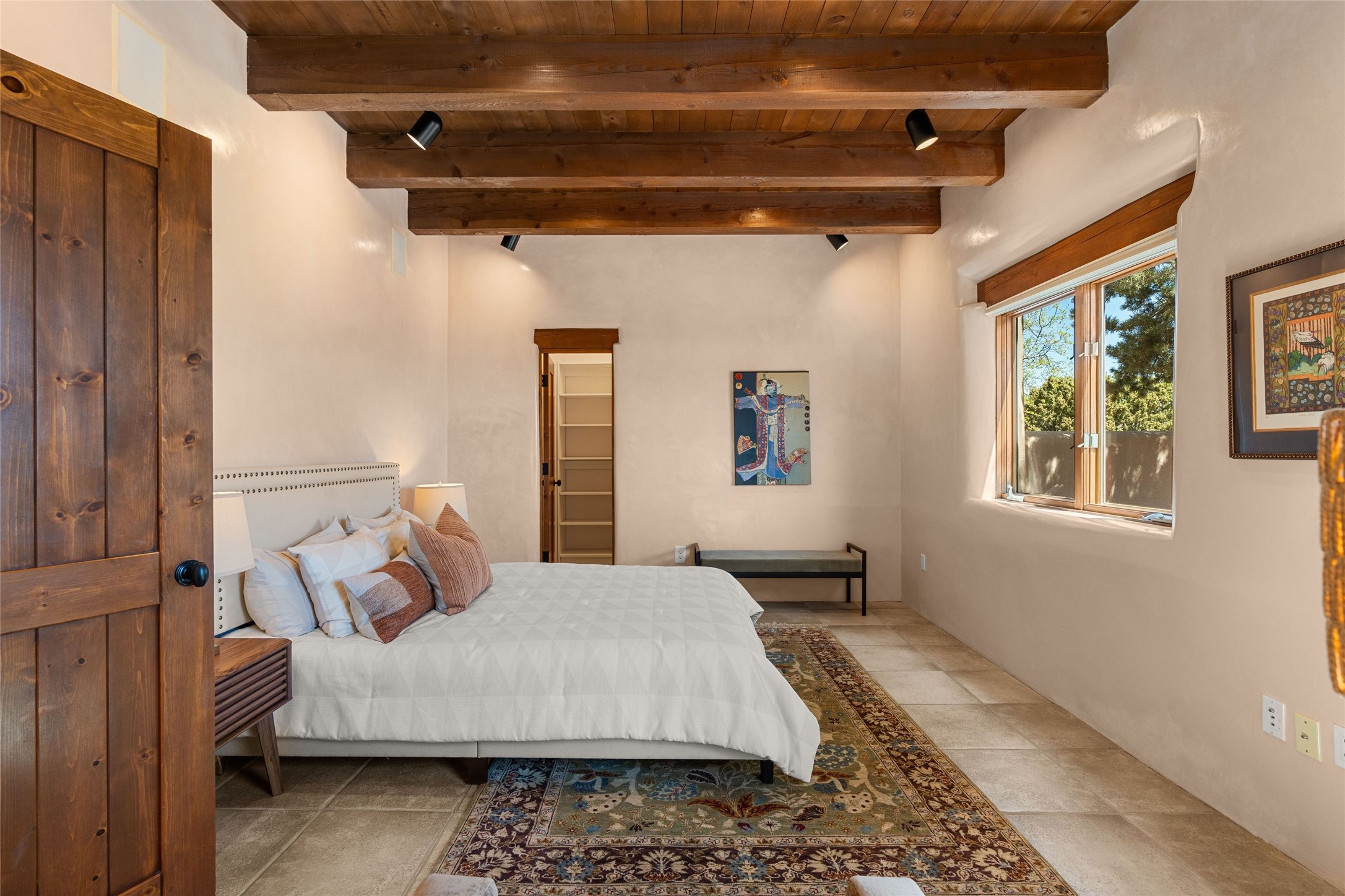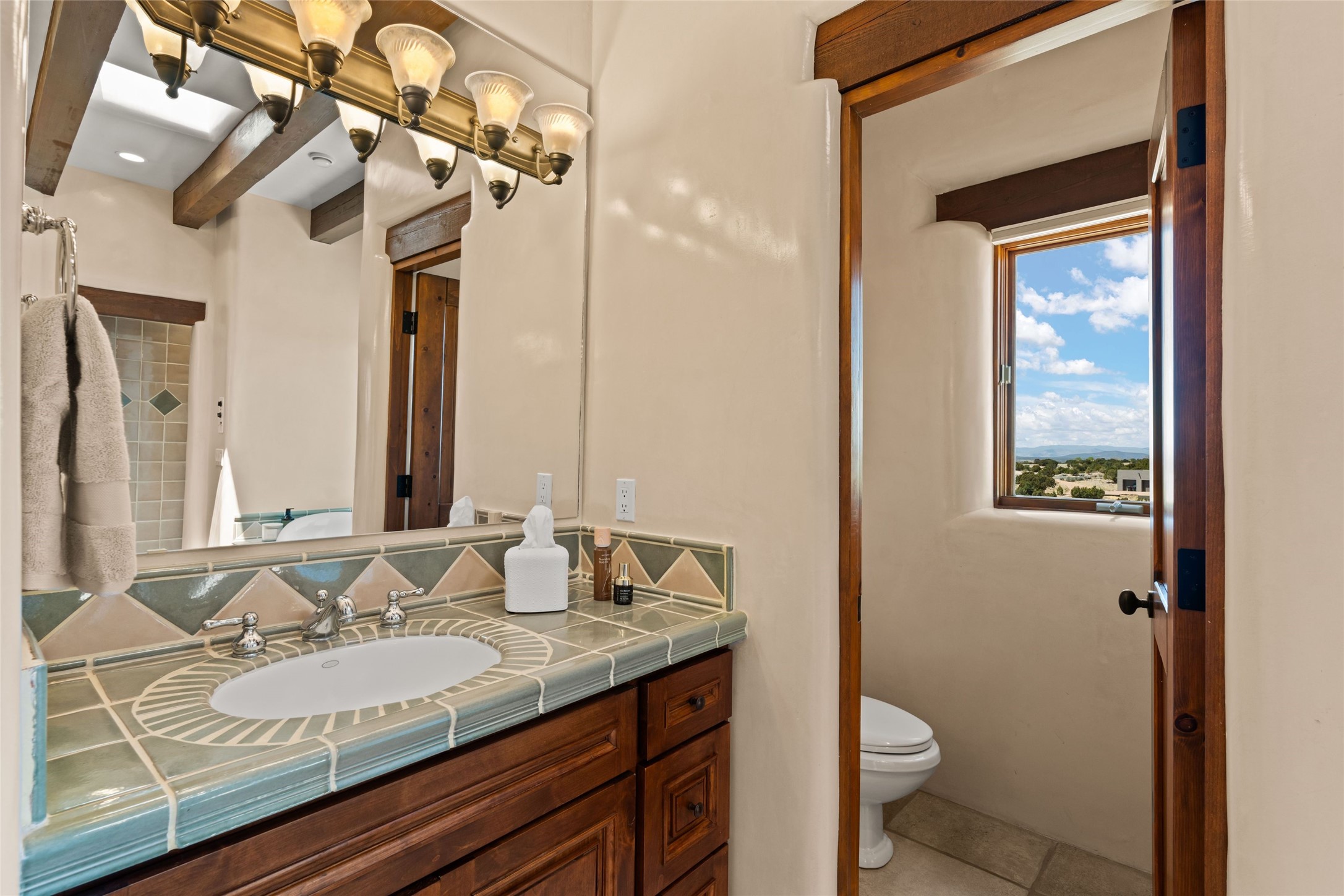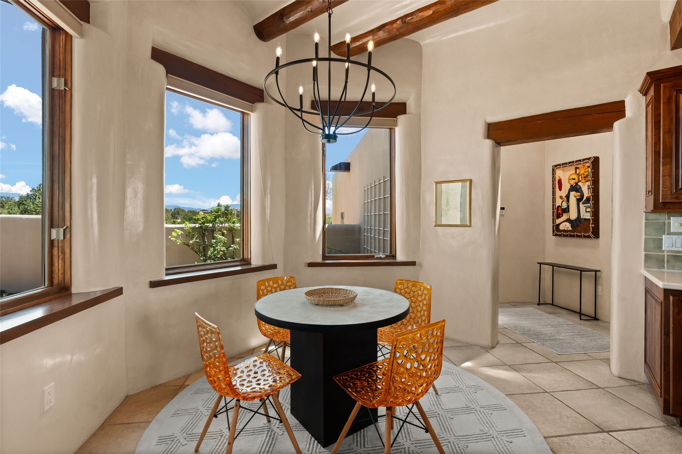 Tucked away on over 5 private acres just south of Las Campanas Drive, this distinctive Santa Fe-style home blends timeless design with sweeping 360-degree mountain views--from the Sangre de Cristo to the Jemez, Sandia, and Ortiz ranges. Built by master craftsman Don Wiles using pumice-crete construction, this 3-bedroom, 3-bath retreat delivers beauty, efficiency, and soul. A gated courtyard and 200 sq ft portal welcome you into a space designed for both comfort and connection to the outdoors. The sunlit living room offers panoramic views, a kiva fireplace, and access to a 1,200 sq ft wraparound portal--complete with a second fireplace for enjoying unforgettable sunsets year-round. The kitchen is both warm and functional, featuring alder cabinetry, a 6-burner Dacor range, separate wall oven, GE Profile fridge, microwave, walk-in pantry, and a cozy breakfast nook framed by bay windows. Throughout the home, plaster walls, ceramic tile floors, and coved ceilings create a soft, organic feel. The spacious primary suite includes double vanities, a generous closet, and a private redwood sauna. Two guest rooms--one ideal as a home office--are served by modern comforts like six Daikin mini-splits (installed in 2019), radiant heat with Wirsbo piping, and built-in speakers in key living areas. Outside, a raised bed garden adds a splash of green to the landscape, while the home's thoughtful layout invites indoor-outdoor living at every turn. Peaceful, energy-efficient, and just minutes from town, this one-of-a-kind property offers the best of Santa Fe living--with the views and quiet to prove it.