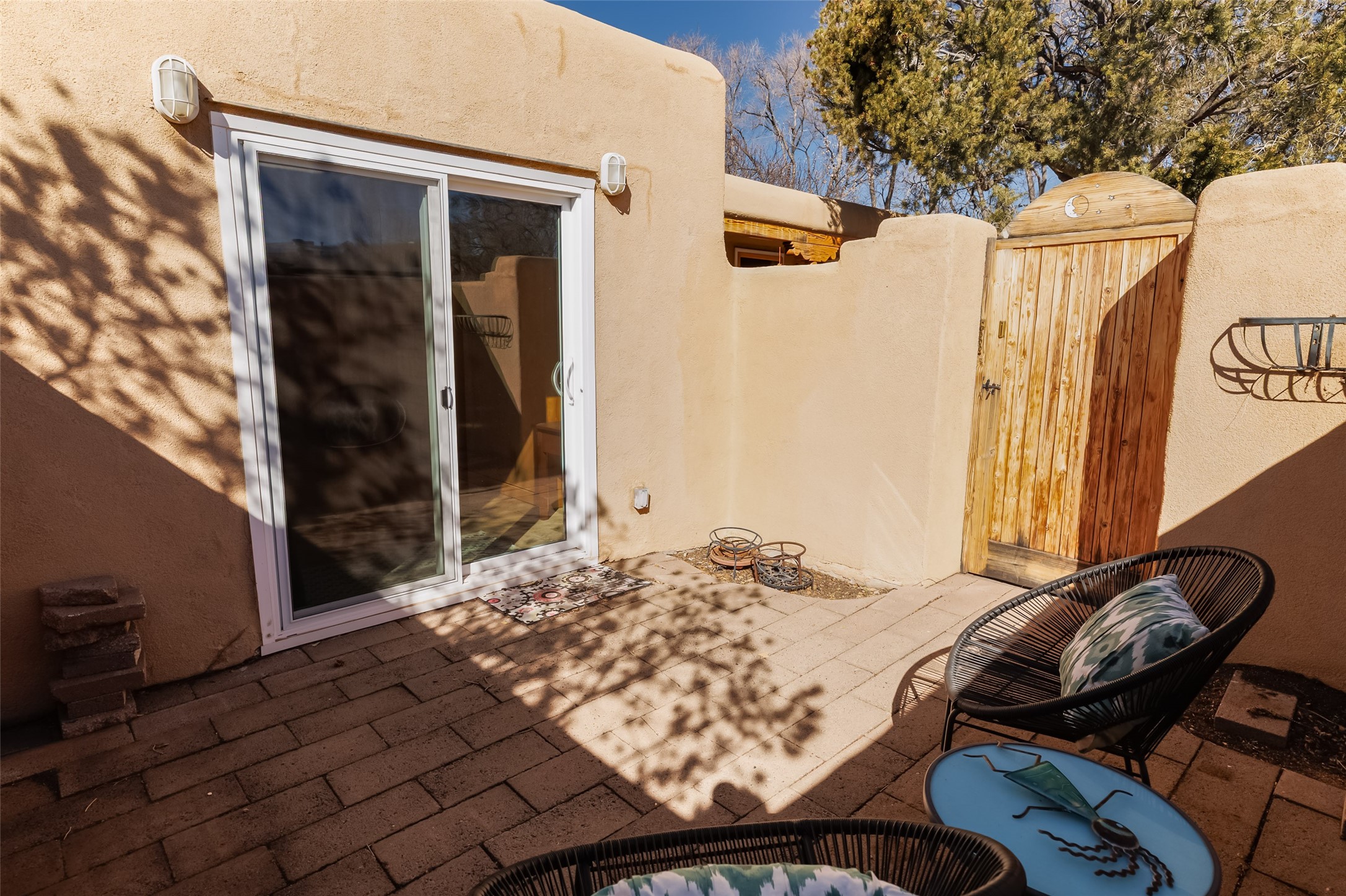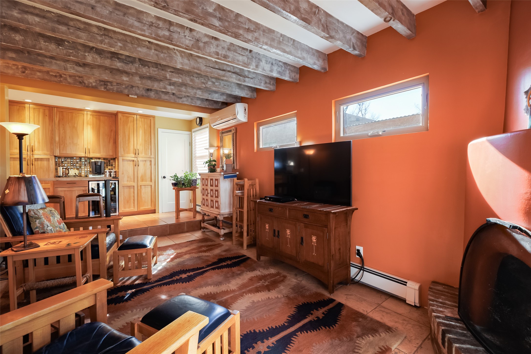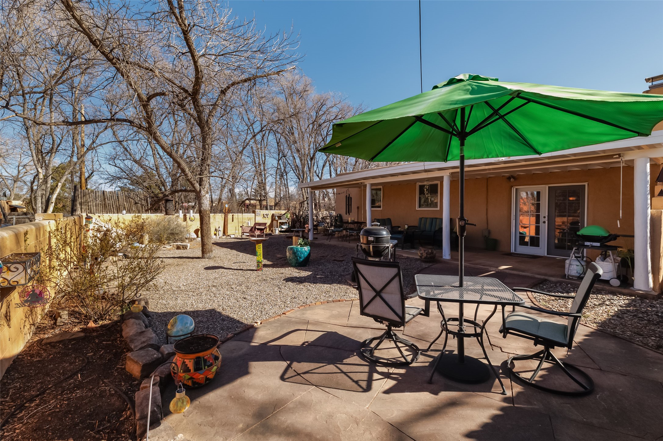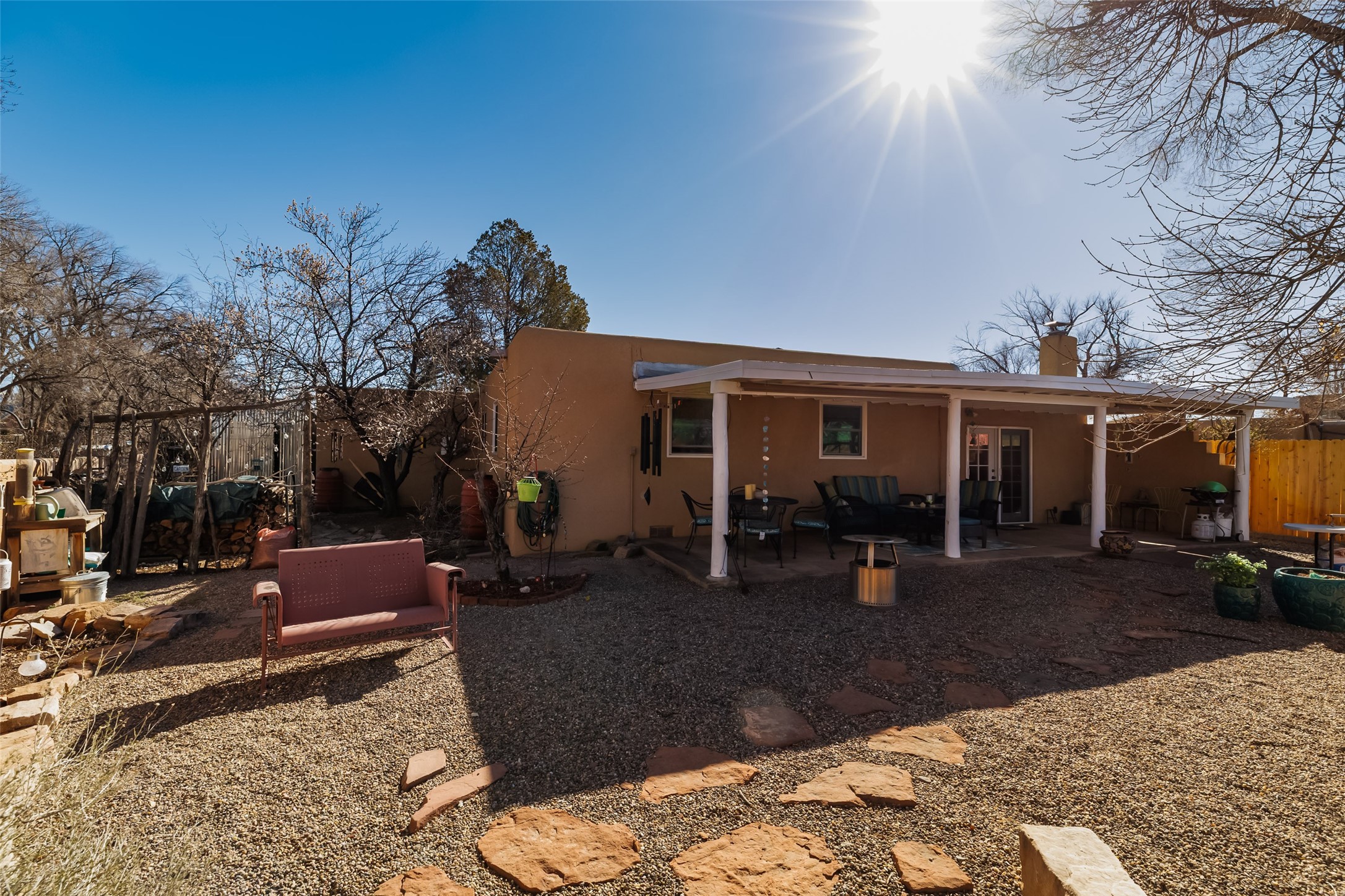 Charming single-level home located in a very Casa Alegra neighborhood. Convenient access to shopping and restaurants and Santa Fe River Trail and Acequia Trail both lead to the rail yard and downtown. Situated on a corner lot, the property features a spacious backyard and a covered portal ideal for outdoor entertaining. With three bedrooms and two bathrooms, and extra room that makes a great office or hobby room. The home also includes a cozy den with a Kiva fireplace. Enjoy year-round comfort with refrigerated air and mini-split cooling, plus the added benefit of solar panels.Key features include beautiful oak wood floors and tile throughout. The kitchen boasts red birch shaker-style cabinets with soft-close drawers and doors, along with pull-out drawers in both lower cabinets and the pantry. A pull-out trash/recycling system enhances convenience. The kitchen, laundry room, and bathrooms feature elegant Cambria quartz countertops. The third bedroom, which offers a private outdoor patio and a separate entrance, also has a spacious closet and could easily serve as a home office.
