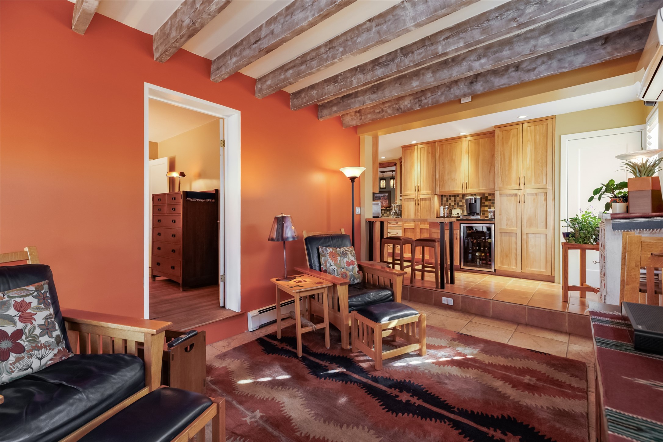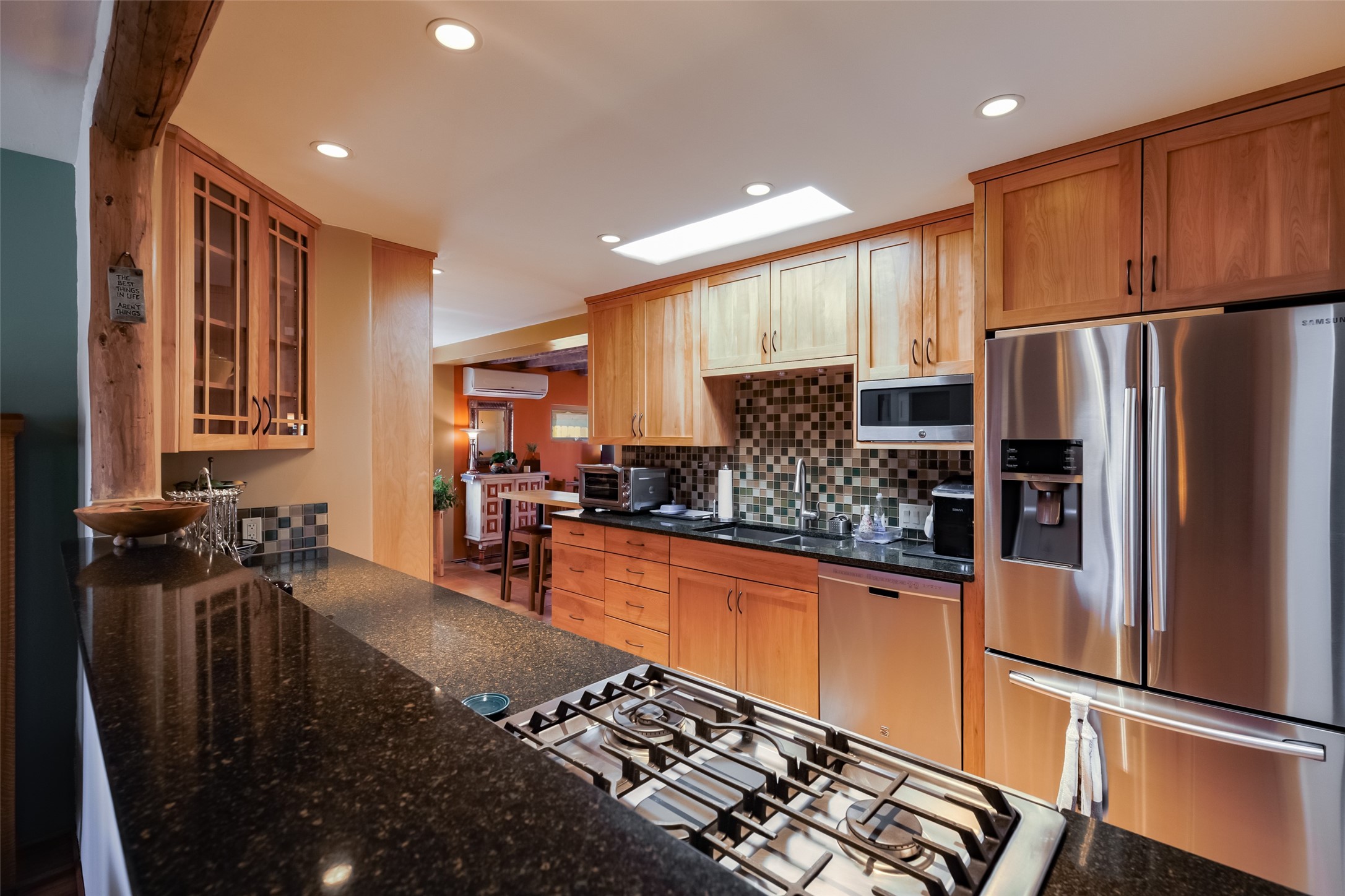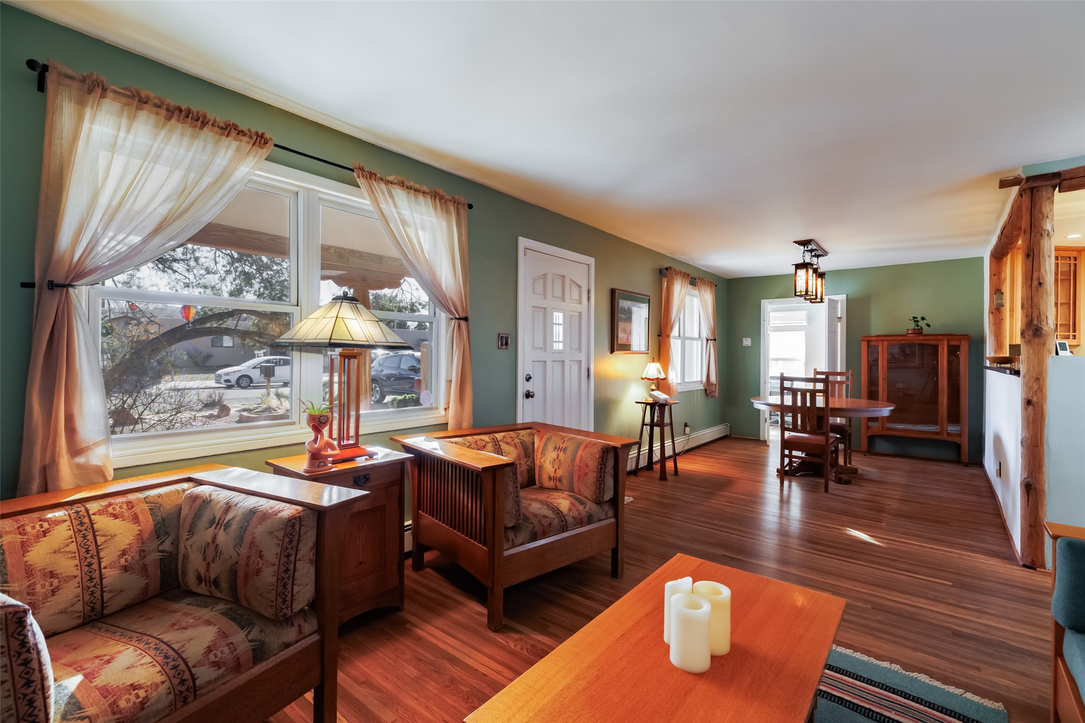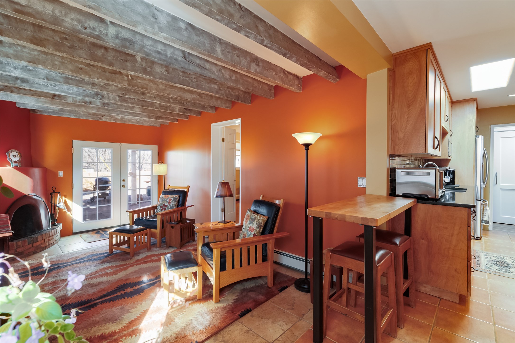Charming single-level home located in a very Casa Alegra neighborhood. Convenient access to shopping and restaurants and Santa Fe River Trail and Acequia Trail both lead to the rail yard and downtown. Situated on a corner lot, the property features a spacious backyard and a covered portal ideal for outdoor entertaining. With three bedrooms and two bathrooms, and extra room that makes a great office or hobby room. The home also includes a cozy den with a Kiva fireplace. Enjoy year-round comfort with refrigerated air and mini-split cooling, plus the added benefit of solar panels.Key features include beautiful oak wood floors and tile throughout. The kitchen boasts red birch shaker-style cabinets with soft-close drawers and doors, along with pull-out drawers in both lower cabinets and the pantry. A pull-out trash/recycling system enhances convenience. The kitchen, laundry room, and bathrooms feature elegant Cambria quartz countertops. The third bedroom, which offers a private outdoor patio and a separate entrance, also has a spacious closet and could easily serve as a home office.