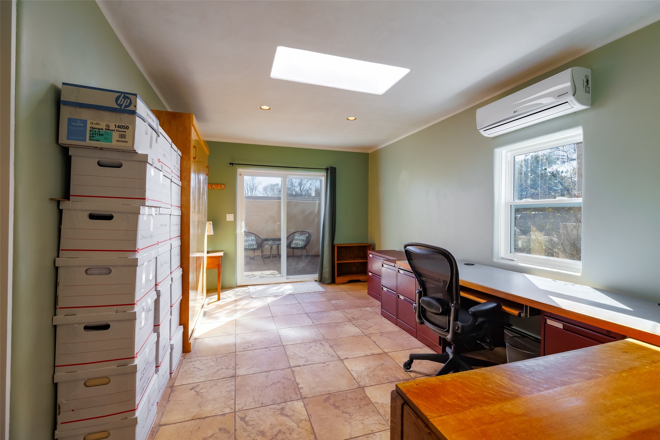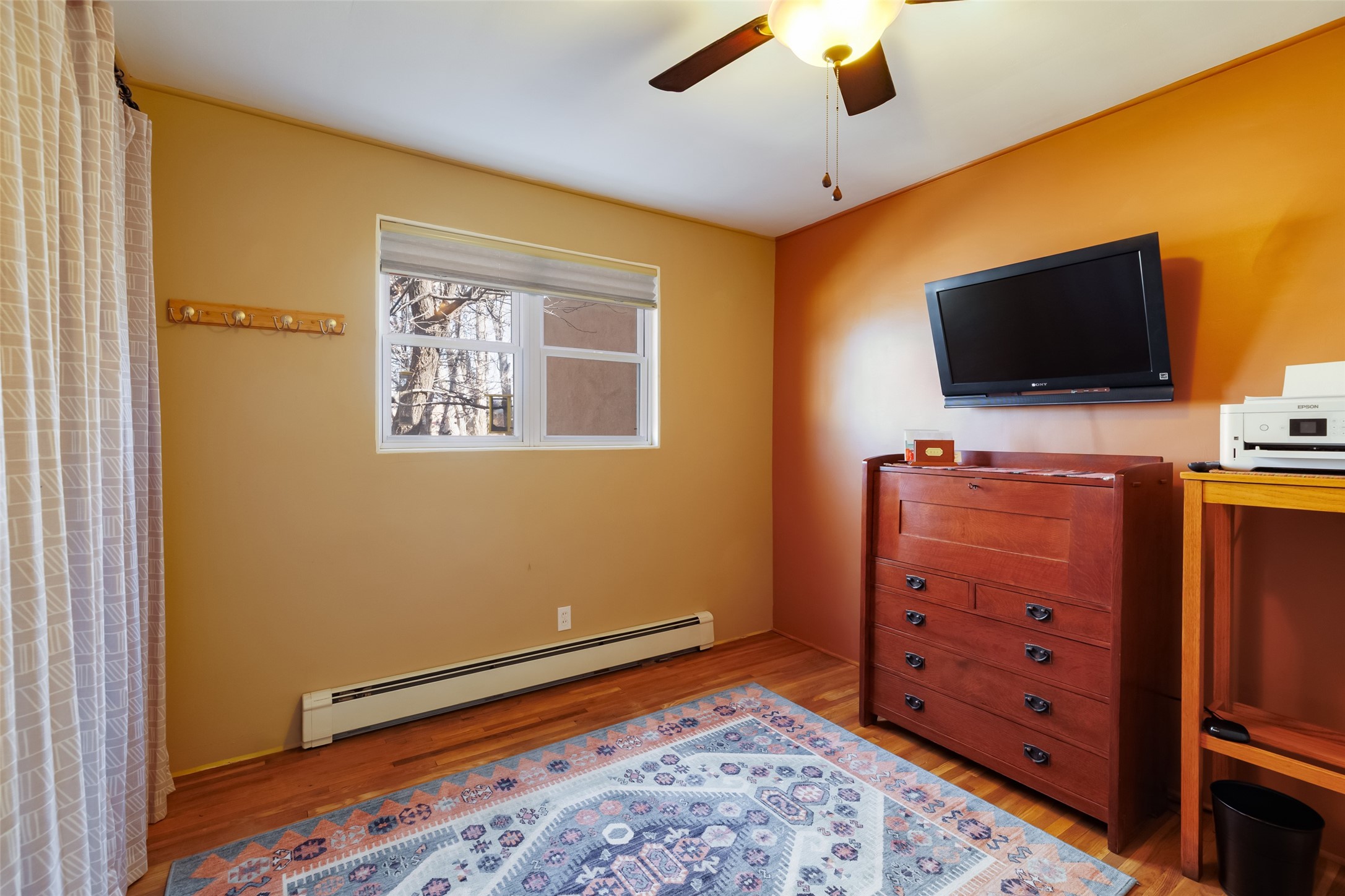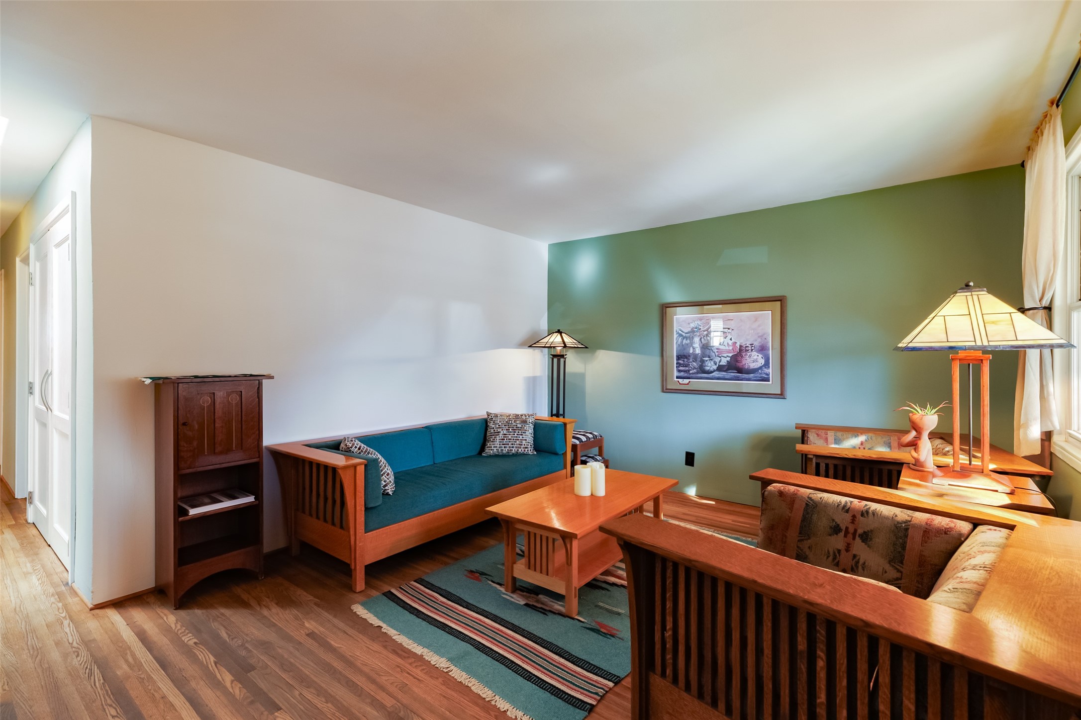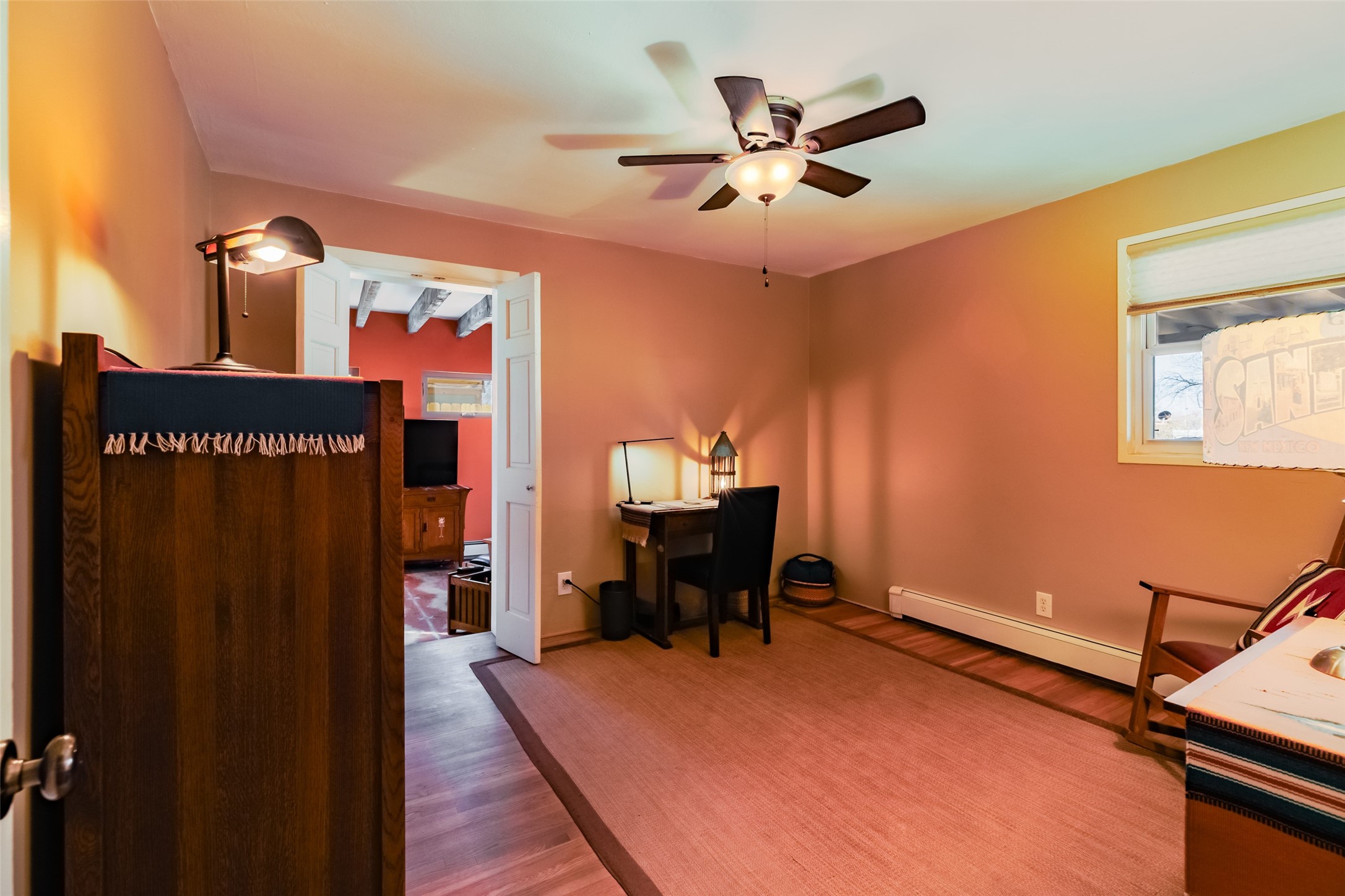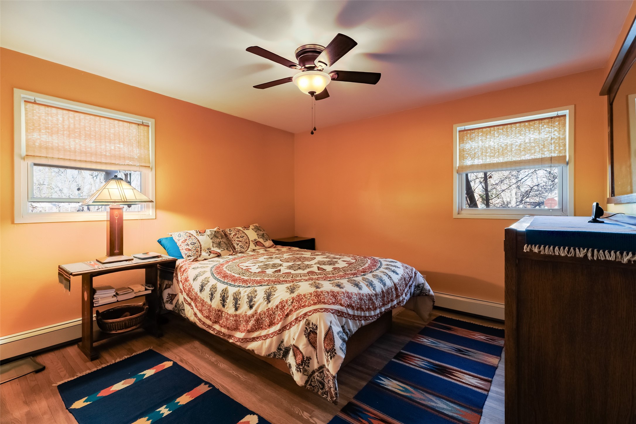 Charming single-level home located in a very Casa Alegra neighborhood. Convenient access to shopping and restaurants and Santa Fe River Trail and Acequia Trail both lead to the rail yard and downtown. Situated on a corner lot, the property features a spacious backyard and a covered portal ideal for outdoor entertaining. With three bedrooms and two bathrooms, and extra room that makes a great office or hobby room. The home also includes a cozy den with a Kiva fireplace. Enjoy year-round comfort with refrigerated air and mini-split cooling, plus the added benefit of solar panels.Key features include beautiful oak wood floors and tile throughout. The kitchen boasts red birch shaker-style cabinets with soft-close drawers and doors, along with pull-out drawers in both lower cabinets and the pantry. A pull-out trash/recycling system enhances convenience. The kitchen, laundry room, and bathrooms feature elegant Cambria quartz countertops. The third bedroom, which offers a private outdoor patio and a separate entrance, also has a spacious closet and could easily serve as a home office.