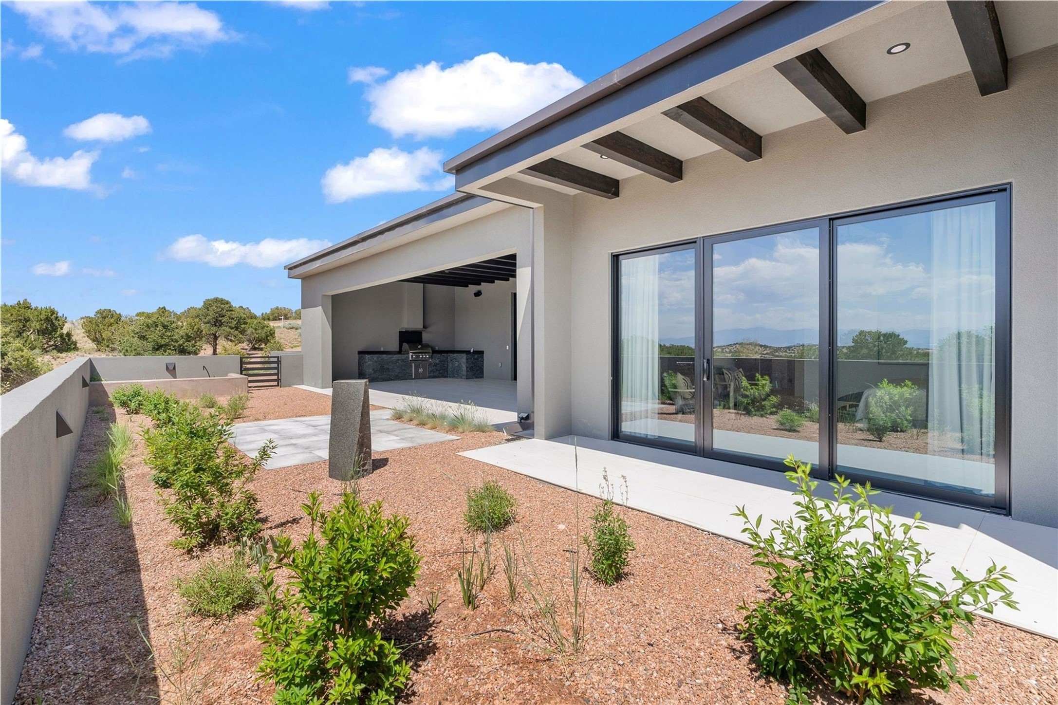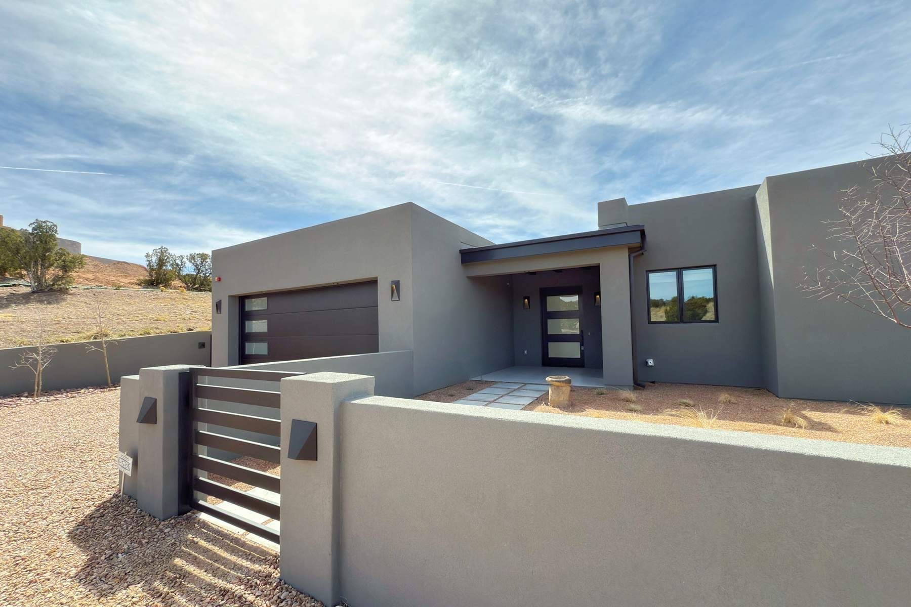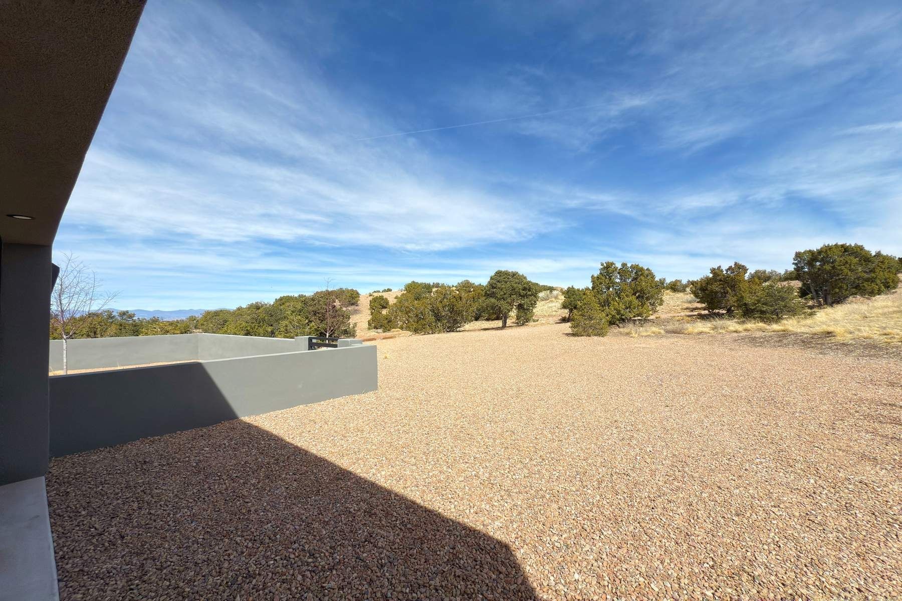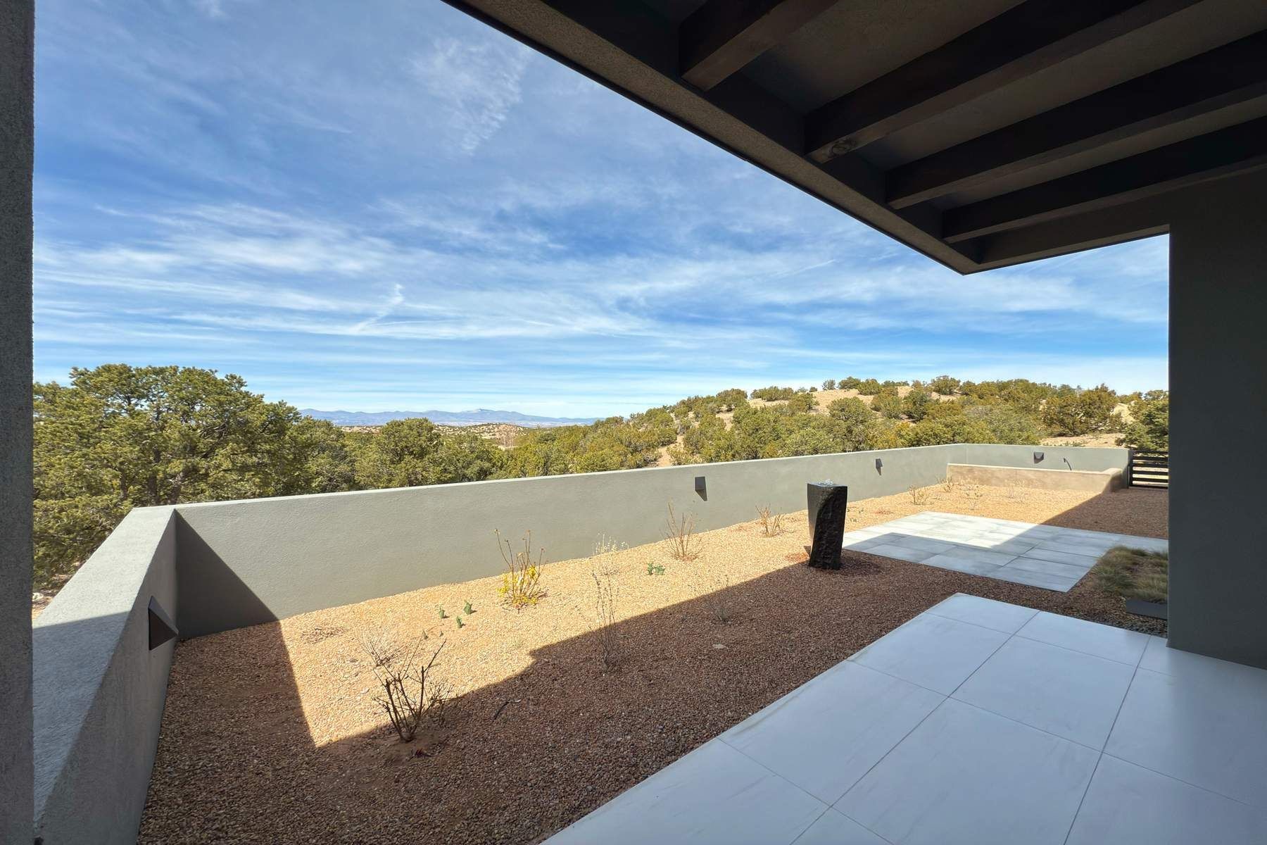 Experience contemporary living in this stunning 2023 home built by David Cordova. Nestled on 2.64 acres in Sundance Ridge. Spanning approximately 2,775 sq. ft., this 3-bedroom, 3-bathroom residence offers seclusion and privacy while being just a 17-minute drive to the Santa Fe Plaza. The living room boasts high ceilings, a beautiful accent wall with a gas fireplace, and built-in shelves, creating a refined yet cozy ambiance. Step outside to take in breathtaking sunset views over the Jemez Mountains from the covered portals and walled outdoor spaces. Entertain with ease in the outdoor kitchen, while the large walk-in butler's pantry with a second refrigerator makes hosting large gatherings a breeze. Or unwind amid the tranquil setting, surrounded by mature trees and nature. Designed for seamless indoor-outdoor living, the primary suite features large sliding doors that open to a private patio, perfect for enjoying the natural surroundings. A gas fireplace with a striking accent wall adds warmth and elegance to the space. A bonus feature is the radiant floor heated garage. More than $100K invested in upgrades--including landscaping, yard walls, garage floor finish, and a custom fountain--makes this better than new. The home has never been occupied and is truly a turn-key property. This exquisite home blends modern comfort with the serenity of Santa Fe's landscape--don't miss the chance to make it yours.