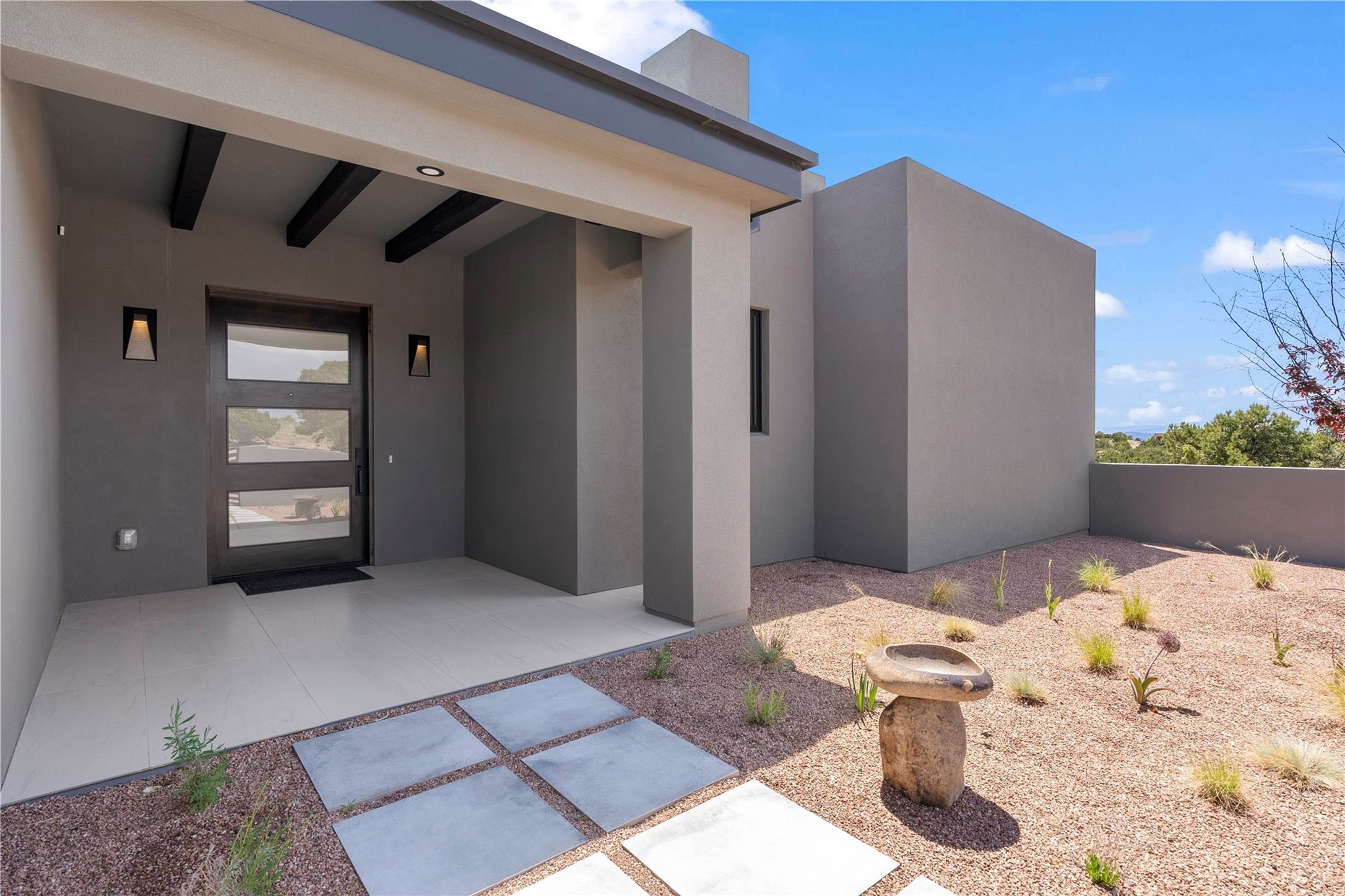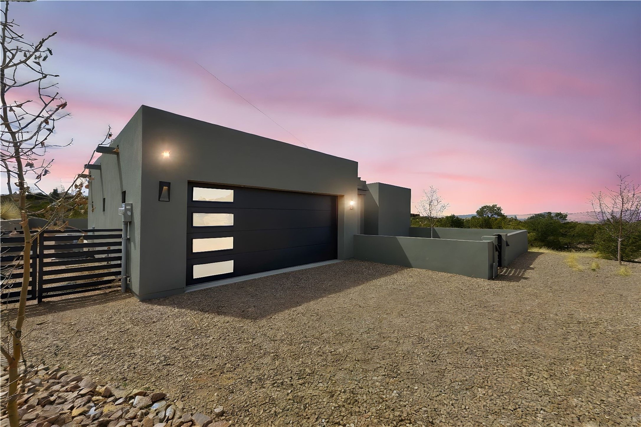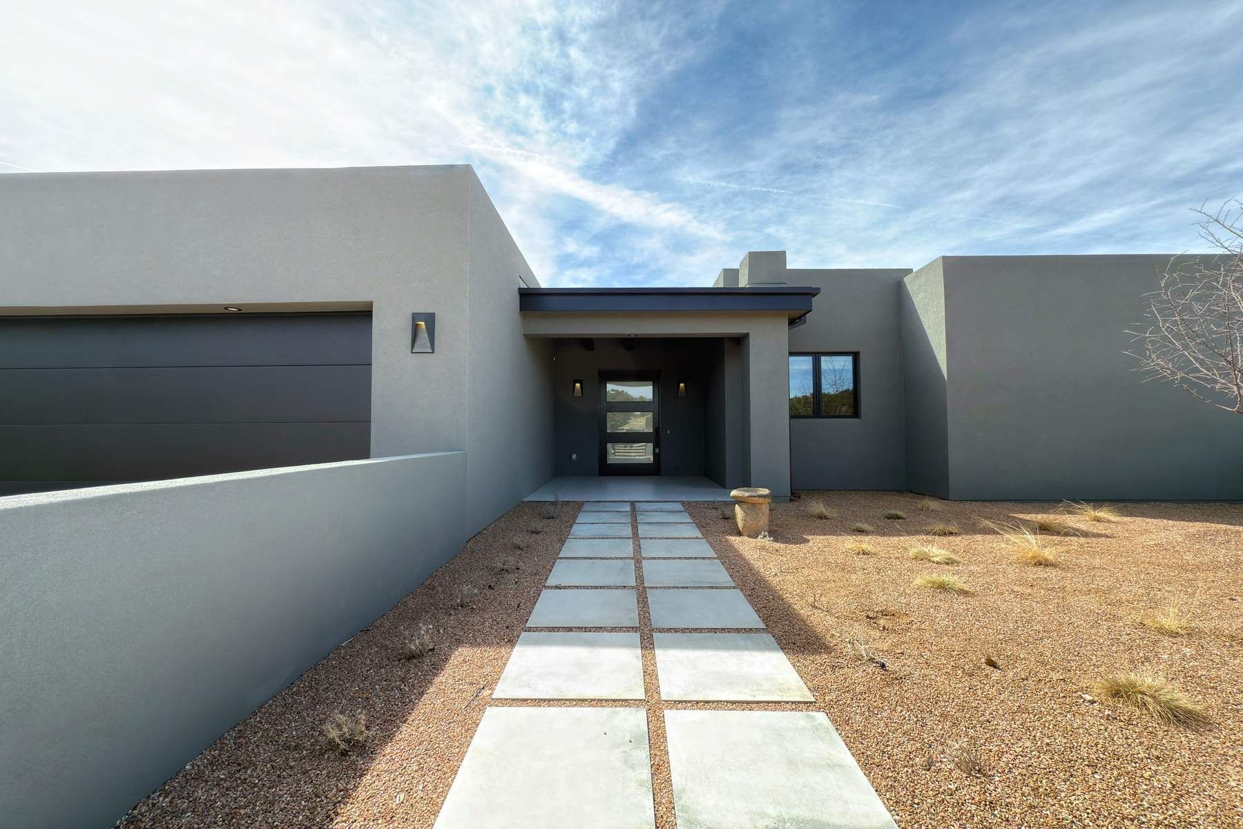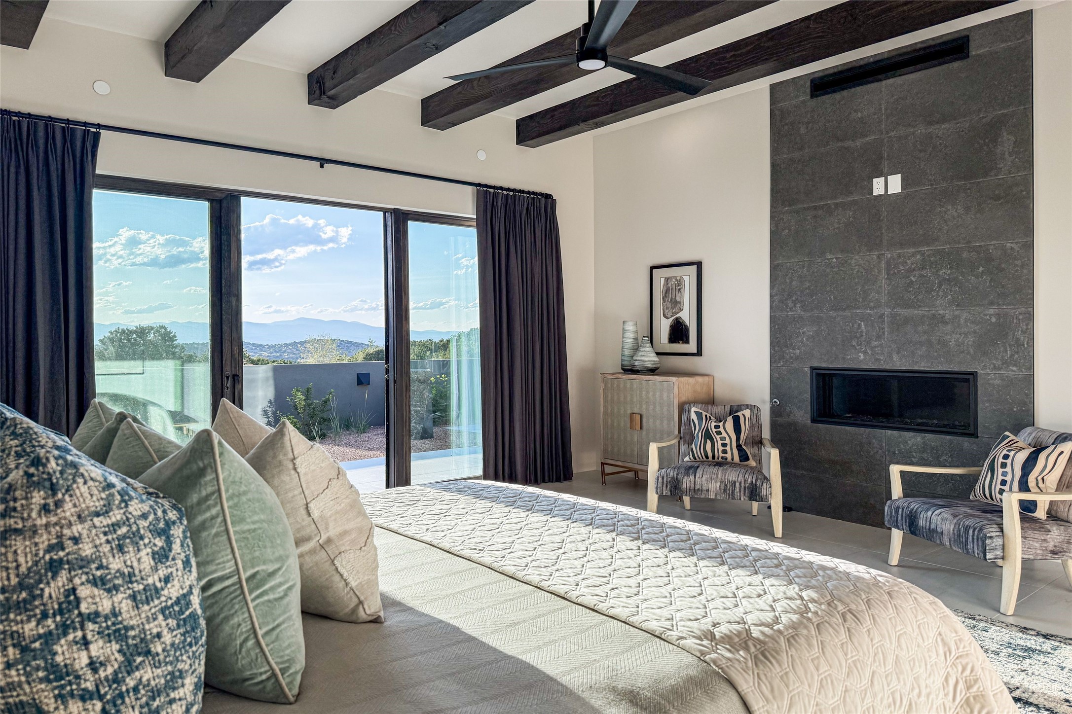 Experience contemporary living in this stunning 2023 home built by David Cordova. Nestled on 2.64 acres in Sundance Ridge. Spanning approximately 2,775 sq. ft., this 3-bedroom, 3-bathroom residence offers seclusion and privacy while being just a 17-minute drive to the Santa Fe Plaza. The living room boasts high ceilings, a beautiful accent wall with a gas fireplace, and built-in shelves, creating a refined yet cozy ambiance. Step outside to take in breathtaking sunset views over the Jemez Mountains from the covered portals and walled outdoor spaces. Entertain with ease in the outdoor kitchen, while the large walk-in butler's pantry with a second refrigerator makes hosting large gatherings a breeze. Or unwind amid the tranquil setting, surrounded by mature trees and nature. Designed for seamless indoor-outdoor living, the primary suite features large sliding doors that open to a private patio, perfect for enjoying the natural surroundings. A gas fireplace with a striking accent wall adds warmth and elegance to the space. A bonus feature is the radiant floor heated garage. More than $100K invested in upgrades--including landscaping, yard walls, garage floor finish, and a custom fountain--makes this better than new. The home has never been occupied and is truly a turn-key property. This exquisite home blends modern comfort with the serenity of Santa Fe's landscape--don't miss the chance to make it yours.