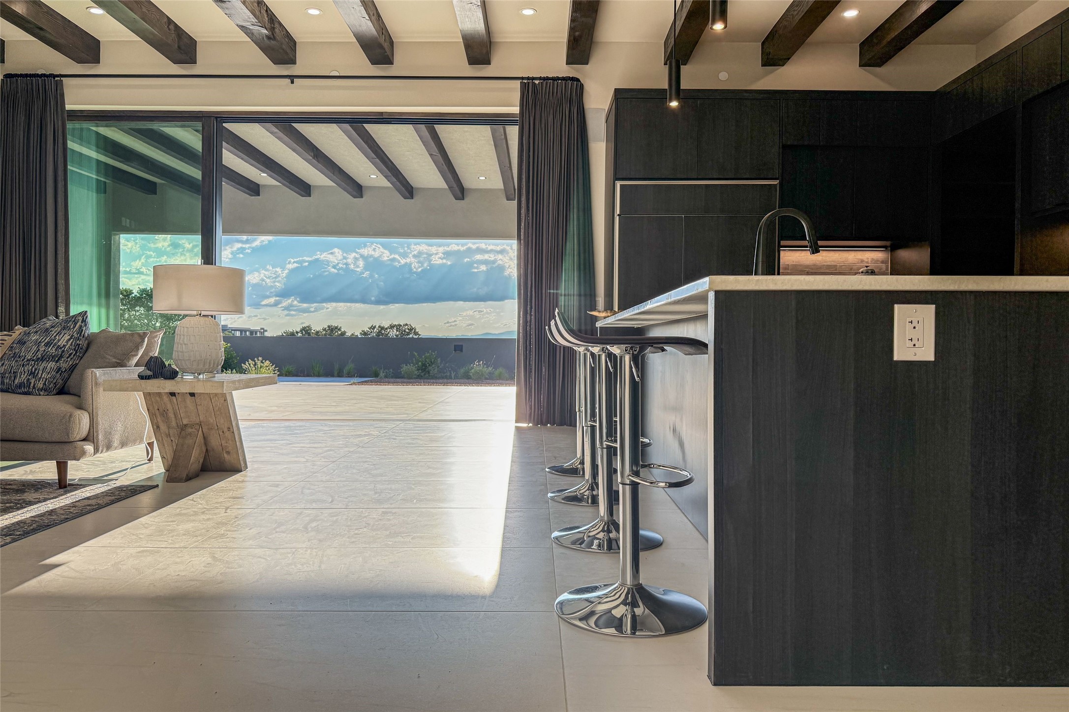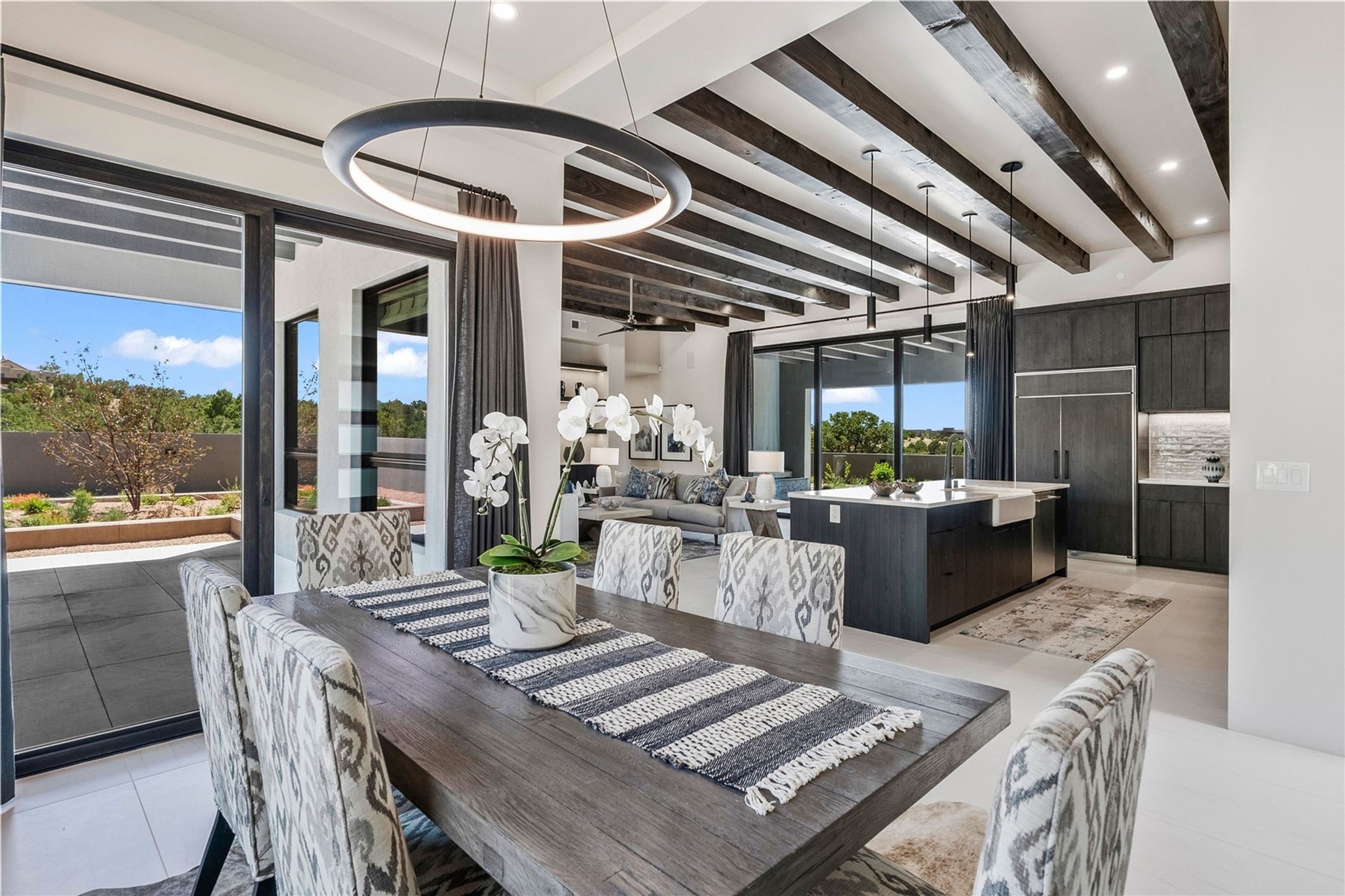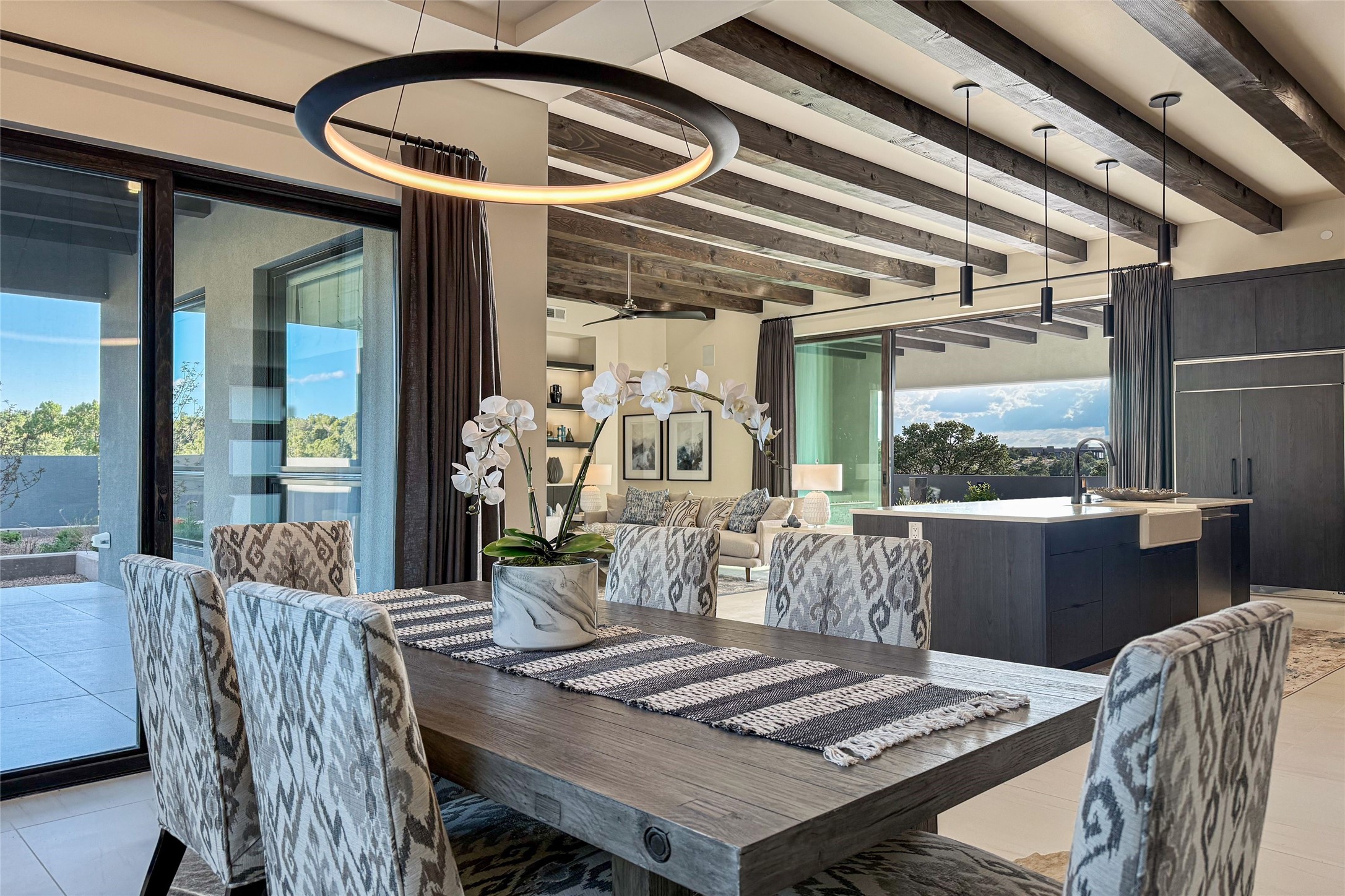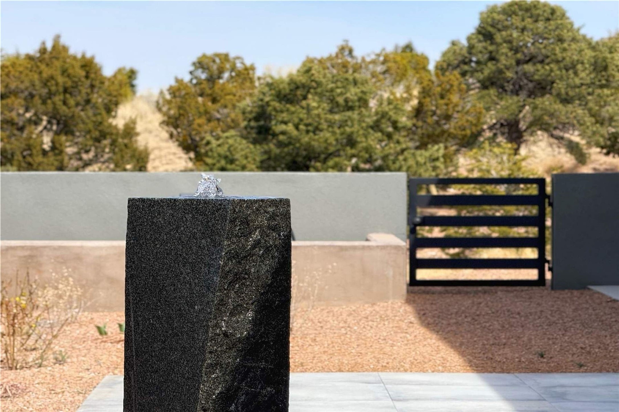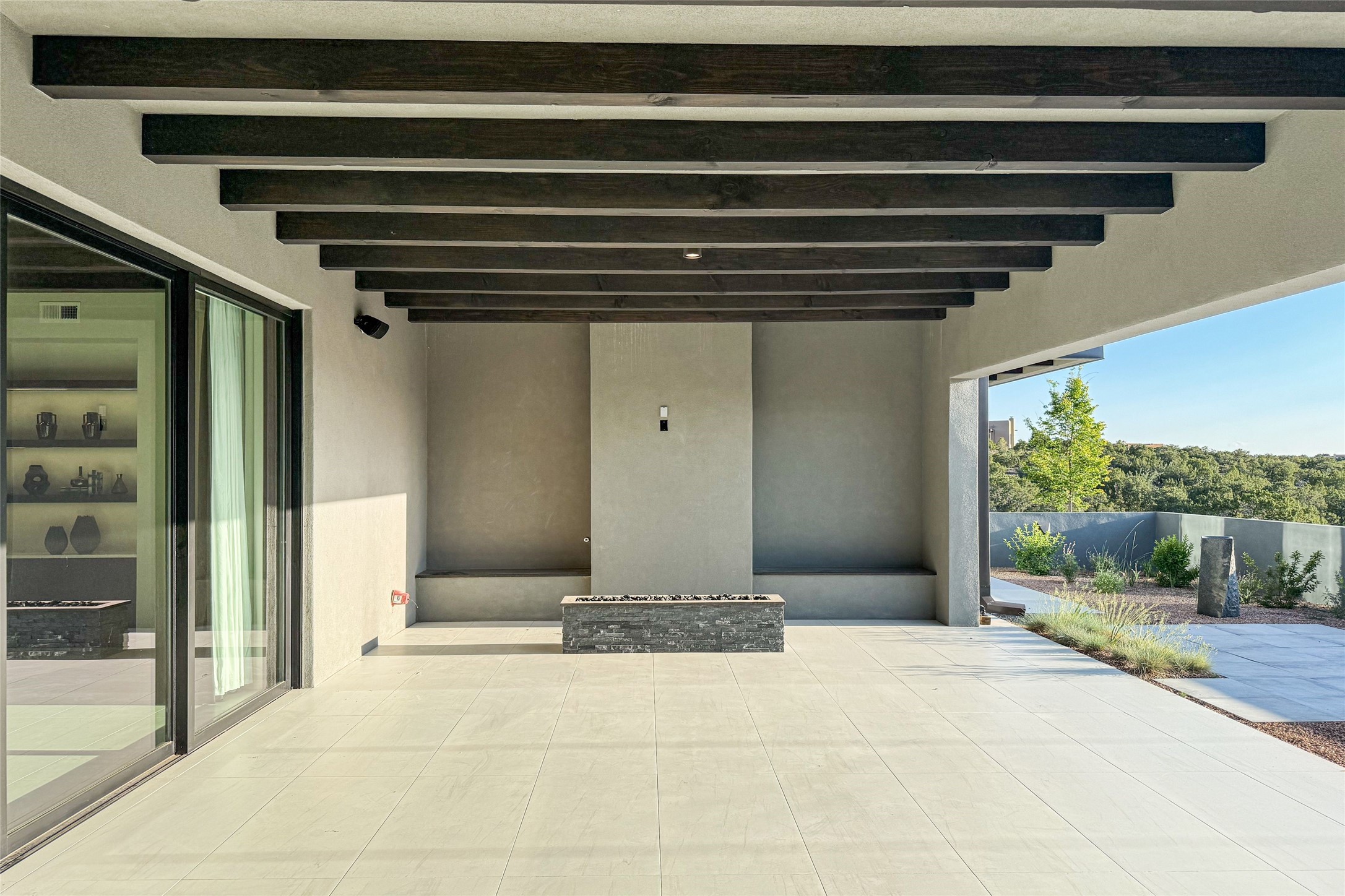 Experience contemporary living in this stunning 2023 home built by David Cordova. Nestled on 2.64 acres in Sundance Ridge. Spanning approximately 2,775 sq. ft., this 3-bedroom, 3-bathroom residence offers seclusion and privacy while being just a 17-minute drive to the Santa Fe Plaza. The living room boasts high ceilings, a beautiful accent wall with a gas fireplace, and built-in shelves, creating a refined yet cozy ambiance. Step outside to take in breathtaking sunset views over the Jemez Mountains from the covered portals and walled outdoor spaces. Entertain with ease in the outdoor kitchen, while the large walk-in butler's pantry with a second refrigerator makes hosting large gatherings a breeze. Or unwind amid the tranquil setting, surrounded by mature trees and nature. Designed for seamless indoor-outdoor living, the primary suite features large sliding doors that open to a private patio, perfect for enjoying the natural surroundings. A gas fireplace with a striking accent wall adds warmth and elegance to the space. A bonus feature is the radiant floor heated garage. More than $100K invested in upgrades--including landscaping, yard walls, garage floor finish, and a custom fountain--makes this better than new. The home has never been occupied and is truly a turn-key property. This exquisite home blends modern comfort with the serenity of Santa Fe's landscape--don't miss the chance to make it yours.