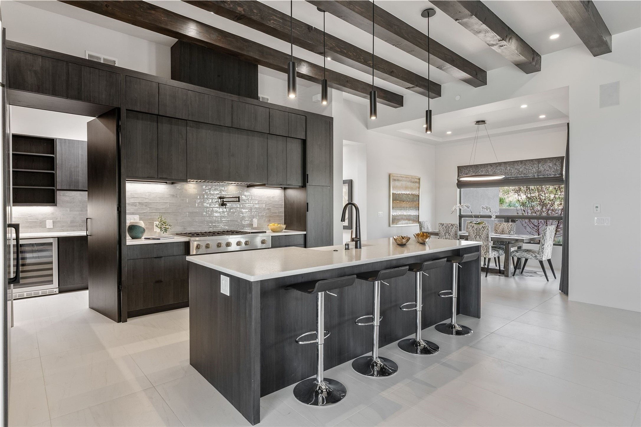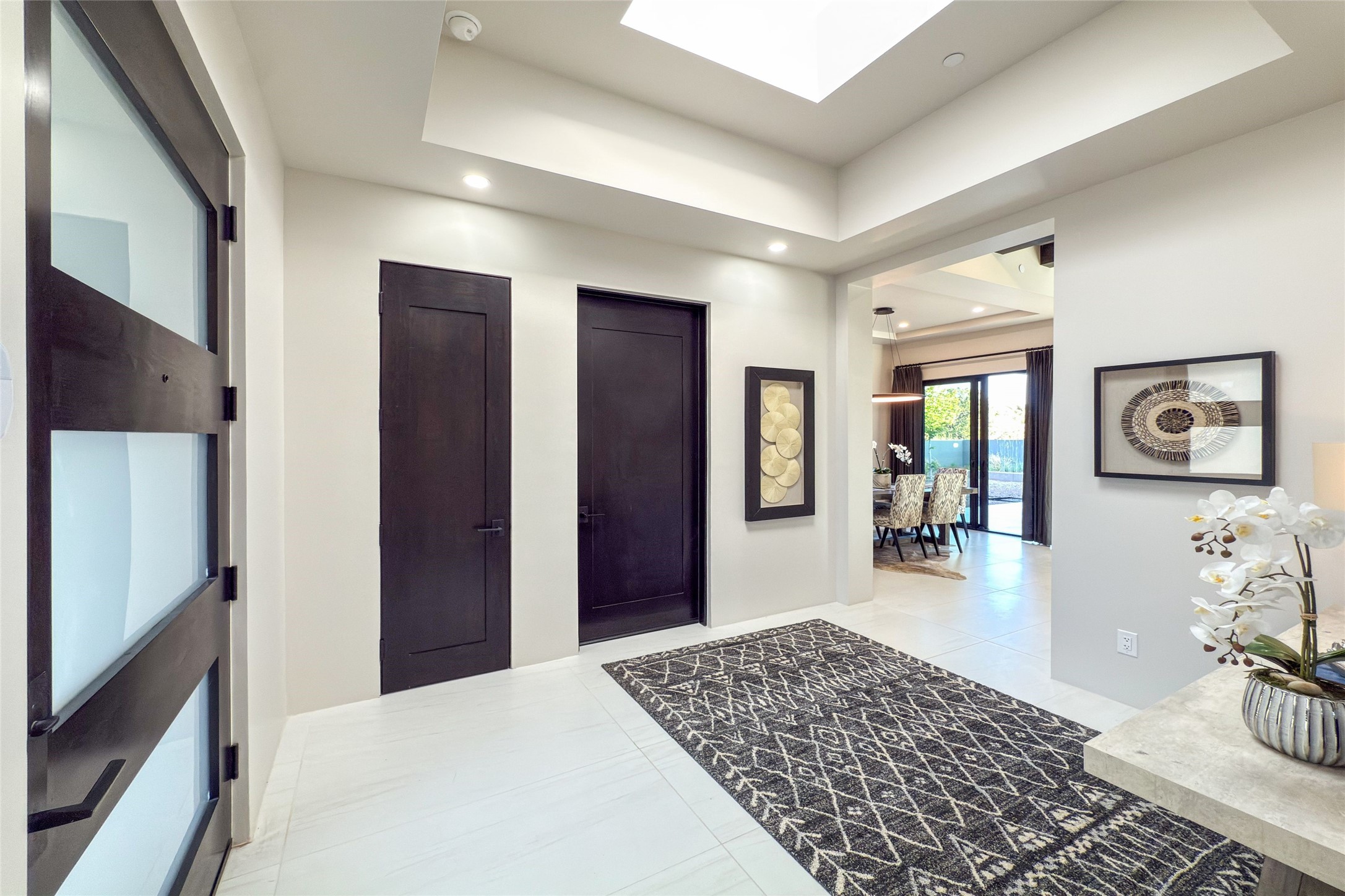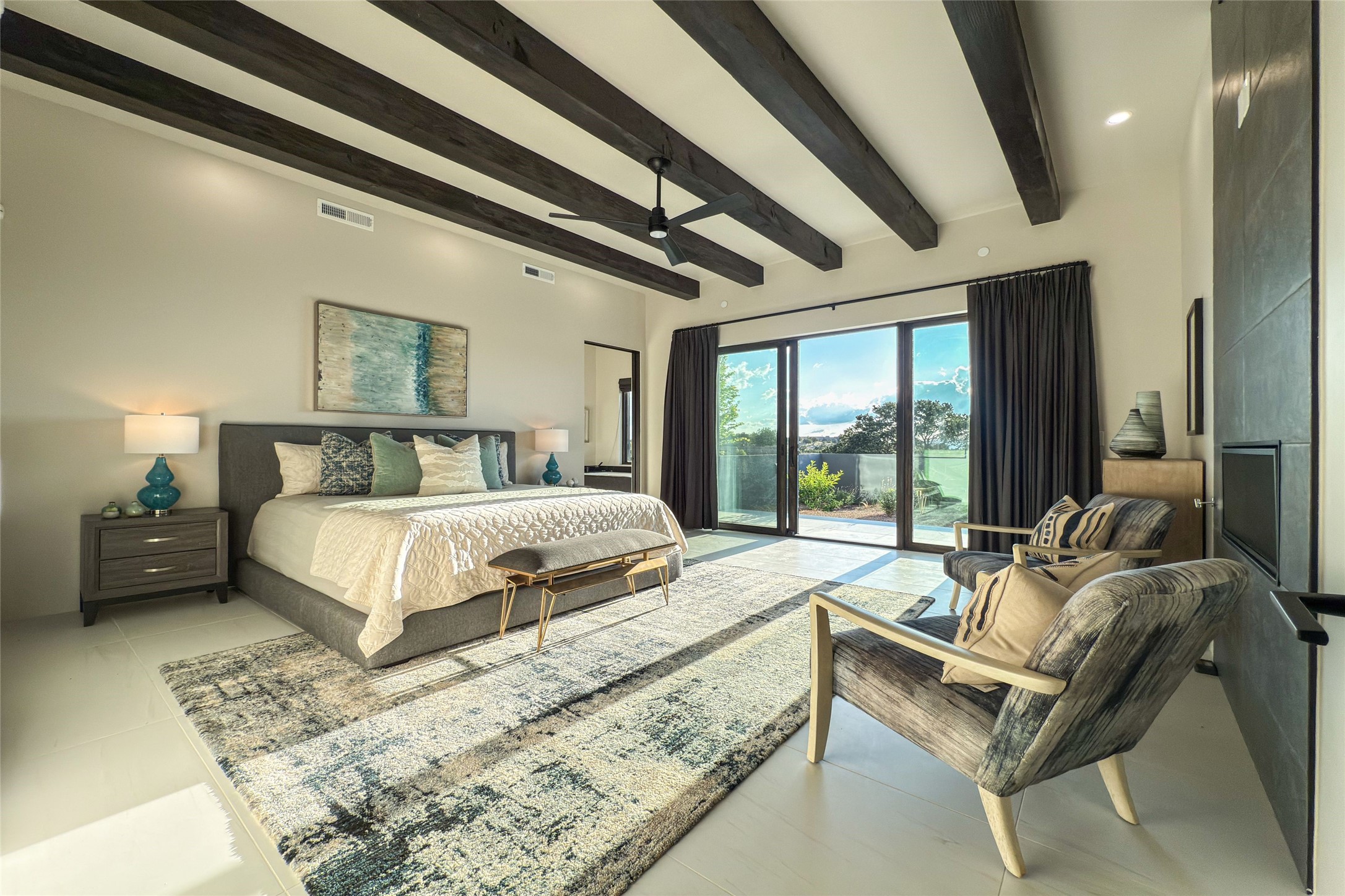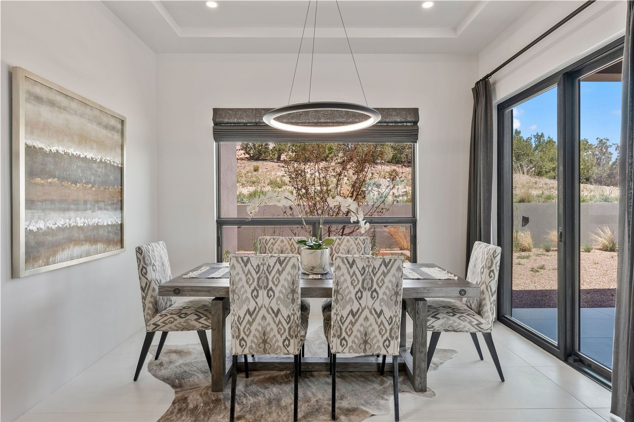 Experience contemporary living in this stunning 2023 home built by David Cordova. Nestled on 2.64 acres in Sundance Ridge. Spanning approximately 2,775 sq. ft., this 3-bedroom, 3-bathroom residence offers seclusion and privacy while being just a 17-minute drive to the Santa Fe Plaza. The living room boasts high ceilings, a beautiful accent wall with a gas fireplace, and built-in shelves, creating a refined yet cozy ambiance. Step outside to take in breathtaking sunset views over the Jemez Mountains from the covered portals and walled outdoor spaces. Entertain with ease in the outdoor kitchen, while the large walk-in butler's pantry with a second refrigerator makes hosting large gatherings a breeze. Or unwind amid the tranquil setting, surrounded by mature trees and nature. Designed for seamless indoor-outdoor living, the primary suite features large sliding doors that open to a private patio, perfect for enjoying the natural surroundings. A gas fireplace with a striking accent wall adds warmth and elegance to the space. A bonus feature is the radiant floor heated garage. More than $100K invested in upgrades--including landscaping, yard walls, garage floor finish, and a custom fountain--makes this better than new. The home has never been occupied and is truly a turn-key property. This exquisite home blends modern comfort with the serenity of Santa Fe's landscape--don't miss the chance to make it yours.