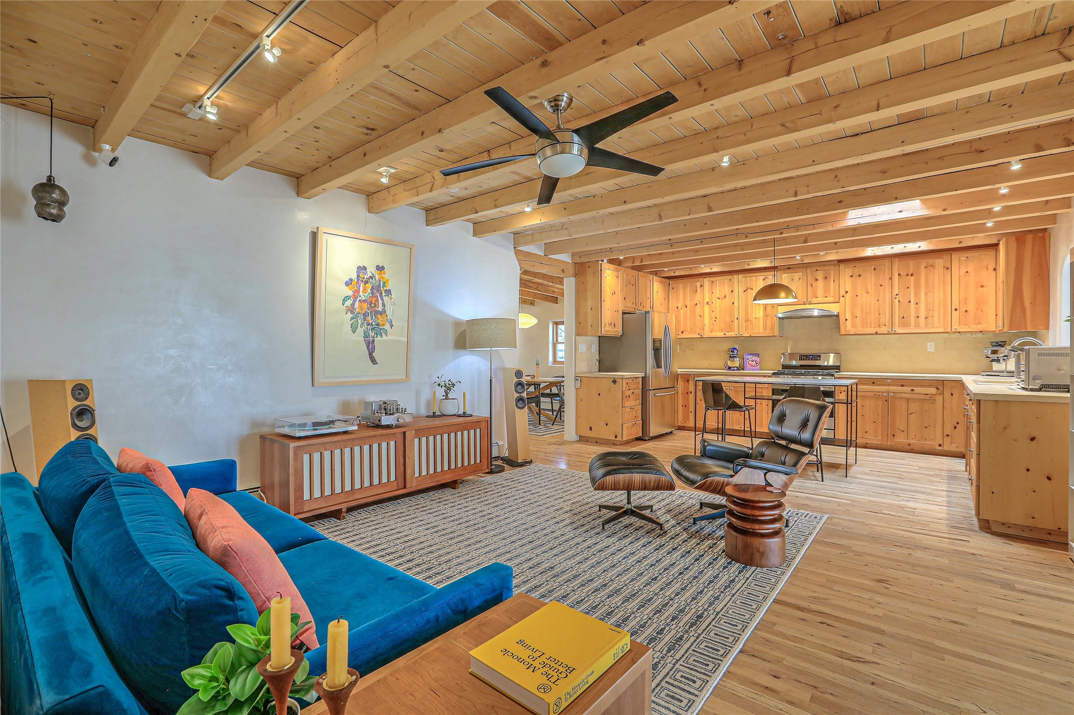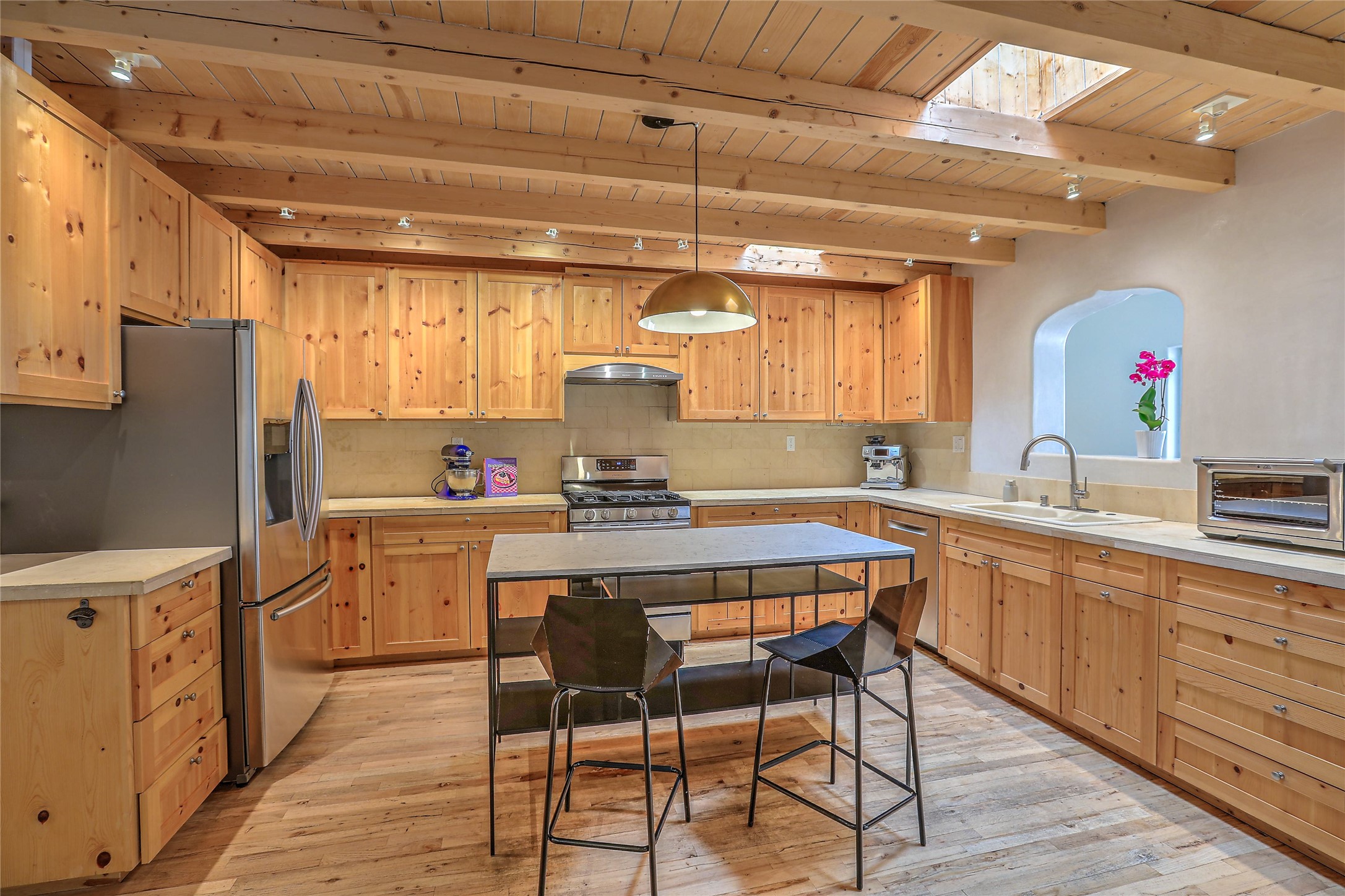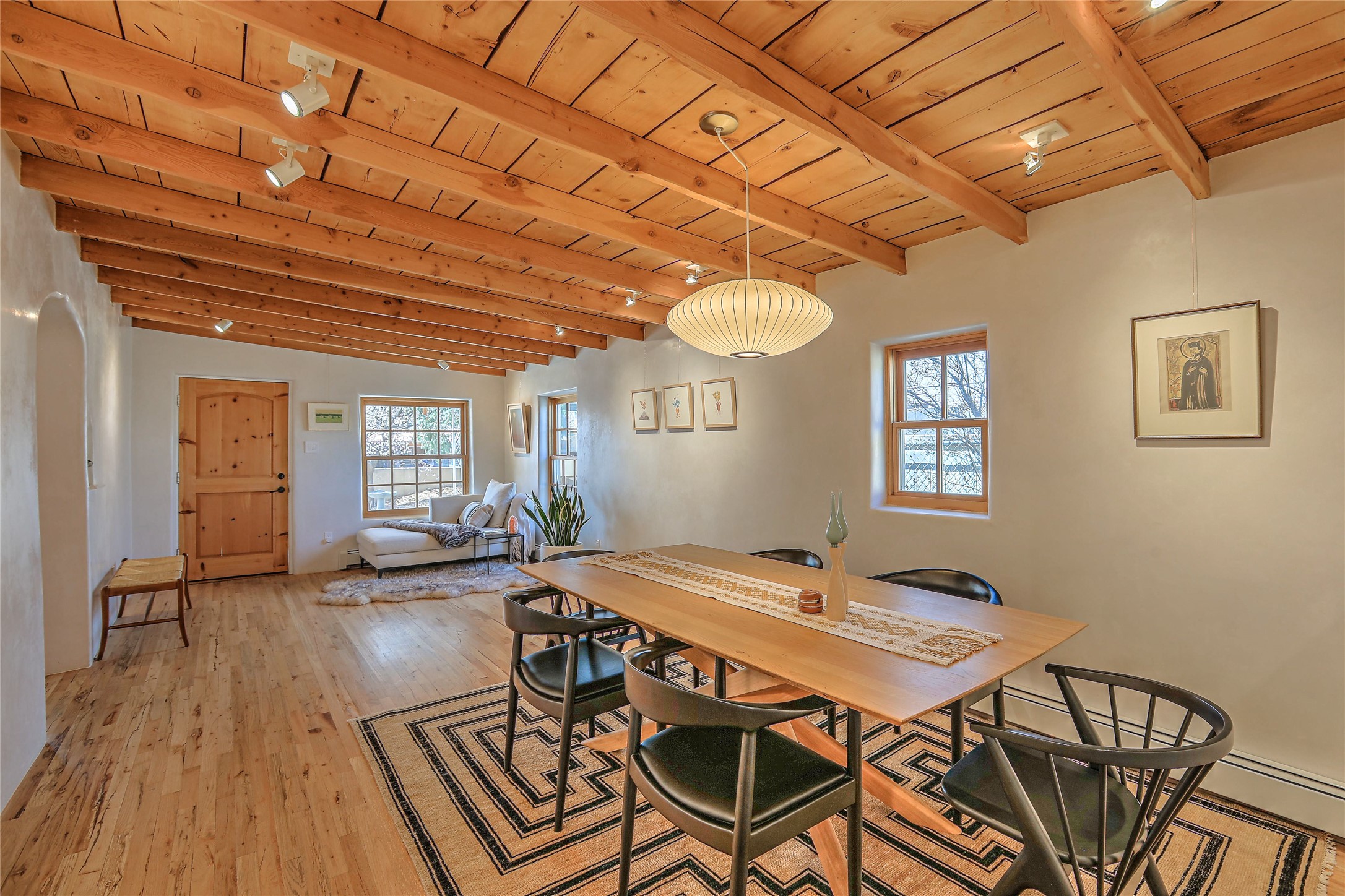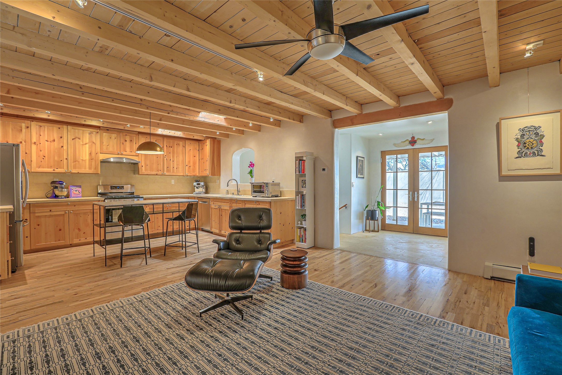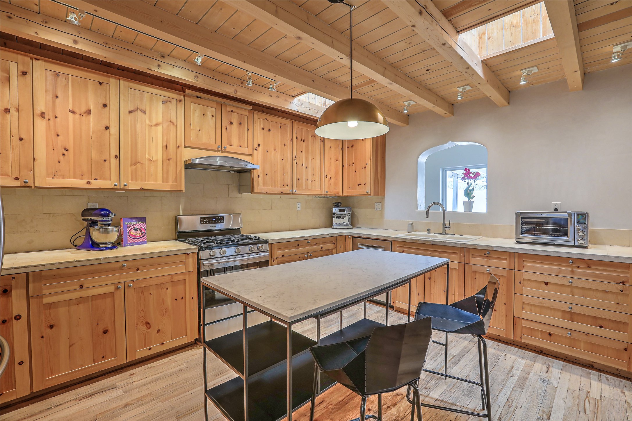 Welcome to your dream retreat in the charming St. Anne's Neighborhood! This beautifully remodeled home is nestled amidst the artistic spirit of Santa Fe, close to the Baca Art District and bustling Railyard. Step inside to discover a delightful blend of historic Santa Fe charm and modern flair, featuring stunning wood ceilings, decorative Spanish nichos, and an open concept kitchen that flows into the living room. Enjoy the abundance of natural light from skylights and relax in the finished basement or the serene walled backyard. The covered porch sets the stage for outdoor gatherings, making this home perfect for entertaining or simply unwinding in your own tranquil escape.