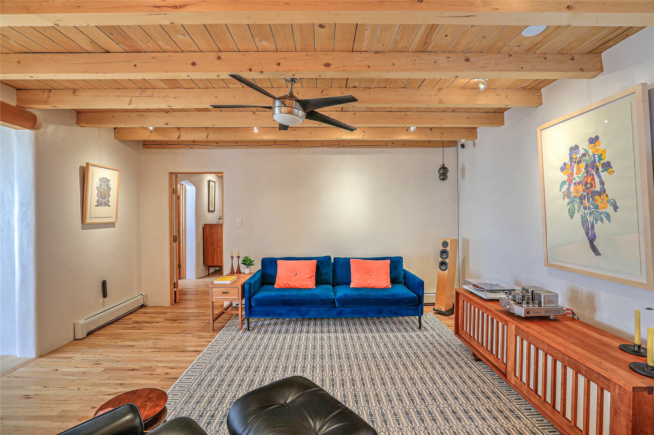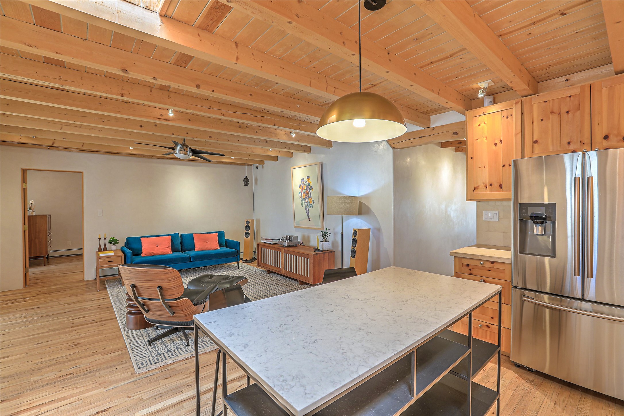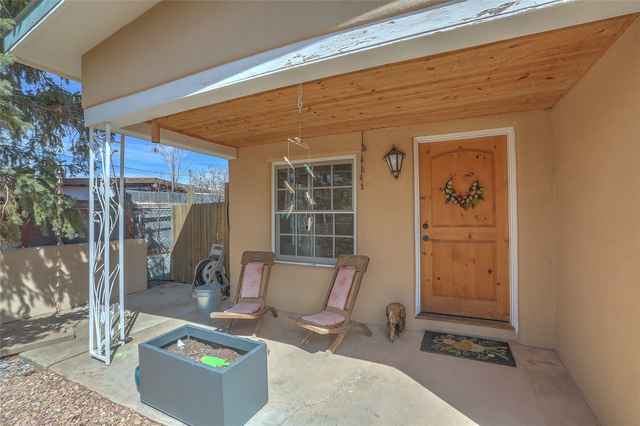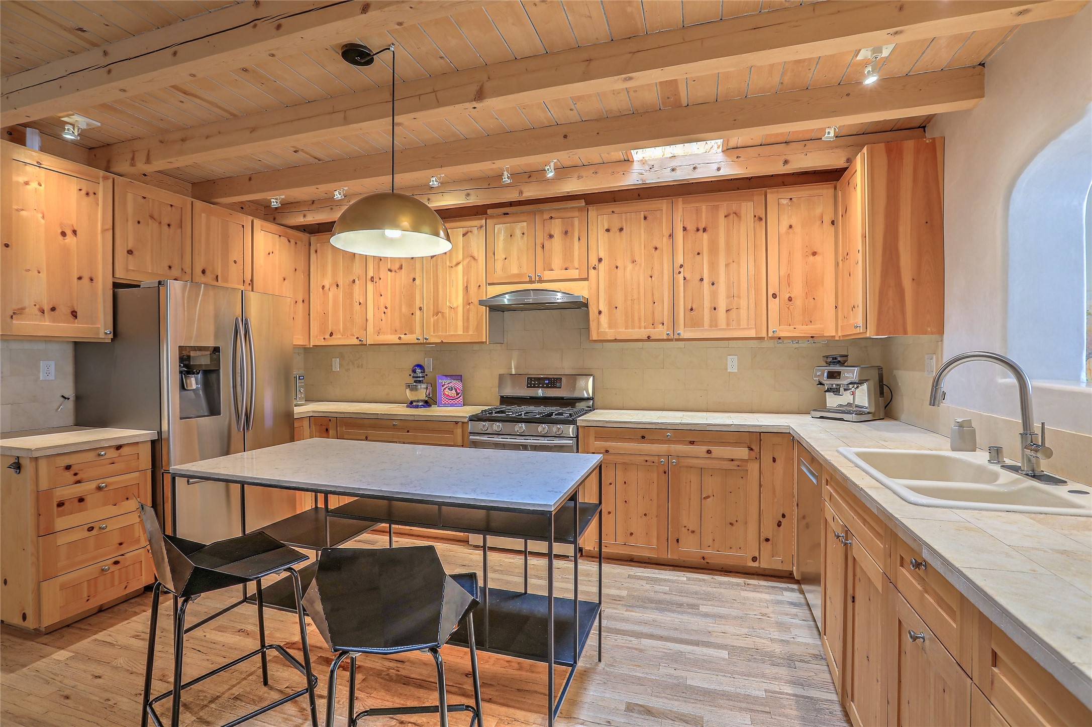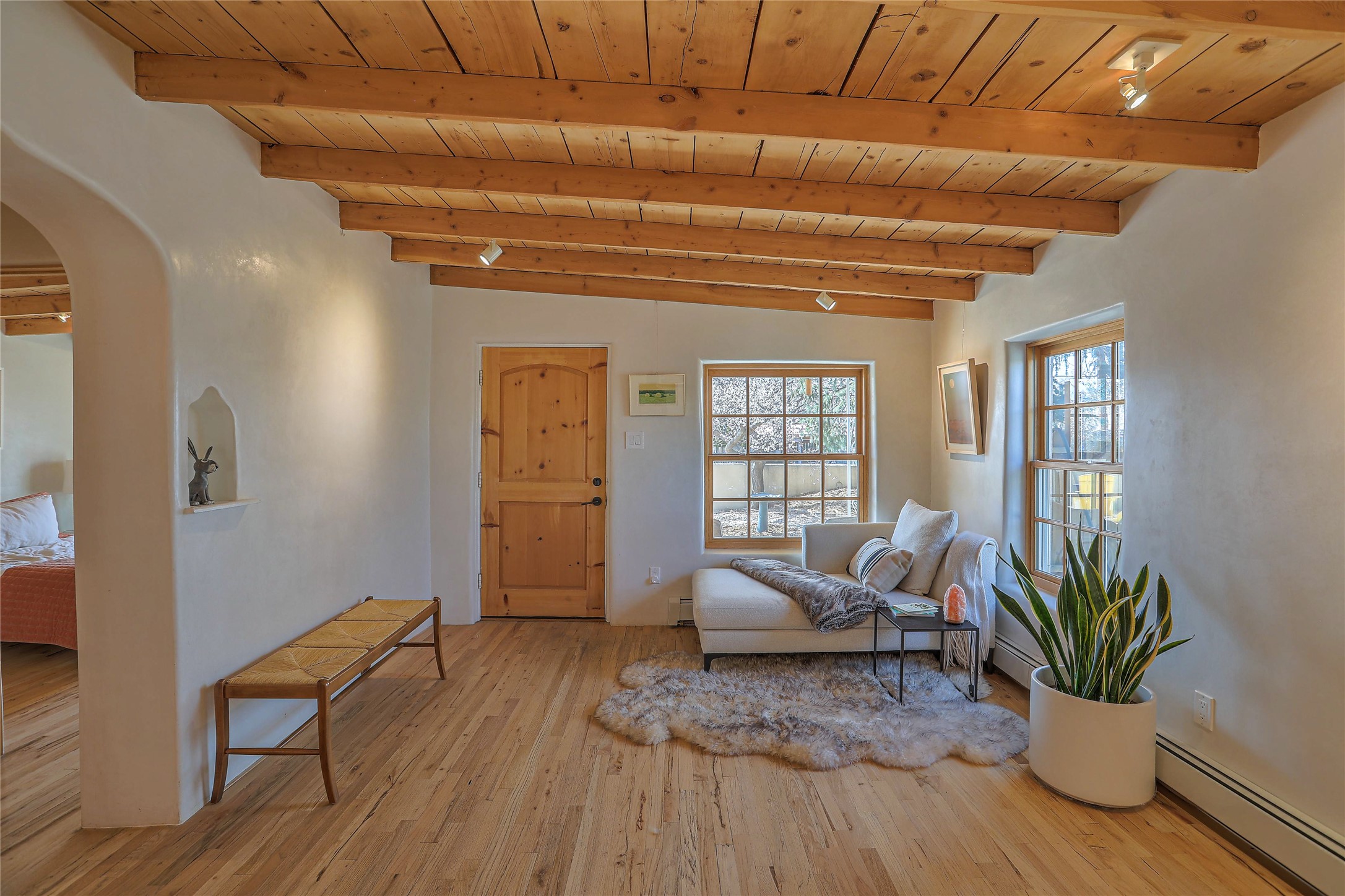 Welcome to your dream retreat in the charming St. Anne's Neighborhood! This beautifully remodeled home is nestled amidst the artistic spirit of Santa Fe, close to the Baca Art District and bustling Railyard. Step inside to discover a delightful blend of historic Santa Fe charm and modern flair, featuring stunning wood ceilings, decorative Spanish nichos, and an open concept kitchen that flows into the living room. Enjoy the abundance of natural light from skylights and relax in the finished basement or the serene walled backyard. The covered porch sets the stage for outdoor gatherings, making this home perfect for entertaining or simply unwinding in your own tranquil escape.