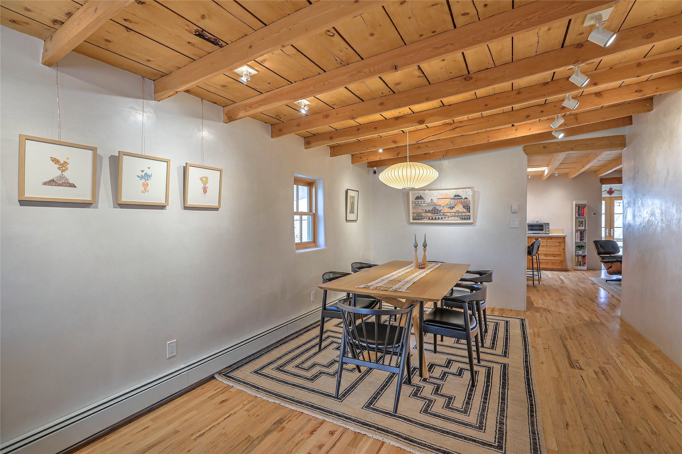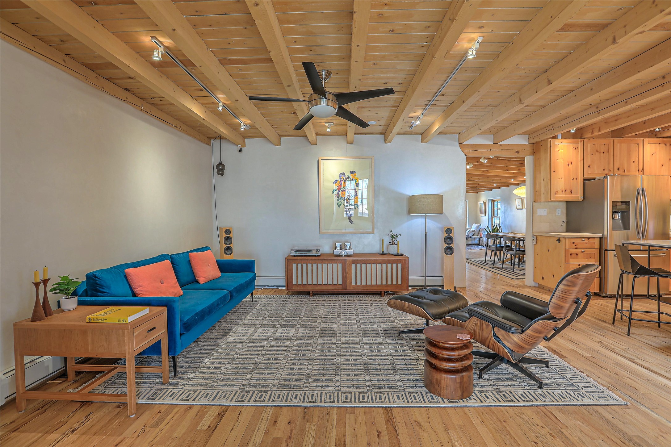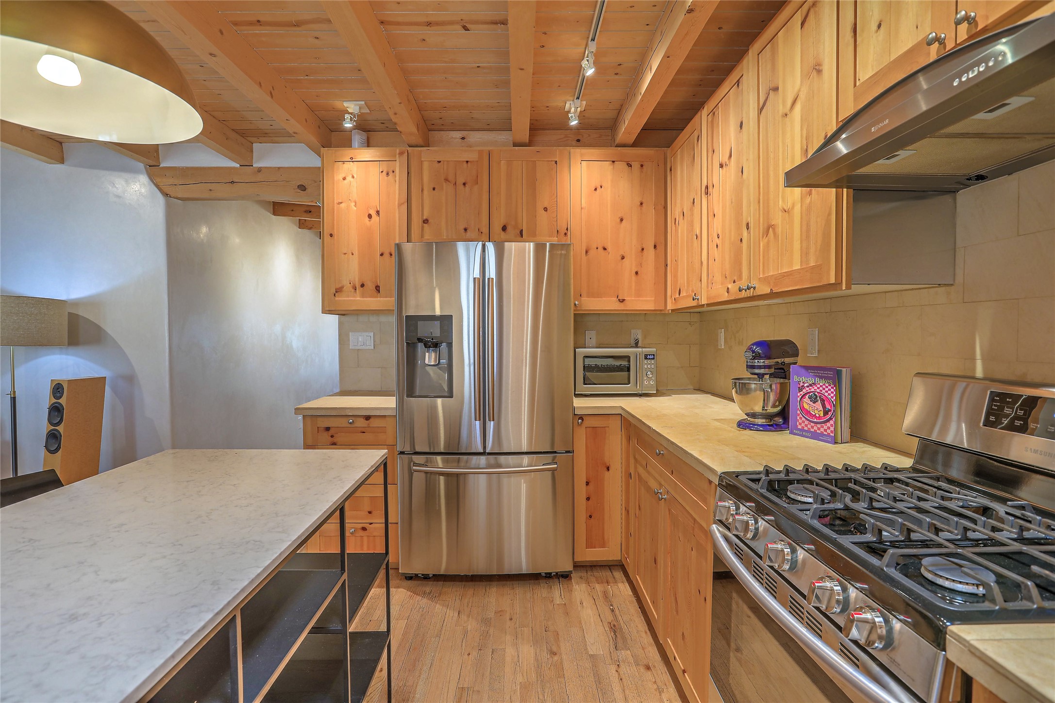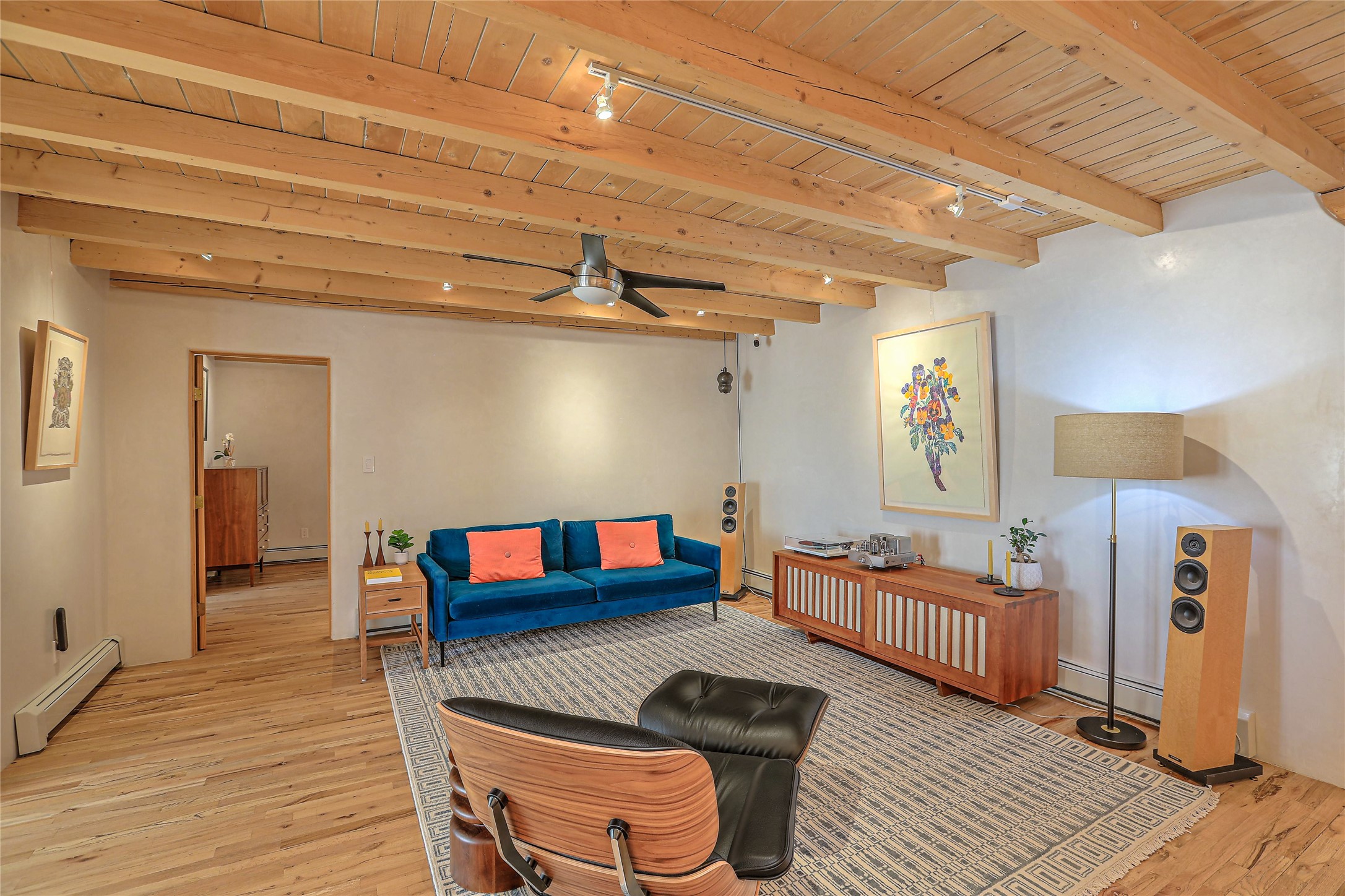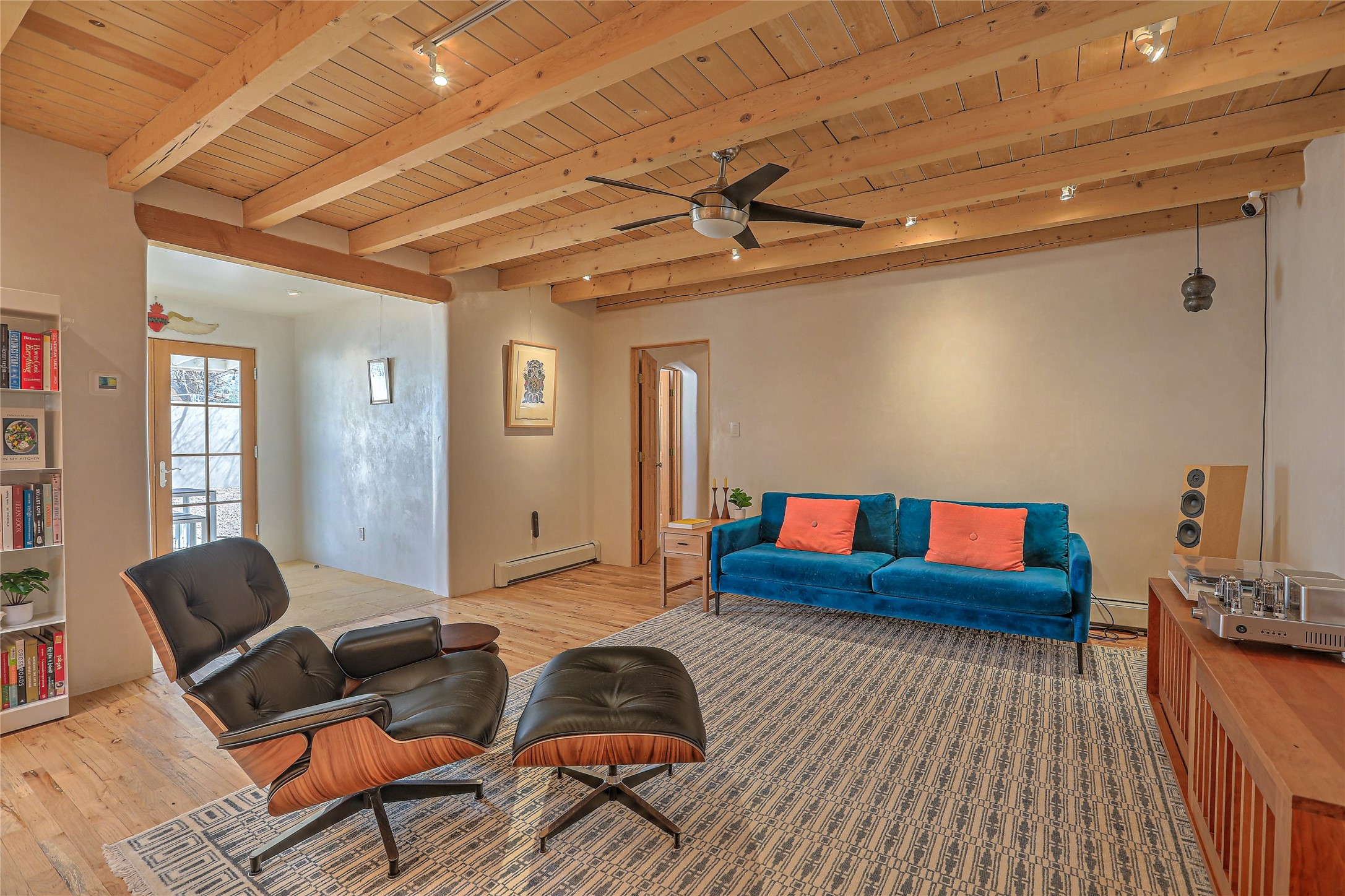 Welcome to your dream retreat in the charming St. Anne's Neighborhood! This beautifully remodeled home is nestled amidst the artistic spirit of Santa Fe, close to the Baca Art District and bustling Railyard. Step inside to discover a delightful blend of historic Santa Fe charm and modern flair, featuring stunning wood ceilings, decorative Spanish nichos, and an open concept kitchen that flows into the living room. Enjoy the abundance of natural light from skylights and relax in the finished basement or the serene walled backyard. The covered porch sets the stage for outdoor gatherings, making this home perfect for entertaining or simply unwinding in your own tranquil escape.