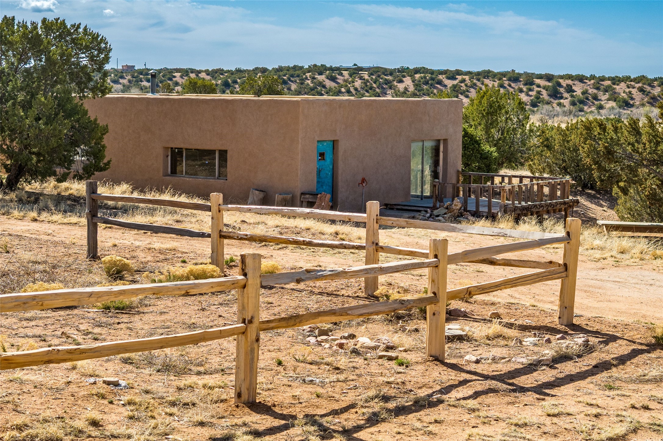 This delightful and versatile property spans over 10 acres and horses are allowed. It features a spacious main house with an attached apartment and a detached garage/workshop. Tucked away from the road for enhanced privacy, the property offers stunning views of the surrounding mountains. Enjoy the Ortiz mountains from the south-facing covered portal or the great-room windows. The kitchen has been recently remodeled with Quartzite countertops, new appliances, and a large center island that opens to a warm and inviting living space with a cozy wood stove. Situated in the historic San Marcos Pueblo area, and just off the Turquoise Trail Scenic Byway, the property provides easy access to Santa Fe and Albuquerque. The main house and roof have added fire-protection features, which also adds additional insulation. The detached workshop, equipped with a bay door, serves as an excellent studio space or garage, complete with power and a wood stove for heating.