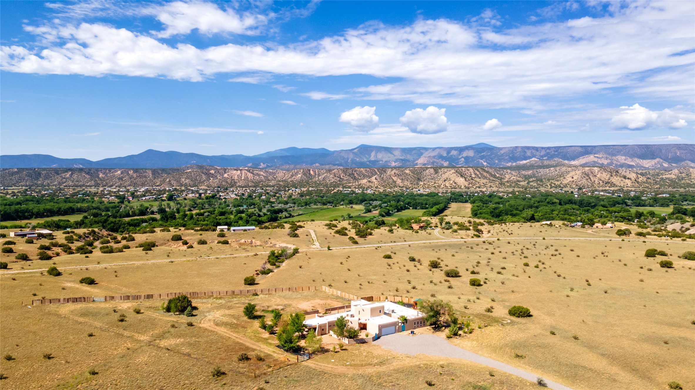 Centrally located between Los Alamos, Santa Fe, and Taos, this spacious 4-bed, 4-bath home on 5 acres offers peaceful family living in the heart of Medanales. With horses welcome and Abiquiu Lake and national forest lands just minutes away, it's an ideal setting for those who love space, nature, and quiet. Inside, classic Southwestern style shines through with brick floors, beamed ceilings, multiple wood stoves, two kiva fireplaces, and cozy radiant heat. With newly remodeled custom baths featuring walk-in showers, a generous kitchen, separate dining room, and a dedicated office, this home perfectly suited for both family life and remote work. Multiple courtyards provide serene outdoor living spaces, while a large covered portal with a Kiva fireplace invites year-round enjoyment. Sweeping mountain views complete this exceptional property--offering a private, charming retreat with room to roam.