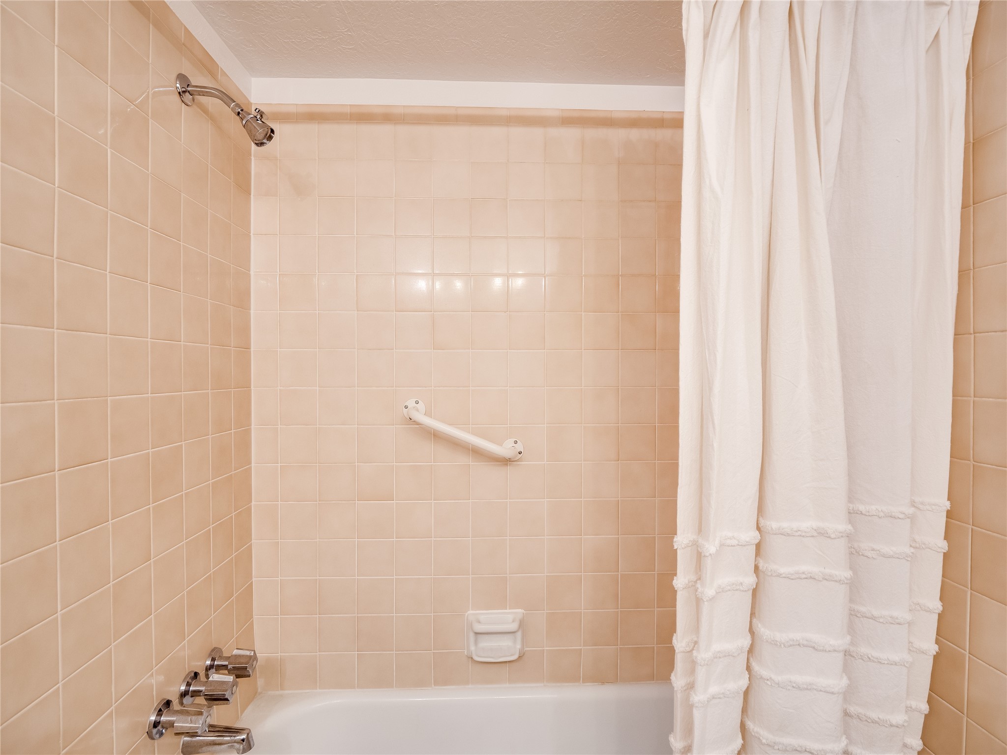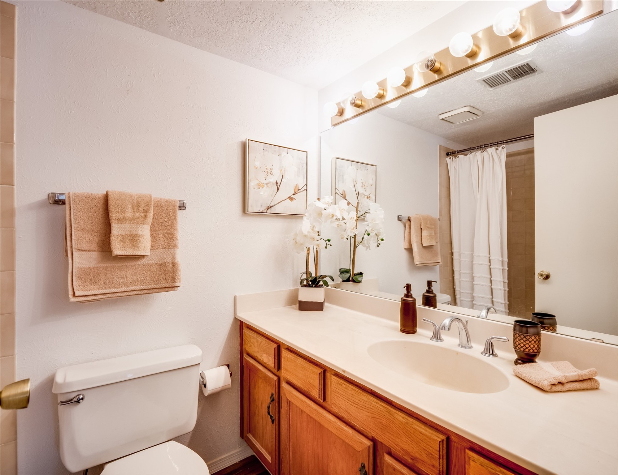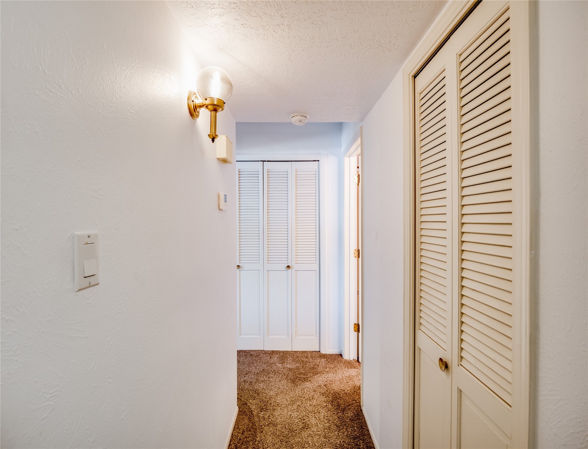 Welcome to this inviting two-story condo in the desirable Ridge Park community, offering serene treeline views from its second-floor location. Step inside to a welcoming entrance with tile flooring and a convenient coat closet. The spacious and inviting living room is the heart of the home, featuring soaring vaulted ceilings that enhance the open and airy feel. Plush carpeting adds warmth underfoot, while a wood-burning fireplace with a classic mantel serves as a cozy focal point, perfect for chilly evenings. Natural light streams in through large sliding glass doors, which lead to a covered deck, offering a peaceful outdoor retreat with treetop views. A striking spiral staircase adds architectural charm, leading to the loft-style primary suite on the second floor. The open-concept design seamlessly connects the living room to the dining area and kitchen, making the space perfect for both relaxing and entertaining. The bright galley-style kitchen features warm wood cabinetry, stylish black hardware, laminate flooring, and a passthrough window that doubles as bar seating. Just off the kitchen, you'll find a laundry closet with a stackable washer and dryer, plus built-in shelving for added convenience. A hallway with two additional storage closets leads to a full guest bathroom, complete with a single sink vanity and a tiled shower/tub combination. The spacious guest bedroom offers direct access to the covered deck, providing a private retreat with tranquil views. Upstairs, the loft-style primary en-suite is a spacious and serene escape, tucked away for ultimate privacy. The room boasts double closets offering ample storage and organization and a well-appointed bathroom with a large sink vanity and a walk-in tiled shower. Located near parks, shopping, and restaurants, this lovely condo is ready to welcome you home. Added amenities include a community pool, clubhouse, and fitness room. Don't miss your chance to see this beautiful home and schedule a viewing today!
