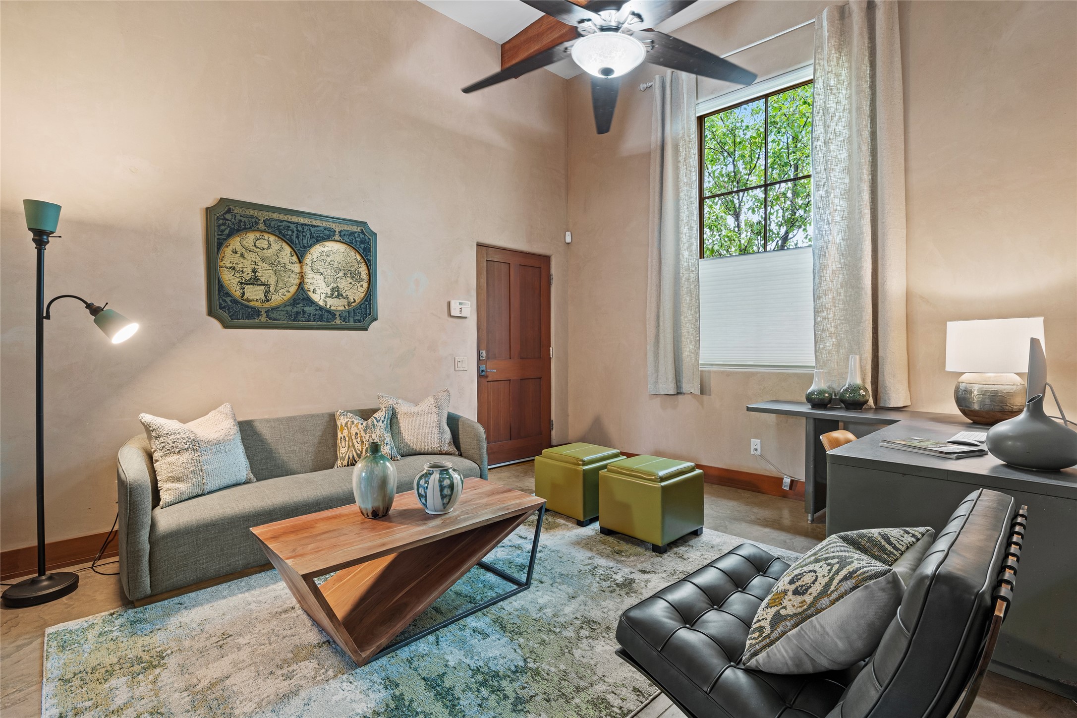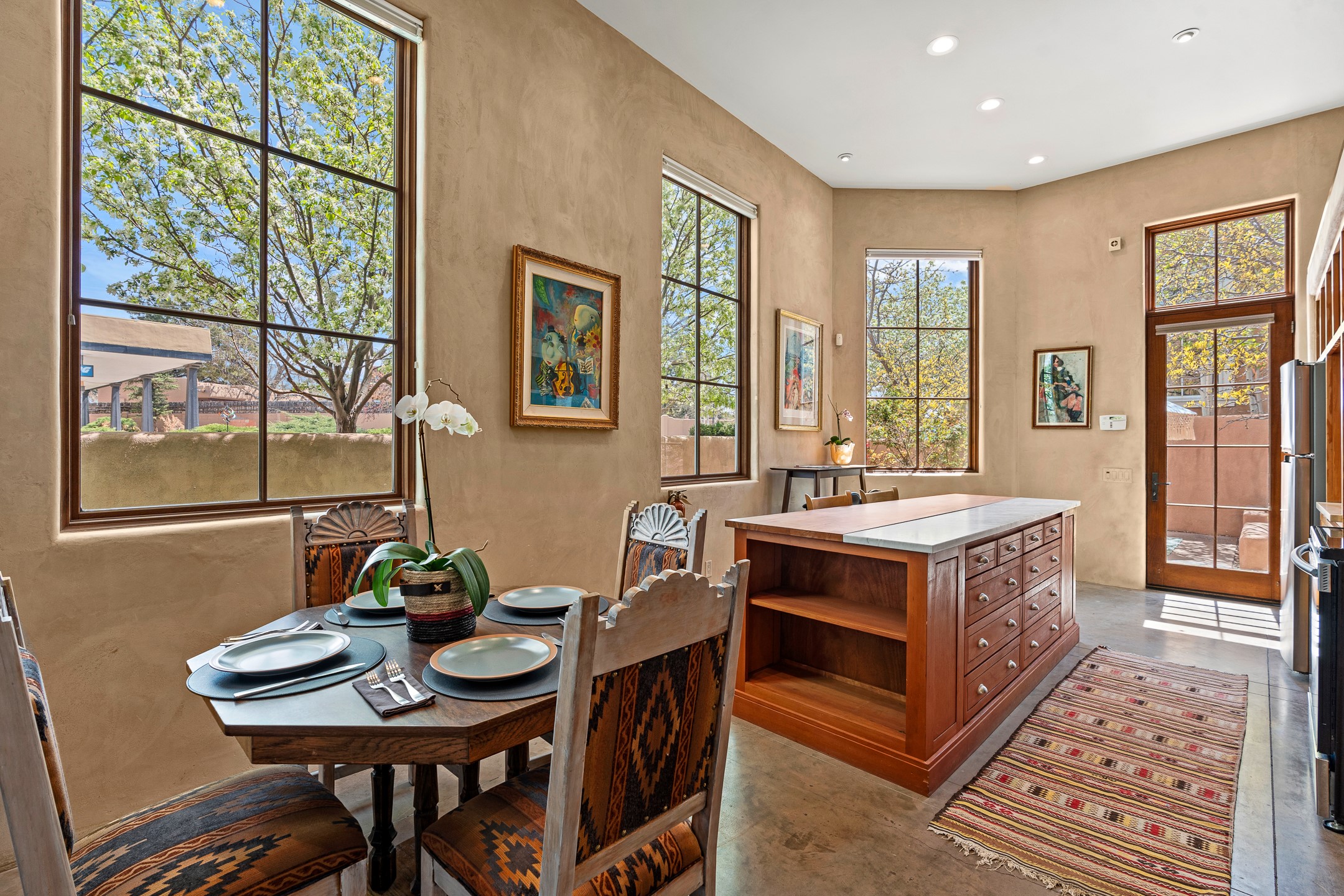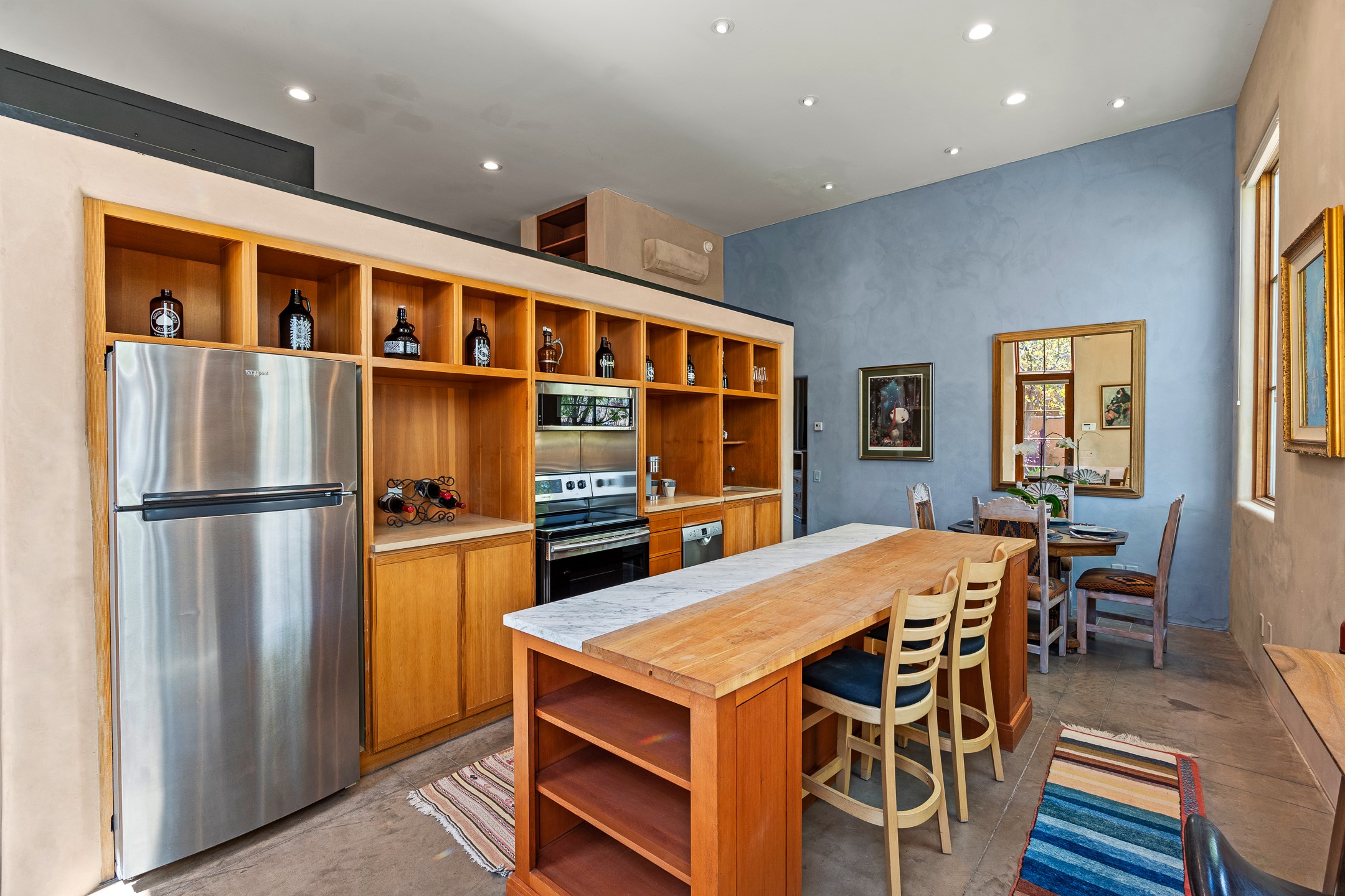 A Versatile Live/Work Opportunity in Prime Location.A rare find in the heart of Santa Fe's Eastside, this architect-designed property blends commercial versatility with residential charm. Zoned RAC (Residential Arts and Crafts), the home allows for office use, a live/work configuration, or an exceptional income-producing rental--perfect for a 3-bedroom Airbnb, a stylish 2-bedroom home with office, or your dream creative studio. Inside, you'll find soaring 12-foot ceilings, expansive windows that bathe the space in natural light, American Clay plaster finishes, polished granite countertops, and radiant in-floor concrete floors with mini split A/C systems. The flexible layout has functioned as an architect's studio, a short-term and long-term rental, and a personal residence.The contemporary kitchen features a long central island and seamlessly serves the open-concept living area. Two spacious ensuite bedrooms with baths offer private comfort, and the overall design supports many configurations.Additional highlights include two designated parking spaces, separate utility metering, and an outstanding location just minutes from the historic Plaza.Currently part of a family compound with 992 Old Pecos Trail, this home is available for individual sale, or it can be purchased in tandem with 992 to create an extraordinary multi-residence estate in the heart of Santa Fe. (See listing #202501407.)