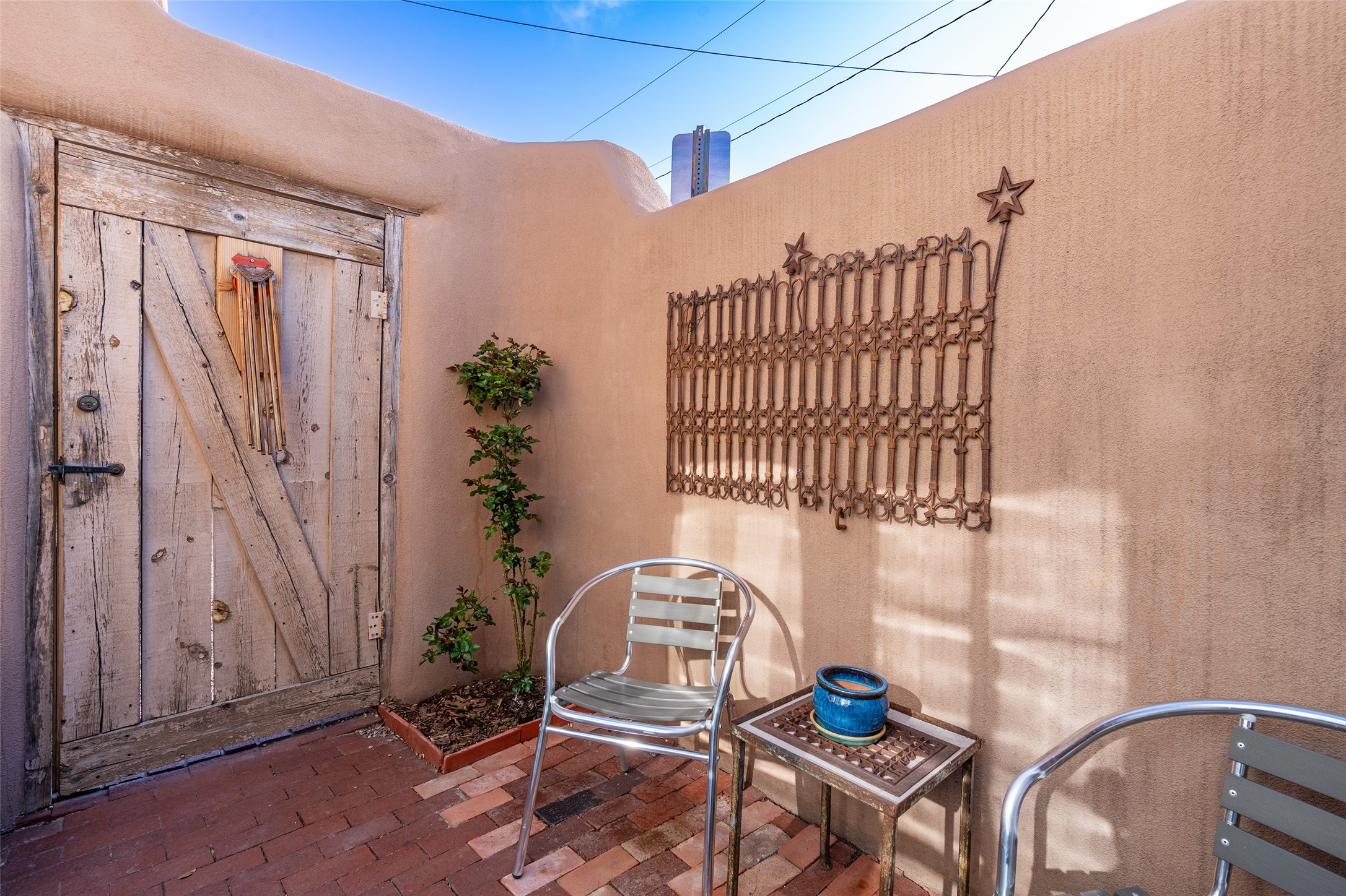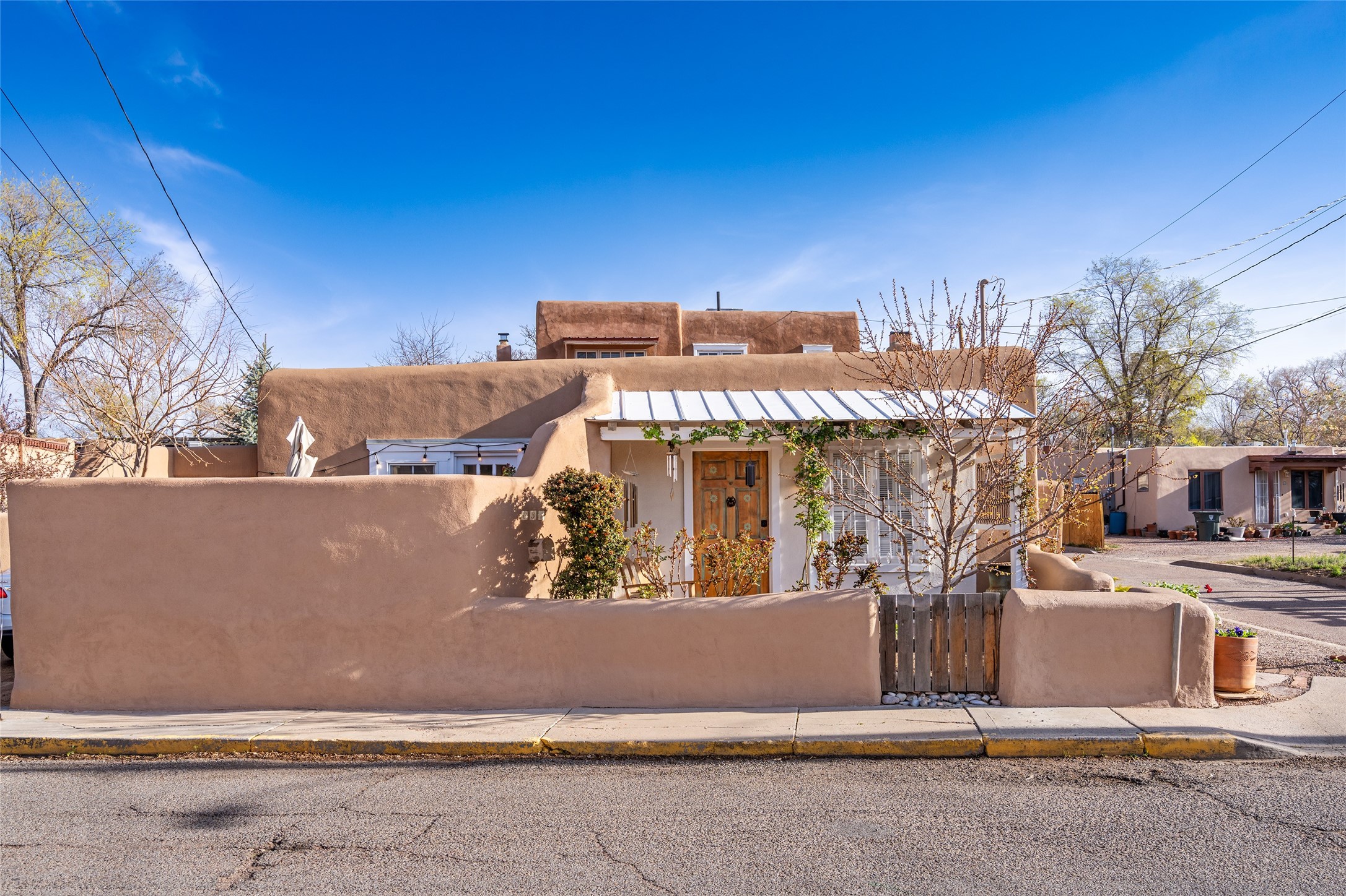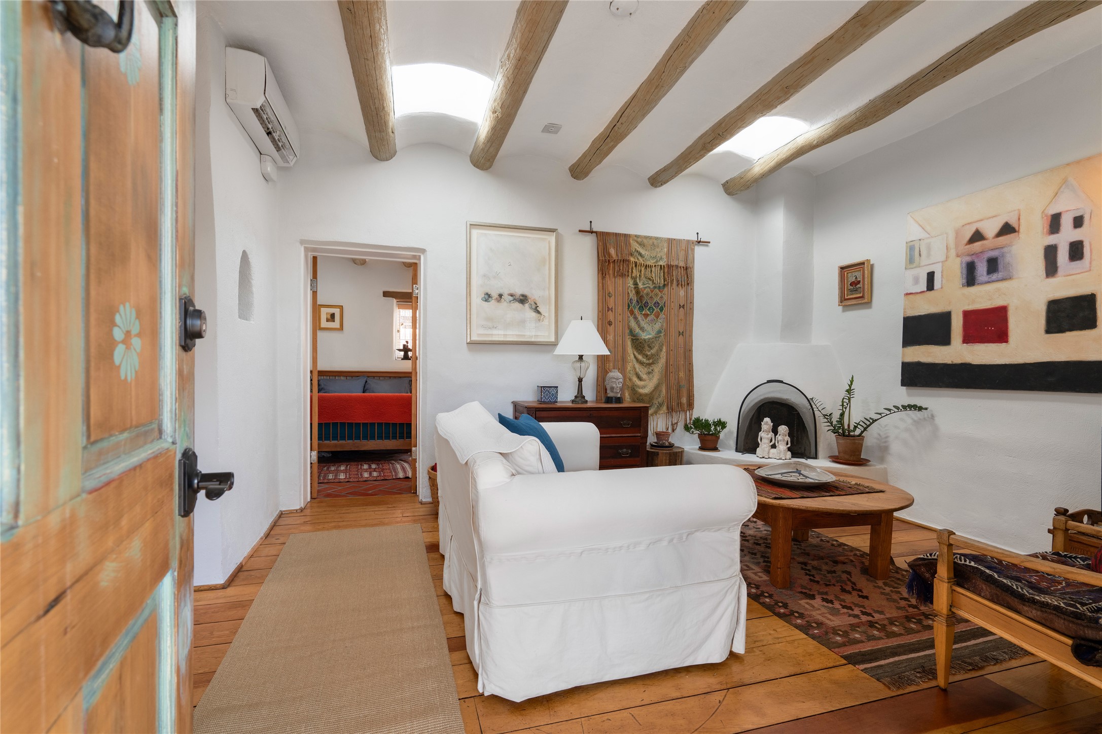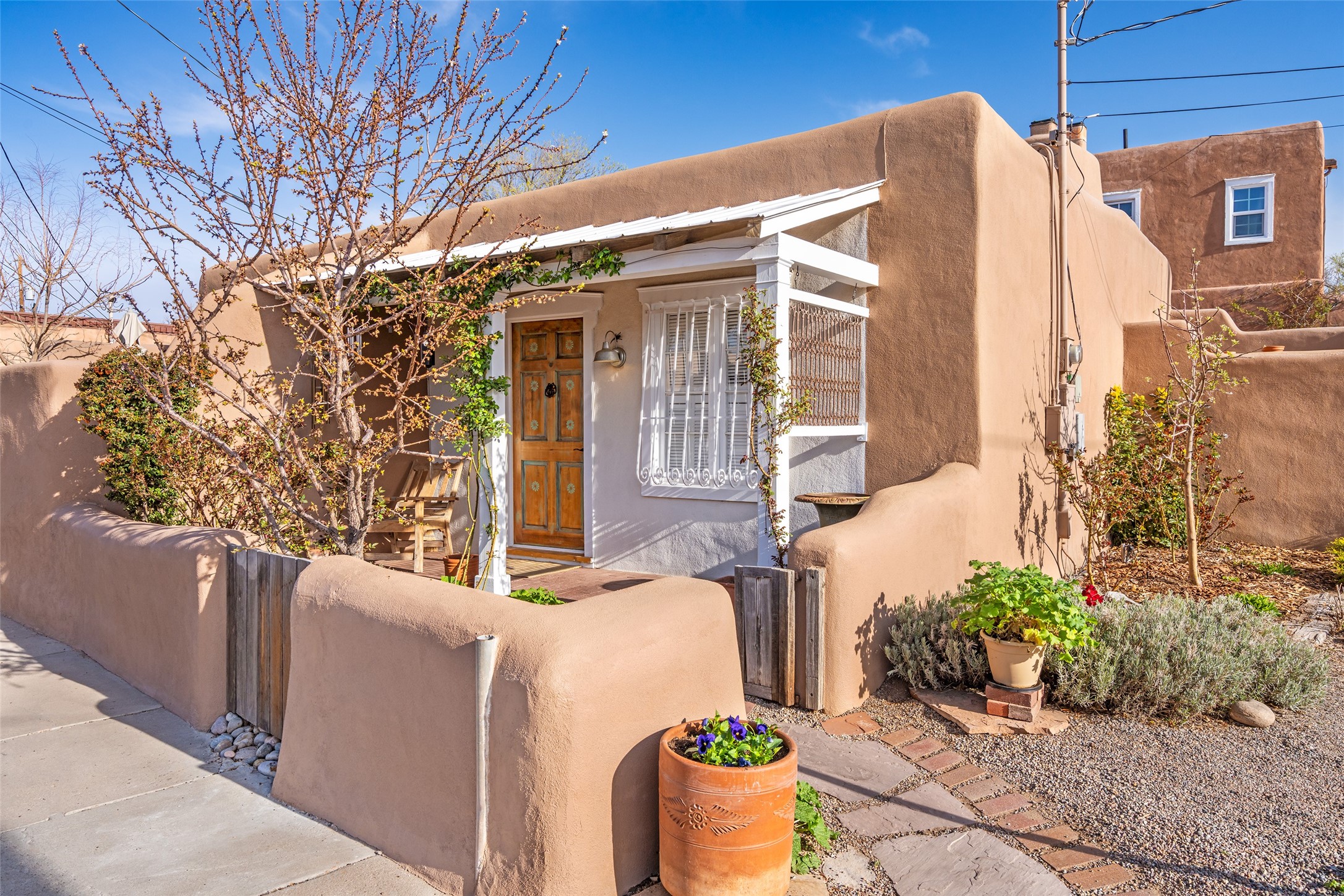 Elegant Adobe Pied--Terre in Downtown Santa Fe-- Experience the charm, warmth, and style of true Santa Fe living in this beautifully restored, freestanding adobe home--just blocks from the historic Plaza, world-class museums, local shops, the Railyard District, and an abundance of restaurants.Thoughtfully designed with classic Southwestern details and modern upgrades, this sophisticated corner-lot residence features sculpted coved and beamed ceilings, antique European doors, plaster walls, and deep window sills.The open-concept living, dining, and kitchen area is perfect for entertaining or relaxing. The living area has rich, wide wood plank floors and a kiva fireplace. The kitchen has vintage-inspired touches including a farmhouse sink and retro tile and upgraded appliances. The spacious primary suite features a tranquil bedroom, an en-suite bathroom, and seating area with kiva fireplace. It has a new traditional encaustic tile floor, the tiles are handcrafted by a local artist. Eight skylights throughout the home fill it with natural light, while two private courtyards--serene outdoor living spaces. One courtyard has a small shed for storage. Adobe walls offer peace and privacy and two efficient ductless mini-split units ensure comfort and low maintenance.Additional features include a washer/dryer, ample closet space, stone pathway, and one private off-street parking space. With no HOA fees, this home makes an ideal full-time residence, luxury rental, or dreamy downtown getaway for anyone seeking the magic of Old Santa Fe with modern comforts.
