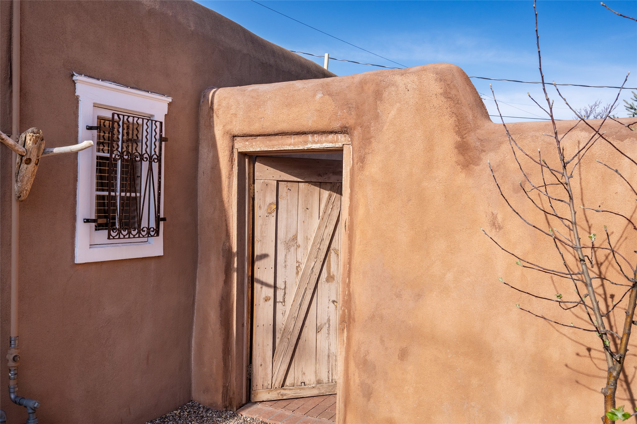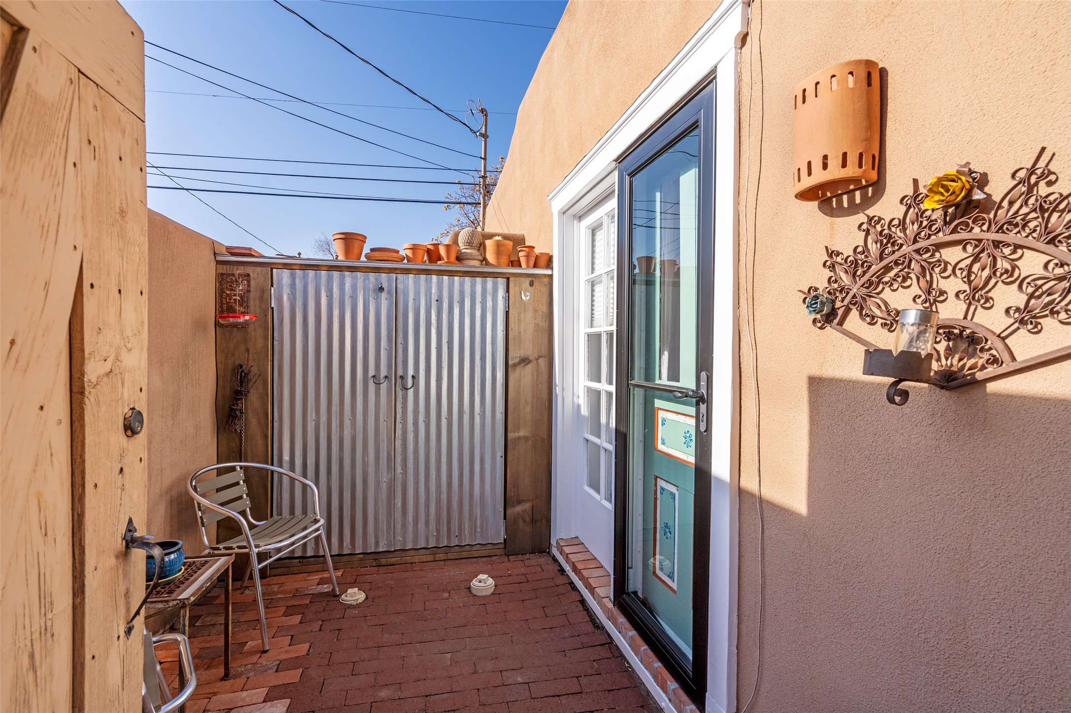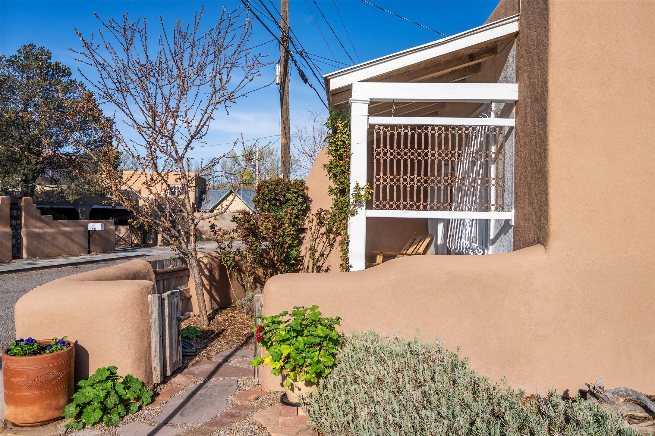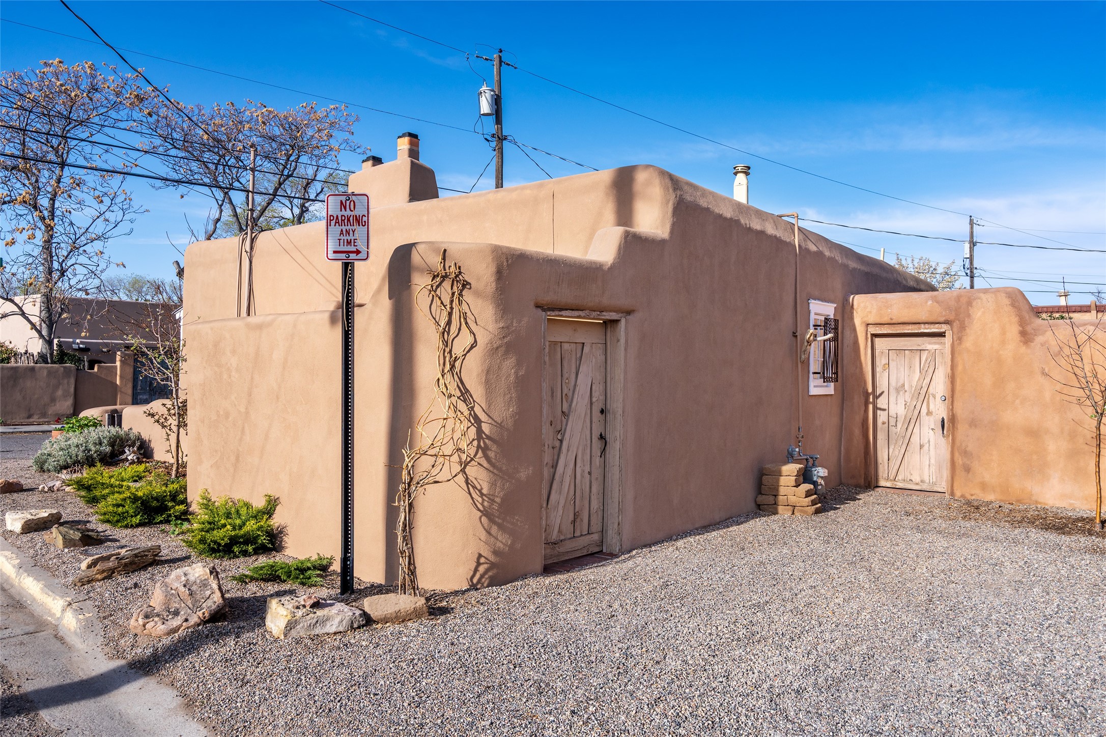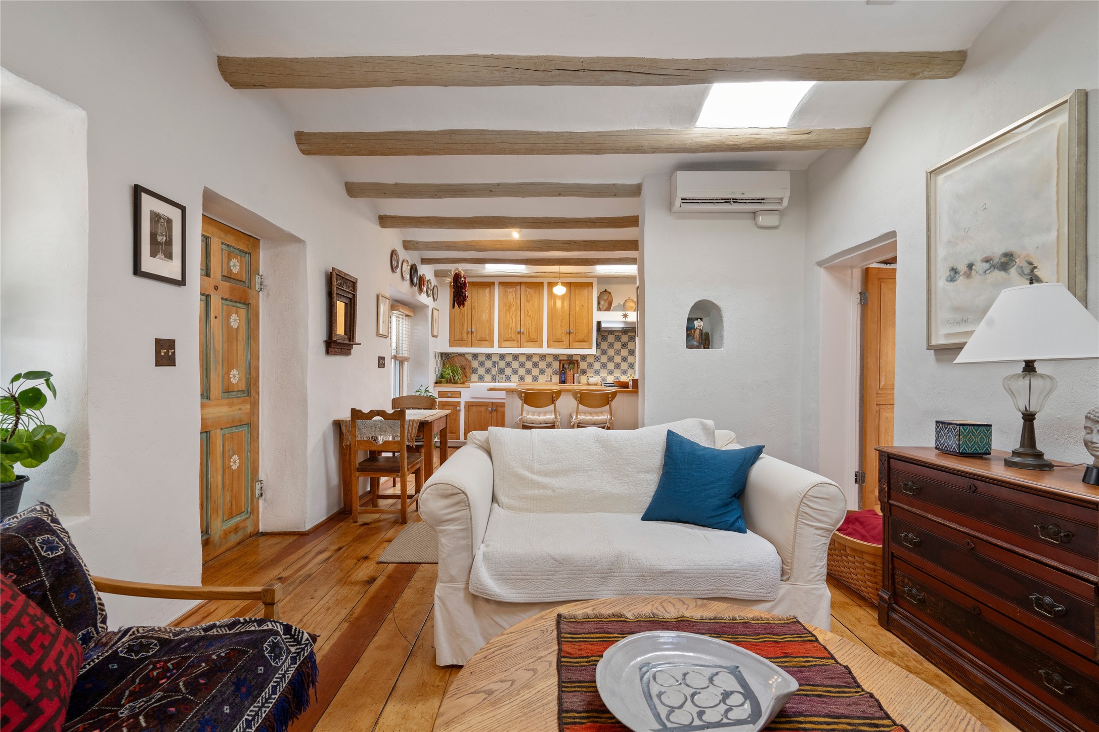 Elegant Adobe Pied--Terre in Downtown Santa Fe-- Experience the charm, warmth, and style of true Santa Fe living in this beautifully restored, freestanding adobe home--just blocks from the historic Plaza, world-class museums, local shops, the Railyard District, and an abundance of restaurants.Thoughtfully designed with classic Southwestern details and modern upgrades, this sophisticated corner-lot residence features sculpted coved and beamed ceilings, antique European doors, plaster walls, and deep window sills.The open-concept living, dining, and kitchen area is perfect for entertaining or relaxing. The living area has rich, wide wood plank floors and a kiva fireplace. The kitchen has vintage-inspired touches including a farmhouse sink and retro tile and upgraded appliances. The spacious primary suite features a tranquil bedroom, an en-suite bathroom, and seating area with kiva fireplace. It has a new traditional encaustic tile floor, the tiles are handcrafted by a local artist. Eight skylights throughout the home fill it with natural light, while two private courtyards--serene outdoor living spaces. One courtyard has a small shed for storage. Adobe walls offer peace and privacy and two efficient ductless mini-split units ensure comfort and low maintenance.Additional features include a washer/dryer, ample closet space, stone pathway, and one private off-street parking space. With no HOA fees, this home makes an ideal full-time residence, luxury rental, or dreamy downtown getaway for anyone seeking the magic of Old Santa Fe with modern comforts.